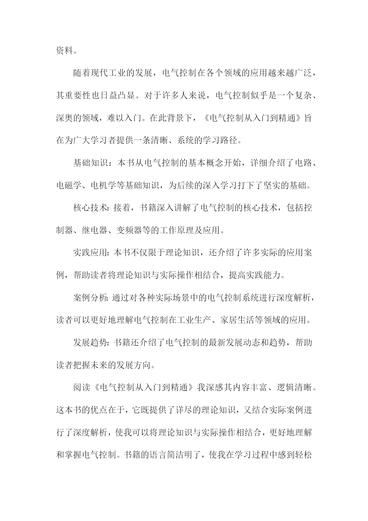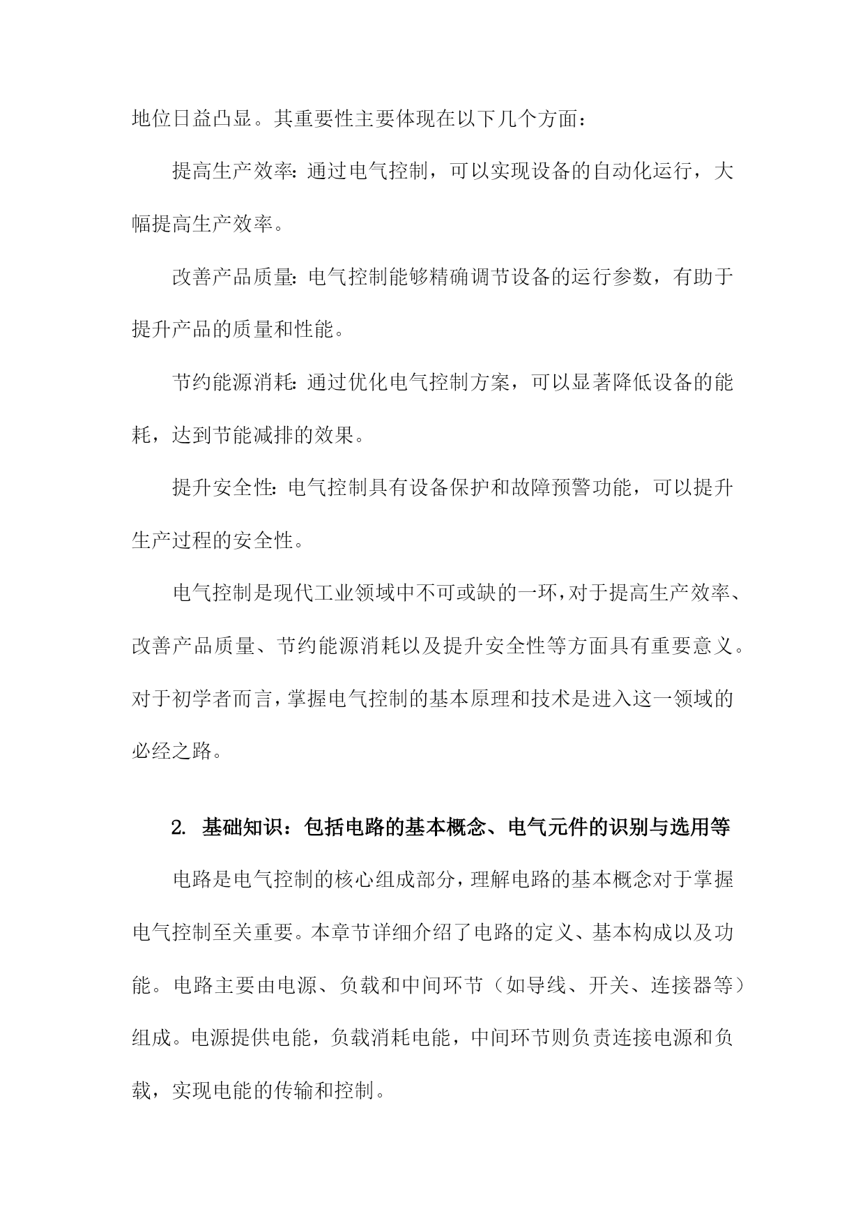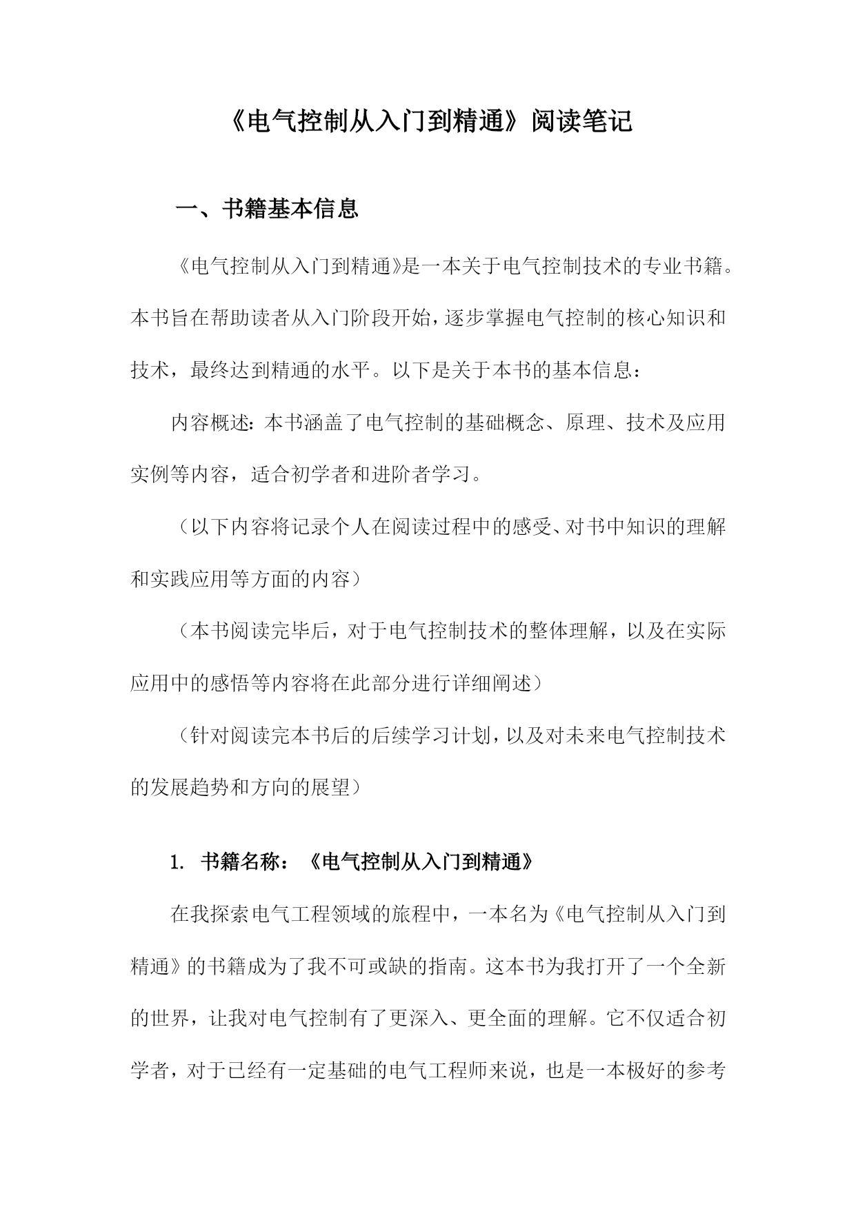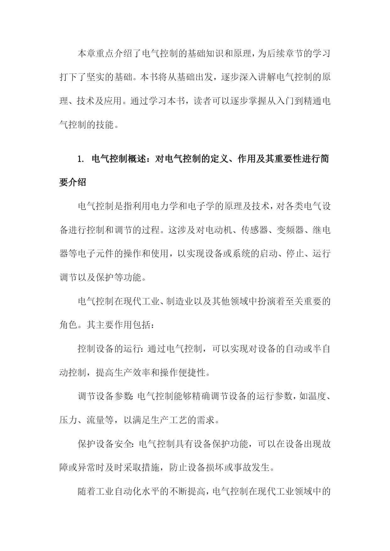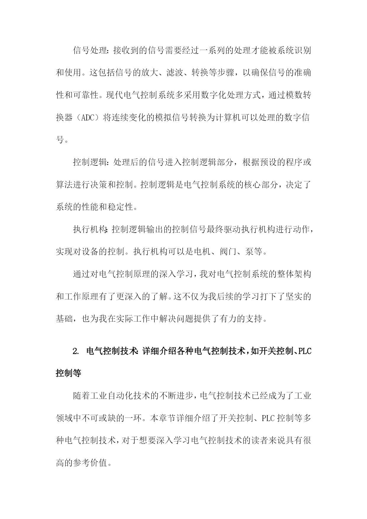 《电气控制从入门到精通》阅读笔记一、书籍基本信息《电气控制从入门到精通》是一本关于电气控制技术的专业书籍。本书旨在帮助读者从入门阶段开始,逐步掌握电气控制的核心知识和技术,最终达到精通的水平。以下是关于本书的基本信息:内容概述:本书涵盖了电气控制的基础概念、原理、技术及应用实例等内容,适合初学者和进阶者学习。(以下内容将记录个人在阅读过程中的感受、对书中知识的理解和实践应用等方面的内容)(本书阅读完毕后,对于电气控制技术的整体理解,以及在实际应用中的感悟等内容将在此部分进行详细阐述)(针对阅读完本书后的后续学习计划,以及对未来电气控制技术的发展趋势和方向的展望)1.书籍名称:《电气控制从入门到精通》在我探索电气工程领域的旅程中,一本名为《电气控制从入门到精通》的书籍成为了我不可或缺的指南。这本书为我打开了一个全新的世界,让我对电气控制有了更深入、更全面的理解。它不仅适合初学者,对于已经有一定基础的电气工程师来说,也是一本极好的参考资料。随着现代工业的发展,电气控制在各个领域的应用越来越广泛,其重要性也日益凸显。对于许多人来说,电气控制似乎是一个复杂、深奥的领域,难以入门。在此背景下,《电气控制从入门到精通》旨在为广大学习者提供一条清晰、系统的学习路径。基础知识:本书从电气控制的基本概念开始,详细介绍了电路、电磁学、电机学等基础知识,为后续的深入学习打下了坚实的基础。核心技术:接着,书籍深入讲解了电气控制的核心技术,包括控制器、继电器、变频器等的工作原理及应用。实践应用:本书不仅限于理论知识,还介绍了许多实际的应用案例,帮助读者将理论知识与实际操作相结合,提高实践能力。案例分析:通过对各种实际场景中的电气控制系统进行深度解析,读者可以更好地理解电气控制在工业生产、家居生活等领域的应用。发展趋势:书籍还介绍了电气控制的最新发展动态和趋势,帮助读者把握未来的发展方向。阅读《电气控制从入门到精通》我深感其内容丰富、逻辑清晰。这本书的优点在于,它既提供了详尽的理论知识,又结合实际案例进行了深度解析,使我可以将理论知识与实际操作相结合,更好地理解和掌握电气控制。书籍的语言简洁明了,使我在学习过程中感到轻松愉悦。《电气控制从入门到精通》是一本非常优秀的电气控制学习指南,无论你是初学者还是已经有一定基础的工程师,都能从中获得极大的收益。2.作者信息:包括作者姓名、专业领域等作者是一位电气工程领域的资深专家,拥有多年的从业经验及丰富的理论知识。他在电气工程、自动化控制以及相关领域的研究上有着深厚的背景和独到的见解。作者的作品不仅涵盖了基础的电气控制知识,还深入探讨了先进的电气控制技术与应用。通过这本《电气控制从入门到精通》,作者旨在帮助读者从初学者逐步成长为电气工程领域的专业人士。他的专业知识、实践经验以及对技术的热情都体现在这本书中,使得这本书成为电气控制领域的宝贵资源。3.出版信息:包括出版社、出版日期等《电气控制从入门到精通》是一本全面、系统地介绍电气控制技术的专业书籍。该书的出版信息如下:值得一提的是,(具体出版社名称)在出版界享有良好的声誉,其出版物质量高、内容权威,对于工程技术类图书的出版尤其具有专业性和深度。而本书作为该出版社的重要作品之一,更是汇聚了众多电气领域的专家和学者的智慧与经验,保证了书籍内容的权威性和前沿性。出版日期则表明本书为近年来最新研究成果的总结,体现了电气控制技术的最新发展趋势和应用前景。对于读者而言,选择这样一本由权威出版社出版的、更新及时的书籍,无疑能够为学习和掌握电气控制技术提供极大的帮助。二、第一章:电气控制基础第一章的内容是本书电气控制知识体系的基础部分,主要涵盖了电气控制的基本概念、原理和应用领域。通过阅读本章,我对电气控制有了更深入的了解。电气控制是指在电力系统中,通过对电气设备进行自动控制和调节,实现电能的有效利用和转换。随着科技的发展,电气控制在工业、农业、交通、通信等领域得到了广泛应用。电气控制的基本原理主要包括电路理论、电磁原理、电机与拖动原理等。电路理论是电气控制的基础,电磁原理是实现电器元件动作的关键,电机与拖动原理则是实现电机运转和控制的原理。电气控制在工业生产中的应用最为广泛,如数控机床、工业机器人、自动化生产线等。电气控制在交通运输、通信、农业等领域也有广泛应用。通过自动化控制,提高了生产效率,降低了能耗,改善了工作环境。本章重点介绍了电气控制的基础知识和原理,为后续章节的学习打下了坚实的基础。本书将从基础出发,逐步深入讲解电气控制的原理、技术及应用。通过学习本书,读者可以逐步掌握从入门到精通电气控制的技能。1.电气控制概述:对电气控制的定义、作用及其重要性进行简要介绍电气控制是指利用电力学和电子学的原理及技术,对各类电气