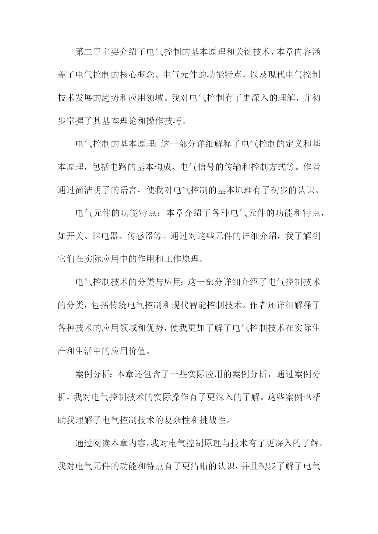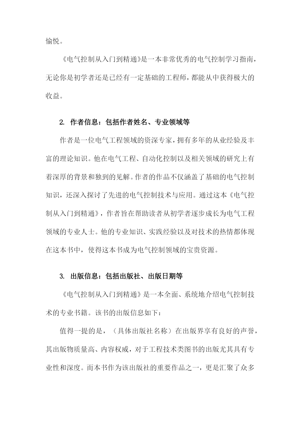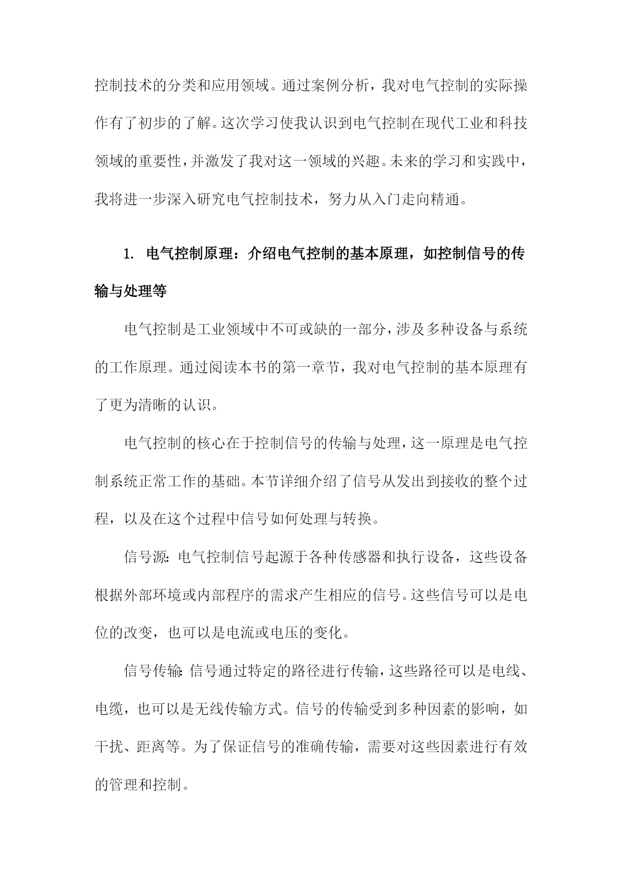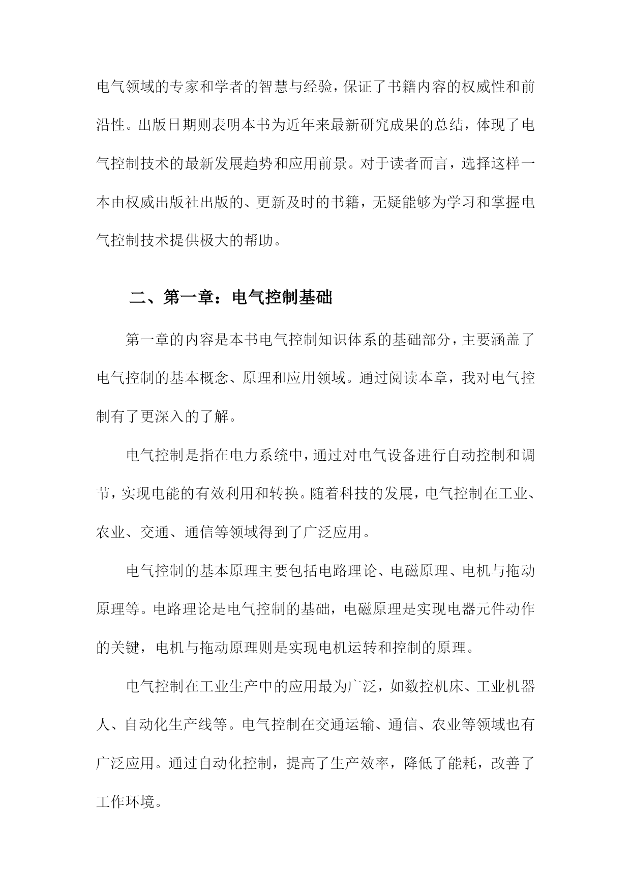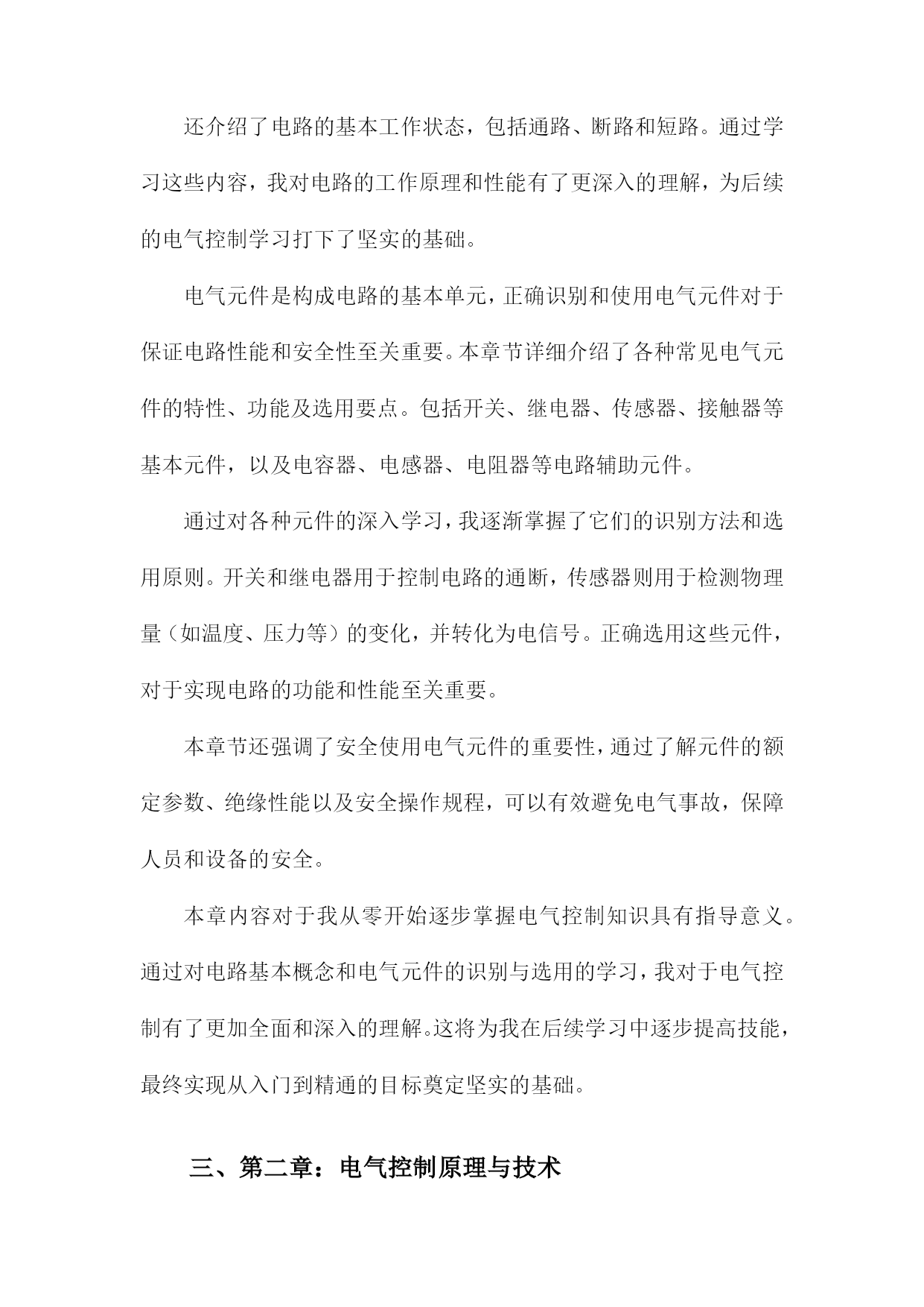 《电气控制从入门到精通》阅读笔记一、书籍基本信息《电气控制从入门到精通》是一本关于电气控制技术的专业书籍。本书旨在帮助读者从入门阶段开始,逐步掌握电气控制的核心知识和技术,最终达到精通的水平。以下是关于本书的基本信息:内容概述:本书涵盖了电气控制的基础概念、原理、技术及应用实例等内容,适合初学者和进阶者学习。(以下内容将记录个人在阅读过程中的感受、对书中知识的理解和实践应用等方面的内容)(本书阅读完毕后,对于电气控制技术的整体理解,以及在实际应用中的感悟等内容将在此部分进行详细阐述)(针对阅读完本书后的后续学习计划,以及对未来电气控制技术的发展趋势和方向的展望)1.书籍名称:《电气控制从入门到精通》在我探索电气工程领域的旅程中,一本名为《电气控制从入门到精通》的书籍成为了我不可或缺的指南。这本书为我打开了一个全新的世界,让我对电气控制有了更深入、更全面的理解。它不仅适合初学者,对于已经有一定基础的电气工程师来说,也是一本极好的参考资料。随着现代工业的发展,电气控制在各个领域的应用越来越广泛,其重要性也日益凸显。对于许多人来说,电气控制似乎是一个复杂、深奥的领域,难以入门。在此背景下,《电气控制从入门到精通》旨在为广大学习者提供一条清晰、系统的学习路径。基础知识:本书从电气控制的基本概念开始,详细介绍了电路、电磁学、电机学等基础知识,为后续的深入学习打下了坚实的基础。核心技术:接着,书籍深入讲解了电气控制的核心技术,包括控制器、继电器、变频器等的工作原理及应用。实践应用:本书不仅限于理论知识,还介绍了许多实际的应用案例,帮助读者将理论知识与实际操作相结合,提高实践能力。案例分析:通过对各种实际场景中的电气控制系统进行深度解析,读者可以更好地理解电气控制在工业生产、家居生活等领域的应用。发展趋势:书籍还介绍了电气控制的最新发展动态和趋势,帮助读者把握未来的发展方向。阅读《电气控制从入门到精通》我深感其内容丰富、逻辑清晰。这本书的优点在于,它既提供了详尽的理论知识,又结合实际案例进行了深度解析,使我可以将理论知识与实际操作相结合,更好地理解和掌握电气控制。书籍的语言简洁明了,使我在学习过程中感到轻松愉悦。《电气控制从入门到精通》是一本非常优秀的电气控制学习指南,无论你是初学者还是已经有一定基础的工程师,都能从中获得极大的收益。2.作者信息:包括作者姓名、专业领域等作者是一位电气工程领域的资深专家,拥有多年的从业经验及丰富的理论知识。他在电气工程、自动化控制以及相关领域的研究上有着深厚的背景和独到的见解。作者的作品不仅涵盖了基础的电气控制知识,还深入探讨了先进的电气控制技术与应用。通过这本《电气控制从入门到精通》,作者旨在帮助读者从初学者逐步成长为电气工程领域的专业人士。他的专业知识、实践经验以及对技术的热情都体现在这本书中,使得这本书成为电气控制领域的宝贵资源。3.出版信息:包括出版社、出版日期等《电气控制从入门到精通》是一本全面、系统地介绍电气控制技术的专业书籍。该书的出版信息如下:值得一提的是,(具体出版社名称)在出版界享有良好的声誉,其出版物质量高、内容权威,对于工程技术类图书的出版尤其具有专业性和深度。而本书作为该出版社的重要作品之一,更是汇聚了众多电气领域的专家和学者的智慧与经验,保证了书籍内容的权威性和前沿性。出版日期则表明本书为近年来最新研究成果的总结,体现了电气控制技术的最新发展趋势和应用前景。对于读者而言,选择这样一本由权威出版社出版的、更新及时的书籍,无疑能够为学习和掌握电气控制技术提供极大的帮助。二、第一章:电气控制基础第一章的内容是本书电气控制知识体系的基础部分,主要涵盖了电气控制的基本概念、原理和应用领域。通过阅读本章,我对电气控制有了更深入的了解。电气控制是指在电力系统中,通过对电气设备进行自动控制和调节,实现电能的有效利用和转换。随着科技的发展,电气控制在工业、农业、交通、通信等领域得到了广泛应用。电气控制的基本原理主要包括电路理论、电磁原理、电机与拖动原理等。电路理论是电气控制的基础,电磁原理是实现电器元件动作的关键,电机与拖动原理则是实现电机运转和控制的原理。电气控制在工业生产中的应用最为广泛,如数控机床、工业机器人、自动化生产线等。电气控制在交通运输、通信、农业等领域也有广泛应用。通过自动化控制,提高了生产效率,降低了能耗,改善了工作环境。本章重点介绍了电气控制的基础知识和原理,为后续章节的学习打下了坚实的基础。本书将从基础出发,逐步深入讲解电气控制的原理、技术及应用。通过学习本书,读者可以逐步掌握从入门到精通电气控制的技能。1.电气控制概述:对电气控制的定义、作用及其重要性进行简要介绍电气控制是指利用电力学和电子学的原理及技术,对各类电气