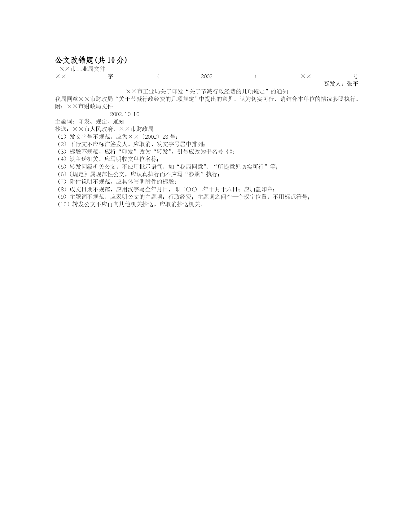 公文改错题(共10分)请将下面错误的地方改正过来。(每小题1分)××市人民政府文件×府发[2004]第11号关于表彰市××厂实现“安全生产年”的通报市属各企业:为确保企业生产和人民生命财产安全,我市××厂从各方面采取有力措施,花大力气抓各项安全生产制度的贯彻落实,并建立了安全生产各级岗位责任制,2003年实现全年无重大生产和伤亡事故,成为我市标兵企业。为此,市政府决定给予市××厂通报表扬,以资鼓励。市政府号召全市各企业学习市××厂的先进经验,结合企业实际,建立和健全安全生产岗位责任制抓好安全生产,争创标兵企业,为把我市安全生产提高到一个新水平而努力。特此通报主题词:关于表彰通报××市政府(印章)二○○四年元月答案:(1)发文号应为:×府发[2004]11号。(2)标题中不应出现引号,应去掉。(3)标题中的“表彰”应与“通报”放在一起,为“关于……的表彰通报”。(4)通报类属普发性公文,可不写收文机关。(5)结尾处不用写“特此通报”。(6)发文机关应写全称“××市人民政府”。(7)发文时间应规范,并具体到日。(8)主题词表中无“关于”词,应去掉。(一)根据公文内容拟写标题(1分)。1.某市人民政府就开展国有资产核定工作向所属下级机关行文,陈述该项工作的必要性,交代具体的工作任务及时间安排,并针对有关的步骤方法、政策界限、注意事项、报告方式与期限等提出具体要求。(二)按照公文写作要求、修改下列语句中的错误(每题0.5分)。1.为了尽快地发展教育事业,应该大力提高教育的业务水平和培养新生力量。2.经过一系列的整顿之后,第一车间劳动纪律逐渐走上正轨。答案1.某市人民政府关于开展国有资产核定工作的指示(或通知)。1.为了尽快地发展教育事业,应该大力提高教师的业务水平和培养新生力量。2.经过一系列的整顿,第一车间劳动纪律逐渐走上正轨。请将下面错误的地方改正过来。(共10分)××厂干部商调报告[2001年]调字第5号××局人事科负责同志:我厂工程师庞××同志,男,现年30岁,1990年毕业于华南理工大学,为我厂车间主任和技术骨干。该同志工作一贯认真负责,积极肯干,具有较高的专业技术水平和丰富的实际操作经验。现因家庭困难,且每天上下班需要2个小时等车,因此,拟调往你所工作,以照顾家庭。××厂长(印章)厂长:×××(私印)○一年九月二十一日答案:(1)标题文题错误,不是报告而应为“函”。(2)发文号应为调字[2001]5号。(3)收文应为单位,而非个人。(4)函中不应为“你所”,应为“贵所”表谦称。(5)缺少结束语,应为“请函复”,“致礼”。(6)落款不能用个人的名义。(7)发文时间应写全:二○○一年九月二十一日。(8)发文时间不应超出发文机关,应退后两格。1.根据公文内容拟写标题(1分)某省人民政府收到《某省教委关于加强教师队伍建设问题的报告》以后,经研究认为文件针对的问题十分重要,文中的建议切实可行,决定对该文加注批语后下发施行,为此,制发一文件。2.按照公文写作要求,修改下列语句中的错误(每题0.5分)(1)他所以取得这样优异的成果,是因为他长期地进行辛勤劳动。(2)我们要为构建和谐社会打下物质基础和精神准备。公文改错题(共10分)××市工业局文件××字(2002)××号签发人:张平××市工业局关于印发“关于节减行政经费的几项规定”的通知我局同意××市财政局“关于节减行政经费的几项规定”中提出的意见,认为切实可行,请结合本单位的情况参照执行。附:××市财政局文件2002.10.16主题词:印发、规定、通知抄送:××市人民政府、××市财政局(1)发文字号不规范,应为××〔2002〕23号;(2)下行文不应标注签发人,应取消,发文字号居中排列;(3)标题不规范,应将“印发”改为“转发”,引号应改为书名号《》;(4)缺主送机关,应写明收文单位名称;(5)转发同级机关公文,不应用批示语气,如“我局同意”、“所提意见切实可行”等;(6)《规定》属规范性公文,应认真执行而不应写“参照”执行;(7)附件说明不规范,应具体写明附件的标题;(8)成文日期不规范,应用汉字写全年月日,即二〇〇二年十月十六日;应加盖印章;(9)主题词不规范,应表明公文的主题项:行政经费;主题词之间空一个汉字位置,不用标点符号;(10)转发公文不应再向其他机关抄送,应取消抄送机关。