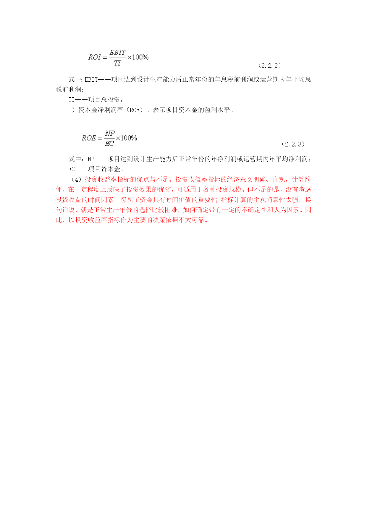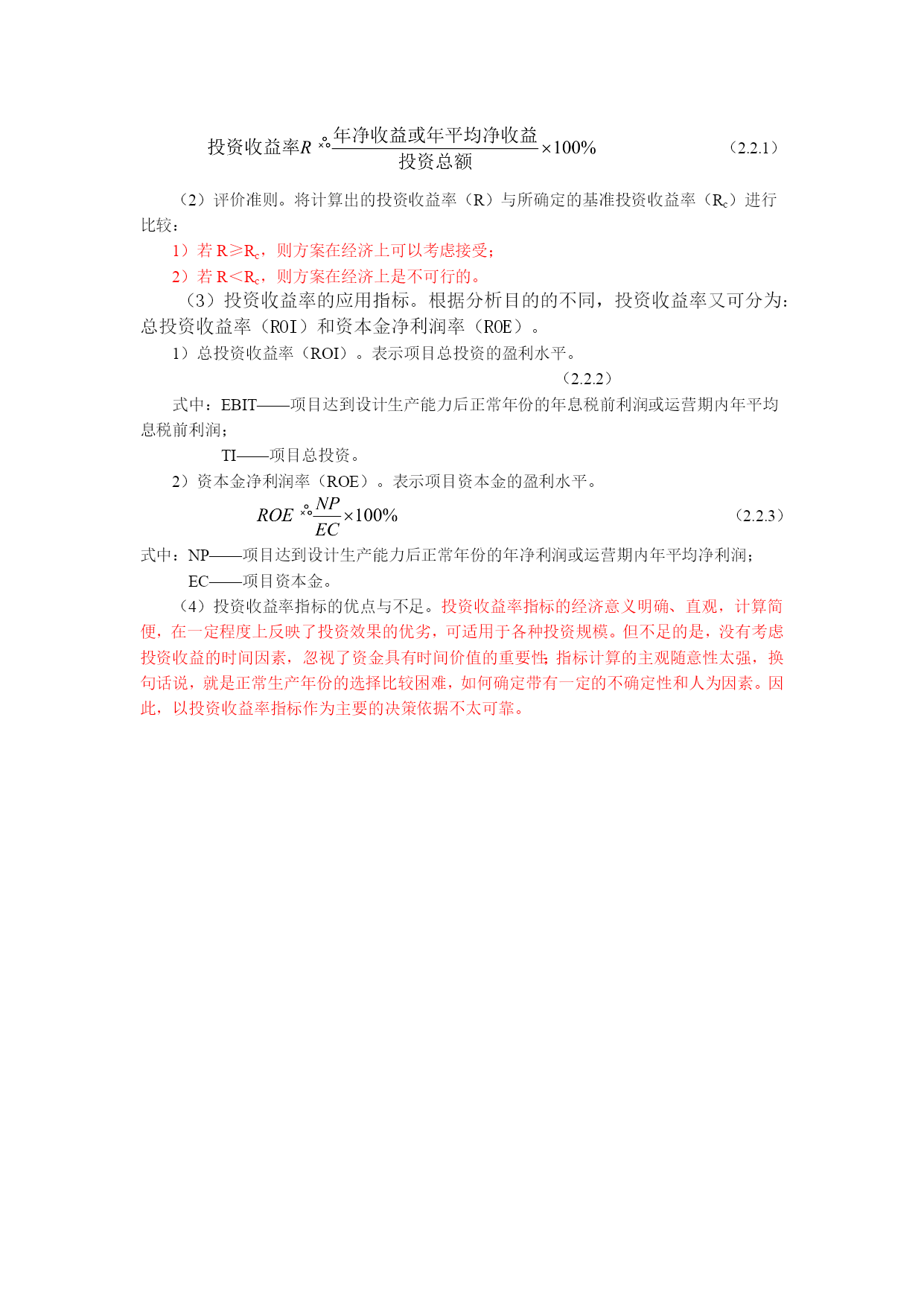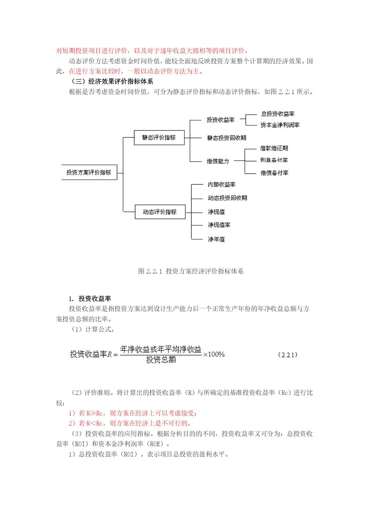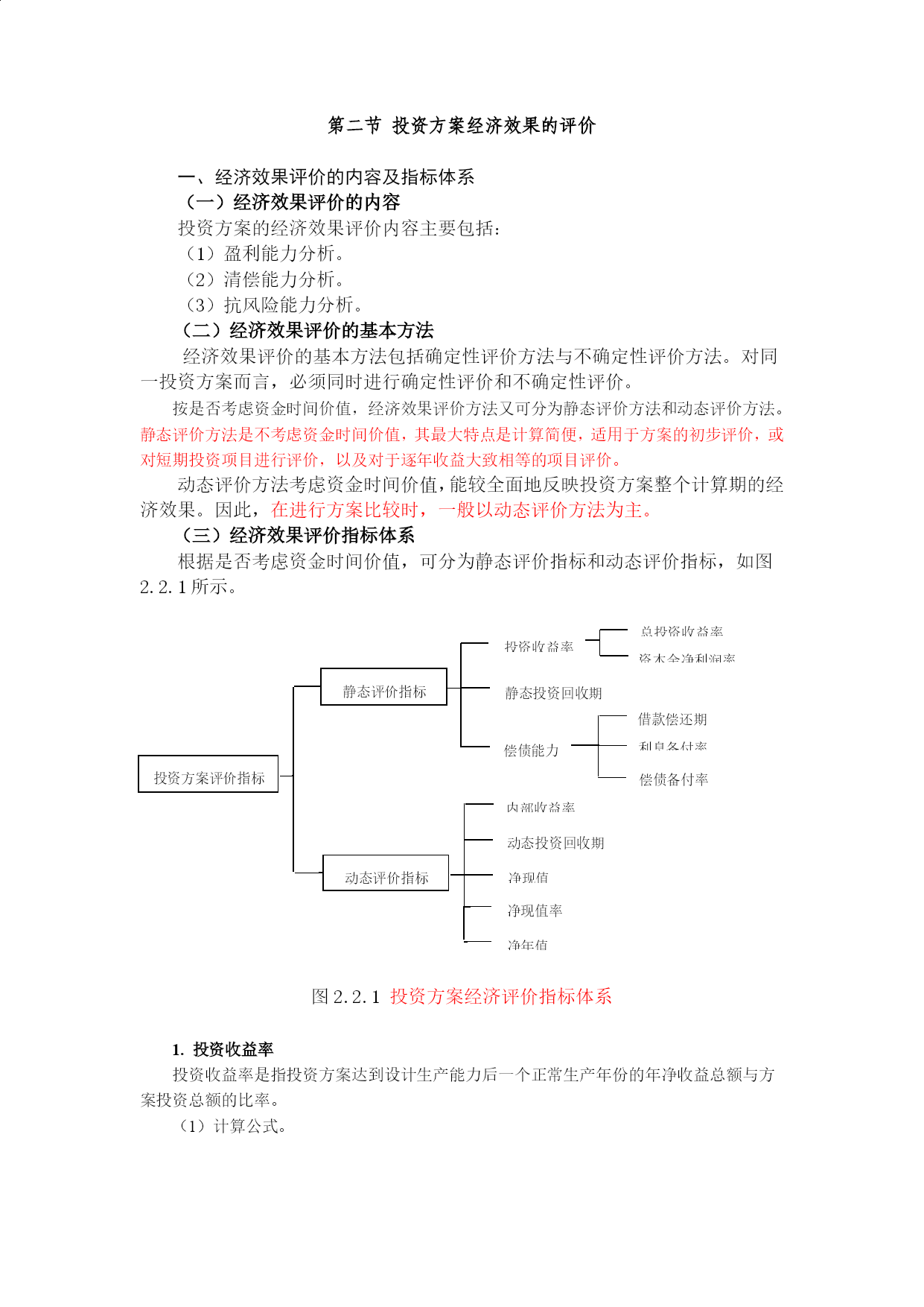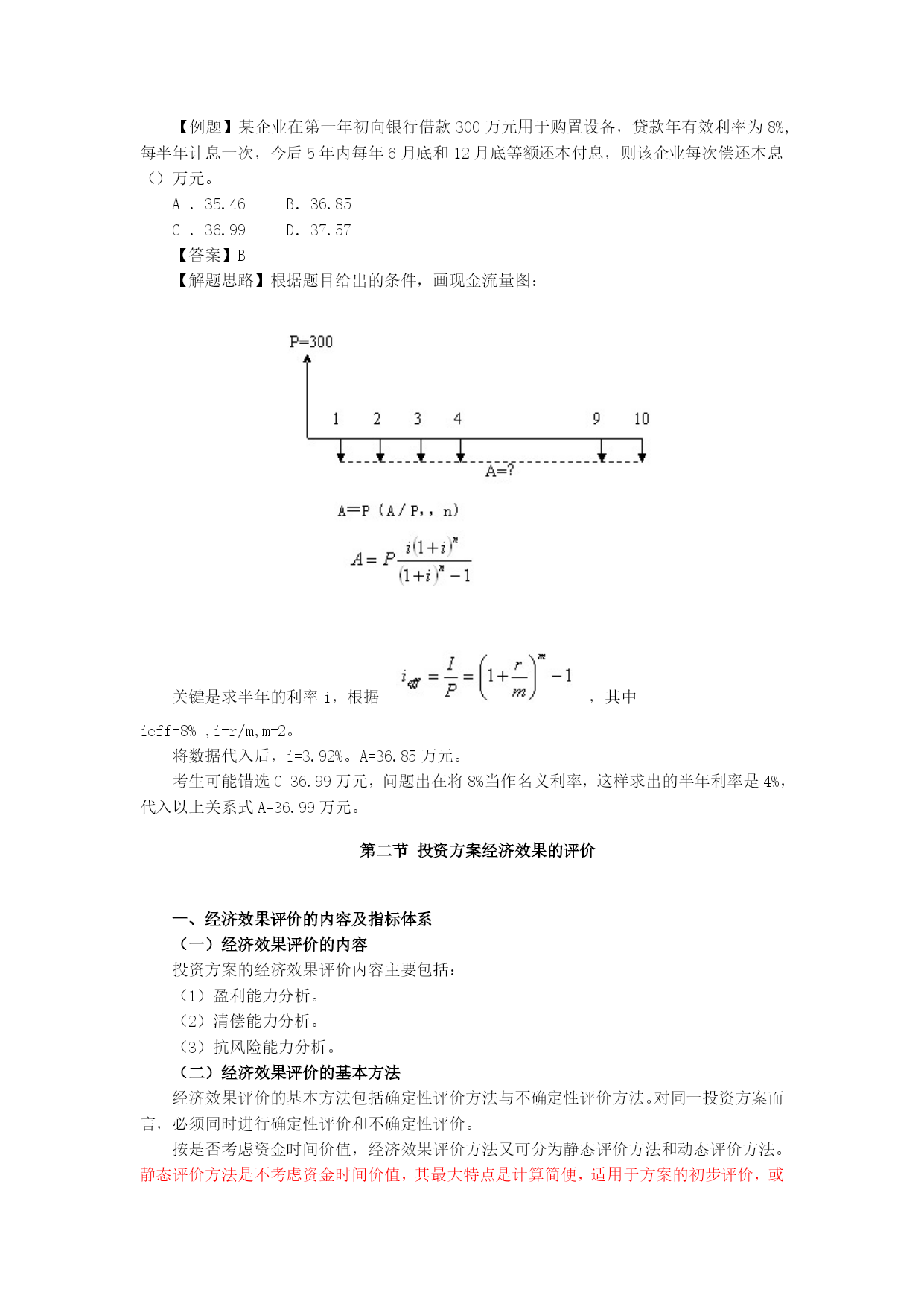 (三)名义利率与有效利率在复利计算中,利率周期通常以年为单位,它可以与计息周期相同,也可以不同。当利率周期与计息周期不一致时,就出现了名义利率和实际利率的概念。1.名义利率名义利率r是指计息周期利率i乘以一个利率周期内的计息周期数m所得的利率周期利率。即:r=i×m(2.1.24)2.有效利率有效利率是指资金在计息中所发生的实际利率,包括计息周期有效利率和利率周期有效利率两种情况。(1)计息周期有效利率。即计息周期利率i,由式(2.1.24)得:(2.1.25)(2)利率周期有效利率。利率周期的有效利率ieff为:(2.1.26)【例题】年利率12%,一年计息四次,则半年的有效利率为(1+12%/4)2-1【例题】某企业于年初向银行借款1500万元,其年有效利率为10%,若按月复利计息,则该年第3季度未借款本利和为()万元。A.1611.1B.1612.5C.1616.3D.1237.5【答案】A【思路】按月计息,要求的是第三季度末的本利和,那么也就必须要求出每月的实际利率。而给出的条件是年有效利率,因此本题首先要利用月实际利率和年实际利率的关系求出月实际利率,然后再利用月实际利率求出9个月的本利和。第一步:利用月利率和年利率的关系求月利率。由年实际利率=(1+月利率)12-1得出月利率=(1+年实际利率)1/12-1=(1+10%)1/12-1第二步:利用月利率求出9个月的本利和。第三季度末的借款本利和=1500*(1+月利率)9=1500*(1+10%)9/12=1611.1【易错】本题容易出错的地方是将10%看成名义利率,月利率=10%/12,由此计算答案为B项。【例题】某企业在第一年初向银行借款300万元用于购置设备,贷款年有效利率为8%,每半年计息一次,今后5年内每年6月底和12月底等额还本付息,则该企业每次偿还本息()万元。A.35.46B.36.85C.36.99D.37.57【答案】B【解题思路】根据题目给出的条件,画现金流量图:关键是求半年的利率i,根据,其中ieff=8%,i=r/m,m=2。将数据代入后,i=3.92%。A=36.85万元。考生可能错选C36.99万元,问题出在将8%当作名义利率,这样求出的半年利率是4%,代入以上关系式A=36.99万元。第二节投资方案经济效果的评价一、经济效果评价的内容及指标体系(一)经济效果评价的内容投资方案的经济效果评价内容主要包括:(1)盈利能力分析。(2)清偿能力分析。(3)抗风险能力分析。(二)经济效果评价的基本方法经济效果评价的基本方法包括确定性评价方法与不确定性评价方法。对同一投资方案而言,必须同时进行确定性评价和不确定性评价。按是否考虑资金时间价值,经济效果评价方法又可分为静态评价方法和动态评价方法。静态评价方法是不考虑资金时间价值,其最大特点是计算简便,适用于方案的初步评价,或对短期投资项目进行评价,以及对于逐年收益大致相等的项目评价。动态评价方法考虑资金时间价值,能较全面地反映投资方案整个计算期的经济效果。因此,在进行方案比较时,一般以动态评价方法为主。(三)经济效果评价指标体系根据是否考虑资金时间价值,可分为静态评价指标和动态评价指标,如图2.2.1所示。图2.2.1投资方案经济评价指标体系1.投资收益率投资收益率是指投资方案达到设计生产能力后一个正常生产年份的年净收益总额与方案投资总额的比率。(1)计算公式。(2)评价准则。将计算出的投资收益率(R)与所确定的基准投资收益率(Rc)进行比较:1)若R≥Rc,则方案在经济上可以考虑接受;2)若R<Rc,则方案在经济上是不可行的。(3)投资收益率的应用指标。根据分析目的的不同,投资收益率又可分为:总投资收益率(ROI)和资本金净利润率(ROE)。1)总投资收益率(ROI)。表示项目总投资的盈利水平。(2.2.2)式中:EBIT——项目达到设计生产能力后正常年份的年息税前利润或运营期内年平均息税前利润;TI——项目总投资。2)资本金净利润率(ROE)。表示项目资本金的盈利水平。(2.2.3)式中:NP——项目达到设计生产能力后正常年份的年净利润或运营期内年平均净利润;EC——项目资本金。(4)投资收益率指标的优点与不足。投资收益率指标的经济意义明确、直观,计算简便,在一定程度上反映了投资效果的优劣,可适用于各种投资规模。但不足的是,没有考虑投资收益的时间因素,忽视了资金具有时间价值的重要性;指标计算的主观随意性太强,换句话说,就是正常生产年份的选择比较困难,如何确定带有一定的不确定性和人为因素。因此,以投资收益率指标作为主要的决策依据不太可靠。第二节投资方案经济效果的评价一、经济效果评价的内容及指标体系(一)经济效果评价的内容投资方案的经济效果评价内容主要包括:(1)盈利