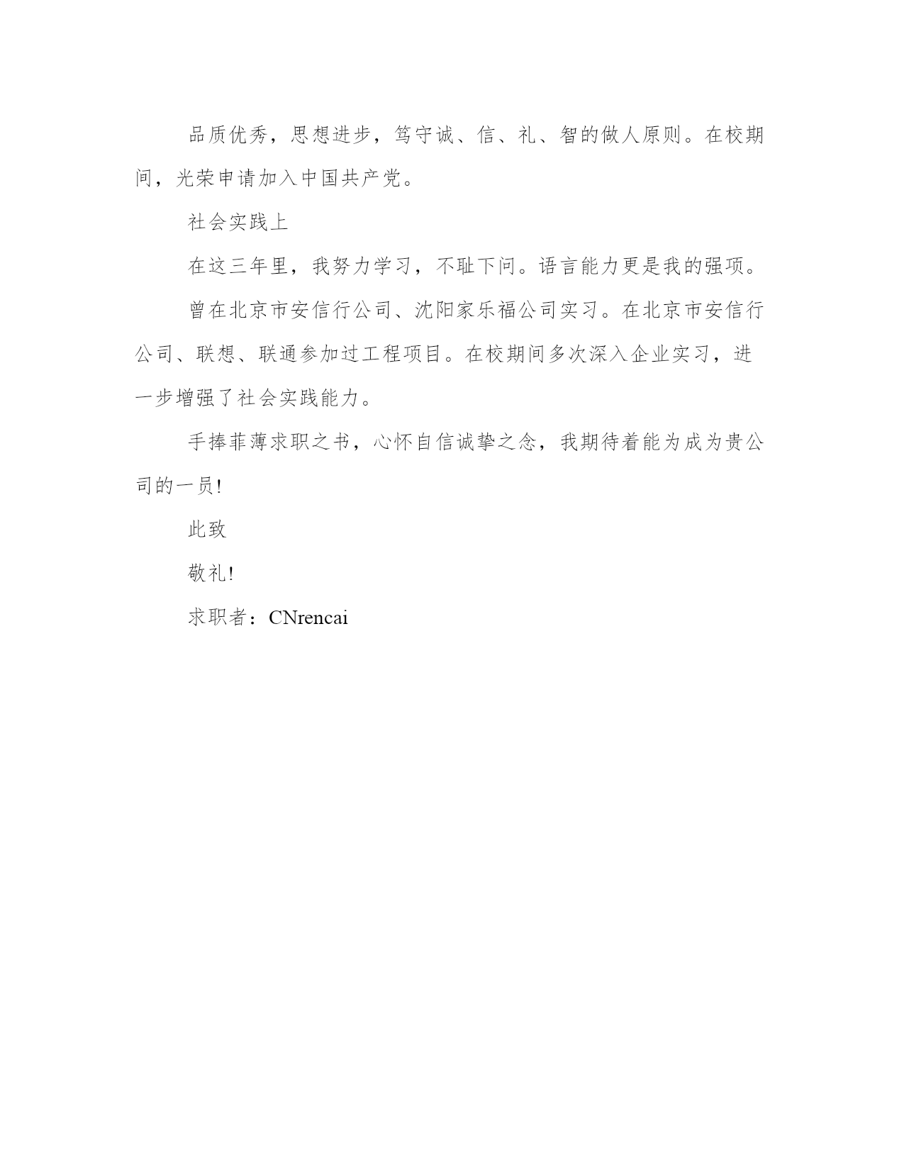 机电系专科生的求职信模板您好!很荣幸您能在百忙之中翻阅我的求职信,谢谢!我是一名即将毕业的机电系专科生,届时将获得工商管理学士学位。大学三年,奠定了扎实的专业理论基础,良好的组织能力,团队协作精神,务实的工作作风。理论学习上认真学习专业知识理论,阅读了大量钳工专业书籍。同时对于法律、文学等方面的非专业知识我也有浓厚的兴趣。在校期间,在专业考试中屡次获得单科前三。获得院贰等奖学金一次。获奉天大学生院校三好学生一次,获学院XX8届优秀毕业设计。专业知识上精通钳工工艺学。熟练使用机床等操作系统。熟练使用office、wps办公自动化软件。自、frontpage、dreamweaver、fireworks、flash制作相关软件。对于钳工、机床能熟练操作。工作上曾担任系学生会部长、班长等职,现任机电系社团部部长。多次组织系部、班级联欢会、春游等活动,受到老师、同学们的一致好评。思想修养上品质优秀,思想进步,笃守诚、信、礼、智的做人原则。在校期间,光荣申请加入中国共产党。社会实践上在这三年里,我努力学习,不耻下问。语言能力更是我的强项。曾在北京市安信行公司、沈阳家乐福公司实习。在北京市安信行公司、联想、联通参加过工程项目。在校期间多次深入企业实习,进一步增强了社会实践能力。手捧菲薄求职之书,心怀自信诚挚之念,我期待着能为成为贵公司的一员!此致敬礼!求职者:CNrencai