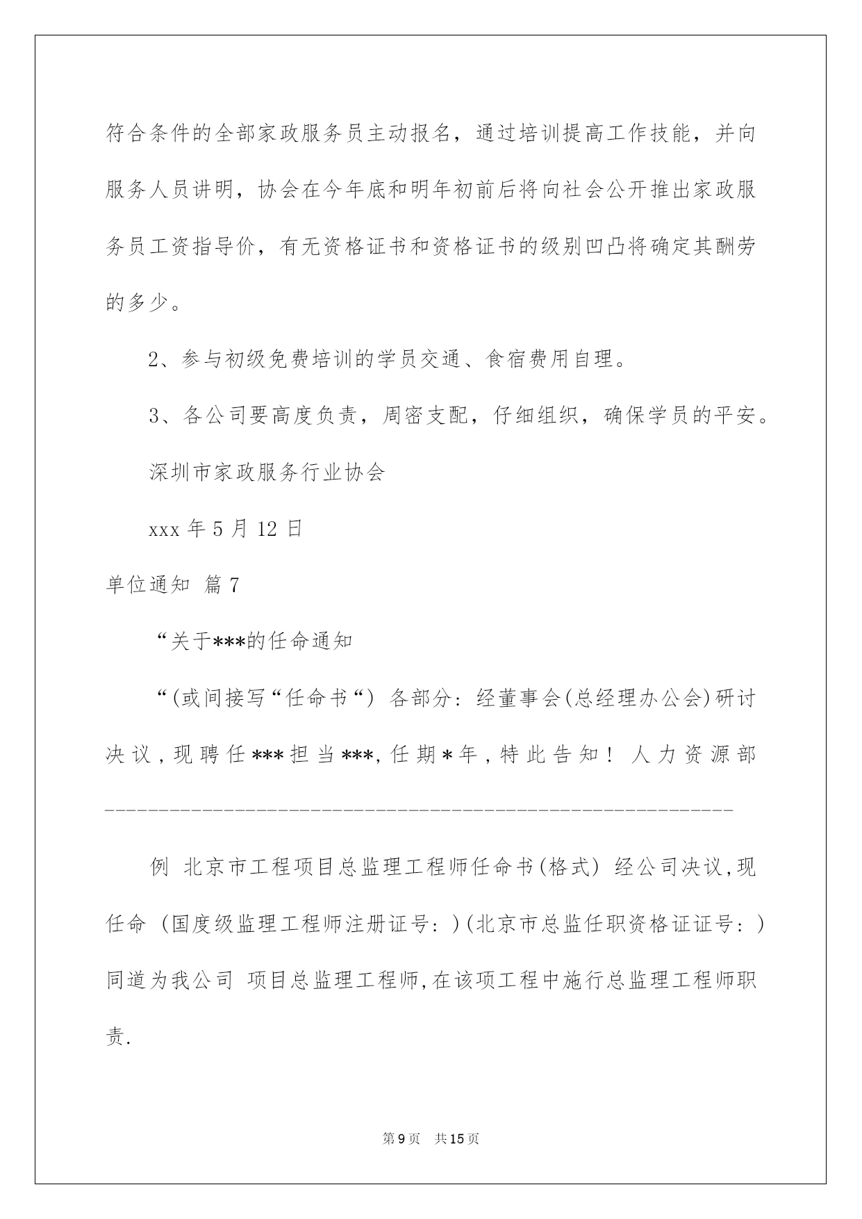 第PAGE\*Arabic\*MERGEFORMAT15页共NUMPAGES\*Arabic\*MERGEFORMAT15页第PAGE\*MERGEFORMAT15页共NUMPAGES\*MERGEFORMAT15页第PAGE\*MERGEFORMAT15页共NUMPAGES\*MERGEFORMAT15页第PAGE\*MERGEFORMAT15页共NUMPAGES\*MERGEFORMAT15页第PAGE\*MERGEFORMAT15页共NUMPAGES\*MERGEFORMAT15页第PAGE\*MERGEFORMAT15页共NUMPAGES\*MERGEFORMAT15页第PAGE\*MERGEFORMAT15页共NUMPAGES\*MERGEFORMAT15页第PAGE\*MERGEFORMAT15页共NUMPAGES\*MERGEFORMAT15页第PAGE\*MERGEFORMAT15页共NUMPAGES\*MERGEFORMAT15页第PAGE\*MERGEFORMAT15页共NUMPAGES\*MERGEFORMAT15页第PAGE\*MERGEFORMAT15页共NUMPAGES\*MERGEFORMAT15页2022单位通知单位通知范文九篇在现在社会,我们越来越须要通知,通知是用来发布法规、规章,转发上级机关、同级机关和不相隶属机关的公文,批转下级机关的公文,要求下级机关办理某项事务等。写起通知来就毫无头绪?以下是我收集整理的单位通知9篇,欢迎大家借鉴与参考,希望对大家有所帮助。单位通知篇1各社区、企事业单位、爱心志愿团体:无偿献血是挽救生命垂危者的高尚行为,是社会主义精神文明的一种体现。戚家山街道将于20xx年3月9日组织团体献血活动,请各单位做好本次活动的宣扬,主动组织爱心人士报名参与。本次活动的详细事项如下:一、献血时间:20xx年3月9日(星期四)上午8:00起先因故无法在3月9日当天参与团体献血的爱心人士可提前在3月5日到环山路蔚斗宾馆前的献血车献血。因献血车上人员少,每日可以完成献血人数有限(大致20余人),请组织单位提前做好登记备案。二、献血地点:戚家山街道青峙社区公共服务中心(宏源路消防中队旁边)三、献血对象:年龄在18周岁—55周岁的健康公民四、献血留意事项:1、献血时必需携带有效身份证明(身份证、暂住证、驾驶证、护照、军官或士兵证);2、献血前晚保持足够睡眠;3、献血前切忌空腹,饮食应清淡,宜吃稀饭、馒头、淡包、青菜、素面等食物,忌吃油腻类、油炸类、肉类、鸡(禽)蛋、便利面、牛奶、豆浆等食物,忌喝酒。五、暂缓献血状况:1、接受疫苗免疫接种者:接受麻疹,腮腺炎,黄热病,脊髓灰质炎活疫苗最终一次免疫接种后二周内,风疹活疫苗,狂犬病疫苗最终一次免疫接种后四周后,被狂犬咬后经狂犬病疫苗最终一次免疫接种后一年内.2、接受动物血清注射者,最终一次注射后四周后.3、妇女某些生理期:月经前后三天及经期,妊娠期,流产后未满六个月,分娩及哺期未满一年者.4、手术后:半月内拔牙或其他小手术者,阑尾切除,疝补术,扁桃体手术后未满三个月者,较大手术后未满半年者.5、患某些传染病病愈后:痢疾病愈后未满半年者,损害病愈后未满一年者,布氏杆菌病愈后未满二年者,疟疾病愈后未满三年者.6、患某些疾病病愈后:感冒,急性胃肠炎,皮肤局限性炎症愈合后未满一周者,广泛性炎症愈后未满二周者,急性泌尿道感染病愈后未满一月者,肺炎病愈后未满三个月者.7、近五年内输注全血及血液成分者.8、纹身后不满一年者.9、献全血未满半年者六、联系电话:单位通知篇2公司:我单位的,经评标委员会评定及中标公示,现确定贵单位中标。请收到本通知书后天内,到我单位签订建设工程合同。特此通知。代理单位:(盖章)招标人(盖章):日期:20xx年月日日期:20xx年月日单位通知篇3同志:你因病向公司请假一个月,假期至年月日止已届满。然至今你既未到公司销假上班,也未向公司申请延长病假期限。经公司探讨确定,限你于收到本通知之日起日内到公司报到上班。否则,公司将视你严峻违反公司制度及劳动纪律,作旷工日(个月)处理。届时,公司将与你解除劳动关系并不支付经济补偿金等。在未回单位报到之前,本公司从未授权你以单位的名义从事任何活动,你的一切行为均由你个人担当。(签名或盖章)年月日单位通知篇4江苏省xx科技有限公司,xx铝制品有限公司你单位施工的厂房,办公室工程,经检查存在下列重大平安隐患:1:未见施工合同,监理合同,平安监督备案,质量监督备案,施工许可相关手续,2:脚手架搭设不符合要求,厂房采纳单排钢管搭设,连墙点未安放“两