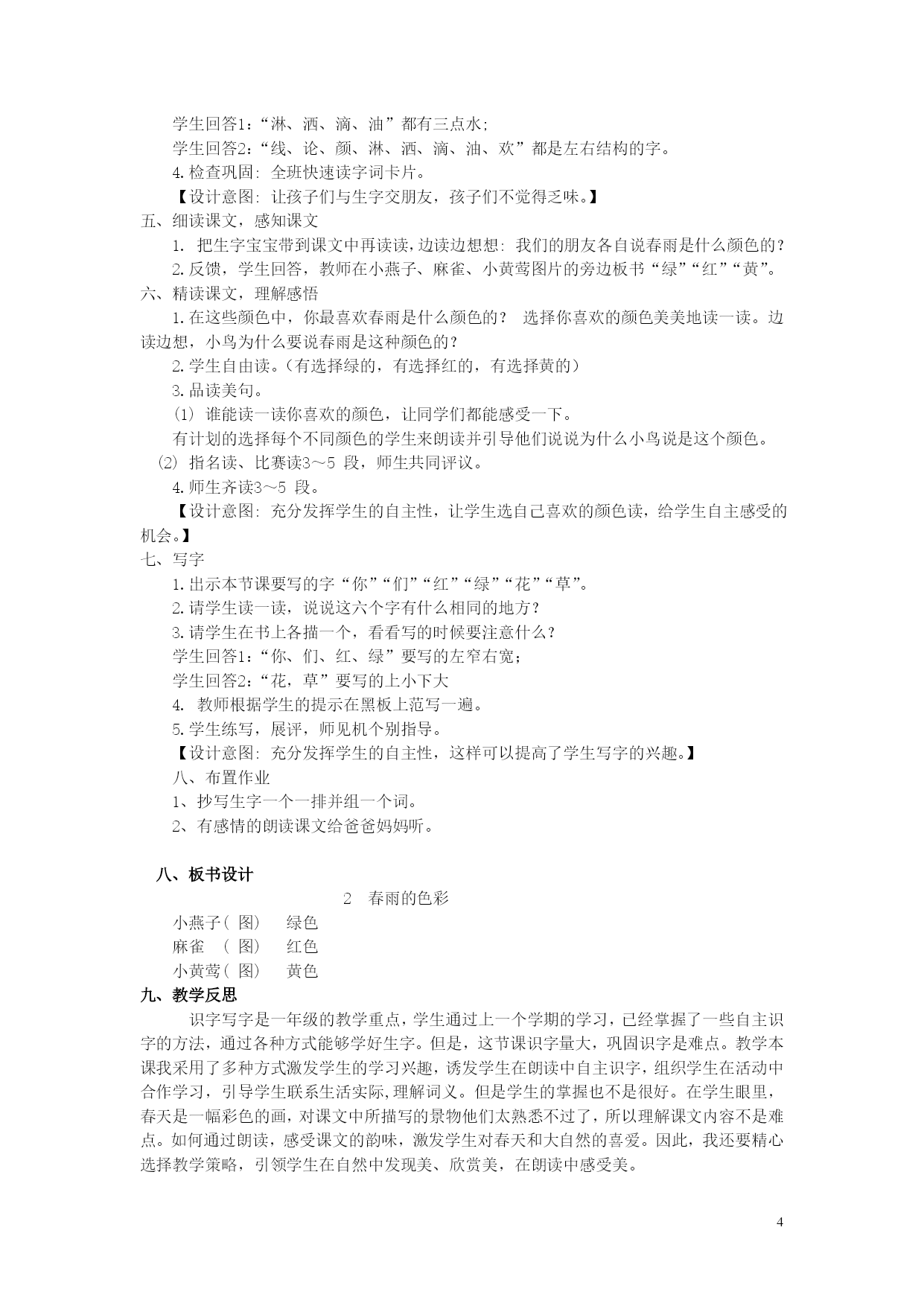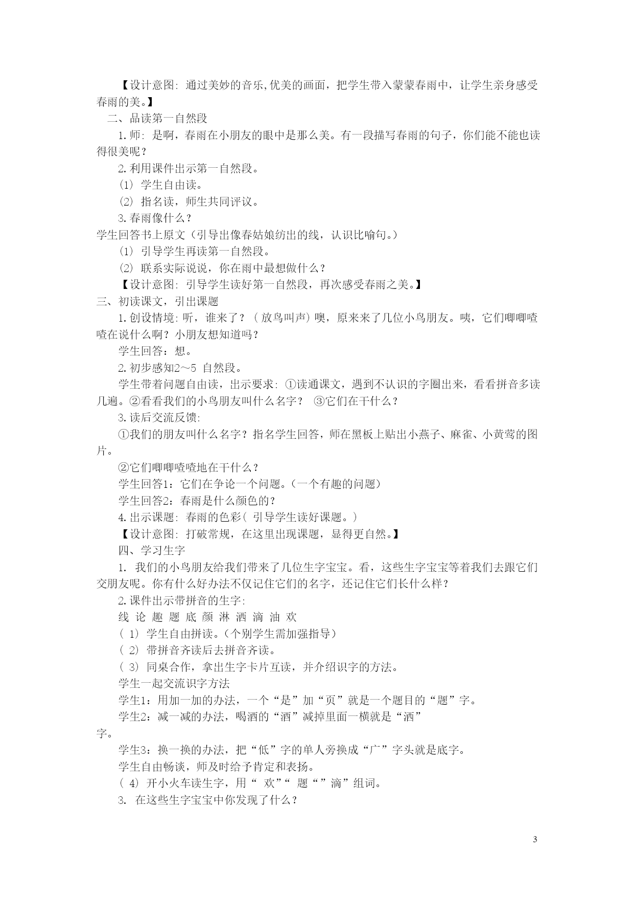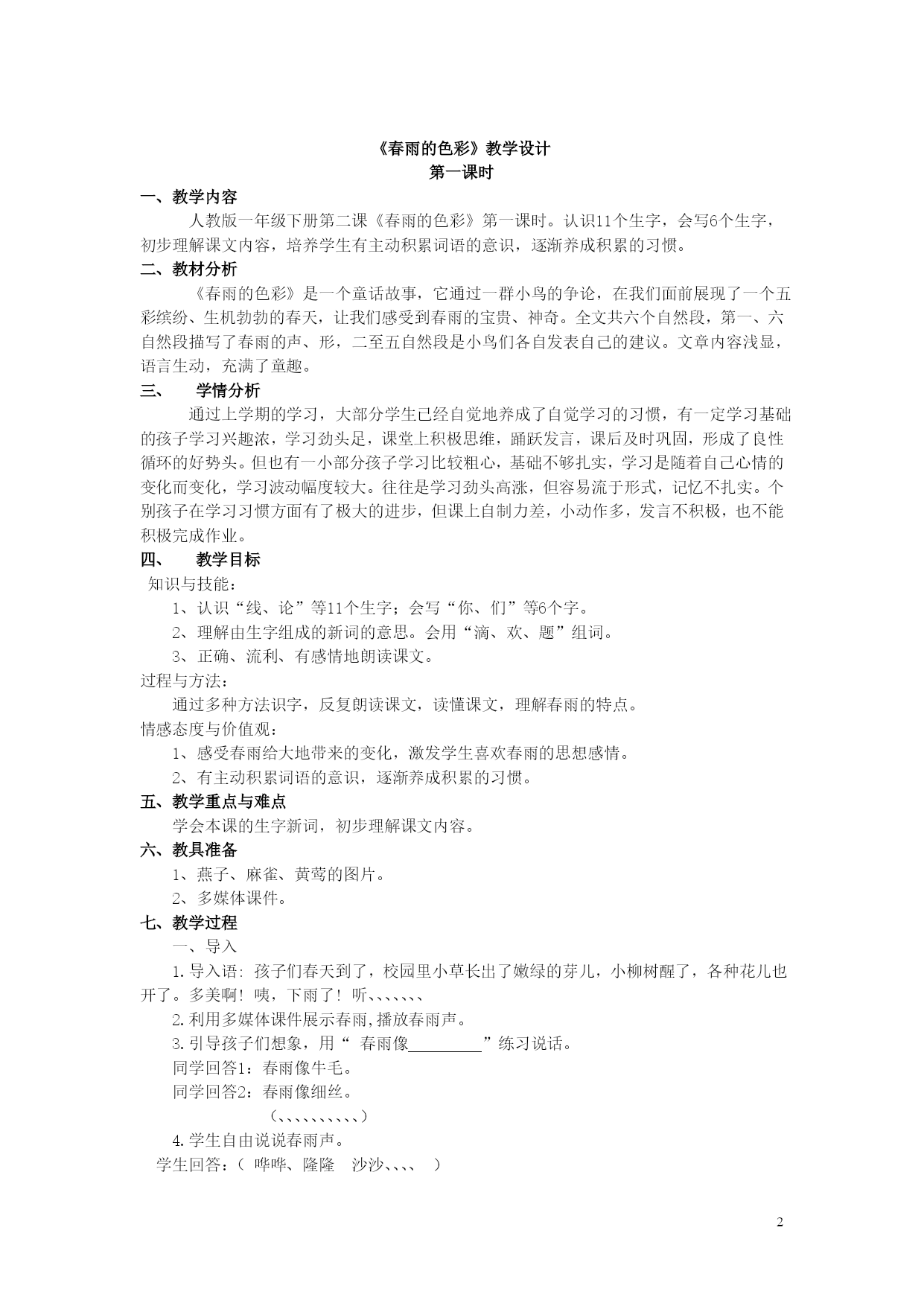 南昌市教育学会二十九届学术年会征文学科:小学语文题目:《春雨的色彩》教学设计作者:周珊学校高新区昌东镇第二小学邮编:330084电话:13064125775邮箱:HYPERLINK"mailto:1301288573@qq.com"1301288573@qq.com《春雨的色彩》教学设计第一课时一、教学内容人教版一年级下册第二课《春雨的色彩》第一课时。认识11个生字,会写6个生字,初步理解课文内容,培养学生有主动积累词语的意识,逐渐养成积累的习惯。二、教材分析《春雨的色彩》是一个童话故事,它通过一群小鸟的争论,在我们面前展现了一个五彩缤纷、生机勃勃的春天,让我们感受到春雨的宝贵、神奇。全文共六个自然段,第一、六自然段描写了春雨的声、形,二至五自然段是小鸟们各自发表自己的建议。文章内容浅显,语言生动,充满了童趣。学情分析通过上学期的学习,大部分学生已经自觉地养成了自觉学习的习惯,有一定学习基础的孩子学习兴趣浓,学习劲头足,课堂上积极思维,踊跃发言,课后及时巩固,形成了良性循环的好势头。但也有一小部分孩子学习比较粗心,基础不够扎实,学习是随着自己心情的变化而变化,学习波动幅度较大。往往是学习劲头高涨,但容易流于形式,记忆不扎实。个别孩子在学习习惯方面有了极大的进步,但课上自制力差,小动作多,发言不积极,也不能积极完成作业。教学目标知识与技能:1、认识“线、论”等11个生字;会写“你、们”等6个字。2、理解由生字组成的新词的意思。会用“滴、欢、题”组词。3、正确、流利、有感情地朗读课文。过程与方法:通过多种方法识字,反复朗读课文,读懂课文,理解春雨的特点。情感态度与价值观:1、感受春雨给大地带来的变化,激发学生喜欢春雨的思想感情。2、有主动积累词语的意识,逐渐养成积累的习惯。五、教学重点与难点学会本课的生字新词,初步理解课文内容。六、教具准备1、燕子、麻雀、黄莺的图片。2、多媒体HYPERLINK"http://www.chinesejy.com/Soft/"课件。七、教学过程一、导入1.导入语:孩子们春天到了,校园里小草长出了嫩绿的芽儿,小柳树醒了,各种花儿也开了。多美啊!咦,下雨了!听、、、、、、、2.利用多媒体课件展示春雨,播放春雨声。3.引导孩子们想象,用“春雨像”练习说话。同学回答1:春雨像牛毛。同学回答2:春雨像细丝。(、、、、、、、、、、)学生自由说说春雨声。学生回答:(哗哗、隆隆沙沙、、、、)【设计意图:通过美妙的音乐,优美的画面,把学生带入蒙蒙春雨中,让学生亲身感受春雨的美。】二、品读第一自然段1.师:是啊,春雨在小朋友的眼中是那么美。有一段描写春雨的句子,你们能不能也读得很美呢?2.利用课件出示第一自然段。(1)学生自由读。(2)指名读,师生共同评议。春雨像什么?学生回答书上原文(引导出像春姑娘纺出的线,认识比喻句。)引导学生再读第一自然段。(2)联系实际说说,你在雨中最想做什么?【设计意图:引导学生读好第一自然段,再次感受春雨之美。】三、初读课文,引出课题1.创设情境:听,谁来了?(放鸟叫声)噢,原来来了几位小鸟朋友。咦,它们唧唧喳喳在说什么啊?小朋友想知道吗?学生回答:想。2.初步感知2~5自然段。学生带着问题自由读,出示要求:①读通课文,遇到不认识的字圈出来,看看拼音多读几遍。②看看我们的小鸟朋友叫什么名字?③它们在干什么?3.读后交流反馈:①我们的朋友叫什么名字?指名学生回答,师在黑板上贴出小燕子、麻雀、小黄莺的图片。②它们唧唧喳喳地在干什么?学生回答1:它们在争论一个问题。(一个有趣的问题)学生回答2:春雨是什么颜色的?4.出示课题:春雨的色彩(引导学生读好课题。)【设计意图:打破常规,在这里出现课题,显得更自然。】四、学习生字1.我们的小鸟朋友给我们带来了几位生字宝宝。看,这些生字宝宝等着我们去跟它们交朋友呢。你有什么好办法不仅记住它们的名字,还记住它们长什么样?2.课件出示带拼音的生字:线论趣题底颜淋洒滴油欢(1)学生自由拼读。(个别学生需加强指导)(2)带拼音齐读后去拼音齐读。(3)同桌合作,拿出生字卡片互读,并介绍识字的方法。学生一起交流识字方法学生1:用加一加的办法,一个“是”加“页”就是一个题目的“题”字。学生2:减一减的办法,喝酒的“酒”减掉里面一横就是“洒”字。学生3:换一换的办法,把“低”字的单人旁换成“广”字头就是底字。学生自由畅谈,师及时给予肯定和表扬。(4)开小火车读生字,用“欢”“题“”滴”组词。3.在这些生字宝宝中你发现了什么?学生回答1:“淋、洒、滴、油”