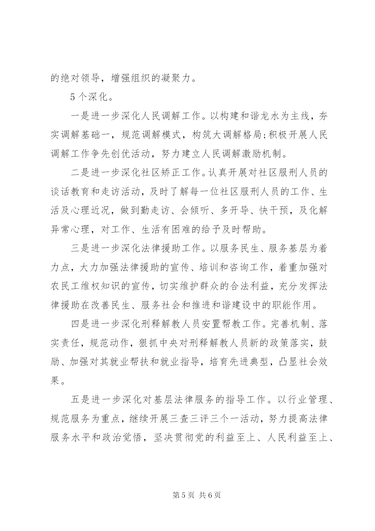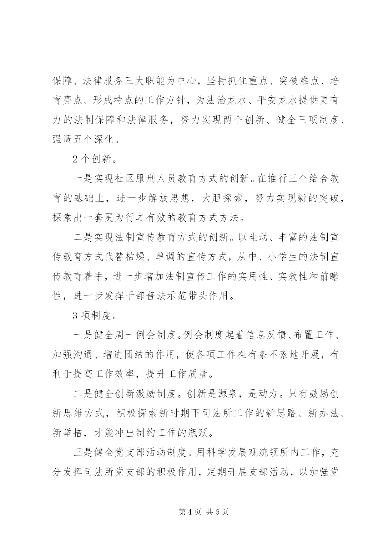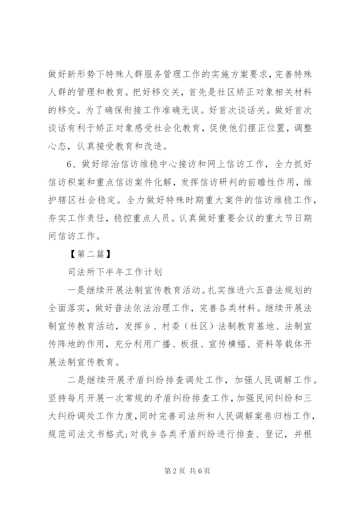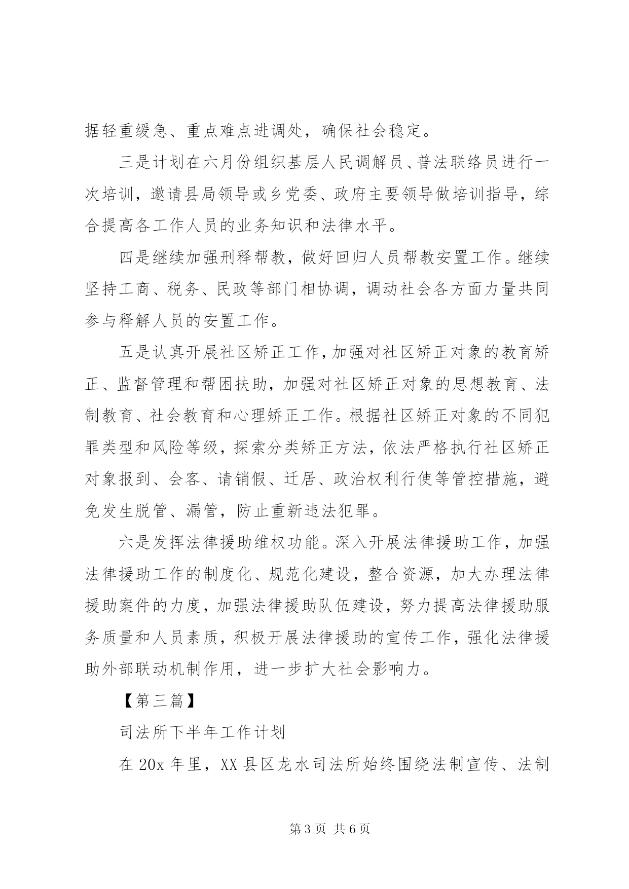 第PAGE\*Arabic\*MERGEFORMAT6页共NUMPAGES\*MERGEFORMAT6页20XX年司法所下半年工作计划精选【第一篇】司法所下半年工作计划1、坚持每月开展普法宣传活动,利用街道、社区各类资源,联合相关科室、各社区工作站打造普法宣传的常态项目。重点组织开展好12。4等重大节日节点的普法宣传活动。2、进一步完善一村(社区)一法律顾问工作,形成有关工作制度,整合好社区各类资源,更好的发挥社区法律顾问的作用,进一步建设好法治社区。3、加快完成应急指挥中心的建设,通过整合资源、建立集信息、协调、调度、指挥于一体的高度智能化的应急系统,构建一个平战结合、预防为主的应急指挥平台;完善值班体系建设,进一步健全值班制度,完善值班网络、落实值班工作责任,实现街道24小时值守,落实基层工作职能,切实加强突发事件防范和处置工作。4、加强人民调解工作,发挥挂点律师、法官、检察官服务作用,提高调解成功率,有效将社会矛盾化解在基层。深入开展人民调解示范活动。进一步完善矛盾纠纷排查调处工作考核机制,做好调解员队伍建设、调解工作培训、规范调解格式文书拟定等工作,继续推动人民调解示范工作全面开展。5、做好社区矫正和安置帮教工作,认真落实区司法局关于做好新形势下特殊人群服务管理工作的实施方案要求,完善特殊人群的管理和教育。把好移交关,首先是社区矫正对象相关材料的移交。为了确保衔接工作准确无误。好首次谈话关。做好首次谈话有利于矫正对象感受社会化教育,促使他们摆正位置,调整心态,认真接受教育和改造。6、做好综治信访维稳中心接访和网上信访工作,全力抓好信访积案和重点信访案件化解,发挥信访研判的前瞻性作用,维护辖区社会稳定。全力做好特殊时期重大案件的信访维稳工作,夯实工作责任,稳控重点人员。认真做好重要会议的重大节日期间信访工作。【第二篇】司法所下半年工作计划一是继续开展法制宣传教育活动。扎实推进六五普法规划的全面落实,做好普法依法治理工作,完善各类材料。继续开展法制宣传教育活动,发挥乡、村委(社区)法制教育基地、法制宣传阵地的作用,充分利用广播、板报、宣传横幅、资料等载体开展法制宣传教育。二是继续开展矛盾纠纷排查调处工作,加强人民调解工作。坚持每月开展一次常规的矛盾纠纷排查工作,加强民间纠纷和三大纠纷调处工作力度,同时完善司法所和人民调解案卷归档工作,规范司法文书格式;对我乡各类矛盾纠纷进行排查、登记,并根据轻重缓急、重点难点进调处,确保社会稳定。三是计划在六月份组织基层人民调解员、普法联络员进行一次培训,邀请县局领导或乡党委、政府主要领导做培训指导,综合提高各工作人员的业务知识和法律水平。四是继续加强刑释帮教,做好回归人员帮教安置工作。继续坚持工商、税务、民政等部门相协调,调动社会各方面力量共同参与释解人员的安置工作。五是认真开展社区矫正工作,加强对社区矫正对象的教育矫正、监督管理和帮困扶助,加强对社区矫正对象的思想教育、法制教育、社会教育和心理矫正工作。根据社区矫正对象的不同犯罪类型和风险等级,探索分类矫正方法,依法严格执行社区矫正对象报到、会客、请销假、迁居、政治权利行使等管控措施,避免发生脱管、漏管,防止重新违法犯罪。六是发挥法律援助维权功能。深入开展法律援助工作,加强法律援助工作的制度化、规范化建设,整合资源,加大办理法律援助案件的力度,加强法律援助队伍建设,努力提高法律援助服务质量和人员素质,积极开展法律援助的宣传工作,强化法律援助外部联动机制作用,进一步扩大社会影响力。【第三篇】司法所下半年工作计划在20x年里,XX县区龙水司法所始终围绕法制宣传、法制保障、法律服务三大职能为中心,坚持抓住重点、突破难点、培育亮点、形成特点的工作方针,为法治龙水、平安龙水提供更有力的法制保障和法律服务,努力实现两个创新、健全三项制度、强调五个深化。2个创新。一是实现社区服刑人员教育方式的创新。在推行三个给合教育的基础上,进一步解放思想,大胆探索,努力实现新的突破,探索出一套更为行之有效的教育方式方法。二是实现法制宣传教育方式的创新。以生动、丰富的法制宣传教育方式代替枯燥、单调的宣传方式,从中、小学生的法制宣传教育着手,进一步增加法制宣传工作的实用性、实效性和前瞻性,进一步发挥干部普法示范带头作用。3项制度。一是健全周一例会制度。例会制度起着信息反馈、布置工作、加强沟通、增进团结的作用,使各项工作在有条不紊地开展,有利于提高工作效率,提升工作质量。二是健全创新激励制度。创新是源泉,是动力。只有鼓励创新思维方式,积极探索新时期下司法所工作的新思路、新办法、新举措,才能冲出制约工作的瓶颈。三是健全党支部活动制度。用科学发展观统领所内工作,充分发挥司法所党支部的积极作用,定期开展支部活动,以加强党的绝对领导,增强组织的凝聚力。