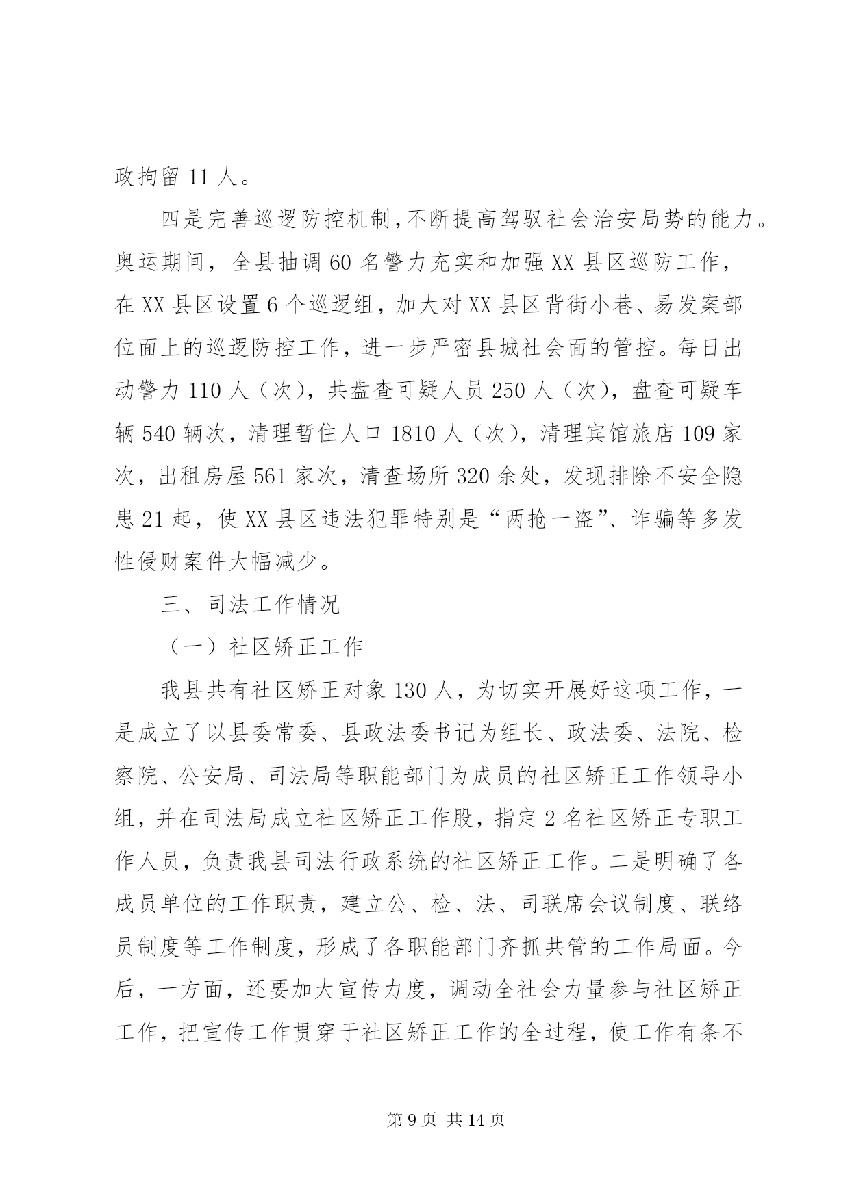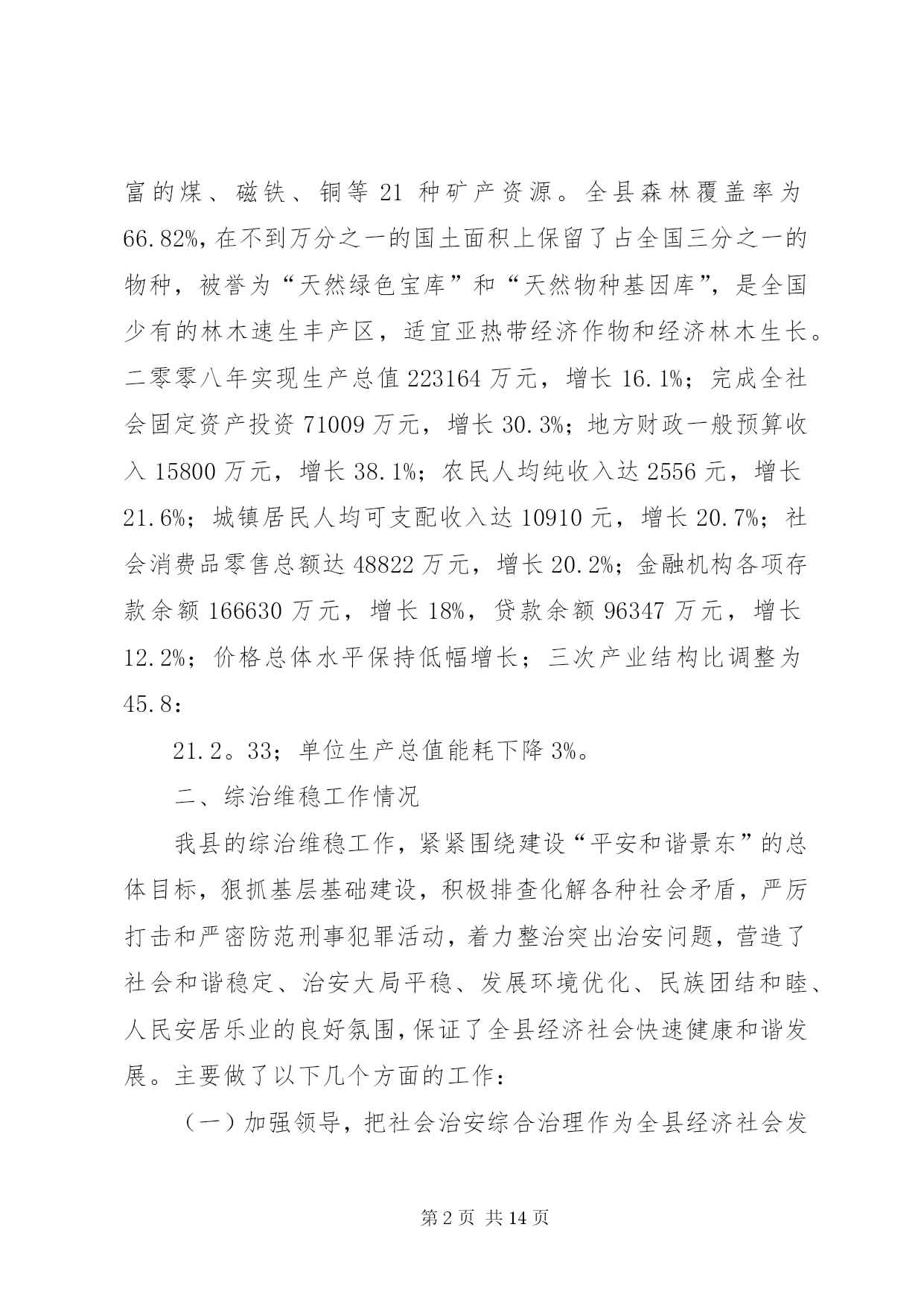 第PAGE\*Arabic\*MERGEFORMAT14页共NUMPAGES\*MERGEFORMAT14页县综治维稳及司法工作汇报尊敬的施厅长、余局长,各位领导:首先,我代表县四班子,对省司法厅、市司法局各位领导在百忙之中始终关心支持景东经济社会发展,特别是对景东司法工作的大力支持,表示衷心地感谢。对各位莅临景东检查指导工作表示热烈的欢迎。下面,我就全县综治维稳及司法工作情况向各位领导作简要汇报。一、基本县情景东位于滇西南中部,*市最北端,东与楚雄州XX县区、XX县区、XX县区接壤,南与我市镇沅县毗邻,西与临沧市临翔区、XX县区隔江相望,北与大理州南涧、XX县区山水相连。东西宽61公里,南北长73公里,总面积4532平方公里,其XX县区面积占95.5%,坝区占4.5%。辖13个乡(镇)、167个村民委员会、3个社区、2339个村民小组。全县总人口37.9万人,境内居住着彝、汉、回、傣、布朗等25种民族,其中,少数民族人口占总人口的46.3%,彝族占总人口的39.5%,是一个多民族融合的山区农业县,是XX省6个纯彝族自治县之一,也是一个国家级贫困县。境内有大朝山和漫湾两个百万千瓦级的国家大型水电站,有无量山、哀牢山两个国家级自然保护区,因保护区内有500余只国家一级重点保护珍稀濒危动物——黑冠长臂猿,而获“世界仅有,中国之冠”的“中国黑冠长臂猿之乡”之美誉。有较为丰富的煤、磁铁、铜等21种矿产资源。全县森林覆盖率为66.82%,在不到万分之一的国土面积上保留了占全国三分之一的物种,被誉为“天然绿色宝库”和“天然物种基因库”,是全国少有的林木速生丰产区,适宜亚热带经济作物和经济林木生长。二零零八年实现生产总值223164万元,增长16.1%;完成全社会固定资产投资71009万元,增长30.3%;地方财政一般预算收入15800万元,增长38.1%;农民人均纯收入达2556元,增长21.6%;城镇居民人均可支配收入达10910元,增长20.7%;社会消费品零售总额达48822万元,增长20.2%;金融机构各项存款余额166630万元,增长18%,贷款余额96347万元,增长12.2%;价格总体水平保持低幅增长;三次产业结构比调整为45.8:21.2。33;单位生产总值能耗下降3%。二、综治维稳工作情况我县的综治维稳工作,紧紧围绕建设“平安和谐景东”的总体目标,狠抓基层基础建设,积极排查化解各种社会矛盾,严厉打击和严密防范刑事犯罪活动,着力整治突出治安问题,营造了社会和谐稳定、治安大局平稳、发展环境优化、民族团结和睦、人民安居乐业的良好氛围,保证了全县经济社会快速健康和谐发展。主要做了以下几个方面的工作:(一)加强领导,把社会治安综合治理作为全县经济社会发展的重要工作来抓一是加强领导,明确责任。县委、县人民政府高度重视社会治安综合治理工作,成立社会治安综合治理工作领导小组,各乡(镇)党委、政府、县直各有关单位也成立相应机构。全县13个乡(镇)都成立综治维稳委员会,各村、社区都有综治维稳室,共有警务室27个,治保会178个,调解会174个,村民小组治安信息员2345名。年初,召开全县社会治安综合治理工作会议,与各乡(镇)、县直各办局、各重点单位签订目标责任书,将各项责任细化分解落实到基层,并严格进行考核,兑现奖惩。二是高度重视,高位推动。把社会治安综合治理工作纳入经济社会发展总体规划,作为一项重要的民心工程来抓。县人民政府年初人代会对社会治安综合治理工作进行全面部署,召开专门会议听取工作情况汇报,对综治工作中存在的问题努力给予协调解决。每年县委常委会、政府常务会专题听取综治维稳及司法工作情况汇报,并作分析、研判,县委、县人民政府主要领导定期或不定期听取综治工作情况汇报,全面指挥与协调各项工作的顺利开展。三是加大投入,保证经费。将社会治安综合治理经费纳入县财政预算,加大投入,保证运转经费,同时加大对基层的投入,通过以奖代补的形式,每年补助每个乡(镇)综治维稳办经费2000元,补助村(社区)治保会和调委会1000元。(二)突出重点,认真落实社会治安综合治理工作各项措施,确保全县社会稳定一是强化情报信息工作。以县内移民搬迁安置、企业改制、土地权属及奥运“安保”,重要会议、重大活动为重点,及时获取了一批预警性、内幕性、深层次的情报信息,发现和掌握不稳定因素,为市委、市政府和上级公安机关掌握动态、消除社会不稳定隐患、防止人民内部矛盾激化提供了重要保障,赢得了工作的主动。二零零八年共收集掌握各类政治情报信息38条,上级采用20条,综合研判材料33份。加强对93名重点人员的列管监控,落实包保责任,做到盯死看牢。在全县范围内完善了县、乡、村、组四级矛盾纠纷排查、调处、督办工作机制,对各种矛盾纠纷苗头做到早介入、早协调、早处置,