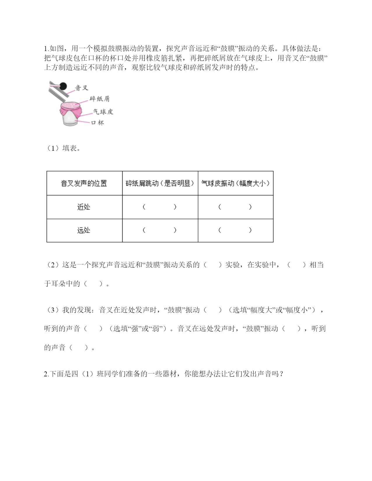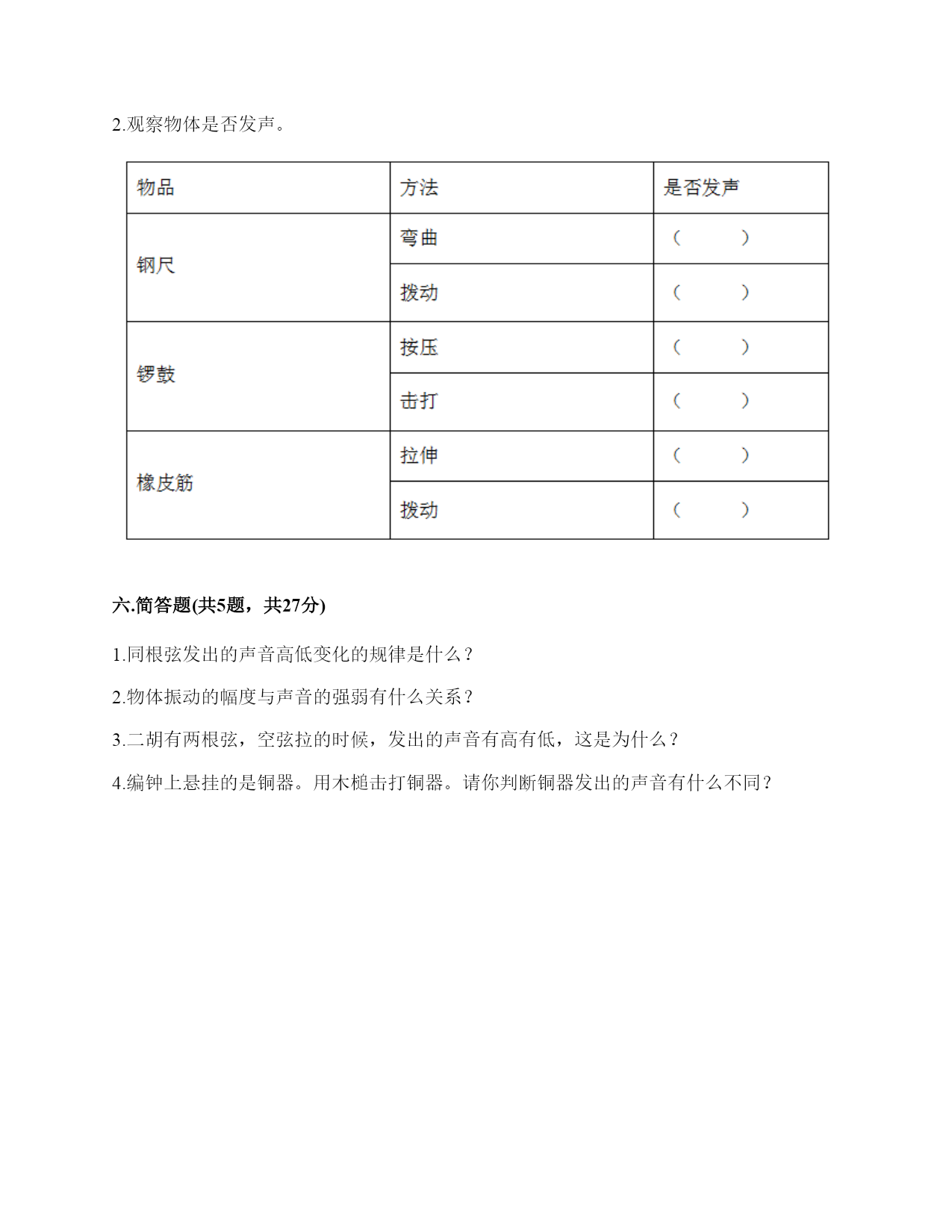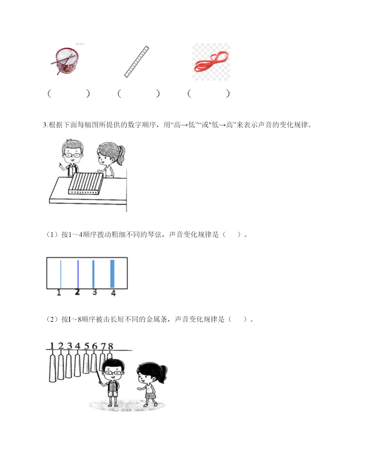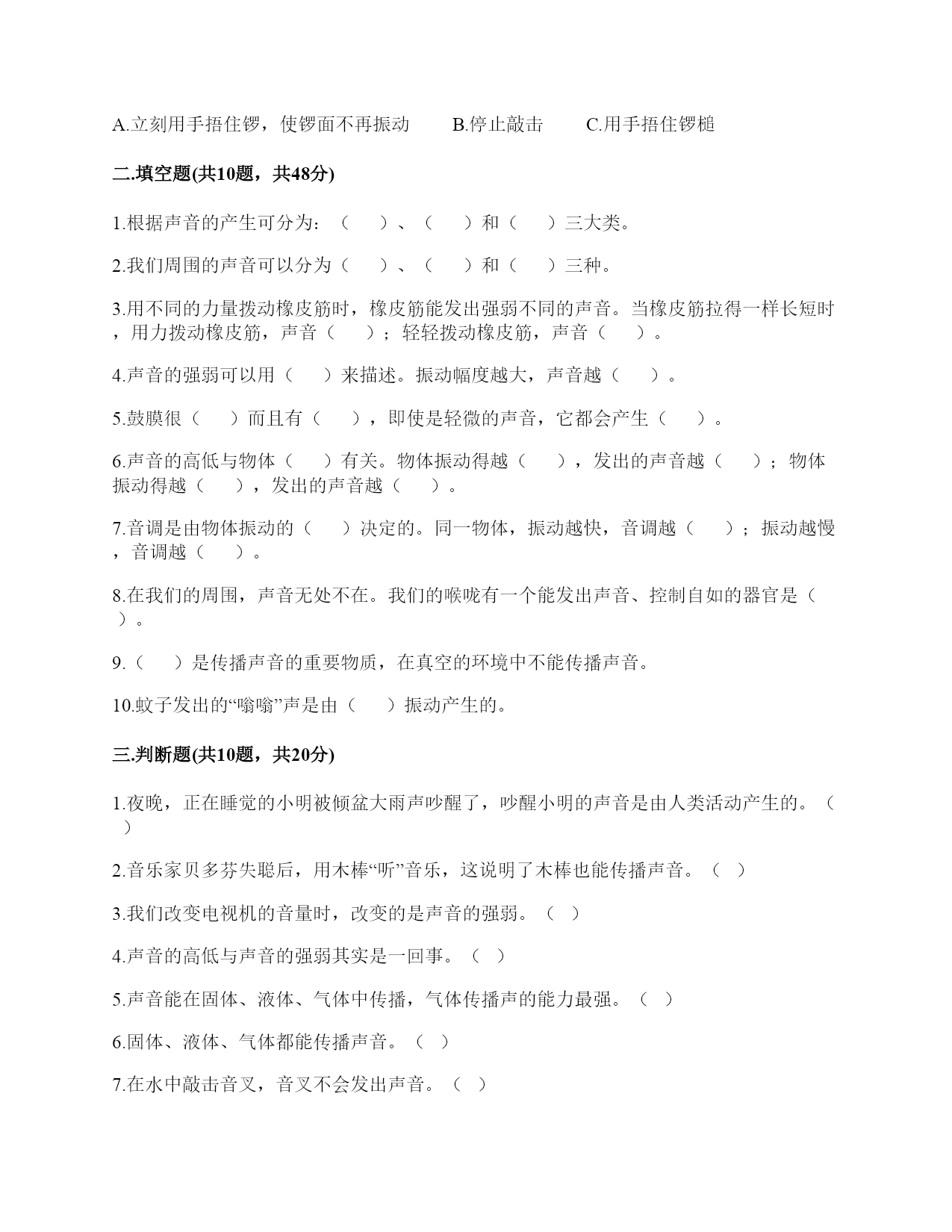 小学科学《声音》练习题一.选择题(共10题,共20分)1.声音的高低是由物体振动的()决定的。A.快慢B.幅度C.是否振动2.下面对“昨晚雷声很大”的描述错误的是()。A.雷声是通过空气传播而来的B.雷声很大,说明音量很强C.我们听到雷声是因为耳道中听小骨振动产生的3.我们把手放在耳廓后面,是为了()。A.扩大耳廓听得更清楚B.控制声音进入耳朵C.为了好看4.写字的声音可以通过()传播到紧贴在桌面上的耳朵里。A.纸B.笔C.桌面5.一般情况下,成年女子的声带比成年男子的短,振动速度快,这说明()。A.女子音高比男子高B.女子音高比男子低C.女子音量比男子高6.耳廓的作用是()。A.将声波转化为振动B.将听觉信号传递到大脑C.收集声音7.关于声音,下面说法正确的是()。A.人说话是靠舌头振动发声的B.一切发声物体都在振动C.只要物体在振动,我们人耳就能听到声音8.下面几种做法中,()不能发出声音。A.敲击鼓面B.弹奏钢琴C.按压皮筋9.流水的声音是由()产生的。A.水的振动B.声带的振动C.岩石的振动10.要让正在发声的锣立刻停止发声,应该()。A.立刻用手捂住锣,使锣面不再振动B.停止敲击C.用手捂住锣槌二.填空题(共10题,共48分)1.根据声音的产生可分为:()、()和()三大类。2.我们周围的声音可以分为()、()和()三种。3.用不同的力量拨动橡皮筋时,橡皮筋能发出强弱不同的声音。当橡皮筋拉得一样长短时,用力拨动橡皮筋,声音();轻轻拨动橡皮筋,声音()。4.声音的强弱可以用()来描述。振动幅度越大,声音越()。5.鼓膜很()而且有(),即使是轻微的声音,它都会产生()。6.声音的高低与物体()有关。物体振动得越(),发出的声音越();物体振动得越(),发出的声音越()。7.音调是由物体振动的()决定的。同一物体,振动越快,音调越();振动越慢,音调越()。8.在我们的周围,声音无处不在。我们的喉咙有一个能发出声音、控制自如的器官是()。9.()是传播声音的重要物质,在真空的环境中不能传播声音。10.蚊子发出的“嗡嗡”声是由()振动产生的。三.判断题(共10题,共20分)1.夜晚,正在睡觉的小明被倾盆大雨声吵醒了,吵醒小明的声音是由人类活动产生的。()2.音乐家贝多芬失聪后,用木棒“听”音乐,这说明了木棒也能传播声音。()3.我们改变电视机的音量时,改变的是声音的强弱。()4.声音的高低与声音的强弱其实是一回事。()5.声音能在固体、液体、气体中传播,气体传播声的能力最强。()6.固体、液体、气体都能传播声音。()7.在水中敲击音叉,音叉不会发出声音。()8.金属与空气传播声音的本领是一样的。()9.空气能传播声音,但是而水却不能传播声音。()10.吹奏竖笛时发出的声音是由笛管内空气的振动产生的。()四.连线题(共1题,共8分)1.连一连。拨动拉得较紧的橡皮筋听到的声音高拨动拉得较松的橡皮筋用力敲击锣听到的声音低轻轻敲击锣鼓皮振动得快听到的声音强鼓皮振动得慢弹拨伸出桌面距离长的尺子听到的声音弱弹拨伸出桌面距离短的尺子五.填表题(共2题,共12分)1.想一想,坐在教室里你能听到哪些声音?2.观察物体是否发声。六.简答题(共5题,共27分)1.同根弦发出的声音高低变化的规律是什么?2.物体振动的幅度与声音的强弱有什么关系?3.二胡有两根弦,空弦拉的时候,发出的声音有高有低,这是为什么?4.编钟上悬挂的是铜器。用木槌击打铜器。请你判断铜器发出的声音有什么不同?5.想一想,上课时坐在教室里能听到哪些声音?坐在教室里能听到的声音有?七.材料题(共3题,共19分)1.写出下图各部分的名称。2.小明有3根长短相同,粗细不同的钢管,小丽说:“我可以闭上眼睛,只通过用相同的力敲击钢管就可以判断它们的粗细。”请解释其中的原理。3.用三个塑料袋分别装上沙子、水和空气封口,将三个塑料袋分别放在桌子上,一只耳朵轻轻地贴在塑料袋上,捂住另一只耳朵。在距离一臂远处,用铅笔上的橡皮轻轻敲击桌面。请分析隔着哪个塑料袋听到的声音效果好,并试着排序。八.综合题(共5题,共34分)1.如图,用一个模拟鼓膜振动的装置,探究声音远近和“鼓膜”振动的关系。具体做法是:把气球皮包在口杯的杯口处并用橡皮筋扎紧,再把碎纸屑放在气球皮上,用音叉在“鼓膜”上方制造远近不同的声音,观察比较气球皮和碎纸屑发声时的特点。(1)填表。(2)这是一个探究声音远近和“鼓膜”振动关系的()实验,在实验中,()相当于耳朵中的()。(3)我的发现:音叉在近处发声时,“鼓膜”振动()(选填“幅度大”或“幅度小”),听到的声音()(选填“