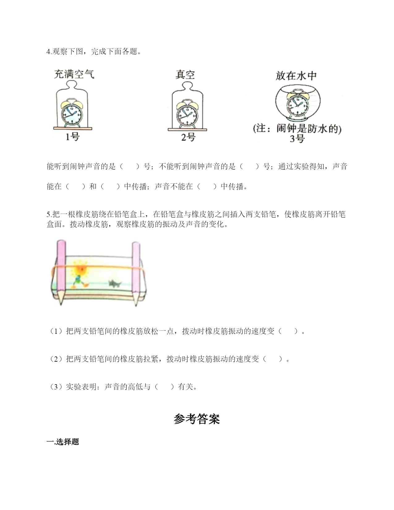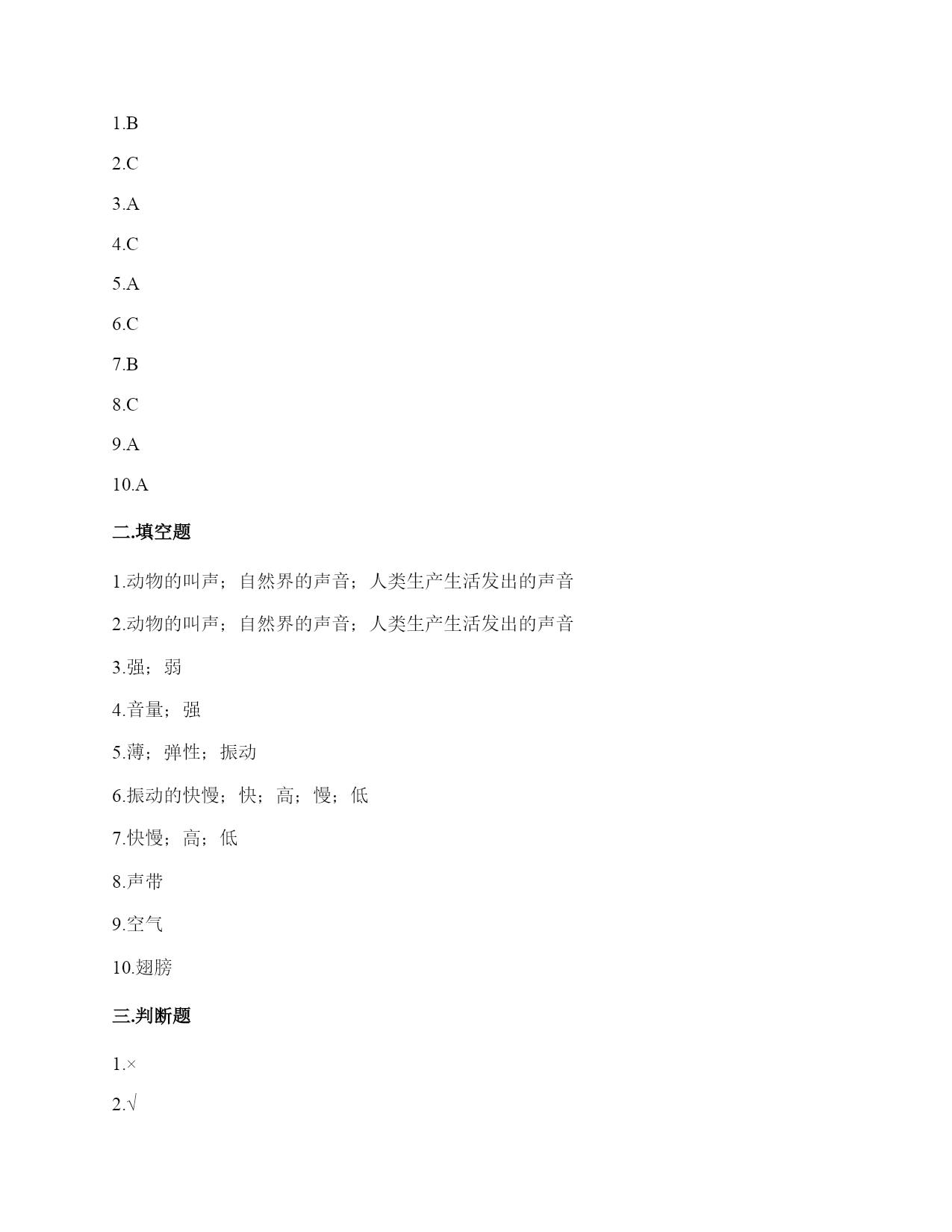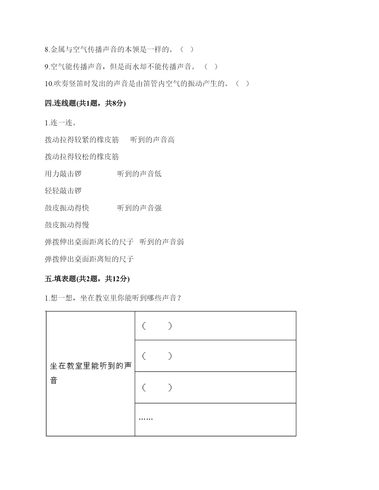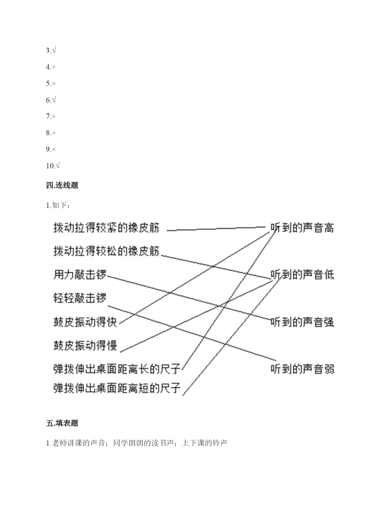 小学科学《声音》练习题一.选择题(共10题,共20分)1.声音的高低是由物体振动的()决定的。A.快慢B.幅度C.是否振动2.下面对“昨晚雷声很大”的描述错误的是()。A.雷声是通过空气传播而来的B.雷声很大,说明音量很强C.我们听到雷声是因为耳道中听小骨振动产生的3.我们把手放在耳廓后面,是为了()。A.扩大耳廓听得更清楚B.控制声音进入耳朵C.为了好看4.写字的声音可以通过()传播到紧贴在桌面上的耳朵里。A.纸B.笔C.桌面5.一般情况下,成年女子的声带比成年男子的短,振动速度快,这说明()。A.女子音高比男子高B.女子音高比男子低C.女子音量比男子高6.耳廓的作用是()。A.将声波转化为振动B.将听觉信号传递到大脑C.收集声音7.关于声音,下面说法正确的是()。A.人说话是靠舌头振动发声的B.一切发声物体都在振动C.只要物体在振动,我们人耳就能听到声音8.下面几种做法中,()不能发出声音。A.敲击鼓面B.弹奏钢琴C.按压皮筋9.流水的声音是由()产生的。A.水的振动B.声带的振动C.岩石的振动10.要让正在发声的锣立刻停止发声,应该()。A.立刻用手捂住锣,使锣面不再振动B.停止敲击C.用手捂住锣槌二.填空题(共10题,共48分)1.根据声音的产生可分为:()、()和()三大类。2.我们周围的声音可以分为()、()和()三种。3.用不同的力量拨动橡皮筋时,橡皮筋能发出强弱不同的声音。当橡皮筋拉得一样长短时,用力拨动橡皮筋,声音();轻轻拨动橡皮筋,声音()。4.声音的强弱可以用()来描述。振动幅度越大,声音越()。5.鼓膜很()而且有(),即使是轻微的声音,它都会产生()。6.声音的高低与物体()有关。物体振动得越(),发出的声音越();物体振动得越(),发出的声音越()。7.音调是由物体振动的()决定的。同一物体,振动越快,音调越();振动越慢,音调越()。8.在我们的周围,声音无处不在。我们的喉咙有一个能发出声音、控制自如的器官是()。9.()是传播声音的重要物质,在真空的环境中不能传播声音。10.蚊子发出的“嗡嗡”声是由()振动产生的。三.判断题(共10题,共20分)1.夜晚,正在睡觉的小明被倾盆大雨声吵醒了,吵醒小明的声音是由人类活动产生的。()2.音乐家贝多芬失聪后,用木棒“听”音乐,这说明了木棒也能传播声音。()3.我们改变电视机的音量时,改变的是声音的强弱。()4.声音的高低与声音的强弱其实是一回事。()5.声音能在固体、液体、气体中传播,气体传播声的能力最强。()6.固体、液体、气体都能传播声音。()7.在水中敲击音叉,音叉不会发出声音。()8.金属与空气传播声音的本领是一样的。()9.空气能传播声音,但是而水却不能传播声音。()10.吹奏竖笛时发出的声音是由笛管内空气的振动产生的。()四.连线题(共1题,共8分)1.连一连。拨动拉得较紧的橡皮筋听到的声音高拨动拉得较松的橡皮筋用力敲击锣听到的声音低轻轻敲击锣鼓皮振动得快听到的声音强鼓皮振动得慢弹拨伸出桌面距离长的尺子听到的声音弱弹拨伸出桌面距离短的尺子五.填表题(共2题,共12分)1.想一想,坐在教室里你能听到哪些声音?2.观察物体是否发声。六.简答题(共5题,共27分)1.同根弦发出的声音高低变化的规律是什么?2.物体振动的幅度与声音的强弱有什么关系?3.二胡有两根弦,空弦拉的时候,发出的声音有高有低,这是为什么?4.编钟上悬挂的是铜器。用木槌击打铜器。请你判断铜器发出的声音有什么不同?5.想一想,上课时坐在教室里能听到哪些声音?坐在教室里能听到的声音有?七.材料题(共3题,共19分)1.写出下图各部分的名称。2.小明有3根长短相同,粗细不同的钢管,小丽说:“我可以闭上眼睛,只通过用相同的力敲击钢管就可以判断它们的粗细。”请解释其中的原理。3.用三个塑料袋分别装上沙子、水和空气封口,将三个塑料袋分别放在桌子上,一只耳朵轻轻地贴在塑料袋上,捂住另一只耳朵。在距离一臂远处,用铅笔上的橡皮轻轻敲击桌面。请分析隔着哪个塑料袋听到的声音效果好,并试着排序。八.综合题(共5题,共34分)1.如图,用一个模拟鼓膜振动的装置,探究声音远近和“鼓膜”振动的关系。具体做法是:把气球皮包在口杯的杯口处并用橡皮筋扎紧,再把碎纸屑放在气球皮上,用音叉在“鼓膜”上方制造远近不同的声音,观察比较气球皮和碎纸屑发声时的特点。(1)填表。(2)这是一个探究声音远近和“鼓膜”振动关系的()实验,在实验中,()相当于耳朵中的()。(3)我的发现:音叉在近处发声时,“鼓膜”振动()(选填“幅度大”或“幅度小”),听到的声音()(选填“