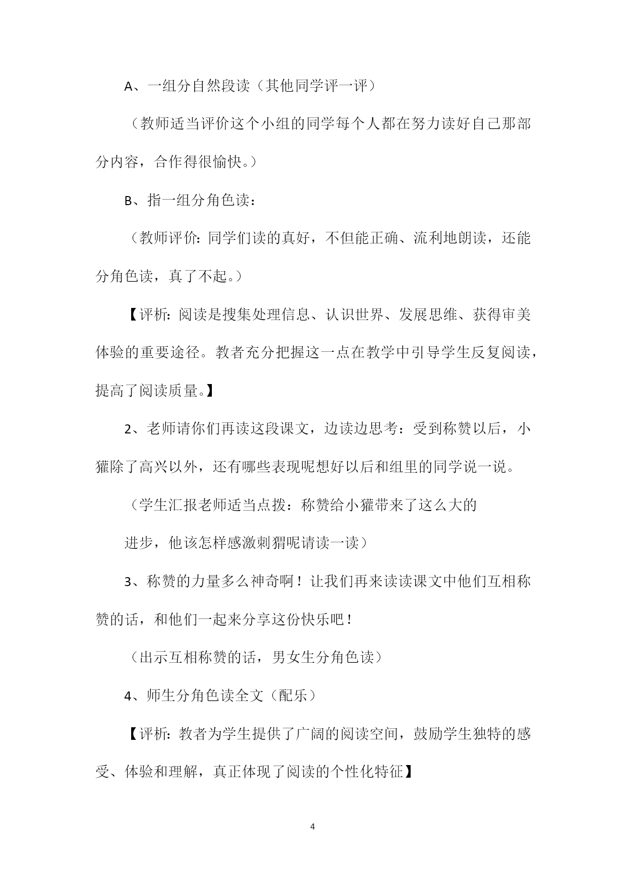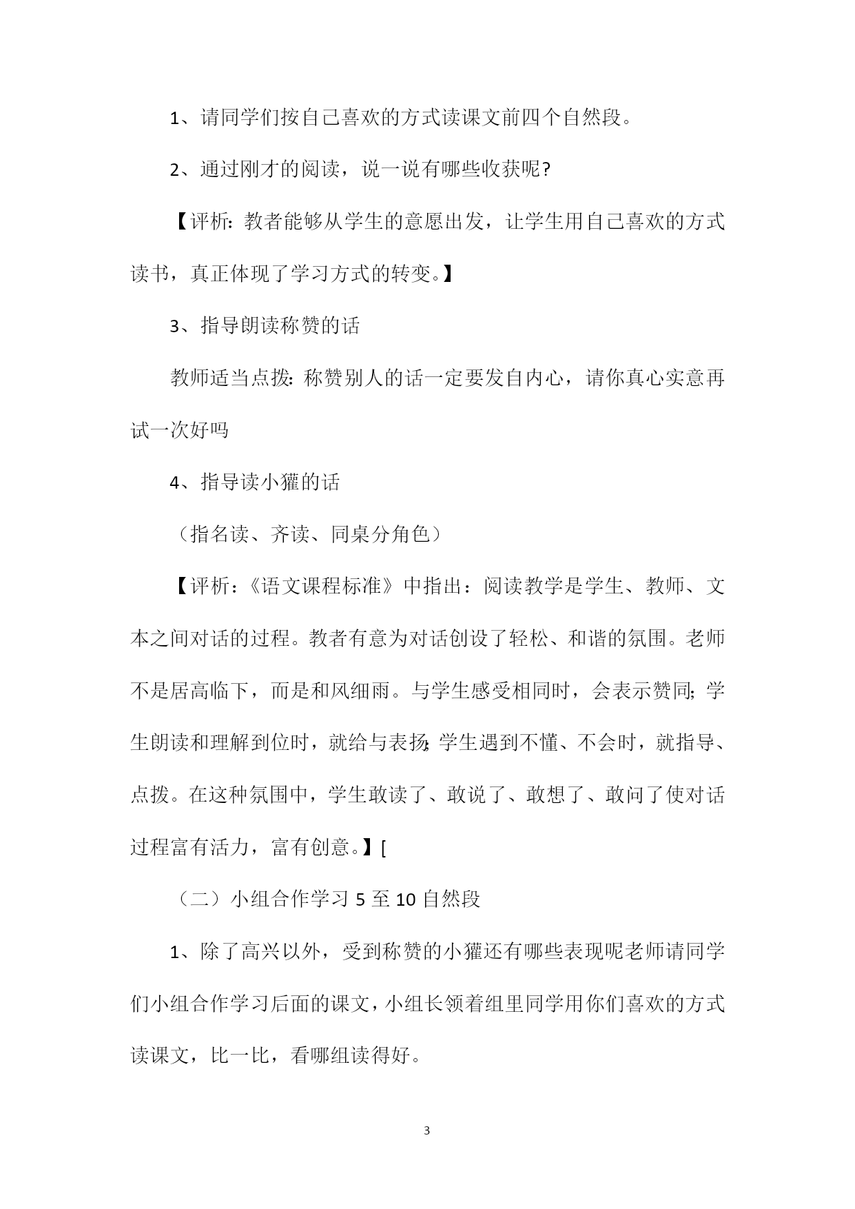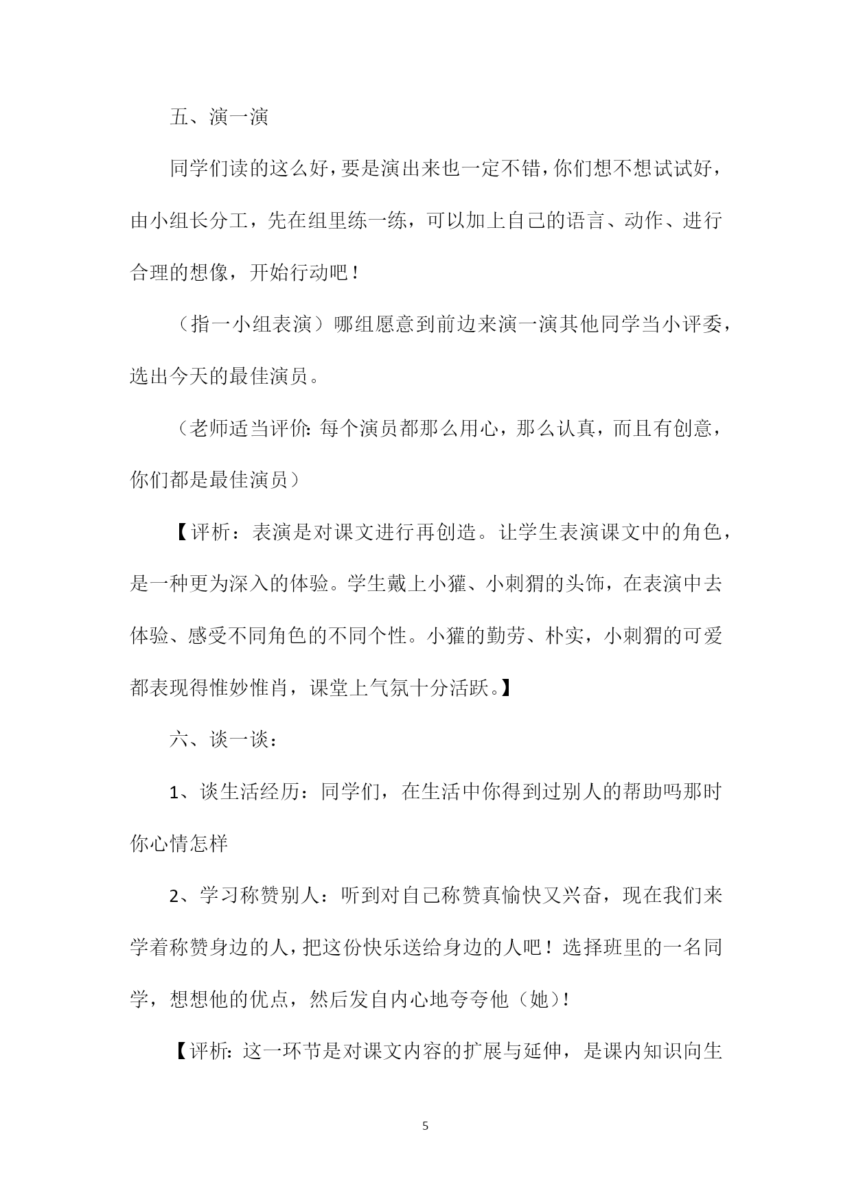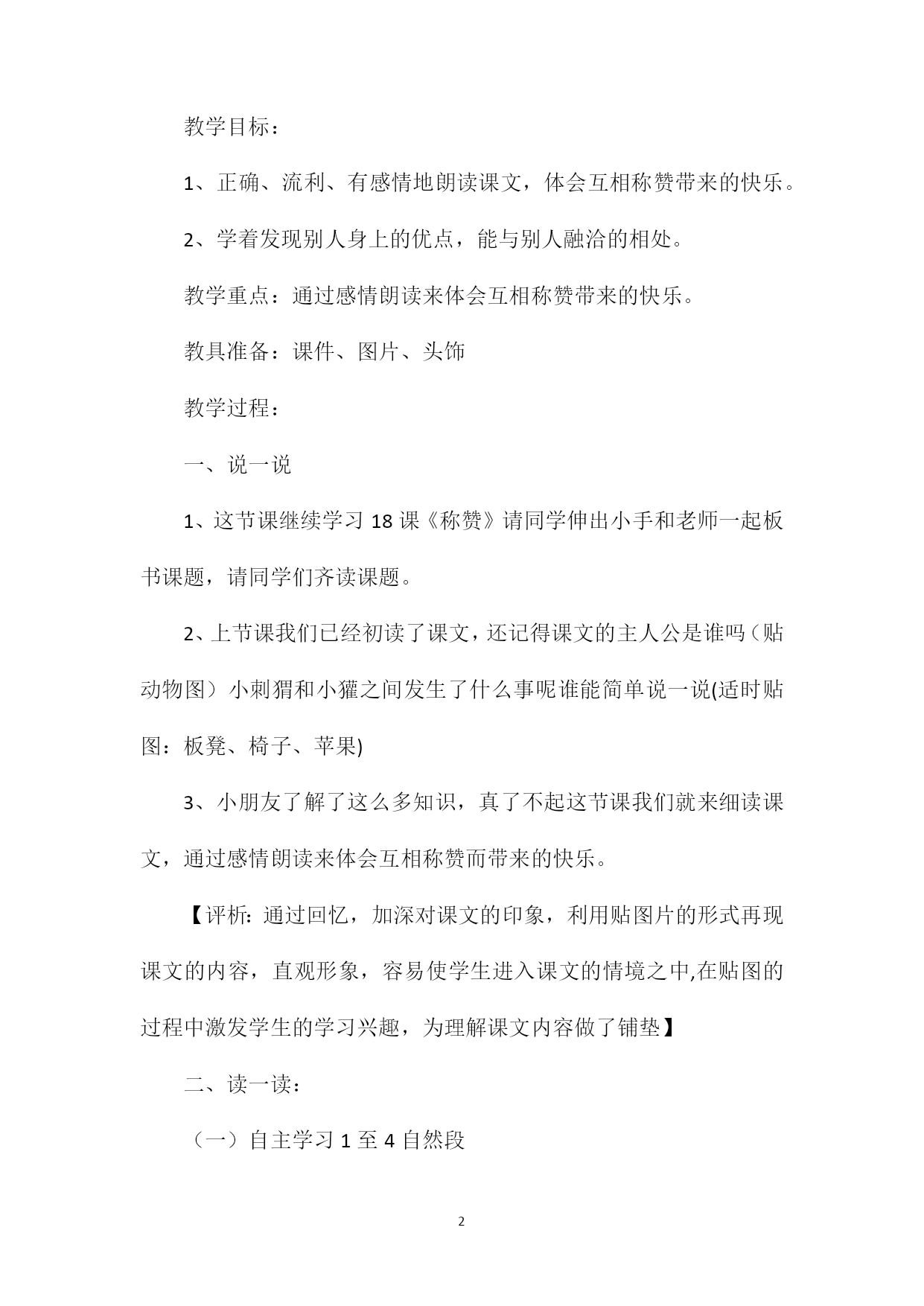 PAGEPAGE6《称赞》教学设计十三《称赞》是义务教育课程标准实验教科书二年级上册的一篇融趣味性、人文性于一体的阅读课文。本文以小刺猬和小獾的对话为主要形式,展现出一幅幅融洽、动人的画面。通过朗读小刺猬和小獾富有人情味、富有真情的对话使学生受到触动和启发。设计理念:在设计本节课的教学时,我以学生发展为本,以朗读为重点,使学生在读中有所感悟、在读中受到人文教育。1、学生是学习和发展的主体,教师是学习活动的组织者和引导者。语文教学应以学生自读、自悟、自主探索为基础,关注学生的个体差异和不同需求,爱护学生的好奇心、求知欲,充分激发学生的主动意识和进取精神。2、朗读是学生理解课文的重要手段。教师在教学中应重视对学生的朗读指导。培养学生的朗读能力,使朗读成为学生学习和探究的重要手段。3、评价要以人为本,关注学生多方面的潜能,促进个性发展,教学中充分发挥评价的功能,创设民主、和谐的学习氛围,使学生身心愉悦地投入学习之中。教学目标:1、正确、流利、有感情地朗读课文,体会互相称赞带来的快乐。2、学着发现别人身上的优点,能与别人融洽的相处。教学重点:通过感情朗读来体会互相称赞带来的快乐。教具准备:课件、图片、头饰教学过程:一、说一说1、这节课继续学习18课《称赞》请同学伸出小手和老师一起板书课题,请同学们齐读课题。2、上节课我们已经初读了课文,还记得课文的主人公是谁吗(贴动物图)小刺猬和小獾之间发生了什么事呢谁能简单说一说(适时贴图:板凳、椅子、苹果)3、小朋友了解了这么多知识,真了不起这节课我们就来细读课文,通过感情朗读来体会互相称赞而带来的快乐。【评析:通过回忆,加深对课文的印象,利用贴图片的形式再现课文的内容,直观形象,容易使学生进入课文的情境之中,在贴图的过程中激发学生的学习兴趣,为理解课文内容做了铺垫】二、读一读:(一)自主学习1至4自然段1、请同学们按自己喜欢的方式读课文前四个自然段。2、通过刚才的阅读,说一说有哪些收获呢?【评析:教者能够从学生的意愿出发,让学生用自己喜欢的方式读书,真正体现了学习方式的转变。】3、指导朗读称赞的话教师适当点拨:称赞别人的话一定要发自内心,请你真心实意再试一次好吗4、指导读小獾的话(指名读、齐读、同桌分角色)【评析:《语文课程标准》中指出:阅读教学是学生、教师、文本之间对话的过程。教者有意为对话创设了轻松、和谐的氛围。老师不是居高临下,而是和风细雨。与学生感受相同时,会表示赞同;学生朗读和理解到位时,就给与表扬;学生遇到不懂、不会时,就指导、点拨。在这种氛围中,学生敢读了、敢说了、敢想了、敢问了使对话过程富有活力,富有创意。】[(二)小组合作学习5至10自然段1、除了高兴以外,受到称赞的小獾还有哪些表现呢老师请同学们小组合作学习后面的课文,小组长领着组里同学用你们喜欢的方式读课文,比一比,看哪组读得好。A、一组分自然段读(其他同学评一评)(教师适当评价这个小组的同学每个人都在努力读好自己那部分内容,合作得很愉快。)B、指一组分角色读:(教师评价:同学们读的真好,不但能正确、流利地朗读,还能分角色读,真了不起。)【评析:阅读是搜集处理信息、认识世界、发展思维、获得审美体验的重要途径。教者充分把握这一点在教学中引导学生反复阅读,提高了阅读质量。】2、老师请你们再读这段课文,边读边思考:受到称赞以后,小獾除了高兴以外,还有哪些表现呢想好以后和组里的同学说一说。(学生汇报老师适当点拨:称赞给小獾带来了这么大的进步,他该怎样感激刺猬呢请读一读)3、称赞的力量多么神奇啊!让我们再来读读课文中他们互相称赞的话,和他们一起来分享这份快乐吧!(出示互相称赞的话,男女生分角色读)4、师生分角色读全文(配乐)【评析:教者为学生提供了广阔的阅读空间,鼓励学生独特的感受、体验和理解,真正体现了阅读的个性化特征】五、演一演同学们读的这么好,要是演出来也一定不错,你们想不想试试好,由小组长分工,先在组里练一练,可以加上自己的语言、动作、进行合理的想像,开始行动吧!(指一小组表演)哪组愿意到前边来演一演其他同学当小评委,选出今天的最佳演员。(老师适当评价:每个演员都那么用心,那么认真,而且有创意,你们都是最佳演员)【评析:表演是对课文进行再创造。让学生表演课文中的角色,是一种更为深入的体验。学生戴上小獾、小刺猬的头饰,在表演中去体验、感受不同角色的不同个性。小獾的勤劳、朴实,小刺猬的可爱都表现得惟妙惟肖,课堂上气氛十分活跃。】六、谈一谈:1、谈生活经历:同学们,在生活中你得到过别人的帮助吗那时你心情怎样2、学习称赞别人:听到对自己称赞真愉快又兴奋,现在我们来学着称赞身边的人,把这份快乐送给身边的人吧!选