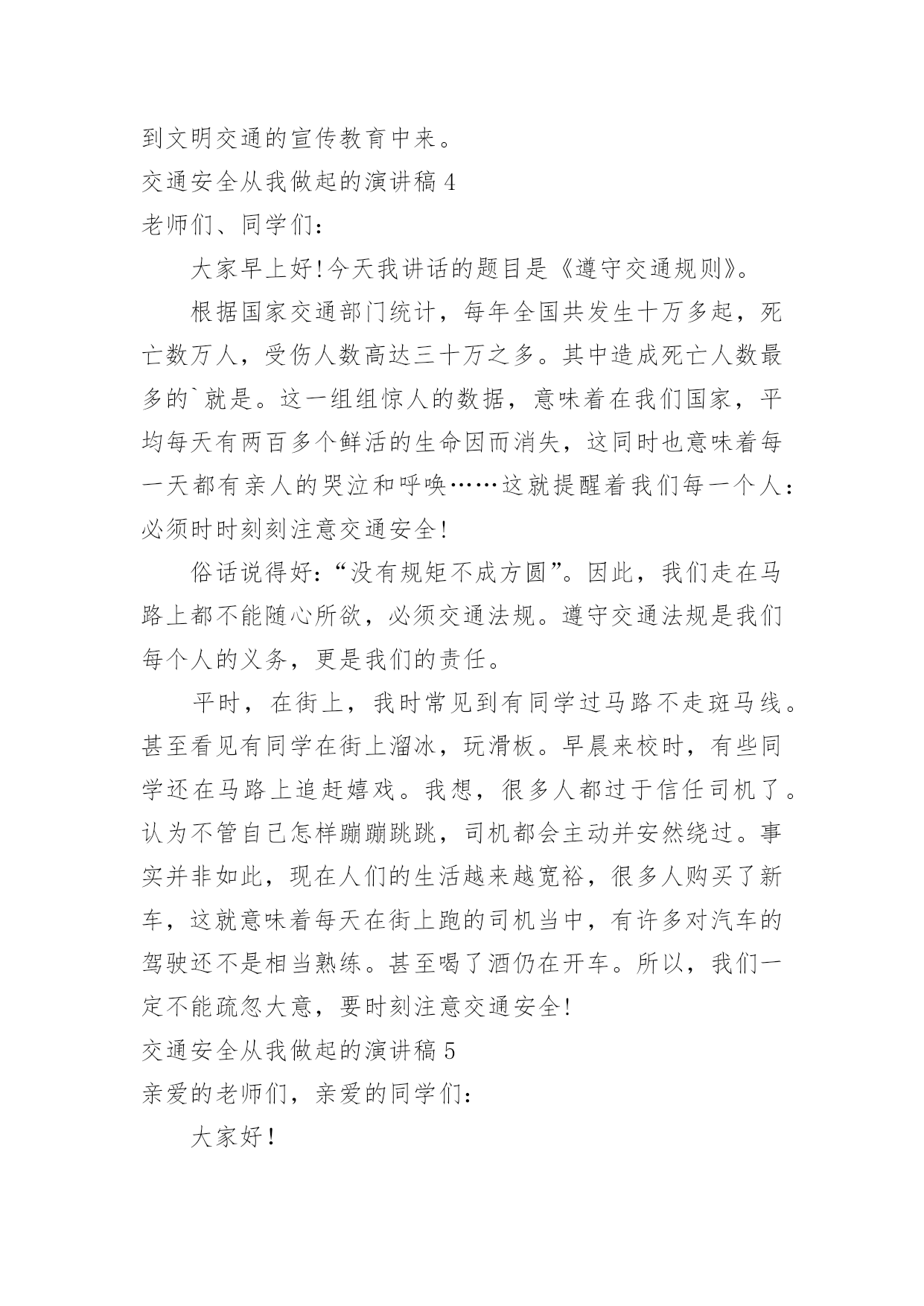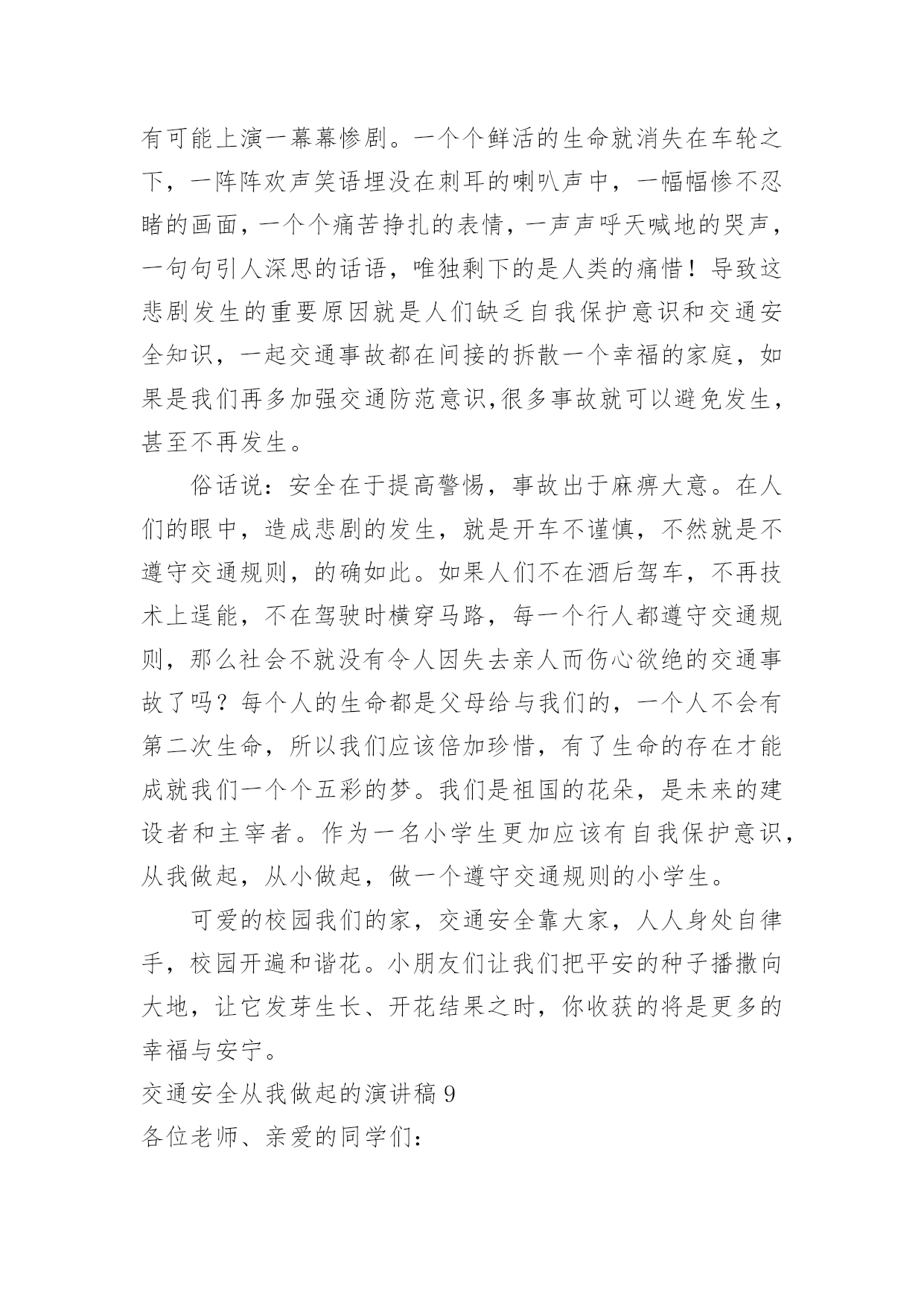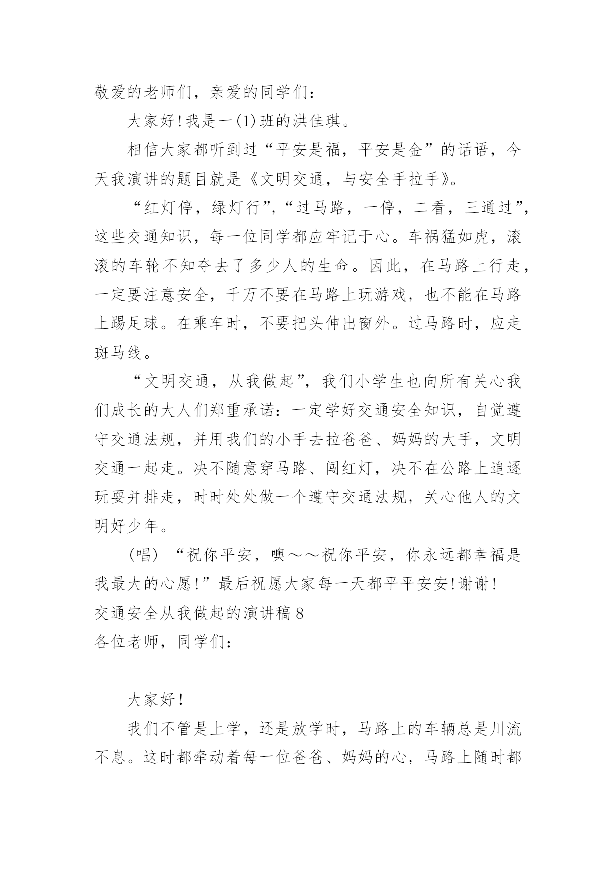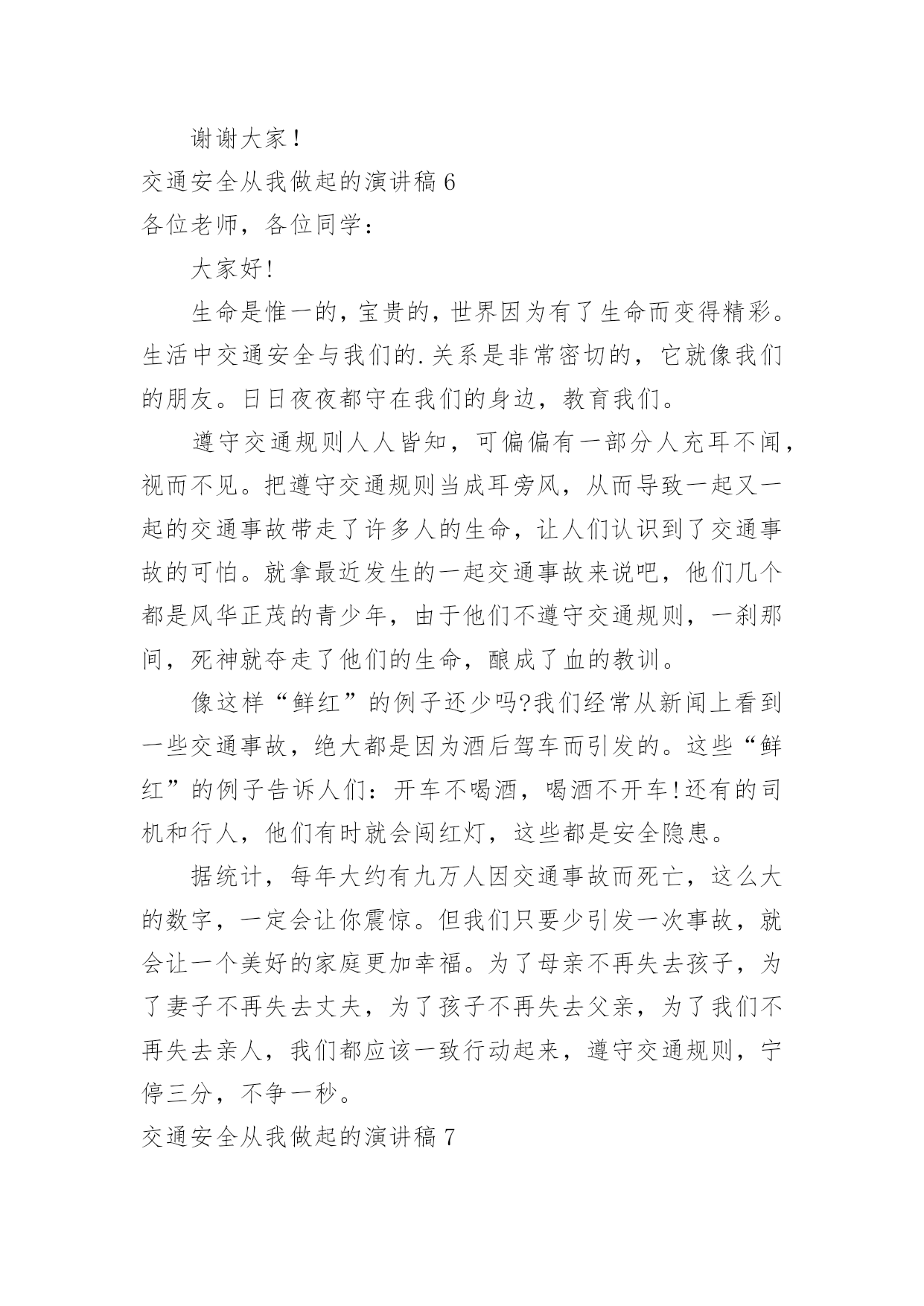 交通安全从我做起的演讲稿交通安全从我做起的演讲稿通过对演讲稿语言的推究可以提高语言的表现力,增强语言的感染力。在现实社会中,越来越多人会去使用演讲稿,相信很多朋友都对写演讲稿感到非常苦恼吧,以下是小编帮大家整理的交通安全从我做起的演讲稿,仅供参考,欢迎大家阅读。交通安全从我做起的演讲稿1尊敬的领导和朋友:大家早上好!我是驾校普通员工。自从我开始工作以来,我目睹了成千上万的驾校学生在驾校的熔炉中接受培训后投身社会主义建设。也目睹了通往乡镇的道路上车流不息,城市街道上车流如织的繁忙景象!但是发达的交通条件不仅给我们带来了便利和快捷,也给我们稳定的社会环境带来了不和谐的音符:在这种繁荣的背后,司机的不文明行为给我们的生活带来了拥堵;它给我们的经济发展带来了障碍;它甚至威胁到我们的生命和安全。所以在这里,我想呼吁:文明——更好的生活需要你!文明?——社会发展需要你!文明——人类生存更需要你!几十年前,我们的司机靠传道、授业、授业,这叫师徒。随着社会的不断进步,驾校应运而生,学生人数众多,覆盖面广,是世界上任何一所学校都无法比拟的。师徒教学时代,老师出钱教学,学徒学习,没有数据,没有规模。如今,我们的教材更加系统,管理更加规范,教学更加科学。但是,社会需要的不仅仅是只会开车的机器人,而是每一个能遵守规章制度、有道德、文明驾驶的司机。播种一个行动,收获一个习惯;培养好习惯,获得文明进步。我们的教练不仅仅是技术教练,更是学生道德文明的导师。汽车是人类文明时代的产物,但是在我们的现实生活中,我们经常可以看到一些不文明的司机:有的,停车倒车;对,超速,闯红灯;有的无法无天,酒后驾车!就在这种不经意的闪现之间,悲剧一次又一次上演。当车轮在生命的边缘奔跑,我们该如何面对?事实告诉我们,无视文明驾驶就是无视生命。我们希望文明之花永远盛开,我们希望生命之树常青。我们希望生命之河会流淌。面对一场不文明、身体冰冷、家庭破碎造成的恶性事故,我们不能接受不文明生活的警告吗?《师说》里有句话:老师,所以传道授业。对于我们的驾校和教练来说,教书就是教驾驶技术,说教就是教道德文明。虽然上面提到的很多交通事故与我们没有直接的因果关系,但是如果在肇事者学车期间,教练能够以讲道为重点科目,学校能够以文明驾驶为重点教学内容,那么不文明驾驶行为就会大大减少,不文明驾驶导致的交通事故也就可以避免。记得小学第一天,妈妈对我说了一句话,虽然我到了工作岗位才真正明白它的意思。她说:“我的孩子,你上学去了,你妈不在身边,就让一切过去吧。”。一句普通的话,包含着母亲对孩子的真爱,包含着作为文明人的原则。作为司机,我们身处如此复杂的交通环境,难道不应该让路吗?你抢路,我停你先走;你超车,我减速,你先走;你不关灯,我关灯,你后;遇到老人就停下来:爷爷阿姨,慢慢走;遇到孩子我就慢吞吞:孩子,小心点……其实文明离我们很近。有时候文明只是一秒钟;有时候文明只有一米之遥;有时候文明是一种提升,有时候文明是一种转折。这些简单的原则和文明的措施可能大家都懂,但真正做到往往并不尽如人意。我们的驾校,我们的教练,能重复这么简单明了的道理的教导和警示吗?可以在我们学生的脑海中留下深刻的印记,那么我们的交通就会更加顺畅,我们的生活就会更加美好,我们的社会就会更加和谐!自古以来,孔子的儒家思想流传千年,陶渊明采菊东篱下的田园生活影响了我们几百代人;为什么我们不能用文明建造一座珠穆朗玛峰,让世界赞叹?为什么不能用文明汇成长江造福后代?为什么不能让我们的驾校成为文明之花绽放的家园?如果说文明是社会进步的象征,那么我们驾校就是文明的窗口,文明的摇篮,文明的长江源头!驾校的同胞们!让我们携起手来,努力做文明教练,培养文明学生,创建文明驾校。让我们的驾校插上文明的翅膀!我的演讲结束了,谢谢!交通安全从我做起的演讲稿2亲爱的老师、同学们:大家好!自古以来,人人遵法,人人守法的信念便烙印在人的心中,无论男女老少,其中都不会存在任何所谓的“代沟”。然而,近些年来,生命的翅膀在车祸中折翼的数不胜数,在生与死的界限中乱闯荡的也不少。俗言道:“开车不喝酒,喝酒不开车,喝酒要驾车,代驾来帮忙。”可如今,这句俗言却被大多数人扭曲成了:开车要喝酒,代驾找来要花钱,宁要钱也不要命。因为自己的吝啬或是贪杯,就让自己的生命掉进了万丈深渊,从此与美丽诱人的世界挥手告别!记得许多交通事故都因酒驾而引起。比如,一次,在高速公路上发生了一起交通事故。司机因在驾车之前喝了很多酒,朋友劝告不如找人代驾,他偏执意要自己驾车回家,一路弯弯曲曲、扭扭妮妮的S行车技,行人纷纷避让。有祸终究躲藏不过,终于在一个拐弯处,来不及反应,与迎面而来的一辆小轿车来了个“亲密接触”——撞了。两位司机都受了重伤,在车祸现场处,一大片血迹在蔓延着,让人看着不由地打着寒战。一次次的