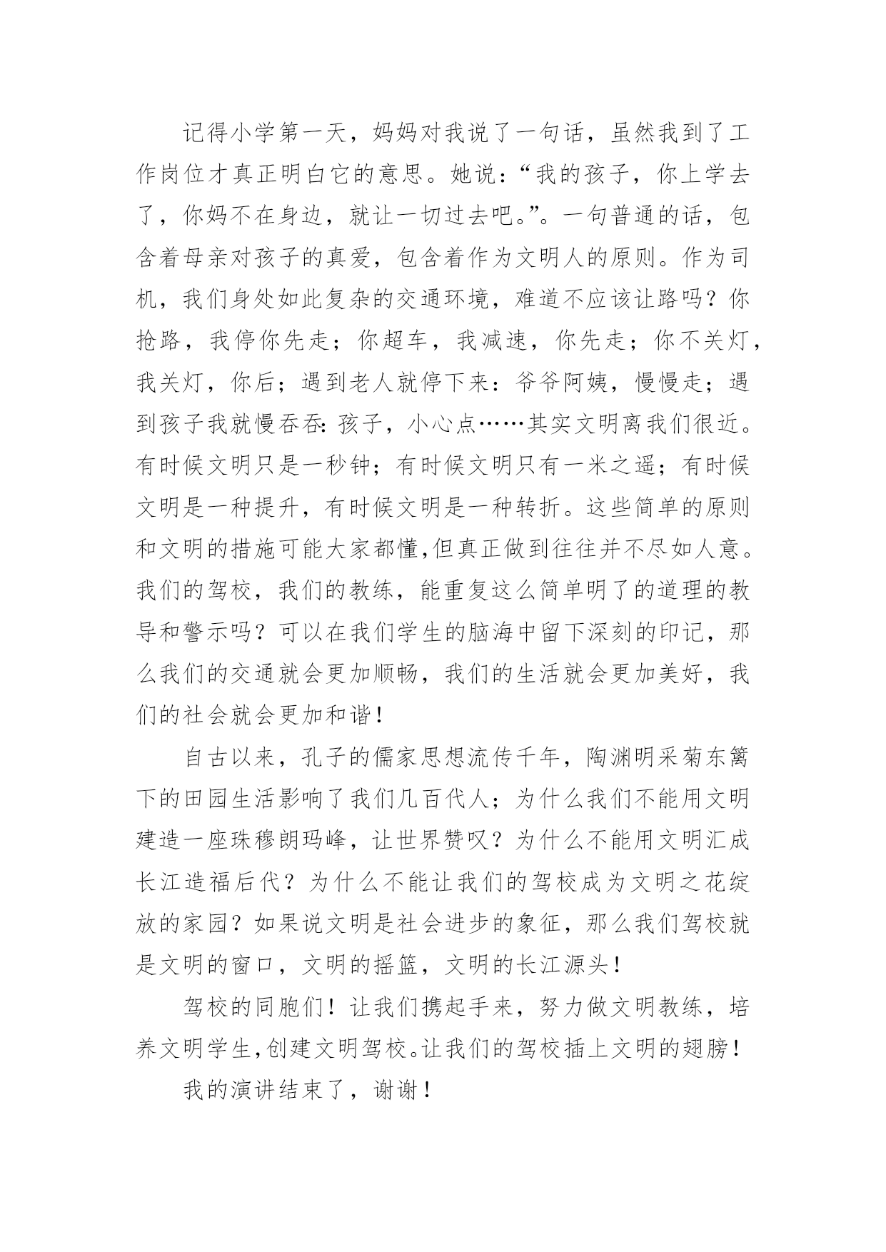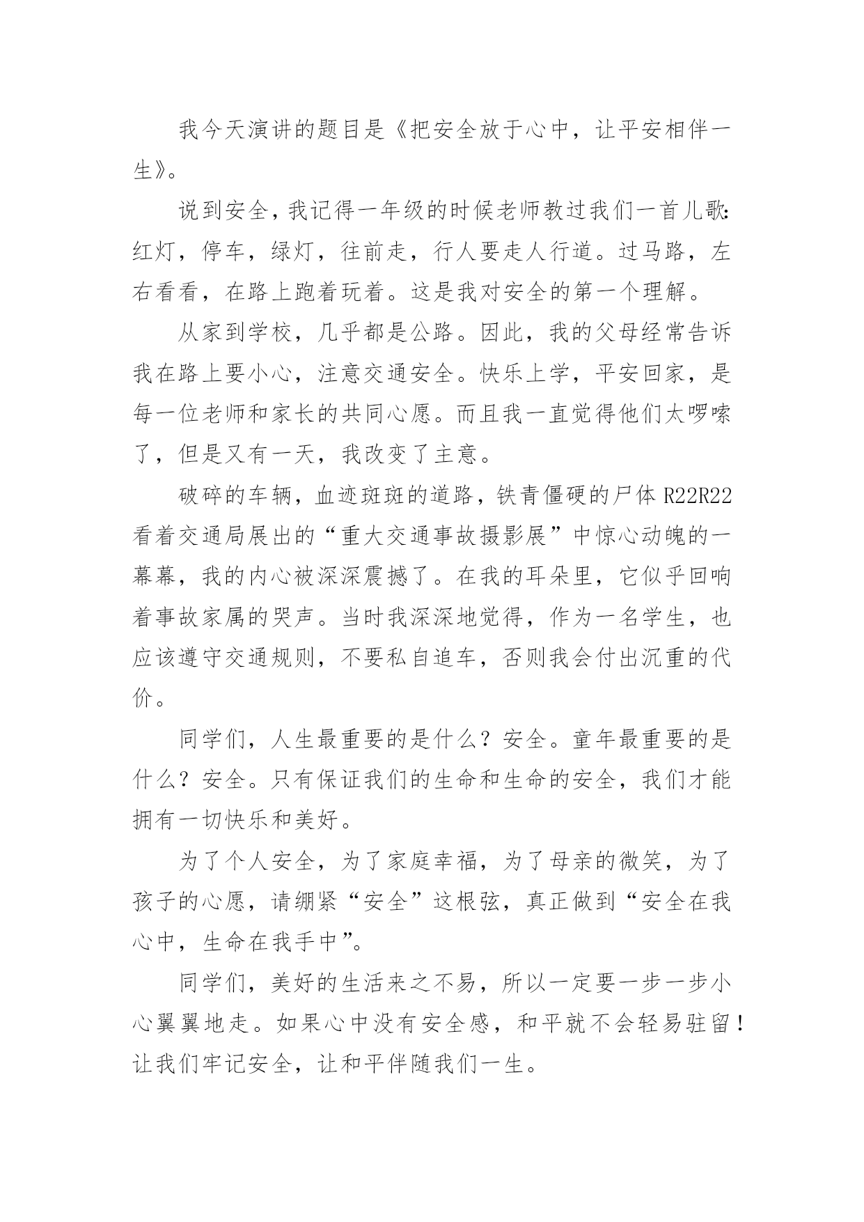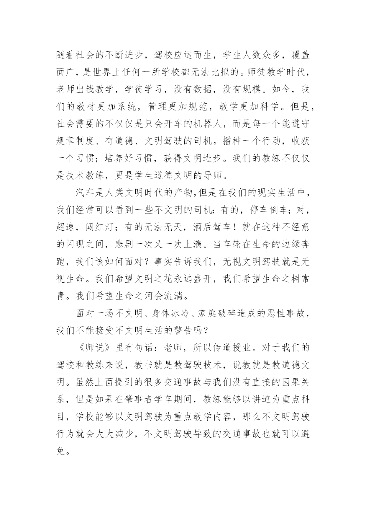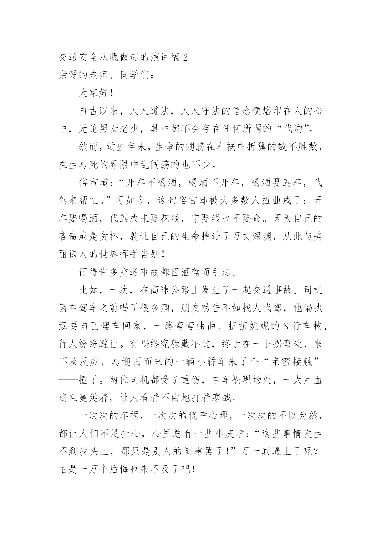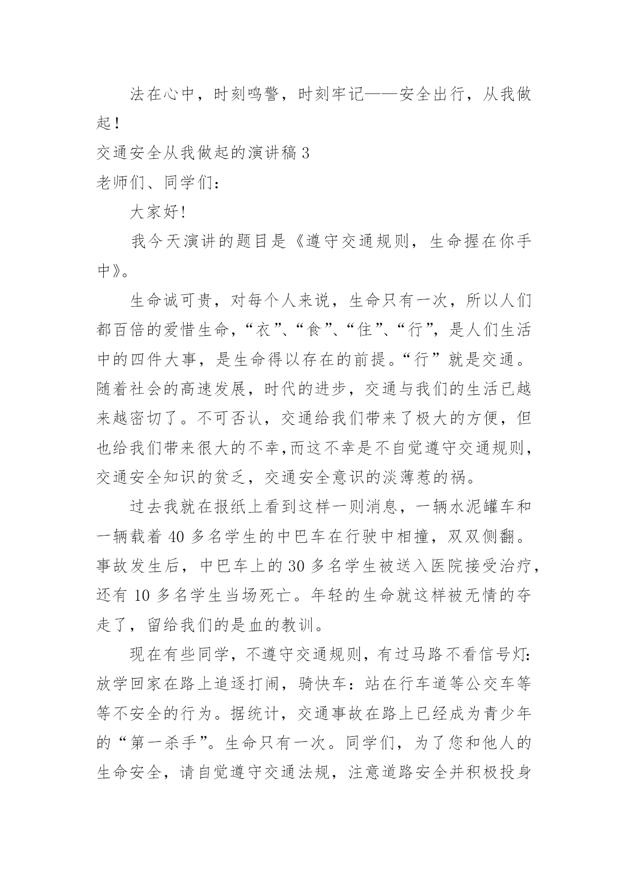 交通安全从我做起的演讲稿交通安全从我做起的演讲稿通过对演讲稿语言的推究可以提高语言的表现力,增强语言的感染力。在现实社会中,越来越多人会去使用演讲稿,相信很多朋友都对写演讲稿感到非常苦恼吧,以下是小编帮大家整理的交通安全从我做起的演讲稿,仅供参考,欢迎大家阅读。交通安全从我做起的演讲稿1尊敬的领导和朋友:大家早上好!我是驾校普通员工。自从我开始工作以来,我目睹了成千上万的驾校学生在驾校的熔炉中接受培训后投身社会主义建设。也目睹了通往乡镇的道路上车流不息,城市街道上车流如织的繁忙景象!但是发达的交通条件不仅给我们带来了便利和快捷,也给我们稳定的社会环境带来了不和谐的音符:在这种繁荣的背后,司机的不文明行为给我们的生活带来了拥堵;它给我们的经济发展带来了障碍;它甚至威胁到我们的生命和安全。所以在这里,我想呼吁:文明——更好的生活需要你!文明?——社会发展需要你!文明——人类生存更需要你!几十年前,我们的司机靠传道、授业、授业,这叫师徒。随着社会的不断进步,驾校应运而生,学生人数众多,覆盖面广,是世界上任何一所学校都无法比拟的。师徒教学时代,老师出钱教学,学徒学习,没有数据,没有规模。如今,我们的教材更加系统,管理更加规范,教学更加科学。但是,社会需要的不仅仅是只会开车的机器人,而是每一个能遵守规章制度、有道德、文明驾驶的司机。播种一个行动,收获一个习惯;培养好习惯,获得文明进步。我们的教练不仅仅是技术教练,更是学生道德文明的导师。汽车是人类文明时代的产物,但是在我们的现实生活中,我们经常可以看到一些不文明的司机:有的,停车倒车;对,超速,闯红灯;有的无法无天,酒后驾车!就在这种不经意的闪现之间,悲剧一次又一次上演。当车轮在生命的边缘奔跑,我们该如何面对?事实告诉我们,无视文明驾驶就是无视生命。我们希望文明之花永远盛开,我们希望生命之树常青。我们希望生命之河会流淌。面对一场不文明、身体冰冷、家庭破碎造成的恶性事故,我们不能接受不文明生活的警告吗?《师说》里有句话:老师,所以传道授业。对于我们的驾校和教练来说,教书就是教驾驶技术,说教就是教道德文明。虽然上面提到的很多交通事故与我们没有直接的因果关系,但是如果在肇事者学车期间,教练能够以讲道为重点科目,学校能够以文明驾驶为重点教学内容,那么不文明驾驶行为就会大大减少,不文明驾驶导致的交通事故也就可以避免。记得小学第一天,妈妈对我说了一句话,虽然我到了工作岗位才真正明白它的意思。她说:“我的孩子,你上学去了,你妈不在身边,就让一切过去吧。”。一句普通的话,包含着母亲对孩子的真爱,包含着作为文明人的原则。作为司机,我们身处如此复杂的交通环境,难道不应该让路吗?你抢路,我停你先走;你超车,我减速,你先走;你不关灯,我关灯,你后;遇到老人就停下来:爷爷阿姨,慢慢走;遇到孩子我就慢吞吞:孩子,小心点……其实文明离我们很近。有时候文明只是一秒钟;有时候文明只有一米之遥;有时候文明是一种提升,有时候文明是一种转折。这些简单的原则和文明的措施可能大家都懂,但真正做到往往并不尽如人意。我们的驾校,我们的教练,能重复这么简单明了的道理的教导和警示吗?可以在我们学生的脑海中留下深刻的印记,那么我们的交通就会更加顺畅,我们的生活就会更加美好,我们的社会就会更加和谐!自古以来,孔子的儒家思想流传千年,陶渊明采菊东篱下的田园生活影响了我们几百代人;为什么我们不能用文明建造一座珠穆朗玛峰,让世界赞叹?为什么不能用文明汇成长江造福后代?为什么不能让我们的驾校成为文明之花绽放的家园?如果说文明是社会进步的象征,那么我们驾校就是文明的窗口,文明的摇篮,文明的长江源头!驾校的同胞们!让我们携起手来,努力做文明教练,培养文明学生,创建文明驾校。让我们的驾校插上文明的翅膀!我的演讲结束了,谢谢!交通安全从我做起的演讲稿2亲爱的老师、同学们:大家好!自古以来,人人遵法,人人守法的信念便烙印在人的心中,无论男女老少,其中都不会存在任何所谓的“代沟”。然而,近些年来,生命的翅膀在车祸中折翼的数不胜数,在生与死的界限中乱闯荡的也不少。俗言道:“开车不喝酒,喝酒不开车,喝酒要驾车,代驾来帮忙。”可如今,这句俗言却被大多数人扭曲成了:开车要喝酒,代驾找来要花钱,宁要钱也不要命。因为自己的吝啬或是贪杯,就让自己的生命掉进了万丈深渊,从此与美丽诱人的世界挥手告别!记得许多交通事故都因酒驾而引起。比如,一次,在高速公路上发生了一起交通事故。司机因在驾车之前喝了很多酒,朋友劝告不如找人代驾,他偏执意要自己驾车回家,一路弯弯曲曲、扭扭妮妮的S行车技,行人纷纷避让。有祸终究躲藏不过,终于在一个拐弯处,来不及反应,与迎面而来的一辆小轿车来了个“亲密接触”——撞了。两位司机都受了重伤,在车祸现场处,一大片血迹在蔓延着,让人看着不由地打着寒战。一次次的
