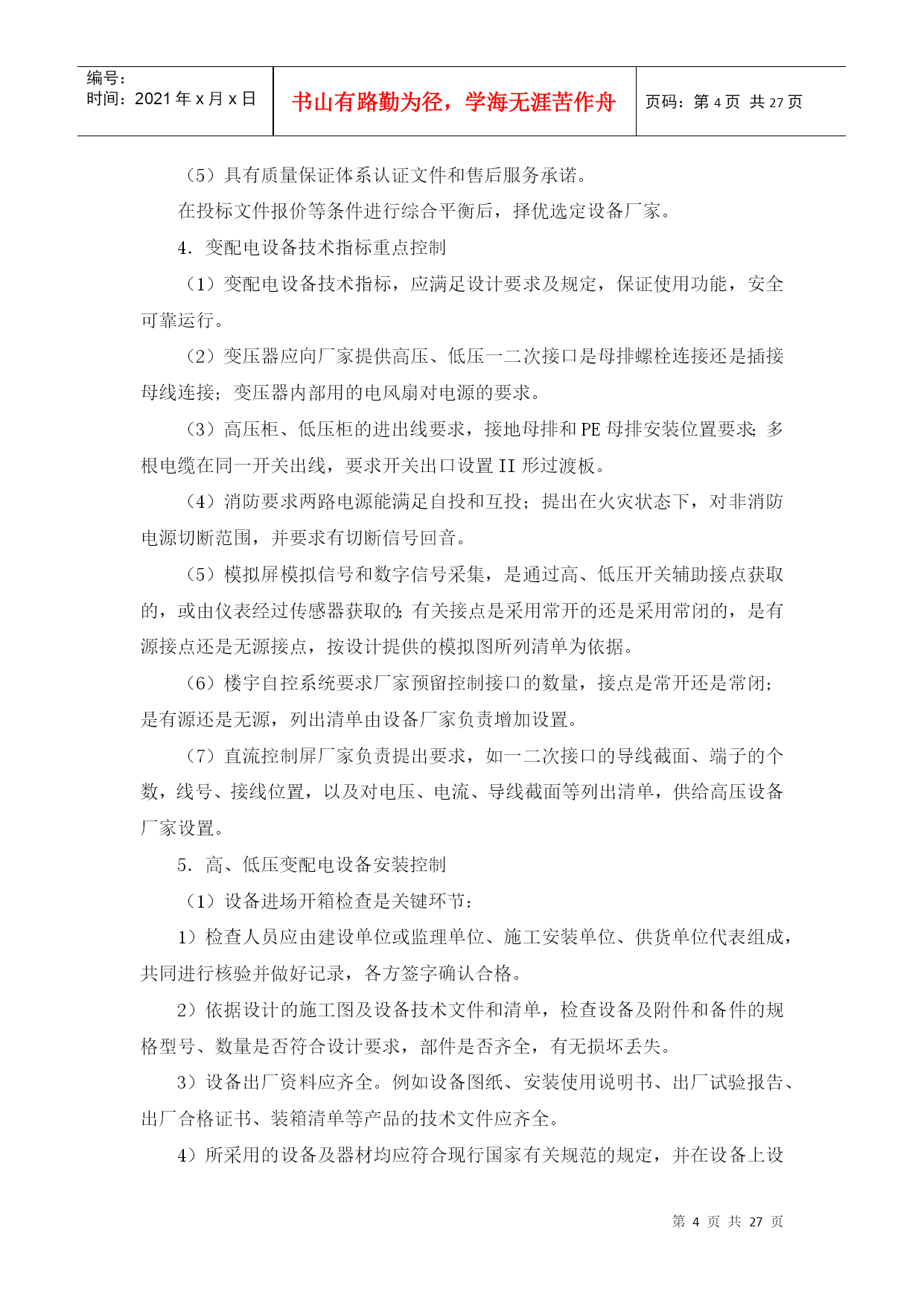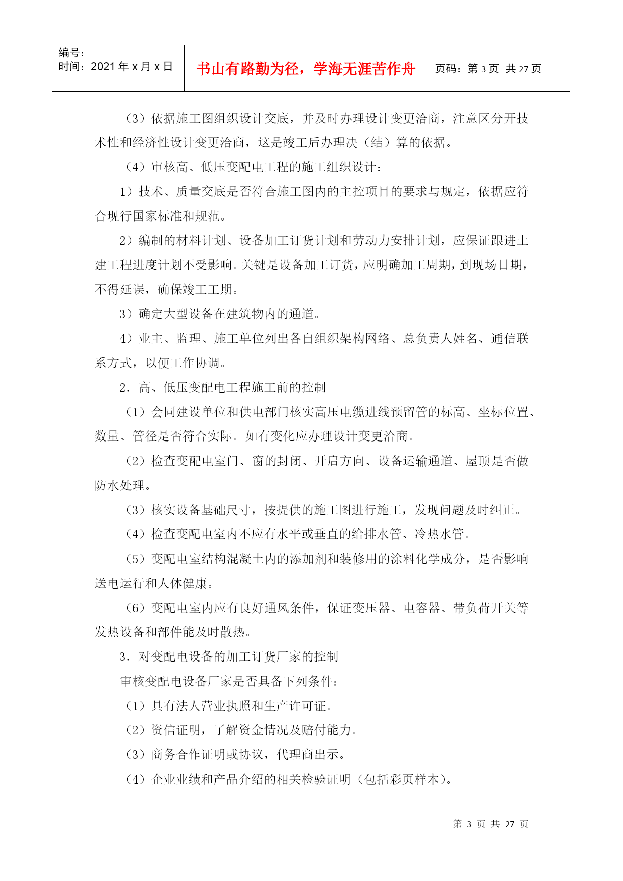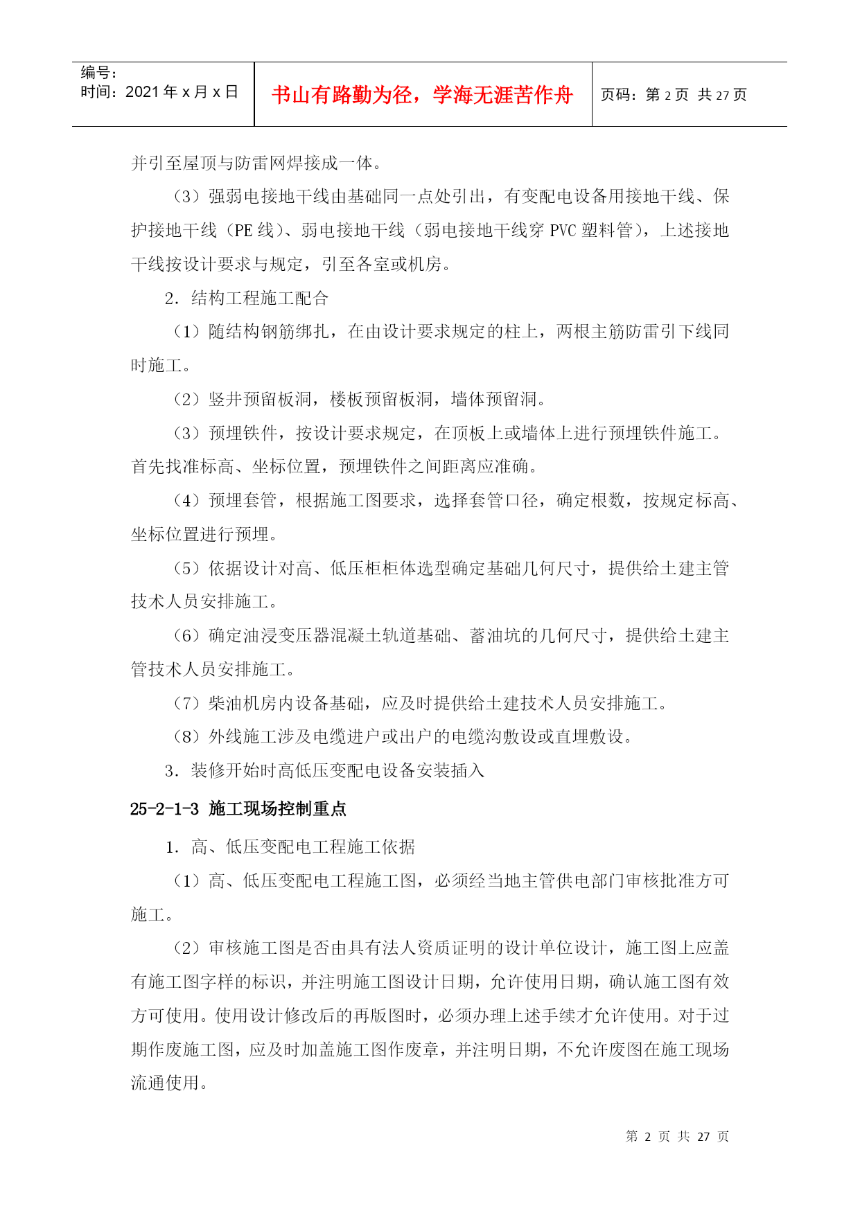 编号:时间:2021年x月x日书山有路勤为径,学海无涯苦作舟页码:第PAGE27页共NUMPAGES27页第PAGE\*MERGEFORMAT27页共NUMPAGES\*MERGEFORMAT27页机电设备工程施工现场配合与控制25-2-1高、低压变配电工程施工现场配合与控制25-2-1-1施工内容概述(1)空外高、低压电缆进线敷设有三种方式,架空、直埋、电缆沟。在市区内电缆架空敷设禁止使用,后两种使用较多,电缆沟敷设利于维护检修。(2)高、低压变配电室的组成由高压分界小室、高压配电室、变压器室,低压配电室、电容器室,高、低压变配电模拟控制室组成。(3)高、低压变配电柜内,电缆进出线有三种方式:1)电缆由桥架或插接母线上进上出。2)电缆由地沟下进下出。3)电缆由柜体上方、上人吊顶走天沟敷设上进上出。(4)采用柴油发电机做备用电源,需设置柴油发电机房。柴油发电机在城市市区使用,环保部门对噪声有特殊要求与规定。(5)采用UPS做备用电源,如容量较大时还应设UPS备用电源室,此备用电源无噪声,符合绿色环保要求,在城市市区建设中采用逐渐增多。(6)高、低压设备的防雷接地。(7)高、低压设备安装,需确定设备基础的几何尺寸,由设计单位出大样图。(8)高、低变配电设备安装调试。由上述高低压变配电工程施工内容可知,配合专业工种有土建、通风空调、消防、给排水、弱电工程等多专业工种施工,协调配合是关键。25-2-1-2施工现场配合要点1.基础工程施工配合(1)依据设计要求与规定,利用建筑物基础做接地装置,或利用建筑物桩基与结构基础相连做接地装置,并由基础主筋焊接成接地网。(2)防雷接地引下线由基础钢筋与柱钢筋相连,焊接出两根防雷引下线,并引至屋顶与防雷网焊接成一体。(3)强弱电接地干线由基础同一点处引出,有变配电设备用接地干线、保护接地干线(PE线)、弱电接地干线(弱电接地干线穿PVC塑料管),上述接地干线按设计要求与规定,引至各室或机房。2.结构工程施工配合(1)随结构钢筋绑扎,在由设计要求规定的柱上,两根主筋防雷引下线同时施工。(2)竖井预留板洞,楼板预留板洞,墙体预留洞。(3)预埋铁件,按设计要求规定,在顶板上或墙体上进行预埋铁件施工。首先找准标高、坐标位置,预埋铁件之间距离应准确。(4)预埋套管,根据施工图要求,选择套管口径,确定根数,按规定标高、坐标位置进行预埋。(5)依据设计对高、低压柜柜体选型确定基础几何尺寸,提供给土建主管技术人员安排施工。(6)确定油浸变压器混凝土轨道基础、蓄油坑的几何尺寸,提供给土建主管技术人员安排施工。(7)柴油机房内设备基础,应及时提供给土建技术人员安排施工。(8)外线施工涉及电缆进户或出户的电缆沟敷设或直埋敷设。3.装修开始时高低压变配电设备安装插入25-2-1-3施工现场控制重点1.高、低压变配电工程施工依据(1)高、低压变配电工程施工图,必须经当地主管供电部门审核批准方可施工。(2)审核施工图是否由具有法人资质证明的设计单位设计,施工图上应盖有施工图字样的标识,并注明施工图设计日期,允许使用日期,确认施工图有效方可使用。使用设计修改后的再版图时,必须办理上述手续才允许使用。对于过期作废施工图,应及时加盖施工图作废章,并注明日期,不允许废图在施工现场流通使用。(3)依据施工图组织设计交底,并及时办理设计变更洽商,注意区分开技术性和经济性设计变更洽商,这是竣工后办理决(结)算的依据。(4)审核高、低压变配电工程的施工组织设计:1)技术、质量交底是否符合施工图内的主控项目的要求与规定,依据应符合现行国家标准和规范。2)编制的材料计划、设备加工订货计划和劳动力安排计划,应保证跟进土建工程进度计划不受影响。关键是设备加工订货,应明确加工周期,到现场日期,不得延误,确保竣工工期。3)确定大型设备在建筑物内的通道。4)业主、监理、施工单位列出各自组织架构网络、总负责人姓名、通信联系方式,以便工作协调。2.高、低压变配电工程施工前的控制(1)会同建设单位和供电部门核实高压电缆进线预留管的标高、坐标位置、数量、管径是否符合实际。如有变化应办理设计变更洽商。(2)检查变配电室门、窗的封闭、开启方向、设备运输通道、屋顶是否做防水处理。(3)核实设备基础尺寸,按提供的施工图进行施工,发现问题及时纠正。(4)检查变配电室内不应有水平或垂直的给排水管、冷热水管。(5)变配电室结构混凝土内的添加剂和装修用的涂料化学成分,是否影响送电运行和人体健康。(6)变配电室内应有良好通风条件,保证变压器、电容器、带负荷开关等发热设备和部件能及时散热。3.对变配电设备的加工订货厂家的控制审核变配电设备厂家是否具备下列