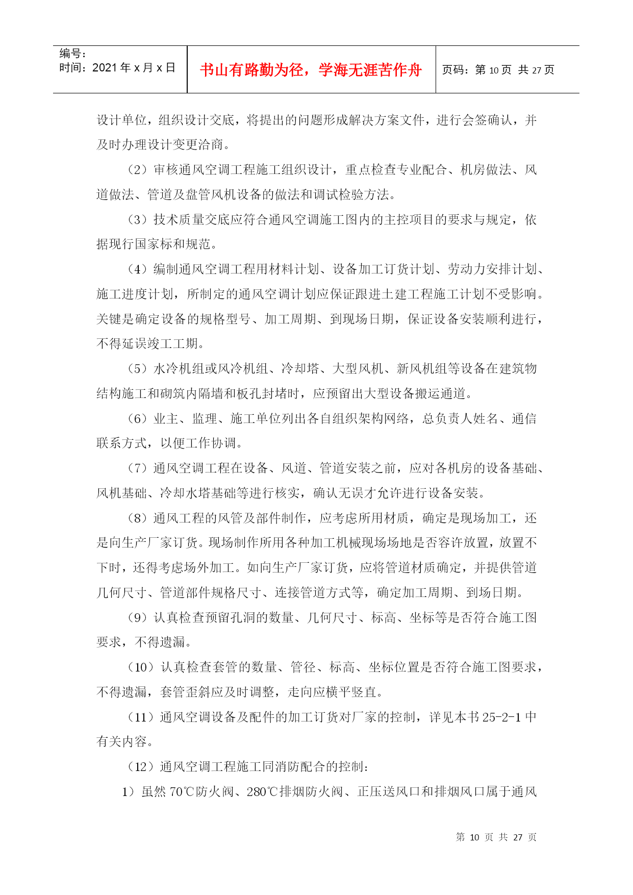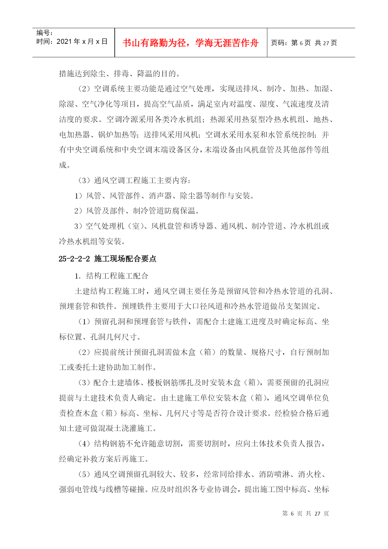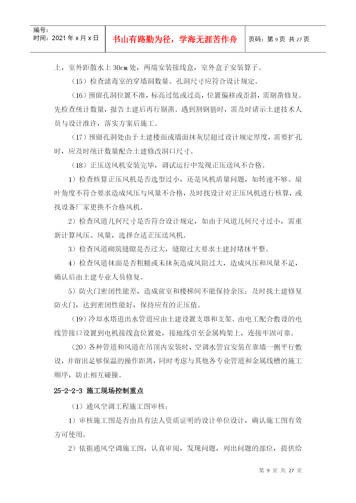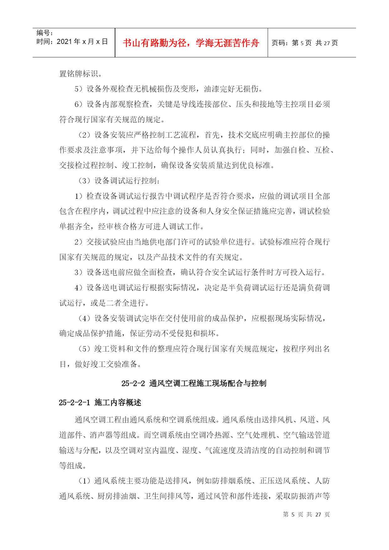 编号:时间:2021年x月x日书山有路勤为径,学海无涯苦作舟页码:第PAGE27页共NUMPAGES27页第PAGE\*MERGEFORMAT27页共NUMPAGES\*MERGEFORMAT27页机电设备工程施工现场配合与控制25-2-1高、低压变配电工程施工现场配合与控制25-2-1-1施工内容概述(1)空外高、低压电缆进线敷设有三种方式,架空、直埋、电缆沟。在市区内电缆架空敷设禁止使用,后两种使用较多,电缆沟敷设利于维护检修。(2)高、低压变配电室的组成由高压分界小室、高压配电室、变压器室,低压配电室、电容器室,高、低压变配电模拟控制室组成。(3)高、低压变配电柜内,电缆进出线有三种方式:1)电缆由桥架或插接母线上进上出。2)电缆由地沟下进下出。3)电缆由柜体上方、上人吊顶走天沟敷设上进上出。(4)采用柴油发电机做备用电源,需设置柴油发电机房。柴油发电机在城市市区使用,环保部门对噪声有特殊要求与规定。(5)采用UPS做备用电源,如容量较大时还应设UPS备用电源室,此备用电源无噪声,符合绿色环保要求,在城市市区建设中采用逐渐增多。(6)高、低压设备的防雷接地。(7)高、低压设备安装,需确定设备基础的几何尺寸,由设计单位出大样图。(8)高、低变配电设备安装调试。由上述高低压变配电工程施工内容可知,配合专业工种有土建、通风空调、消防、给排水、弱电工程等多专业工种施工,协调配合是关键。25-2-1-2施工现场配合要点1.基础工程施工配合(1)依据设计要求与规定,利用建筑物基础做接地装置,或利用建筑物桩基与结构基础相连做接地装置,并由基础主筋焊接成接地网。(2)防雷接地引下线由基础钢筋与柱钢筋相连,焊接出两根防雷引下线,并引至屋顶与防雷网焊接成一体。(3)强弱电接地干线由基础同一点处引出,有变配电设备用接地干线、保护接地干线(PE线)、弱电接地干线(弱电接地干线穿PVC塑料管),上述接地干线按设计要求与规定,引至各室或机房。2.结构工程施工配合(1)随结构钢筋绑扎,在由设计要求规定的柱上,两根主筋防雷引下线同时施工。(2)竖井预留板洞,楼板预留板洞,墙体预留洞。(3)预埋铁件,按设计要求规定,在顶板上或墙体上进行预埋铁件施工。首先找准标高、坐标位置,预埋铁件之间距离应准确。(4)预埋套管,根据施工图要求,选择套管口径,确定根数,按规定标高、坐标位置进行预埋。(5)依据设计对高、低压柜柜体选型确定基础几何尺寸,提供给土建主管技术人员安排施工。(6)确定油浸变压器混凝土轨道基础、蓄油坑的几何尺寸,提供给土建主管技术人员安排施工。(7)柴油机房内设备基础,应及时提供给土建技术人员安排施工。(8)外线施工涉及电缆进户或出户的电缆沟敷设或直埋敷设。3.装修开始时高低压变配电设备安装插入25-2-1-3施工现场控制重点1.高、低压变配电工程施工依据(1)高、低压变配电工程施工图,必须经当地主管供电部门审核批准方可施工。(2)审核施工图是否由具有法人资质证明的设计单位设计,施工图上应盖有施工图字样的标识,并注明施工图设计日期,允许使用日期,确认施工图有效方可使用。使用设计修改后的再版图时,必须办理上述手续才允许使用。对于过期作废施工图,应及时加盖施工图作废章,并注明日期,不允许废图在施工现场流通使用。(3)依据施工图组织设计交底,并及时办理设计变更洽商,注意区分开技术性和经济性设计变更洽商,这是竣工后办理决(结)算的依据。(4)审核高、低压变配电工程的施工组织设计:1)技术、质量交底是否符合施工图内的主控项目的要求与规定,依据应符合现行国家标准和规范。2)编制的材料计划、设备加工订货计划和劳动力安排计划,应保证跟进土建工程进度计划不受影响。关键是设备加工订货,应明确加工周期,到现场日期,不得延误,确保竣工工期。3)确定大型设备在建筑物内的通道。4)业主、监理、施工单位列出各自组织架构网络、总负责人姓名、通信联系方式,以便工作协调。2.高、低压变配电工程施工前的控制(1)会同建设单位和供电部门核实高压电缆进线预留管的标高、坐标位置、数量、管径是否符合实际。如有变化应办理设计变更洽商。(2)检查变配电室门、窗的封闭、开启方向、设备运输通道、屋顶是否做防水处理。(3)核实设备基础尺寸,按提供的施工图进行施工,发现问题及时纠正。(4)检查变配电室内不应有水平或垂直的给排水管、冷热水管。(5)变配电室结构混凝土内的添加剂和装修用的涂料化学成分,是否影响送电运行和人体健康。(6)变配电室内应有良好通风条件,保证变压器、电容器、带负荷开关等发热设备和部件能及时散热。3.对变配电设备的加工订货厂家的控制审核变配电设备厂家是否具备下列