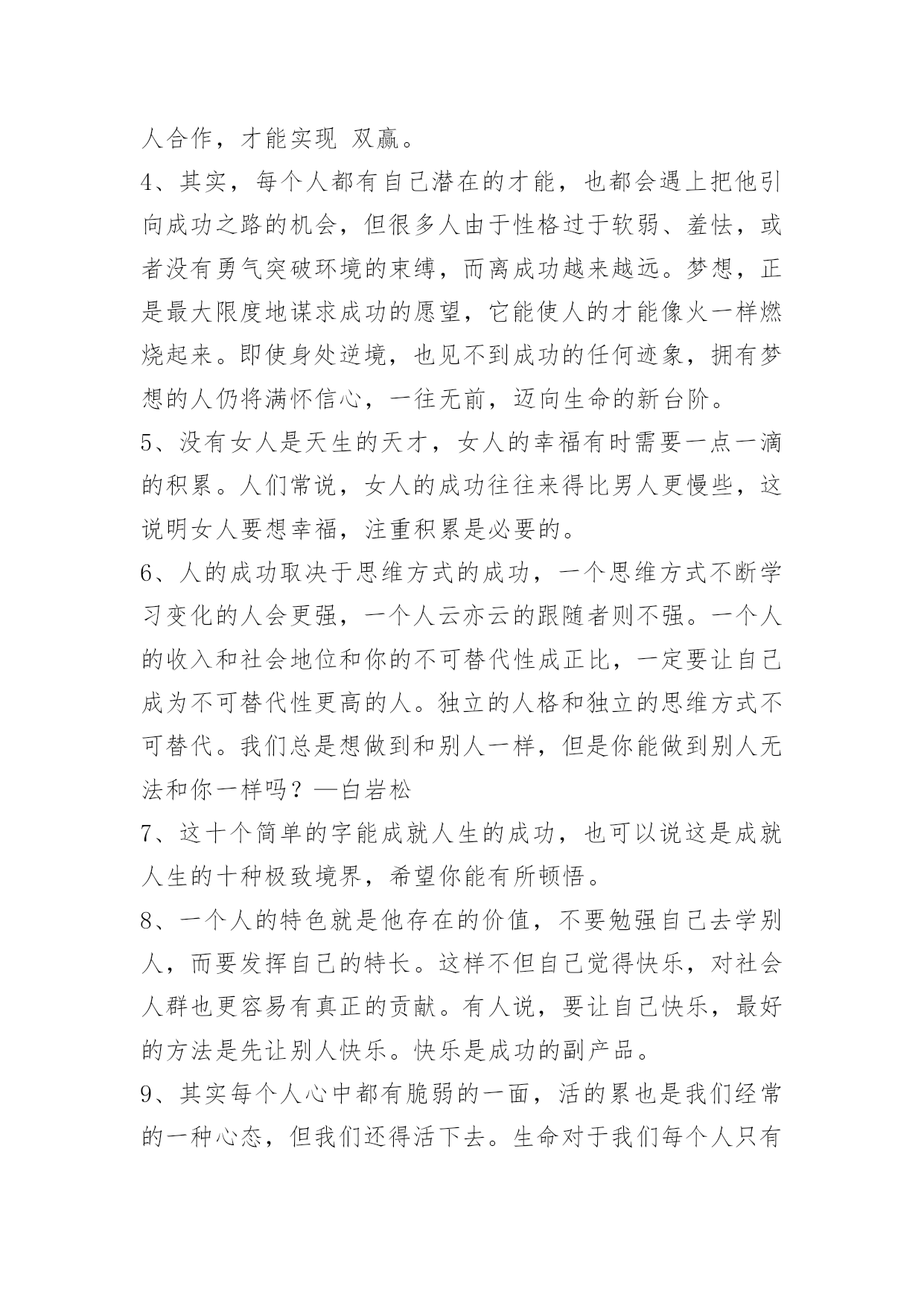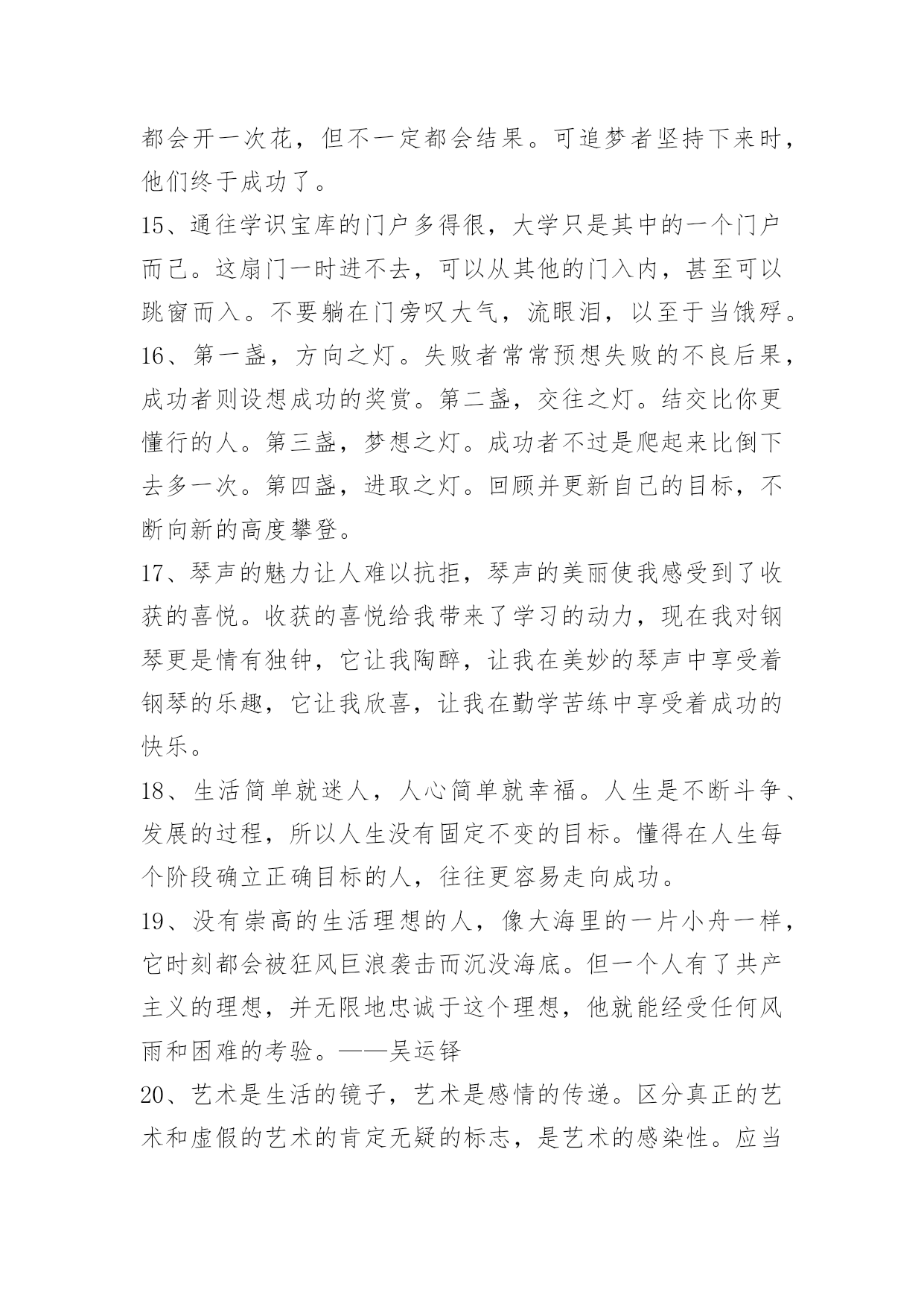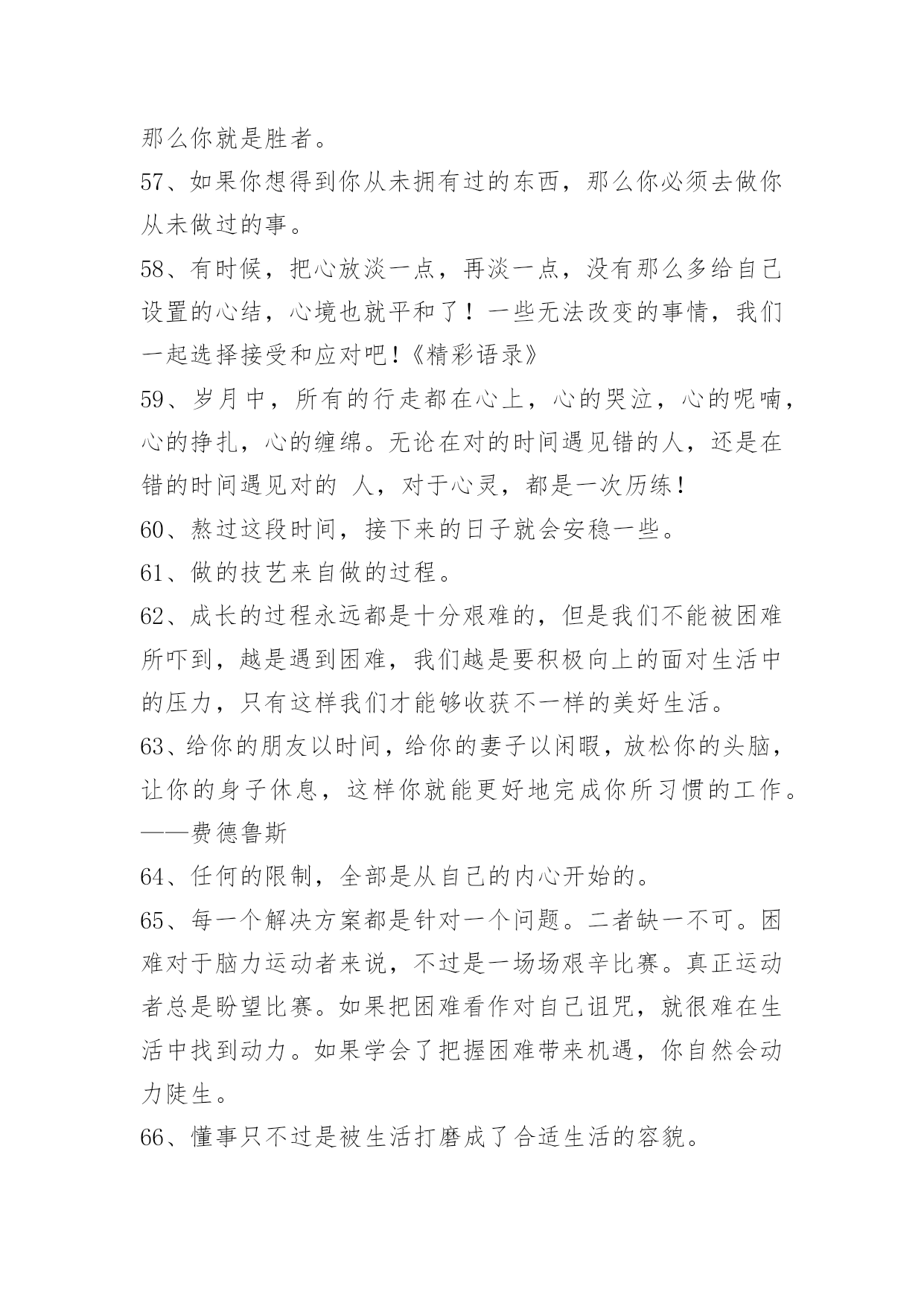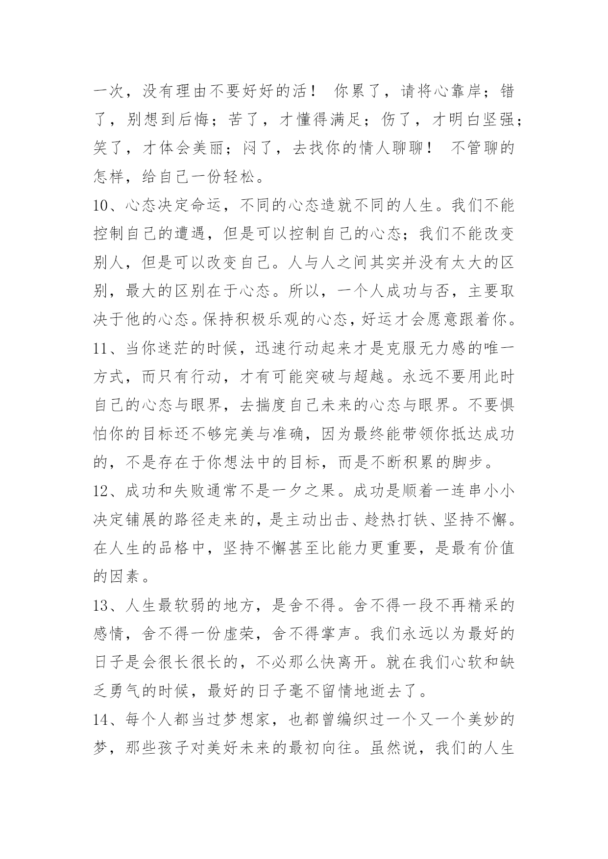 工作励志语录79条【实用】2022年工作励志语录79条母爱如水,用她的无休无止培养了我的耐性,使我像她一样,用有自己的目标,像妈妈一样,对事事都要求的成功,使我对任何人任何事都有极高的耐性。以下是小编为大家收集的工作励志语录79条,大家快来看看吧。1、人生在世间,风雨辗转,烟一程,雨一程。人生不是一种简单的存活,而是一种义务,还有承担,路过许多的陌生,相逢许多的聚散,送远那些陌生和熟悉,这人生的滋味,就是需要几分勇气和胆识,去实践自己的信念,生活让我们懂得,生活不只是叹息,活着一场人生,给心找一个宽阔平坦的归宿。2、人生没有捷径,成功没有侥幸。所谓的捷径,其实是最远的路;偷来的取巧,其实是致命的拙。无痛不快,无苦何甜,活着,本就是一种修行。要想到达最高处,就必须从最低处起飞;要想获得最大的成功,就必须做最苦的付出。3、很多二十几岁的年轻人只注重做大事,而不善于从细微之处、平凡之地观察赚钱的商机。要知道我们还没有太多的资金,也没有更多的知识,唯有用心可以让我们与众不同,让我们获得更多的财富。记住这句话吧,"遍地出黄金,只怕不用心。"互助一年石成玉,合作二年土变金每个人身上都有优点,也都有缺点。每个企业也都有优势和劣势,所以很多企业选择合作互助。而我们每个人也要学会与他人合作,才能实现双赢。4、其实,每个人都有自己潜在的才能,也都会遇上把他引向成功之路的机会,但很多人由于性格过于软弱、羞怯,或者没有勇气突破环境的束缚,而离成功越来越远。梦想,正是最大限度地谋求成功的愿望,它能使人的才能像火一样燃烧起来。即使身处逆境,也见不到成功的任何迹象,拥有梦想的人仍将满怀信心,一往无前,迈向生命的新台阶。5、没有女人是天生的天才,女人的幸福有时需要一点一滴的积累。人们常说,女人的成功往往来得比男人更慢些,这说明女人要想幸福,注重积累是必要的。6、人的成功取决于思维方式的成功,一个思维方式不断学习变化的人会更强,一个人云亦云的跟随者则不强。一个人的收入和社会地位和你的不可替代性成正比,一定要让自己成为不可替代性更高的人。独立的人格和独立的思维方式不可替代。我们总是想做到和别人一样,但是你能做到别人无法和你一样吗?—白岩松7、这十个简单的字能成就人生的成功,也可以说这是成就人生的十种极致境界,希望你能有所顿悟。8、一个人的特色就是他存在的价值,不要勉强自己去学别人,而要发挥自己的特长。这样不但自己觉得快乐,对社会人群也更容易有真正的贡献。有人说,要让自己快乐,最好的方法是先让别人快乐。快乐是成功的副产品。9、其实每个人心中都有脆弱的一面,活的累也是我们经常的一种心态,但我们还得活下去。生命对于我们每个人只有一次,没有理由不要好好的活!你累了,请将心靠岸;错了,别想到后悔;苦了,才懂得满足;伤了,才明白坚强;笑了,才体会美丽;闷了,去找你的情人聊聊!不管聊的怎样,给自己一份轻松。10、心态决定命运,不同的心态造就不同的人生。我们不能控制自己的遭遇,但是可以控制自己的心态;我们不能改变别人,但是可以改变自己。人与人之间其实并没有太大的区别,最大的区别在于心态。所以,一个人成功与否,主要取决于他的心态。保持积极乐观的心态,好运才会愿意跟着你。11、当你迷茫的时候,迅速行动起来才是克服无力感的唯一方式,而只有行动,才有可能突破与超越。永远不要用此时自己的心态与眼界,去揣度自己未来的心态与眼界。不要惧怕你的目标还不够完美与准确,因为最终能带领你抵达成功的,不是存在于你想法中的目标,而是不断积累的脚步。12、成功和失败通常不是一夕之果。成功是顺着一连串小小决定铺展的路径走来的,是主动出击、趁热打铁、坚持不懈。在人生的品格中,坚持不懈甚至比能力更重要,是最有价值的因素。13、人生最软弱的地方,是舍不得。舍不得一段不再精采的感情,舍不得一份虚荣,舍不得掌声。我们永远以为最好的日子是会很长很长的,不必那么快离开。就在我们心软和缺乏勇气的时候,最好的日子毫不留情地逝去了。14、每个人都当过梦想家,也都曾编织过一个又一个美妙的梦,那些孩子对美好未来的最初向往。虽然说,我们的人生都会开一次花,但不一定都会结果。可追梦者坚持下来时,他们终于成功了。15、通往学识宝库的门户多得很,大学只是其中的一个门户而己。这扇门一时进不去,可以从其他的门入内,甚至可以跳窗而入。不要躺在门旁叹大气,流眼泪,以至于当饿殍。16、第一盏,方向之灯。失败者常常预想失败的不良后果,成功者则设想成功的奖赏。第二盏,交往之灯。结交比你更懂行的人。第三盏,梦想之灯。成功者不过是爬起来比倒下去多一次。第四盏,进取之灯。回顾并更新自己的目标,不断向新的高度攀登。17、琴声的魅力让人难以抗拒,琴声的美丽使我感受到了收获的喜悦。收获的喜悦给我带来了学习的动力,现在我对钢琴更是情有独钟,它让我陶醉,让我在美妙