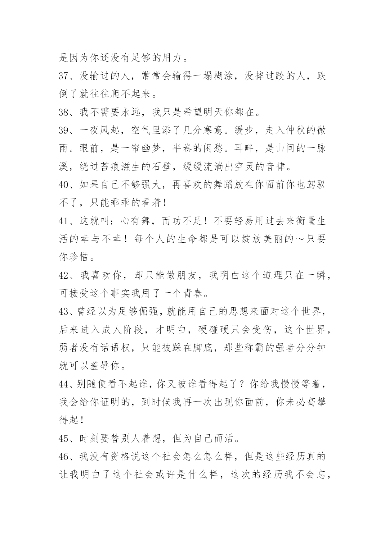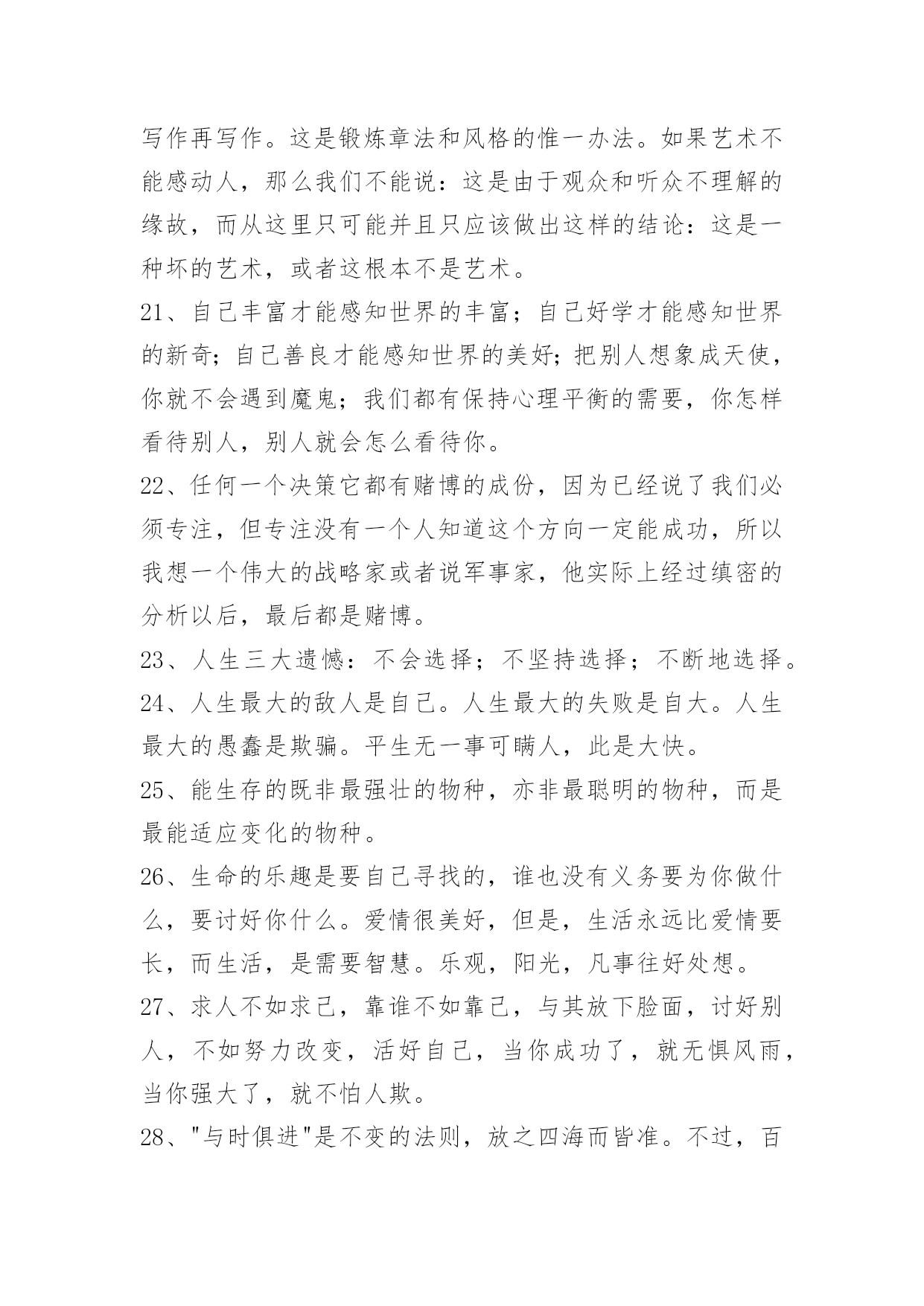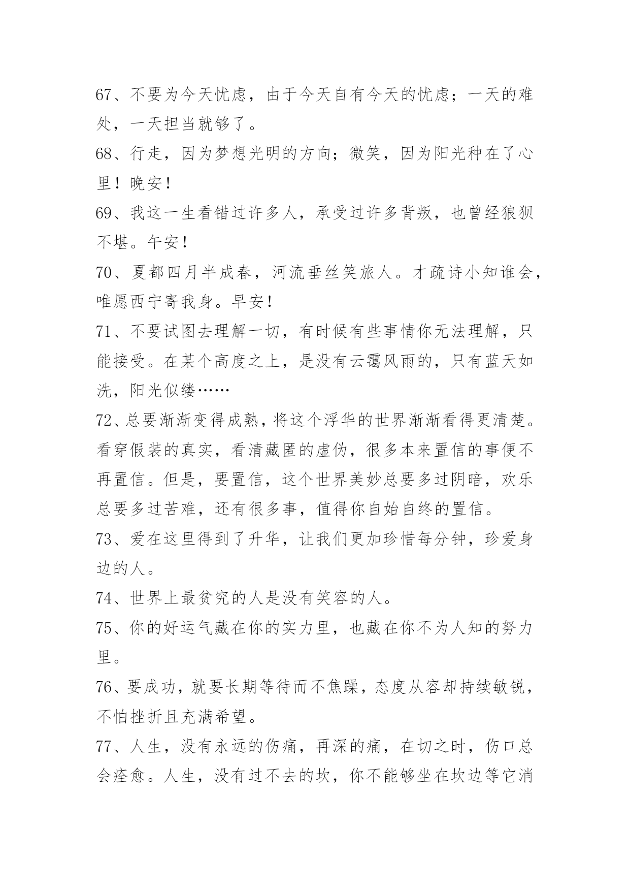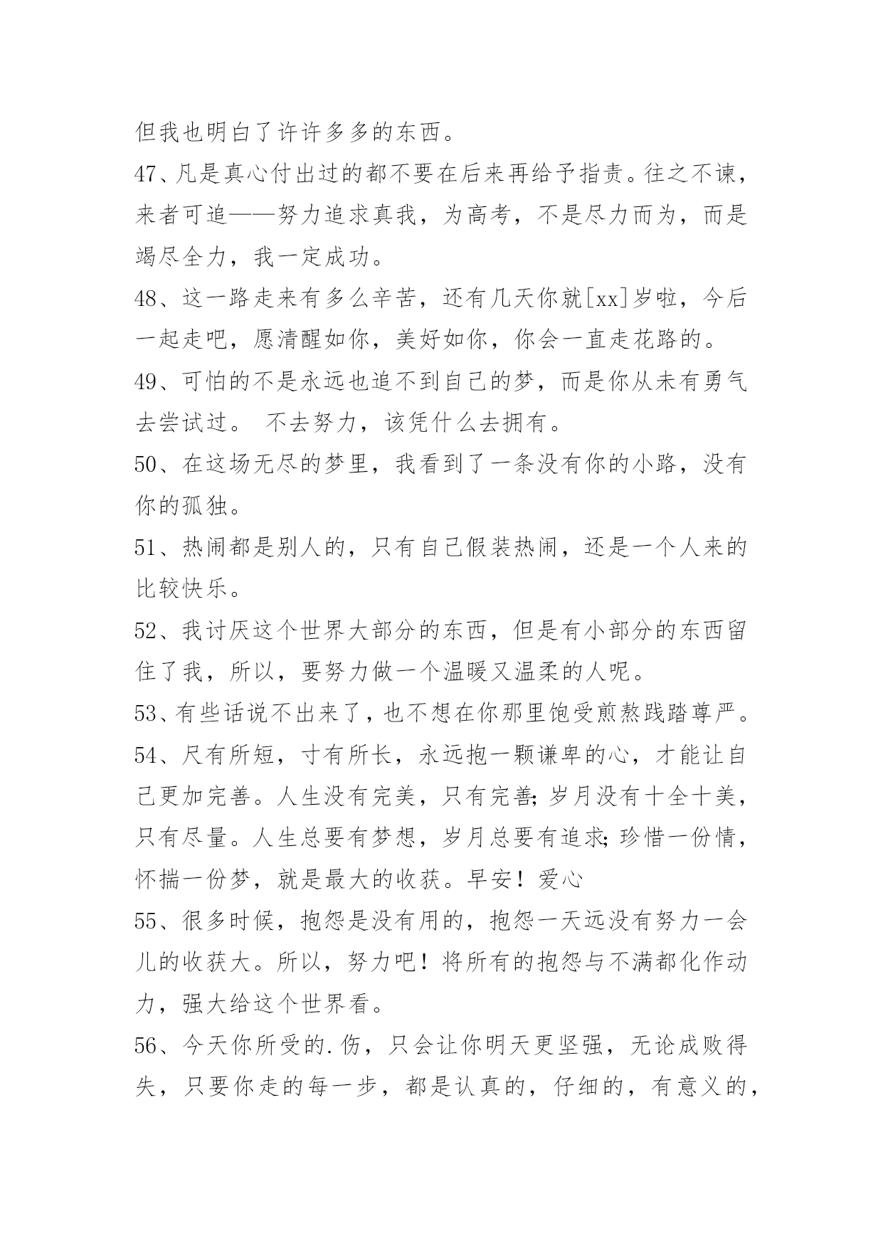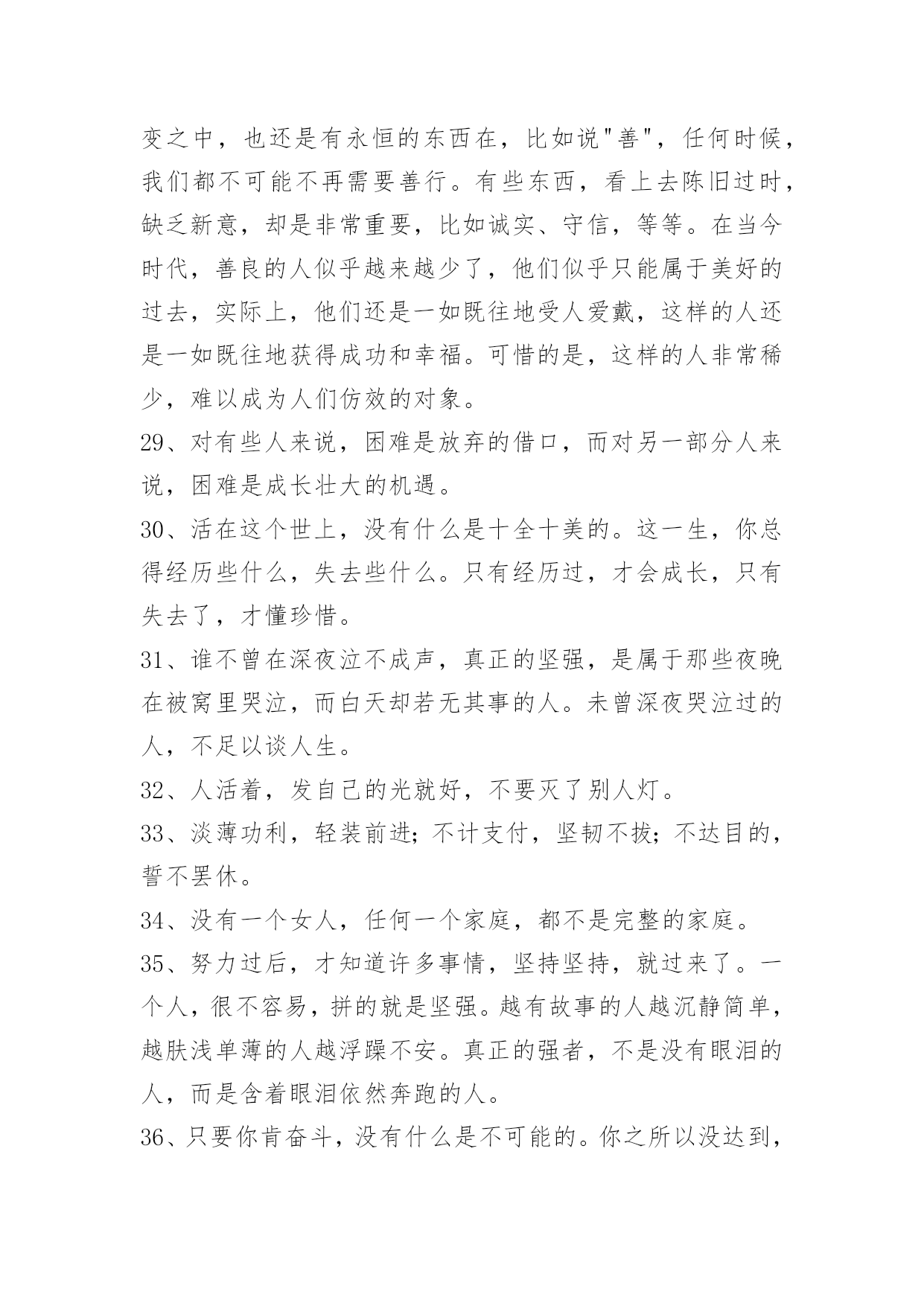 工作励志语录79条【实用】2022年工作励志语录79条母爱如水,用她的无休无止培养了我的耐性,使我像她一样,用有自己的目标,像妈妈一样,对事事都要求的成功,使我对任何人任何事都有极高的耐性。以下是小编为大家收集的工作励志语录79条,大家快来看看吧。1、人生在世间,风雨辗转,烟一程,雨一程。人生不是一种简单的存活,而是一种义务,还有承担,路过许多的陌生,相逢许多的聚散,送远那些陌生和熟悉,这人生的滋味,就是需要几分勇气和胆识,去实践自己的信念,生活让我们懂得,生活不只是叹息,活着一场人生,给心找一个宽阔平坦的归宿。2、人生没有捷径,成功没有侥幸。所谓的捷径,其实是最远的路;偷来的取巧,其实是致命的拙。无痛不快,无苦何甜,活着,本就是一种修行。要想到达最高处,就必须从最低处起飞;要想获得最大的成功,就必须做最苦的付出。3、很多二十几岁的年轻人只注重做大事,而不善于从细微之处、平凡之地观察赚钱的商机。要知道我们还没有太多的资金,也没有更多的知识,唯有用心可以让我们与众不同,让我们获得更多的财富。记住这句话吧,"遍地出黄金,只怕不用心。"互助一年石成玉,合作二年土变金每个人身上都有优点,也都有缺点。每个企业也都有优势和劣势,所以很多企业选择合作互助。而我们每个人也要学会与他人合作,才能实现双赢。4、其实,每个人都有自己潜在的才能,也都会遇上把他引向成功之路的机会,但很多人由于性格过于软弱、羞怯,或者没有勇气突破环境的束缚,而离成功越来越远。梦想,正是最大限度地谋求成功的愿望,它能使人的才能像火一样燃烧起来。即使身处逆境,也见不到成功的任何迹象,拥有梦想的人仍将满怀信心,一往无前,迈向生命的新台阶。5、没有女人是天生的天才,女人的幸福有时需要一点一滴的积累。人们常说,女人的成功往往来得比男人更慢些,这说明女人要想幸福,注重积累是必要的。6、人的成功取决于思维方式的成功,一个思维方式不断学习变化的人会更强,一个人云亦云的跟随者则不强。一个人的收入和社会地位和你的不可替代性成正比,一定要让自己成为不可替代性更高的人。独立的人格和独立的思维方式不可替代。我们总是想做到和别人一样,但是你能做到别人无法和你一样吗?—白岩松7、这十个简单的字能成就人生的成功,也可以说这是成就人生的十种极致境界,希望你能有所顿悟。8、一个人的特色就是他存在的价值,不要勉强自己去学别人,而要发挥自己的特长。这样不但自己觉得快乐,对社会人群也更容易有真正的贡献。有人说,要让自己快乐,最好的方法是先让别人快乐。快乐是成功的副产品。9、其实每个人心中都有脆弱的一面,活的累也是我们经常的一种心态,但我们还得活下去。生命对于我们每个人只有一次,没有理由不要好好的活!你累了,请将心靠岸;错了,别想到后悔;苦了,才懂得满足;伤了,才明白坚强;笑了,才体会美丽;闷了,去找你的情人聊聊!不管聊的怎样,给自己一份轻松。10、心态决定命运,不同的心态造就不同的人生。我们不能控制自己的遭遇,但是可以控制自己的心态;我们不能改变别人,但是可以改变自己。人与人之间其实并没有太大的区别,最大的区别在于心态。所以,一个人成功与否,主要取决于他的心态。保持积极乐观的心态,好运才会愿意跟着你。11、当你迷茫的时候,迅速行动起来才是克服无力感的唯一方式,而只有行动,才有可能突破与超越。永远不要用此时自己的心态与眼界,去揣度自己未来的心态与眼界。不要惧怕你的目标还不够完美与准确,因为最终能带领你抵达成功的,不是存在于你想法中的目标,而是不断积累的脚步。12、成功和失败通常不是一夕之果。成功是顺着一连串小小决定铺展的路径走来的,是主动出击、趁热打铁、坚持不懈。在人生的品格中,坚持不懈甚至比能力更重要,是最有价值的因素。13、人生最软弱的地方,是舍不得。舍不得一段不再精采的感情,舍不得一份虚荣,舍不得掌声。我们永远以为最好的日子是会很长很长的,不必那么快离开。就在我们心软和缺乏勇气的时候,最好的日子毫不留情地逝去了。14、每个人都当过梦想家,也都曾编织过一个又一个美妙的梦,那些孩子对美好未来的最初向往。虽然说,我们的人生都会开一次花,但不一定都会结果。可追梦者坚持下来时,他们终于成功了。15、通往学识宝库的门户多得很,大学只是其中的一个门户而己。这扇门一时进不去,可以从其他的门入内,甚至可以跳窗而入。不要躺在门旁叹大气,流眼泪,以至于当饿殍。16、第一盏,方向之灯。失败者常常预想失败的不良后果,成功者则设想成功的奖赏。第二盏,交往之灯。结交比你更懂行的人。第三盏,梦想之灯。成功者不过是爬起来比倒下去多一次。第四盏,进取之灯。回顾并更新自己的目标,不断向新的高度攀登。17、琴声的魅力让人难以抗拒,琴声的美丽使我感受到了收获的喜悦。收获的喜悦给我带来了学习的动力,现在我对钢琴更是情有独钟,它让我陶醉,让我在美妙