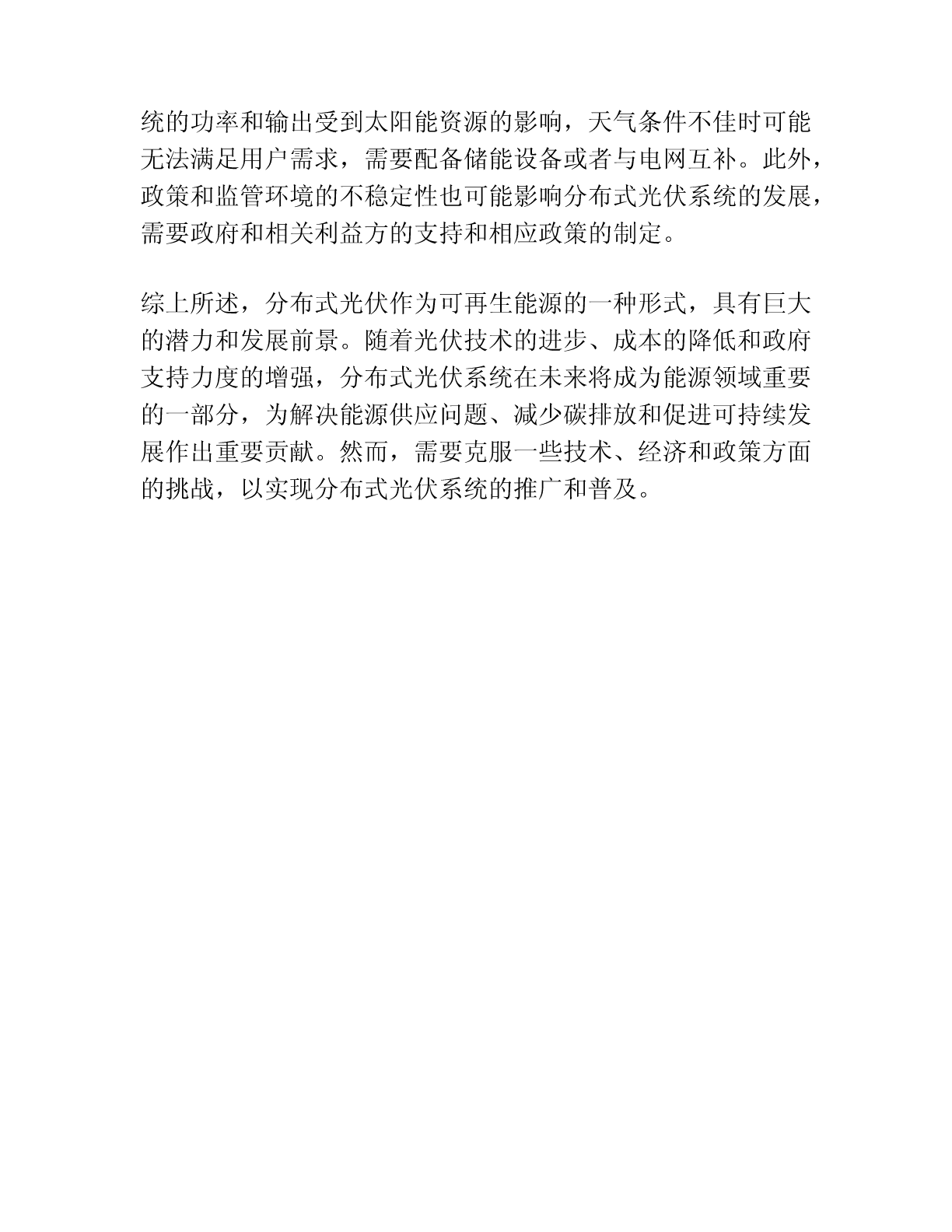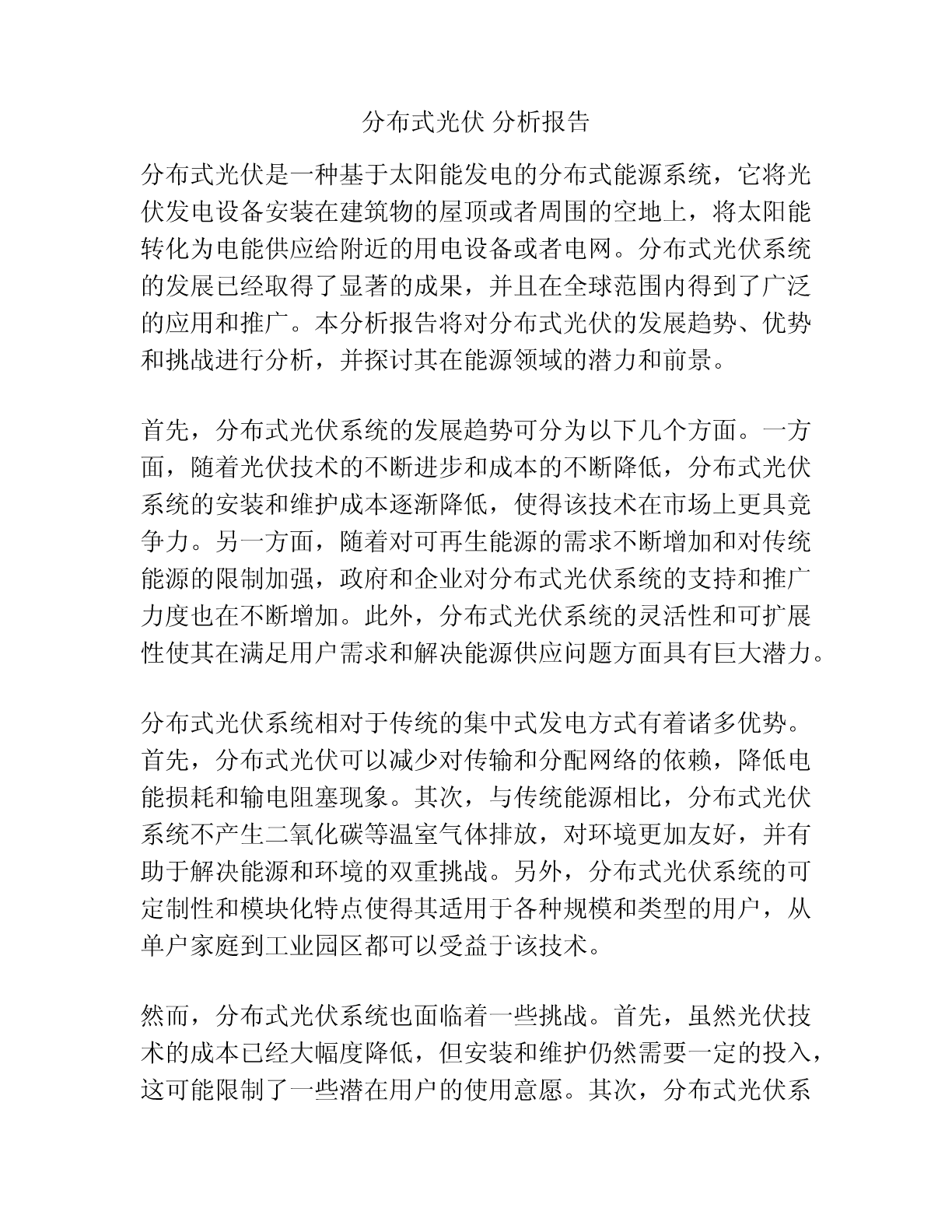 分布式光伏分析报告分布式光伏是一种基于太阳能发电的分布式能源系统,它将光伏发电设备安装在建筑物的屋顶或者周围的空地上,将太阳能转化为电能供应给附近的用电设备或者电网。分布式光伏系统的发展已经取得了显著的成果,并且在全球范围内得到了广泛的应用和推广。本分析报告将对分布式光伏的发展趋势、优势和挑战进行分析,并探讨其在能源领域的潜力和前景。首先,分布式光伏系统的发展趋势可分为以下几个方面。一方面,随着光伏技术的不断进步和成本的不断降低,分布式光伏系统的安装和维护成本逐渐降低,使得该技术在市场上更具竞争力。另一方面,随着对可再生能源的需求不断增加和对传统能源的限制加强,政府和企业对分布式光伏系统的支持和推广力度也在不断增加。此外,分布式光伏系统的灵活性和可扩展性使其在满足用户需求和解决能源供应问题方面具有巨大潜力。分布式光伏系统相对于传统的集中式发电方式有着诸多优势。首先,分布式光伏可以减少对传输和分配网络的依赖,降低电能损耗和输电阻塞现象。其次,与传统能源相比,分布式光伏系统不产生二氧化碳等温室气体排放,对环境更加友好,并有助于解决能源和环境的双重挑战。另外,分布式光伏系统的可定制性和模块化特点使得其适用于各种规模和类型的用户,从单户家庭到工业园区都可以受益于该技术。然而,分布式光伏系统也面临着一些挑战。首先,虽然光伏技术的成本已经大幅度降低,但安装和维护仍然需要一定的投入,这可能限制了一些潜在用户的使用意愿。其次,分布式光伏系统的功率和输出受到太阳能资源的影响,天气条件不佳时可能无法满足用户需求,需要配备储能设备或者与电网互补。此外,政策和监管环境的不稳定性也可能影响分布式光伏系统的发展,需要政府和相关利益方的支持和相应政策的制定。综上所述,分布式光伏作为可再生能源的一种形式,具有巨大的潜力和发展前景。随着光伏技术的进步、成本的降低和政府支持力度的增强,分布式光伏系统在未来将成为能源领域重要的一部分,为解决能源供应问题、减少碳排放和促进可持续发展作出重要贡献。然而,需要克服一些技术、经济和政策方面的挑战,以实现分布式光伏系统的推广和普及。