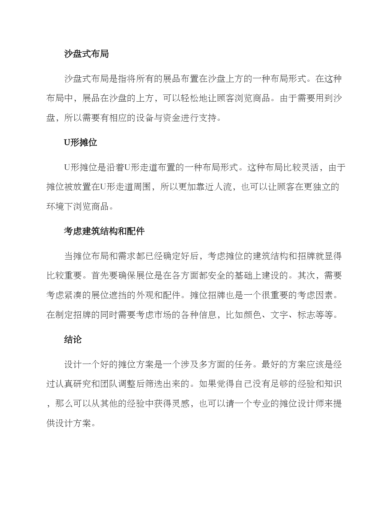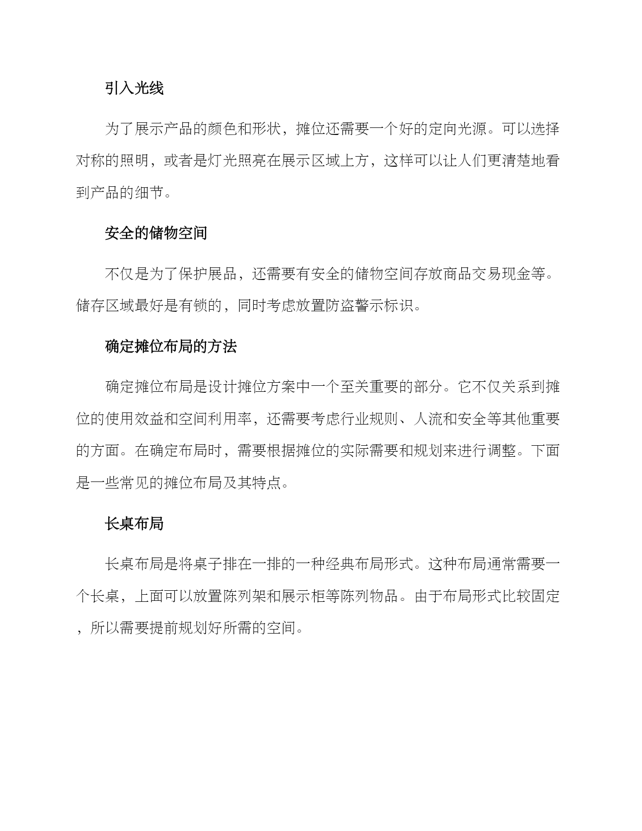 设计摊位方案随着经济的发展和人们生活水平的提高,各种展览会和市集越来越受到人们的关注。在这些场合中,展商们常常需要一个好的摊位来展示商品和服务,吸引顾客的眼球,进而提升销售业绩。设计一个适合自己的摊位方案就成为展商们不可避免的任务。分析并确定需要的元素在设计一个摊位方案之前,我们需要分析出需要的元素。摊位空间有所不同,所需要的元素也不一样,但是一些常见的元素是必须要考虑的。以下是一些常规的需要考虑的元素。展示产品的区域展示产品的区域是一个摊位中最重要的元素之一。如果在这个区域呈现出高质量的产品和服务,将会吸引更多的人。在设计这个区域时,需要考虑商家的产品的特点和客户的需求,来确定展示区域的大小和形状。同时,要充分考虑产品的展示方式,选择适合展示的陈列架和展示柜。展示宣传材料在展示区域旁边还需要一个位置来展示商家的宣传资料。比如宣传册,宣传单页,商品说明等等。为了方便人们浏览,除了将宣传资料放在桌子上,还可以考虑使用一个简单的展示柜来展示宣传资料。引入光线为了展示产品的颜色和形状,摊位还需要一个好的定向光源。可以选择对称的照明,或者是灯光照亮在展示区域上方,这样可以让人们更清楚地看到产品的细节。安全的储物空间不仅是为了保护展品,还需要有安全的储物空间存放商品交易现金等。储存区域最好是有锁的,同时考虑放置防盗警示标识。确定摊位布局的方法确定摊位布局是设计摊位方案中一个至关重要的部分。它不仅关系到摊位的使用效益和空间利用率,还需要考虑行业规则、人流和安全等其他重要的方面。在确定布局时,需要根据摊位的实际需要和规划来进行调整。下面是一些常见的摊位布局及其特点。长桌布局长桌布局是将桌子排在一排的一种经典布局形式。这种布局通常需要一个长桌,上面可以放置陈列架和展示柜等陈列物品。由于布局形式比较固定,所以需要提前规划好所需的空间。沙盘式布局沙盘式布局是指将所有的展品布置在沙盘上方的一种布局形式。在这种布局中,展品在沙盘的上方,可以轻松地让顾客浏览商品。由于需要用到沙盘,所以需要有相应的设备与资金进行支持。U形摊位U形摊位是沿着U形走道布置的一种布局形式。这种布局比较灵活,由于摊位被放置在U形走道周围,所以更加靠近人流,也可以让顾客在更独立的环境下浏览商品。考虑建筑结构和配件当摊位布局和需求都已经确定好后,考虑摊位的建筑结构和招牌就显得比较重要。首先要确保展位是在各方面都安全的基础上建设的。其次,需要考虑紧凑的展位遮挡的外观和配件。摊位招牌也是一个很重要的考虑因素。在制定招牌的同时需要考虑市场的各种信息,比如颜色、文字、标志等等。结论设计一个好的摊位方案是一个涉及多方面的任务。最好的方案应该是经过认真研究和团队调整后筛选出来的。如果觉得自己没有足够的经验和知识,那么可以从其他的经验中获得灵感,也可以请一个专业的摊位设计师来提供设计方案。