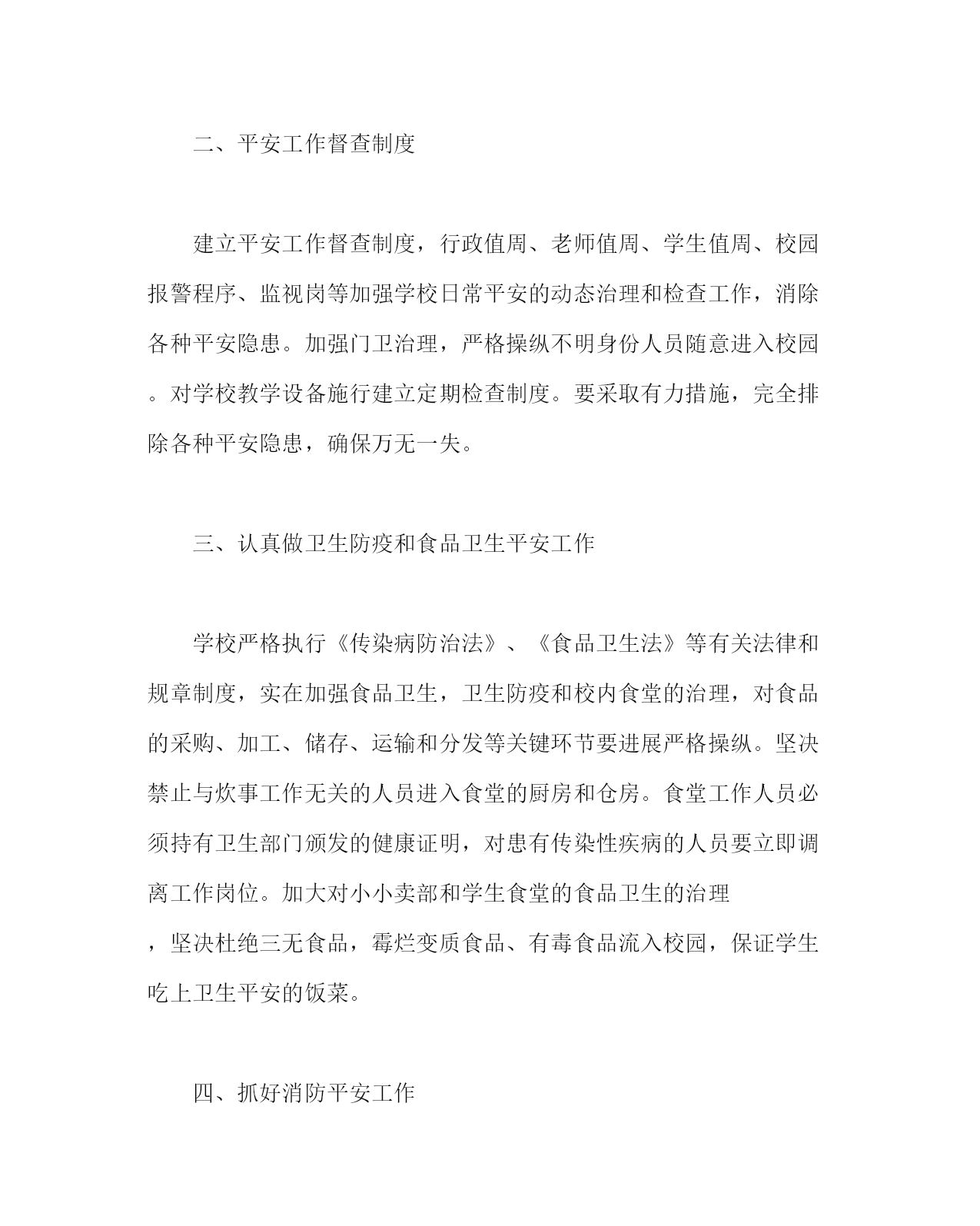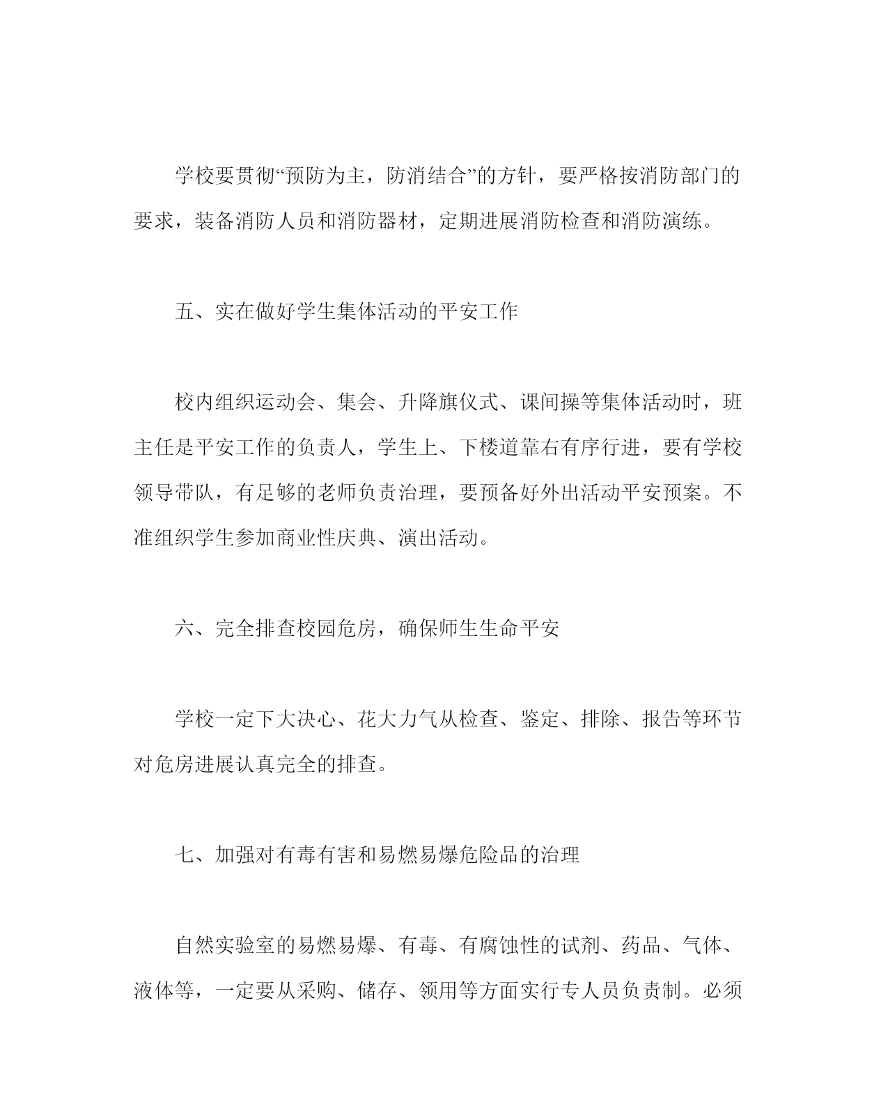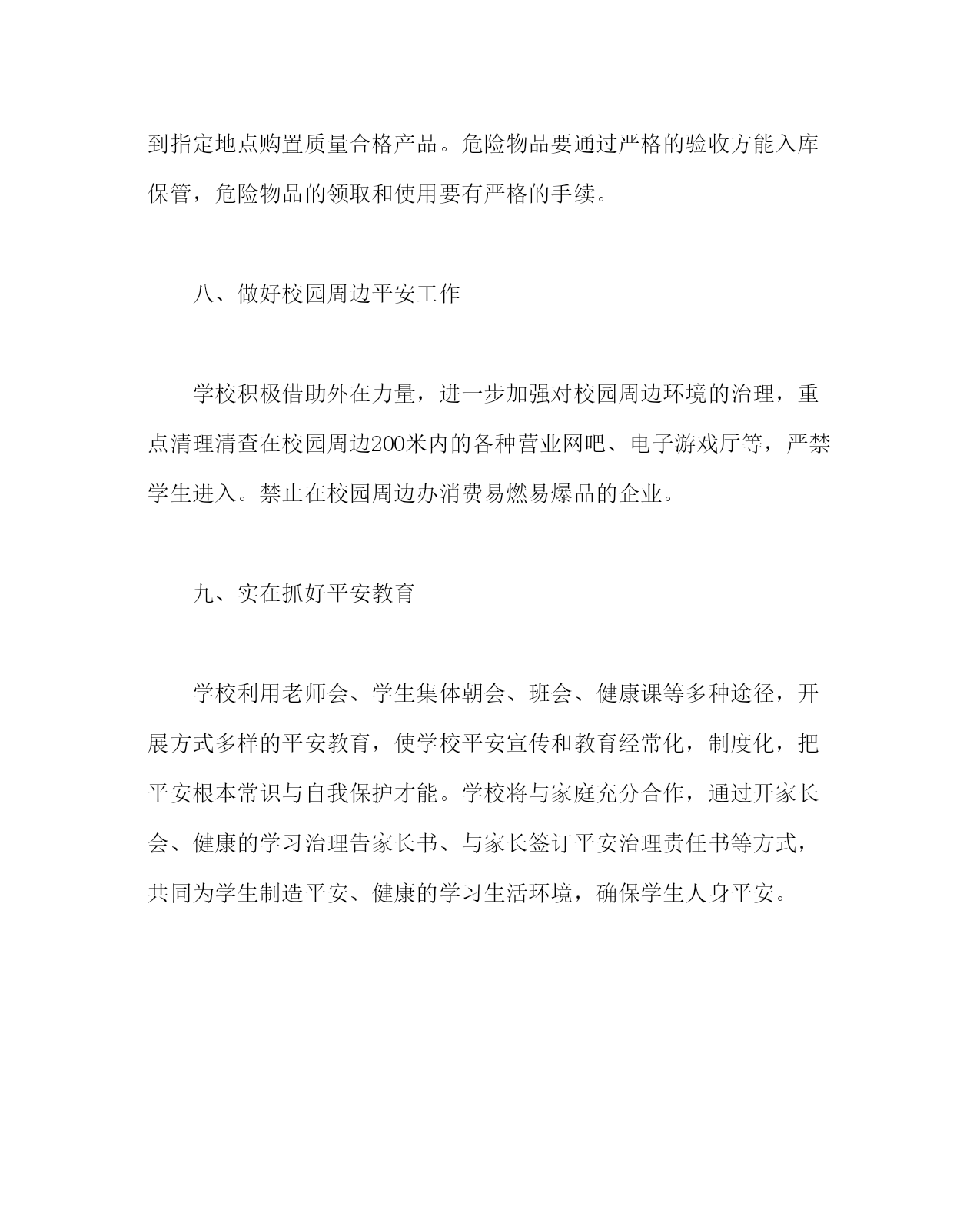 政教处范文之学校平安工作计划四以“三个代表”重要思想为指导,全面贯彻落实有关平安工作精神,坚持“平安第一,预防为主”的方针,围绕创立平安和谐校园的目的,进一步强化责任认识,明确工作任务,完善治理制度,狠抓措施落实,努力探究创新,不断稳固成果,积极建立学校平安工作长效机制,杜绝重(特)大责任事故,减少其它平安事故,推进我校工作持续、稳步、深化地开展。一、加强领导,提高认识,落实责任平安工作“责任重于泰山”。本着对国家、对人民高度负责的政治态度,认真贯彻国家有关平安工作的法律法规,健全学校平安工作领导机构和各项平安工作负责制度,依法落实各项平安措施,做到负责到人。依照“谁主管,谁负责”的原则,校长是学校平安工作的第一负责人,各年级组长是该年级的平安工作第一责任人,各班班主任是该班平安工作第一负责人,各专用室治理人是该室平安工作第一负责人,学校将把平安工作作为对每个教职工年度工作目的考核的重要内容,并实行“一票否决”制度。二、平安工作督查制度建立平安工作督查制度,行政值周、老师值周、学生值周、校园报警程序、监视岗等加强学校日常平安的动态治理和检查工作,消除各种平安隐患。加强门卫治理,严格操纵不明身份人员随意进入校园。对学校教学设备施行建立定期检查制度。要采取有力措施,完全排除各种平安隐患,确保万无一失。三、认真做卫生防疫和食品卫生平安工作学校严格执行《传染病防治法》、《食品卫生法》等有关法律和规章制度,实在加强食品卫生,卫生防疫和校内食堂的治理,对食品的采购、加工、储存、运输和分发等关键环节要进展严格操纵。坚决禁止与炊事工作无关的人员进入食堂的厨房和仓房。食堂工作人员必须持有卫生部门颁发的健康证明,对患有传染性疾病的人员要立即调离工作岗位。加大对小小卖部和学生食堂的食品卫生的治理,坚决杜绝三无食品,霉烂变质食品、有毒食品流入校园,保证学生吃上卫生平安的饭菜。四、抓好消防平安工作学校要贯彻“预防为主,防消结合”的方针,要严格按消防部门的要求,装备消防人员和消防器材,定期进展消防检查和消防演练。五、实在做好学生集体活动的平安工作校内组织运动会、集会、升降旗仪式、课间操等集体活动时,班主任是平安工作的负责人,学生上、下楼道靠右有序行进,要有学校领导带队,有足够的老师负责治理,要预备好外出活动平安预案。不准组织学生参加商业性庆典、演出活动。六、完全排查校园危房,确保师生生命平安学校一定下大决心、花大力气从检查、鉴定、排除、报告等环节对危房进展认真完全的排查。七、加强对有毒有害和易燃易爆危险品的治理自然实验室的易燃易爆、有毒、有腐蚀性的试剂、药品、气体、液体等,一定要从采购、储存、领用等方面实行专人员负责制。必须到指定地点购置质量合格产品。危险物品要通过严格的验收方能入库保管,危险物品的领取和使用要有严格的手续。八、做好校园周边平安工作学校积极借助外在力量,进一步加强对校园周边环境的治理,重点清理清查在校园周边200米内的各种营业网吧、电子游戏厅等,严禁学生进入。禁止在校园周边办消费易燃易爆品的企业。九、实在抓好平安教育学校利用老师会、学生集体朝会、班会、健康课等多种途径,开展方式多样的平安教育,使学校平安宣传和教育经常化,制度化,把平安根本常识与自我保护才能。学校将与家庭充分合作,通过开家长会、健康的学习治理告家长书、与家长签订平安治理责任书等方式,共同为学生制造平安、健康的学习生活环境,确保学生人身平安。