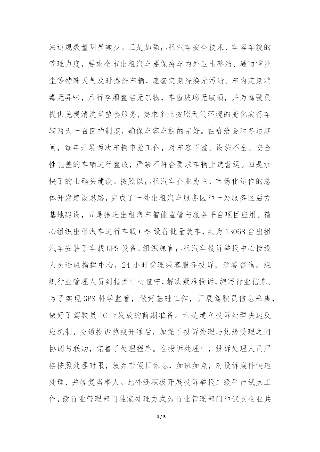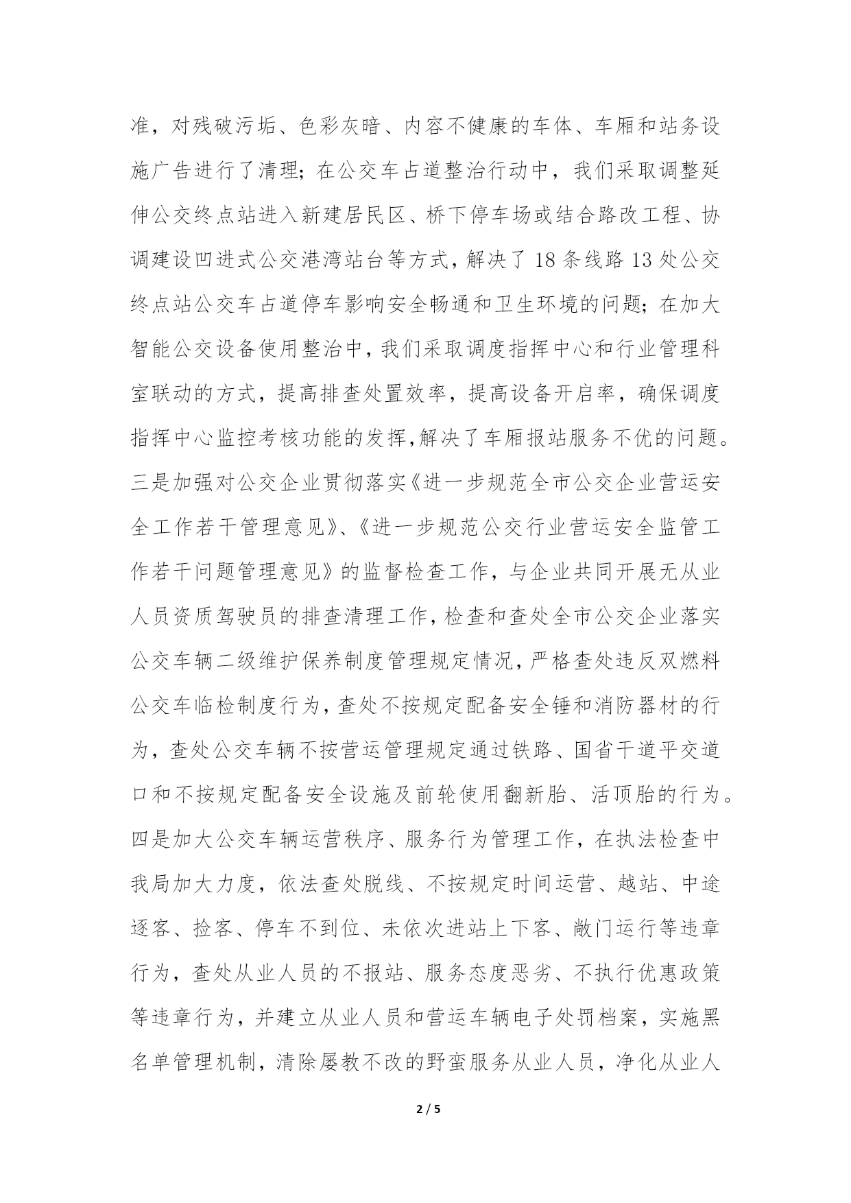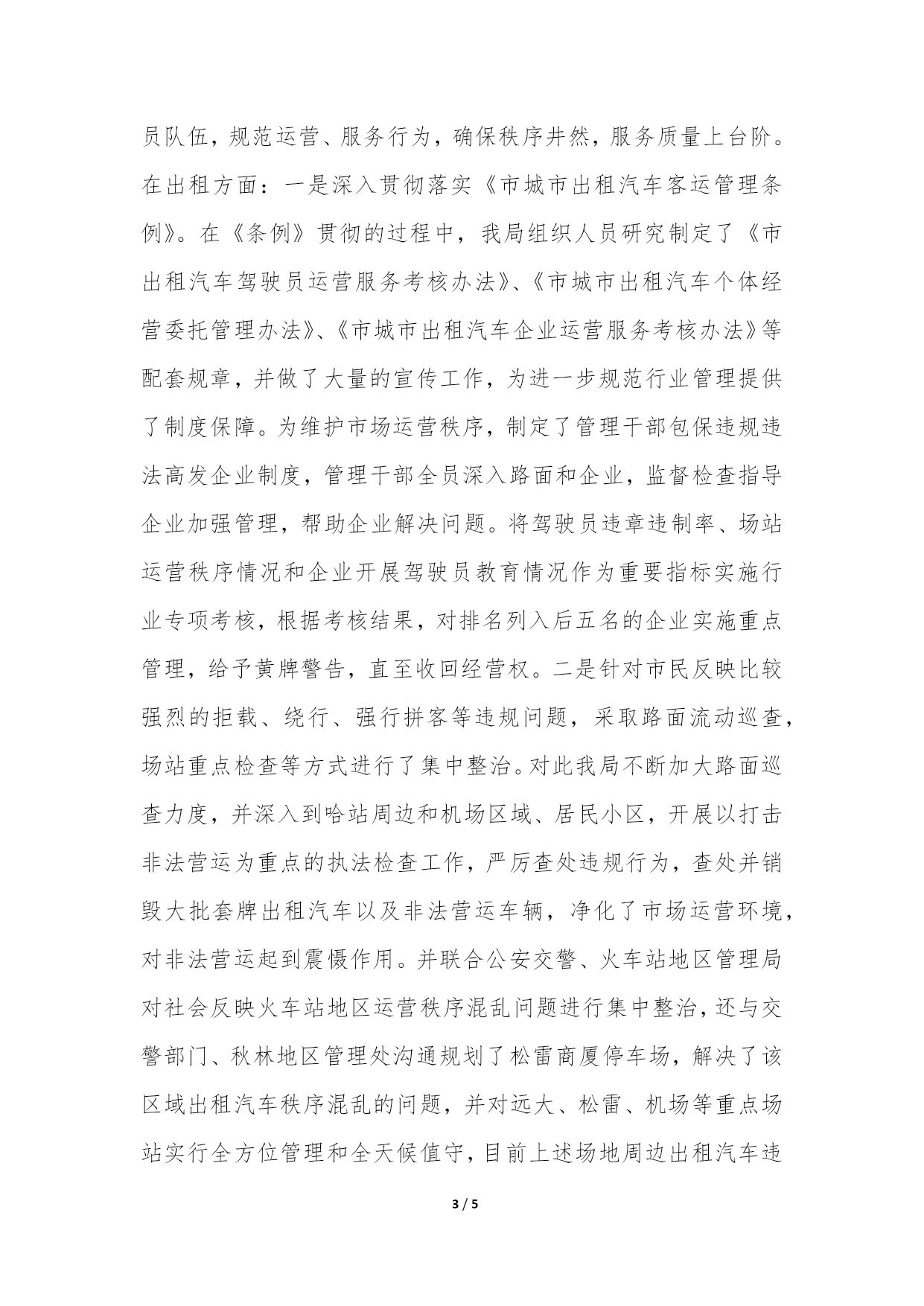 PAGE5/NUMPAGES5交通局综合整治工作总结自我市交委会成立以来,我局严格按照市委和交委会的工作部署,深入贯彻科学发展观,以三个交通建设为主题,以抓好交通保障服务为重点,以整治交通秩序为主要内容,加快交通基础设施建设和文明行业建设,规范市场经营服务行为,强化安全监管,全力服务民生出行,着力治理市民反映的热点、难点问题,较好地完成了我局承担的各项工作任务。现将具体工作完成情况总结如下:一、城市道路综合整治取得显著成效。(二)交通秩序逐步规范,经营环境明显改善。在公交方面:一是为全面提高公交市场运营秩序,我局实施了特许经营权考核监管机制。根据《公交线路特许经营协议》修订了公交线路特许经营权考核标准,对公交线路车辆完好率、工作车率、计划行车率、行车准点率、车厢服务合格率和车厢整洁合格率以及安全运营7项公交服务民生指标进行了严格考核,采取视频录像现场取证,建立公交线路特许经营权考核电子档案的方式,加强对公交线路特许经营权监管。二是开展了专项整治行动,加强公交行业整顿和规范。在全行业开展了文明行车、规范进站百日会战等活动,对公交车辆站外停车、不按站位停靠、不依次序进站等服务顽疾进行了严格监管,有效规范了公交车辆站台停靠行为。进一步规定了公交车(船)体及公交基础设施广告设置标准,对残破污垢、色彩灰暗、内容不健康的车体、车厢和站务设施广告进行了清理;在公交车占道整治行动中,我们采取调整延伸公交终点站进入新建居民区、桥下停车场或结合路改工程、协调建设凹进式公交港湾站台等方式,解决了18条线路13处公交终点站公交车占道停车影响安全畅通和卫生环境的问题;在加大智能公交设备使用整治中,我们采取调度指挥中心和行业管理科室联动的方式,提高排查处置效率,提高设备开启率,确保调度指挥中心监控考核功能的发挥,解决了车厢报站服务不优的问题。三是加强对公交企业贯彻落实《进一步规范全市公交企业营运安全工作若干管理意见》、《进一步规范公交行业营运安全监管工作若干问题管理意见》的监督检查工作,与企业共同开展无从业人员资质驾驶员的排查清理工作,检查和查处全市公交企业落实公交车辆二级维护保养制度管理规定情况,严格查处违反双燃料公交车临检制度行为,查处不按规定配备安全锤和消防器材的行为,查处公交车辆不按营运管理规定通过铁路、国省干道平交道口和不按规定配备安全设施及前轮使用翻新胎、活顶胎的行为。四是加大公交车辆运营秩序、服务行为管理工作,在执法检查中我局加大力度,依法查处脱线、不按规定时间运营、越站、中途逐客、捡客、停车不到位、未依次进站上下客、敞门运行等违章行为,查处从业人员的不报站、服务态度恶劣、不执行优惠政策等违章行为,并建立从业人员和营运车辆电子处罚档案,实施黑名单管理机制,清除屡教不改的野蛮服务从业人员,净化从业人员队伍,规范运营、服务行为,确保秩序井然,服务质量上台阶。在出租方面:一是深入贯彻落实《市城市出租汽车客运管理条例》。在《条例》贯彻的过程中,我局组织人员研究制定了《市出租汽车驾驶员运营服务考核办法》、《市城市出租汽车个体经营委托管理办法》、《市城市出租汽车企业运营服务考核办法》等配套规章,并做了大量的宣传工作,为进一步规范行业管理提供了制度保障。为维护市场运营秩序,制定了管理干部包保违规违法高发企业制度,管理干部全员深入路面和企业,监督检查指导企业加强管理,帮助企业解决问题。将驾驶员违章违制率、场站运营秩序情况和企业开展驾驶员教育情况作为重要指标实施行业专项考核,根据考核结果,对排名列入后五名的企业实施重点管理,给予黄牌警告,直至收回经营权。二是针对市民反映比较强烈的拒载、绕行、强行拼客等违规问题,采取路面流动巡查,场站重点检查等方式进行了集中整治。对此我局不断加大路面巡查力度,并深入到哈站周边和机场区域、居民小区,开展以打击非法营运为重点的执法检查工作,严厉查处违规行为,查处并销毁大批套牌出租汽车以及非法营运车辆,净化了市场运营环境,对非法营运起到震慑作用。并联合公安交警、火车站地区管理局对社会反映火车站地区运营秩序混乱问题进行集中整治,还与交警部门、秋林地区管理处沟通规划了松雷商厦停车场,解决了该区域出租汽车秩序混乱的问题,并对远大、松雷、机场等重点场站实行全方位管理和全天候值守,目前上述场地周边出租汽车违法违规数量明显减少。三是加强出租汽车安全技术、车容车貌的管理力度,要求全市出租汽车要保持车内外卫生整洁、遇雨雪沙尘等特殊天气及时擦洗车辆,座套定期洗换无污渍、车内定期消毒无异味,后行李厢整洁无杂物,车窗玻璃无破损,并为驾驶员提供免费清洗坐垫套服务,要求企业按照天气环境的变化实行车辆两天一召回的制度,确保车容车貌的完好。在哈洽会和冬运期间,每年开展两次车辆审验工作,对车容不整、设施不全、安全性能差的车辆进行整改,严禁不符合