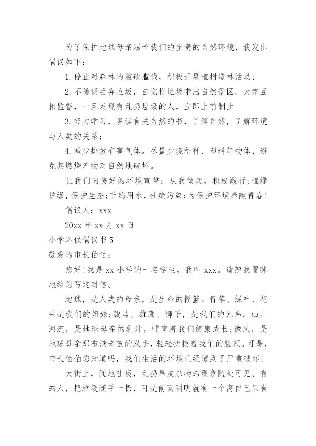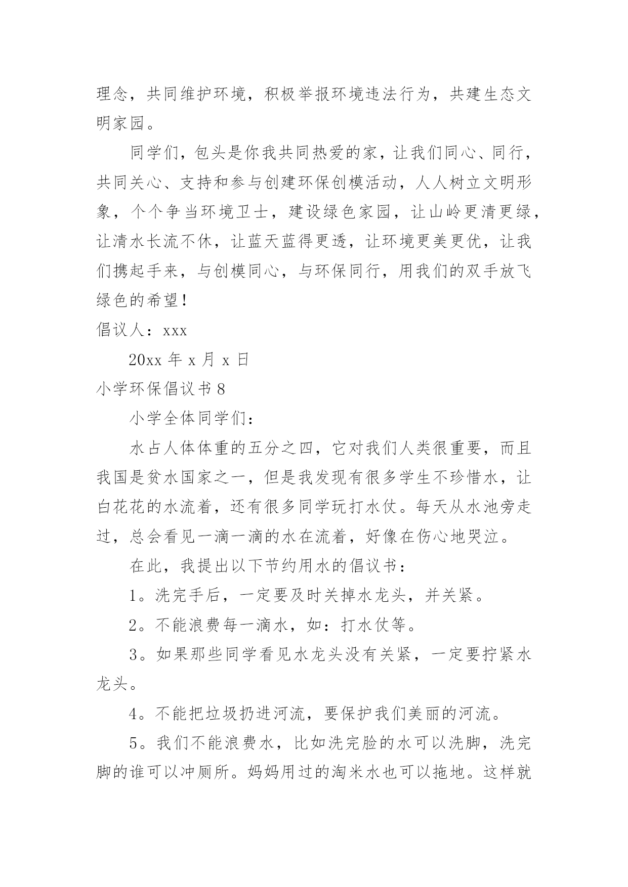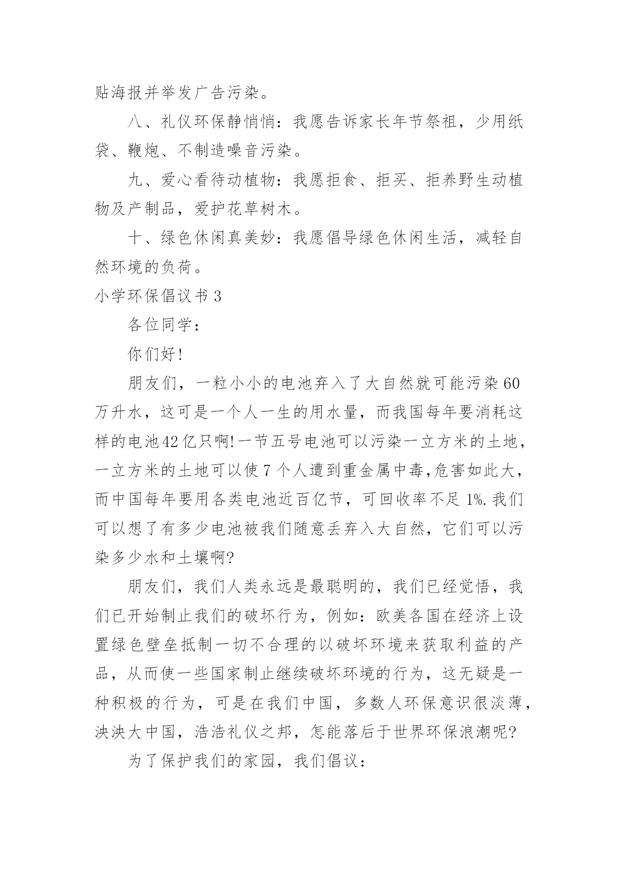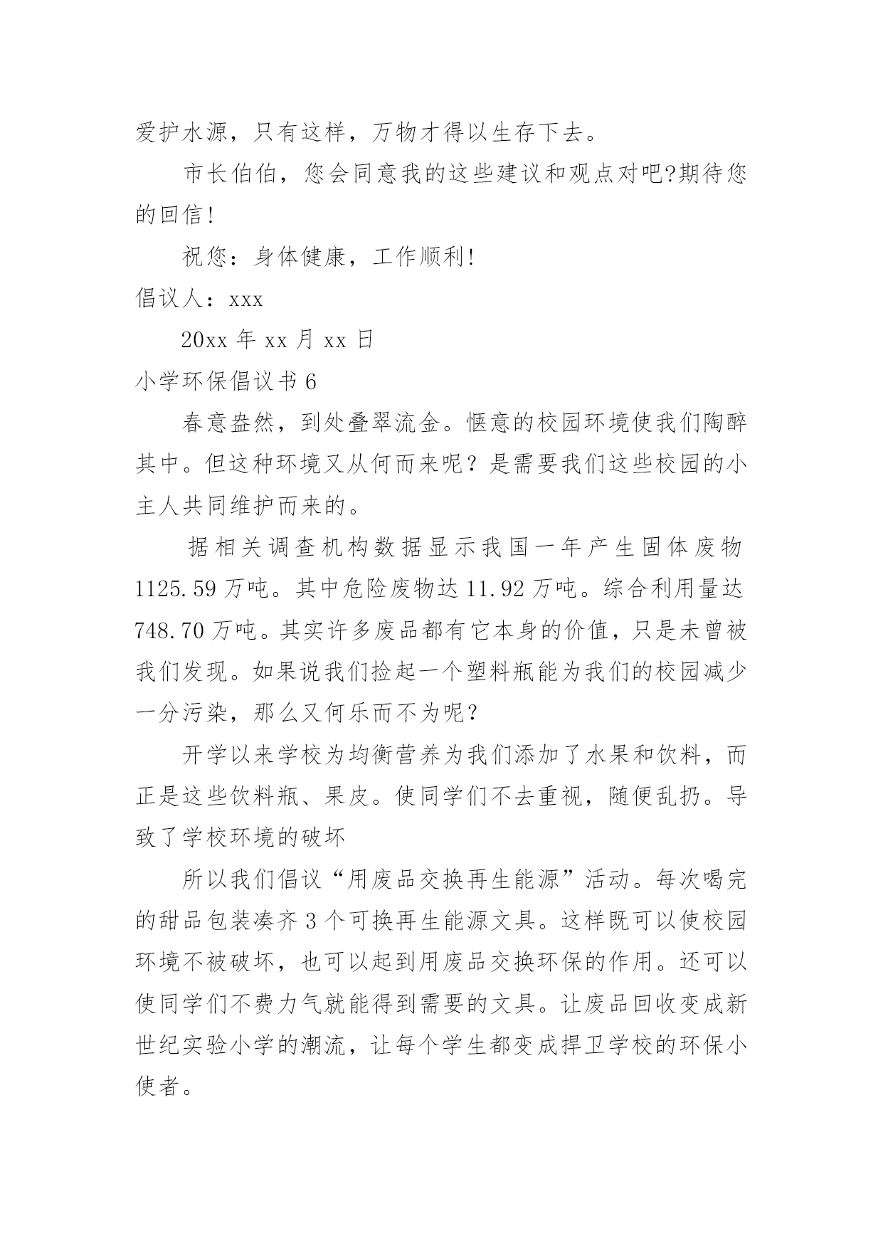 小学环保倡议书小学环保倡议书15篇在现实社会中,倡议书使用的情况越来越多,倡议书是由某一组织或社团拟定、就某事向社会提出建议或提议社会成员共同去做某事的书面文章。那么一般倡议书是怎么写的呢?以下是小编为大家整理的小学环保倡议书,欢迎大家借鉴与参考,希望对大家有所帮助。小学环保倡议书1同学们:大家好!我们每天相聚在一起,也许你的一句不经意的脏话刺痛了别人的心你会毫不在意,可别人的心里却永远留下了疤痕。我们生活在这大家庭中,理应当文明礼貌,友好待人,可个别同学不仅对老师不问好,就连同学朋友也出拳相对。所以我倡议大家做个文明礼貌的小学生,各个方面的工作,纳入到文明礼貌的轨道中。一、在别人面前不吐痰,不乱说脏话。见到同学老师主动问好,不做不文雅的动作。二、不仅要做到个人文明礼貌,还要督促别人改掉不文明的习惯,共同建设一个良好的社会风气。三、不在桌椅、墙壁上涂鸦,保持教室整洁,发现别人涂鸦及时报告老师。看到身边的垃圾主动捡起来扔到垃圾箱。如果每个人响应了我们的号召,那么我们就没有理由不相信一个美好的社会将出现在我们面前。在现代社会,社会公德已经成为公民个人道德修养和社会文明程度的重要表现。同学们,如果你们渴望拥有一个好的社会风气的话,就从现在起,尊敬长辈,关爱同学,做一个好公民。大家严于律己,改变这个社会的风气吧!此致敬礼!倡议人:日期:小学环保倡议书2一、关心校园的环保:我愿积极参与学校环境保护活动,共同维护校园环境。二、均衡饮食要做到:我要饮食均衡适量,提倡喝白开水,避免食用包装饮料与零食。三、节约用水和用电:我会节约用水,并养成随手关灯的好习惯。四、做个绿色消费者:我力行绿色消费,自备午餐餐具,减少使用免洗餐具。五、自备购物袋购物:我愿推行购物自备购物袋活动,少用塑胶袋或过度包装、不易回收的产品。六、大众运输省又好:我愿使用大众运输工具。七、抵制污染小广告:我愿抵制垃圾邮件广告,不会乱贴海报并举发广告污染。八、礼仪环保静悄悄:我愿告诉家长年节祭祖,少用纸袋、鞭炮、不制造噪音污染。九、爱心看待动植物:我愿拒食、拒买、拒养野生动植物及产制品,爱护花草树木。十、绿色休闲真美妙:我愿倡导绿色休闲生活,减轻自然环境的负荷。小学环保倡议书3各位同学:你们好!朋友们,一粒小小的电池弃入了大自然就可能污染60万升水,这可是一个人一生的用水量,而我国每年要消耗这样的电池42亿只啊!一节五号电池可以污染一立方米的土地,一立方米的土地可以使7个人遭到重金属中毒,危害如此大,而中国每年要用各类电池近百亿节,可回收率不足1%.我们可以想了有多少电池被我们随意丢弃入大自然,它们可以污染多少水和土壤啊?朋友们,我们人类永远是最聪明的,我们已经觉悟,我们已开始制止我们的破坏行为,例如:欧美各国在经济上设置绿色壁垒抵制一切不合理的以破坏环境来获取利益的产品,从而使一些国家制止继续破坏环境的行为,这无疑是一种积极的行为,可是在我们中国,多数人环保意识很淡薄,泱泱大中国,浩浩礼仪之邦,怎能落后于世界环保浪潮呢?为了保护我们的家园,我们倡议:1、大家行动起来,勇于同破坏环境,破坏生态的行为作斗争!2、少用甚至不用一次性饭盒、方便袋,不用一次性筷子等。3、节约每一滴水,每一度电,用好每一滴水,每一度电。4、节约每一滴水,每一度电,用好每一滴水,每一度电。重视环保,从你我做起!朋友们,行动起来吧!你我能力有限,但你我的心无限。关心环保,支持环保,从我做起,从小做起,我们的家园明天一定更美好!小学环保倡议书4各位同学们:大家好!听奶奶说,儿时的她常常穿梭于青山绿水之间。山,矗立在面前,草木郁郁葱葱,山花簇簇。绵绵细雨唤起满山云雾,山峰在袅袅云烟中若隐若现,更显得雄伟险峻,让人觉得它神秘而美丽。可是现在呈现在我们眼前的山早已失去梦幻之感,因为:漫山遍野都是垃圾,树枝上挂着丑陋不堪的塑料袋,草丛里随处是晃眼的白色饭盒。人类不断地砍伐树木,破坏生态环境,再也无法与自然和谐相处。现在的我们是:同弃废弃物,同饮垃圾水。为了保护地球母亲赐予我们的宝贵的自然环境,我发出倡议如下:1.停止对森林的滥砍滥伐,积极开展植树造林活动;2.不随便丢弃垃圾,自觉将垃圾带出自然景区。大家互相监督,一旦发现有乱扔垃圾的人,立即上前制止3.努力学习,多读有关自然的书,了解自然,了解环境与人类的关系;4.减少排放有害气体。尽量少烧秸秆、塑料等物体,避免其燃烧产物对自然地破坏。让我们向美好的环境宣誓:从我做起,积极践行;植绿护绿,保护生态;节约用水,杜绝污染;为保护环境奉献青春!倡议人:xxx20xx年xx月xx日小学环保倡议书5敬爱的市长伯伯:您好!我是xx小学的一名学生,我叫xxx。请恕我冒昧地给您写这封信。地球,是人类的母亲,是生命的摇篮。青草、绿叶、花朵是我们的姐妹;骏马、雄鹰、狮子,是我们的兄弟。