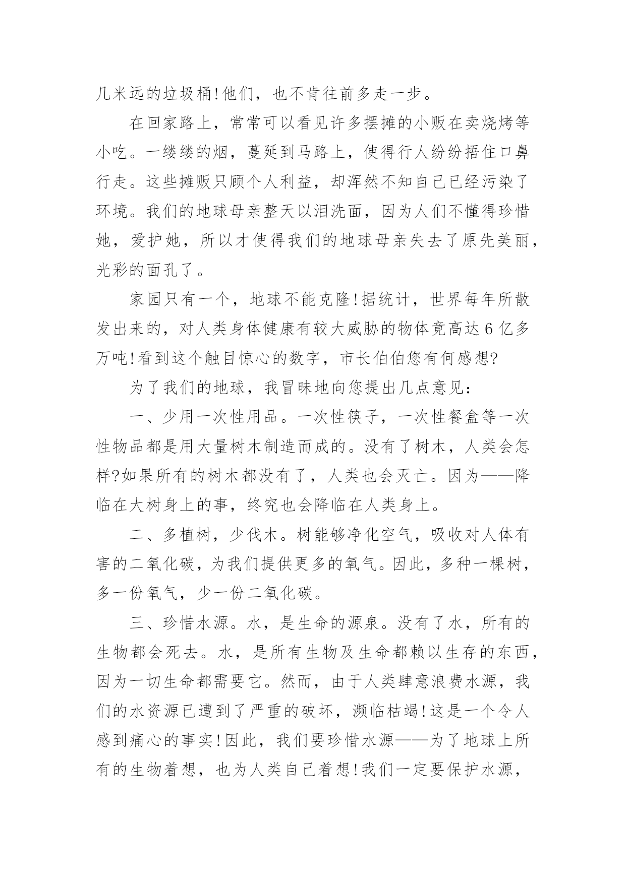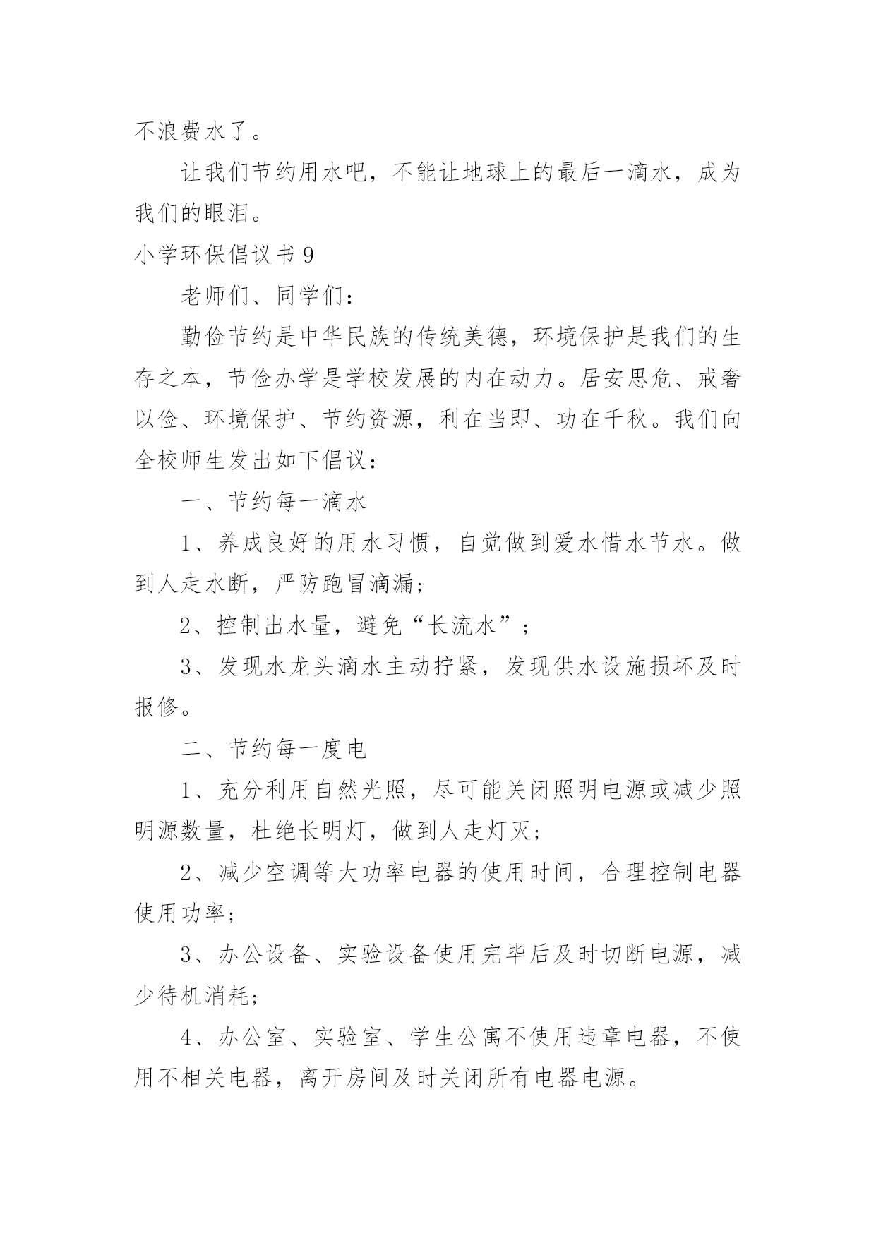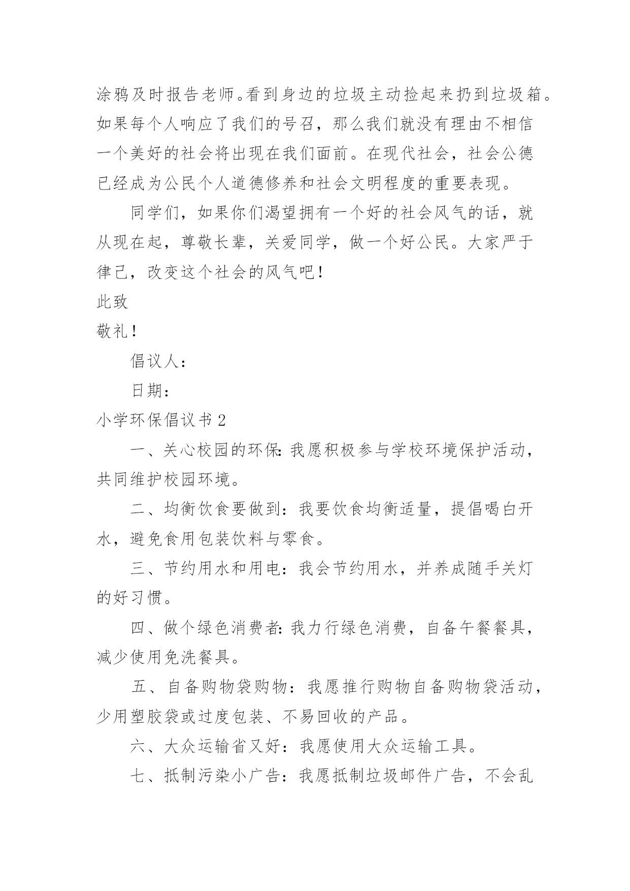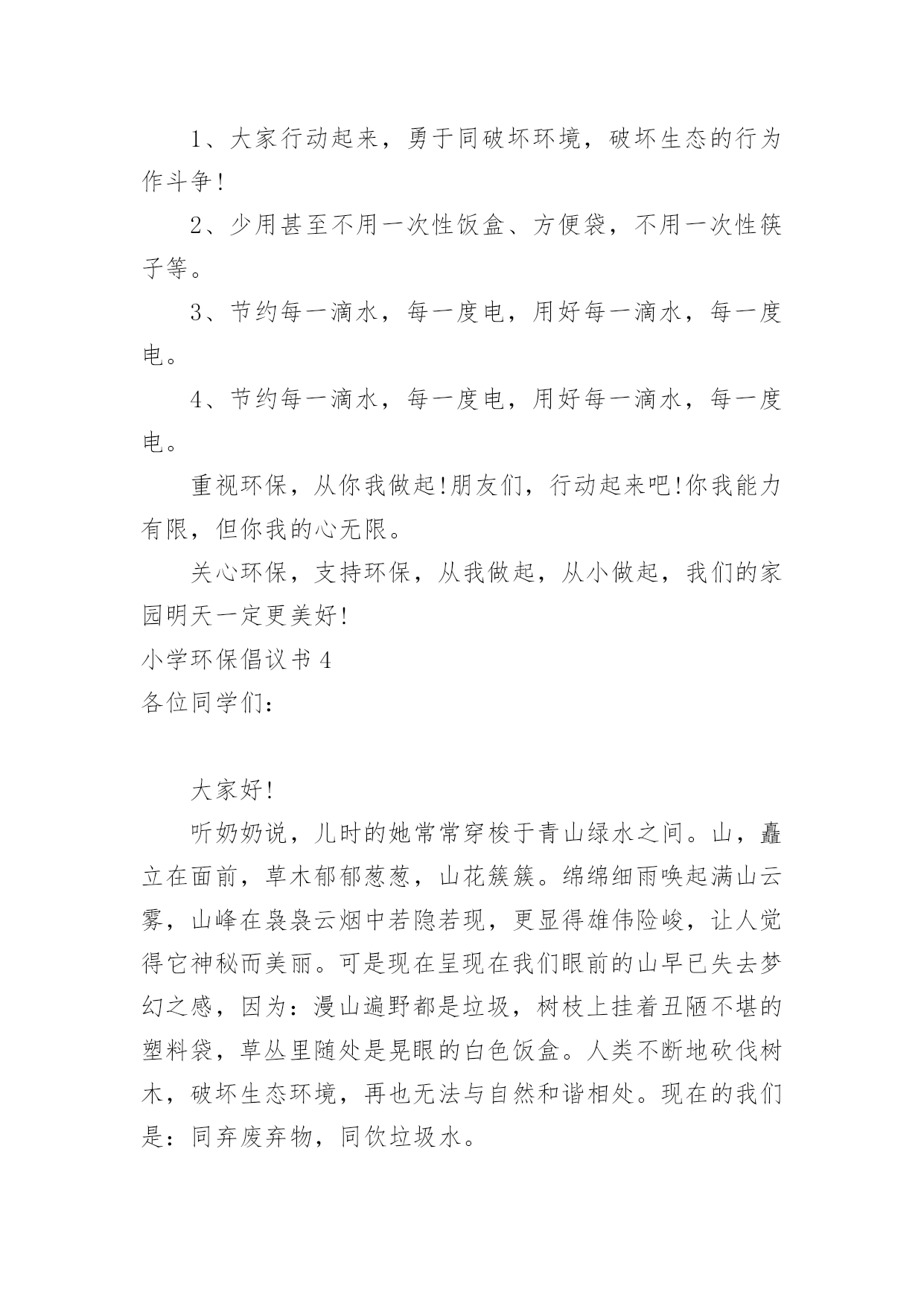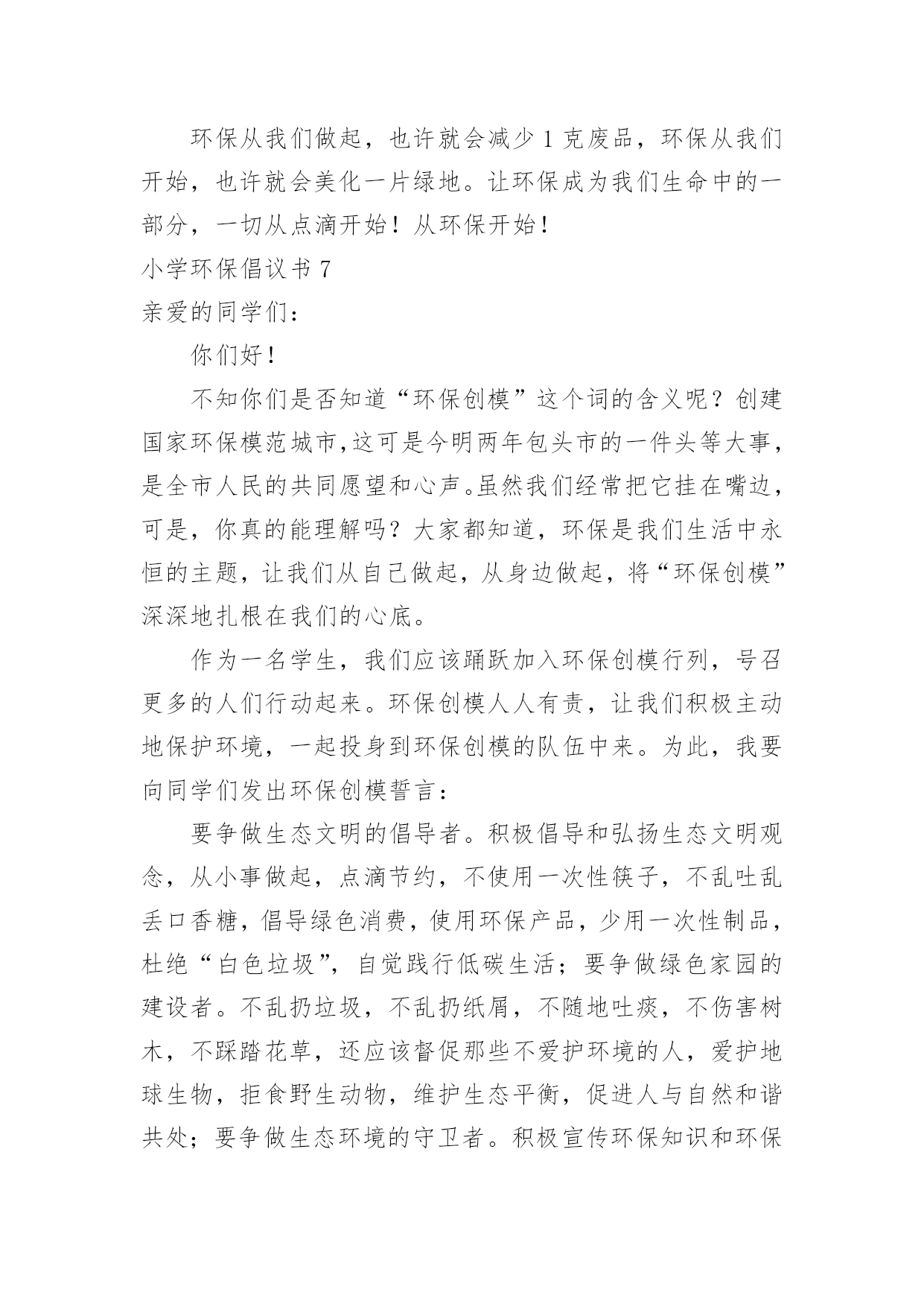 小学环保倡议书小学环保倡议书15篇在现实社会中,倡议书使用的情况越来越多,倡议书是由某一组织或社团拟定、就某事向社会提出建议或提议社会成员共同去做某事的书面文章。那么一般倡议书是怎么写的呢?以下是小编为大家整理的小学环保倡议书,欢迎大家借鉴与参考,希望对大家有所帮助。小学环保倡议书1同学们:大家好!我们每天相聚在一起,也许你的一句不经意的脏话刺痛了别人的心你会毫不在意,可别人的心里却永远留下了疤痕。我们生活在这大家庭中,理应当文明礼貌,友好待人,可个别同学不仅对老师不问好,就连同学朋友也出拳相对。所以我倡议大家做个文明礼貌的小学生,各个方面的工作,纳入到文明礼貌的轨道中。一、在别人面前不吐痰,不乱说脏话。见到同学老师主动问好,不做不文雅的动作。二、不仅要做到个人文明礼貌,还要督促别人改掉不文明的习惯,共同建设一个良好的社会风气。三、不在桌椅、墙壁上涂鸦,保持教室整洁,发现别人涂鸦及时报告老师。看到身边的垃圾主动捡起来扔到垃圾箱。如果每个人响应了我们的号召,那么我们就没有理由不相信一个美好的社会将出现在我们面前。在现代社会,社会公德已经成为公民个人道德修养和社会文明程度的重要表现。同学们,如果你们渴望拥有一个好的社会风气的话,就从现在起,尊敬长辈,关爱同学,做一个好公民。大家严于律己,改变这个社会的风气吧!此致敬礼!倡议人:日期:小学环保倡议书2一、关心校园的环保:我愿积极参与学校环境保护活动,共同维护校园环境。二、均衡饮食要做到:我要饮食均衡适量,提倡喝白开水,避免食用包装饮料与零食。三、节约用水和用电:我会节约用水,并养成随手关灯的好习惯。四、做个绿色消费者:我力行绿色消费,自备午餐餐具,减少使用免洗餐具。五、自备购物袋购物:我愿推行购物自备购物袋活动,少用塑胶袋或过度包装、不易回收的产品。六、大众运输省又好:我愿使用大众运输工具。七、抵制污染小广告:我愿抵制垃圾邮件广告,不会乱贴海报并举发广告污染。八、礼仪环保静悄悄:我愿告诉家长年节祭祖,少用纸袋、鞭炮、不制造噪音污染。九、爱心看待动植物:我愿拒食、拒买、拒养野生动植物及产制品,爱护花草树木。十、绿色休闲真美妙:我愿倡导绿色休闲生活,减轻自然环境的负荷。小学环保倡议书3各位同学:你们好!朋友们,一粒小小的电池弃入了大自然就可能污染60万升水,这可是一个人一生的用水量,而我国每年要消耗这样的电池42亿只啊!一节五号电池可以污染一立方米的土地,一立方米的土地可以使7个人遭到重金属中毒,危害如此大,而中国每年要用各类电池近百亿节,可回收率不足1%.我们可以想了有多少电池被我们随意丢弃入大自然,它们可以污染多少水和土壤啊?朋友们,我们人类永远是最聪明的,我们已经觉悟,我们已开始制止我们的破坏行为,例如:欧美各国在经济上设置绿色壁垒抵制一切不合理的以破坏环境来获取利益的产品,从而使一些国家制止继续破坏环境的行为,这无疑是一种积极的行为,可是在我们中国,多数人环保意识很淡薄,泱泱大中国,浩浩礼仪之邦,怎能落后于世界环保浪潮呢?为了保护我们的家园,我们倡议:1、大家行动起来,勇于同破坏环境,破坏生态的行为作斗争!2、少用甚至不用一次性饭盒、方便袋,不用一次性筷子等。3、节约每一滴水,每一度电,用好每一滴水,每一度电。4、节约每一滴水,每一度电,用好每一滴水,每一度电。重视环保,从你我做起!朋友们,行动起来吧!你我能力有限,但你我的心无限。关心环保,支持环保,从我做起,从小做起,我们的家园明天一定更美好!小学环保倡议书4各位同学们:大家好!听奶奶说,儿时的她常常穿梭于青山绿水之间。山,矗立在面前,草木郁郁葱葱,山花簇簇。绵绵细雨唤起满山云雾,山峰在袅袅云烟中若隐若现,更显得雄伟险峻,让人觉得它神秘而美丽。可是现在呈现在我们眼前的山早已失去梦幻之感,因为:漫山遍野都是垃圾,树枝上挂着丑陋不堪的塑料袋,草丛里随处是晃眼的白色饭盒。人类不断地砍伐树木,破坏生态环境,再也无法与自然和谐相处。现在的我们是:同弃废弃物,同饮垃圾水。为了保护地球母亲赐予我们的宝贵的自然环境,我发出倡议如下:1.停止对森林的滥砍滥伐,积极开展植树造林活动;2.不随便丢弃垃圾,自觉将垃圾带出自然景区。大家互相监督,一旦发现有乱扔垃圾的人,立即上前制止3.努力学习,多读有关自然的书,了解自然,了解环境与人类的关系;4.减少排放有害气体。尽量少烧秸秆、塑料等物体,避免其燃烧产物对自然地破坏。让我们向美好的环境宣誓:从我做起,积极践行;植绿护绿,保护生态;节约用水,杜绝污染;为保护环境奉献青春!倡议人:xxx20xx年xx月xx日小学环保倡议书5敬爱的市长伯伯:您好!我是xx小学的一名学生,我叫xxx。请恕我冒昧地给您写这封信。地球,是人类的母亲,是生命的摇篮。青草、绿叶、花朵是我们的姐妹;骏马、雄鹰、狮子,是我们的兄弟。