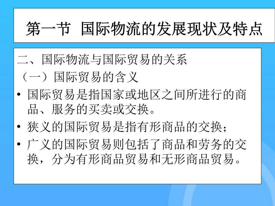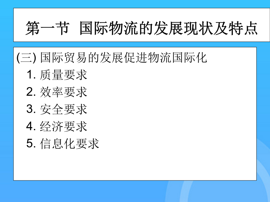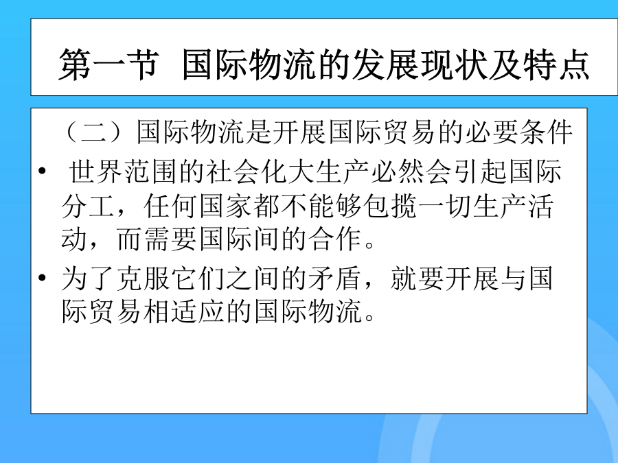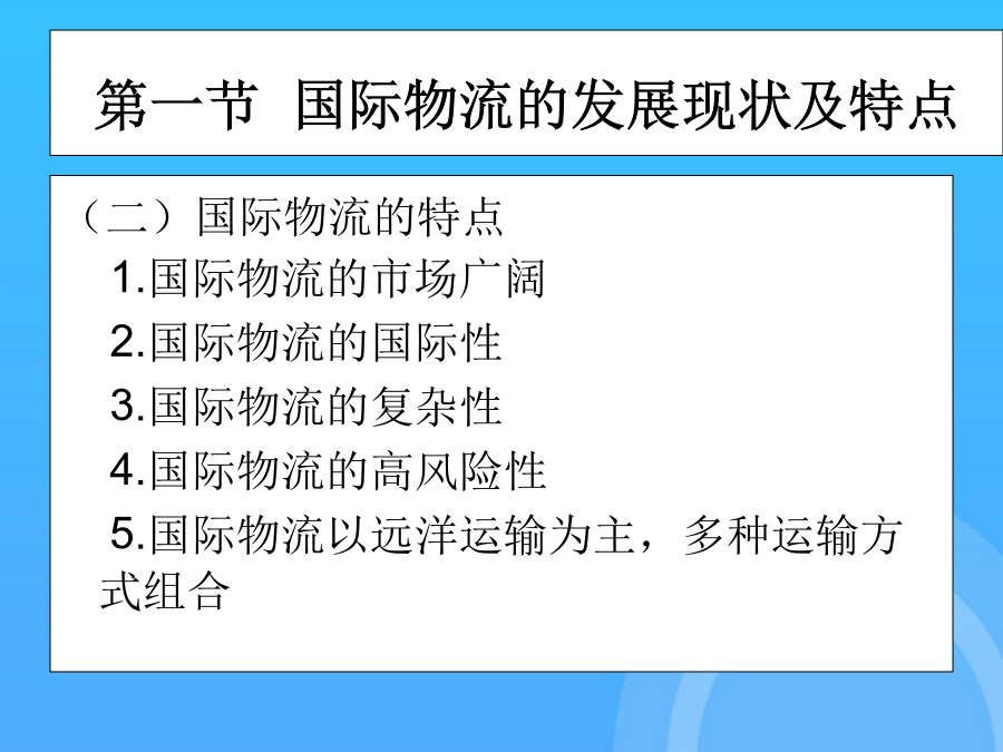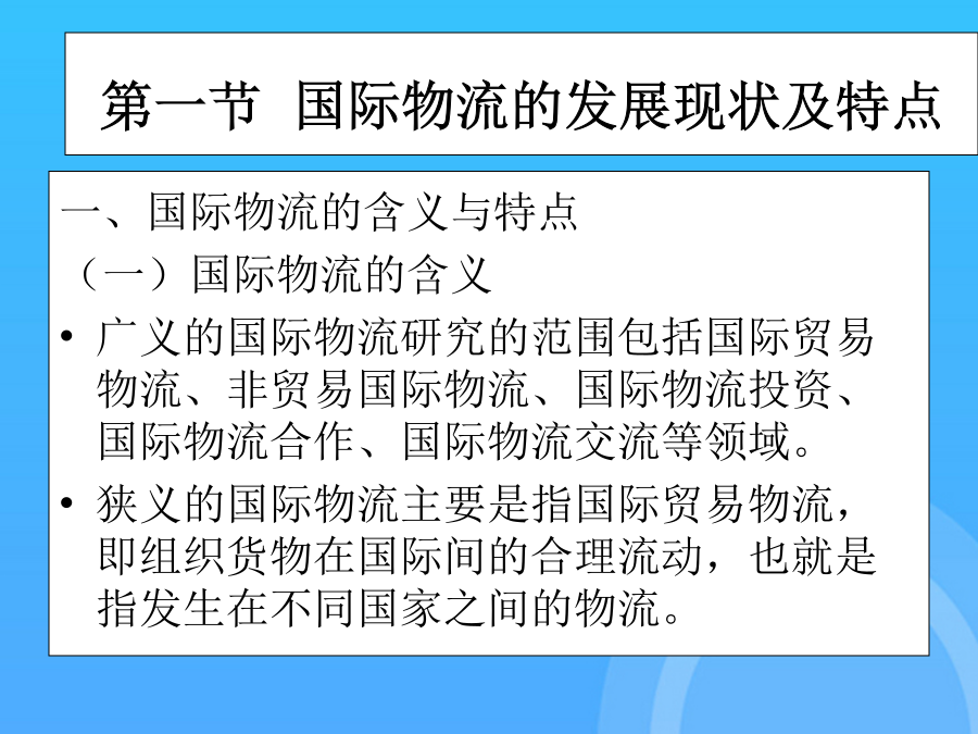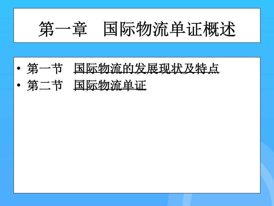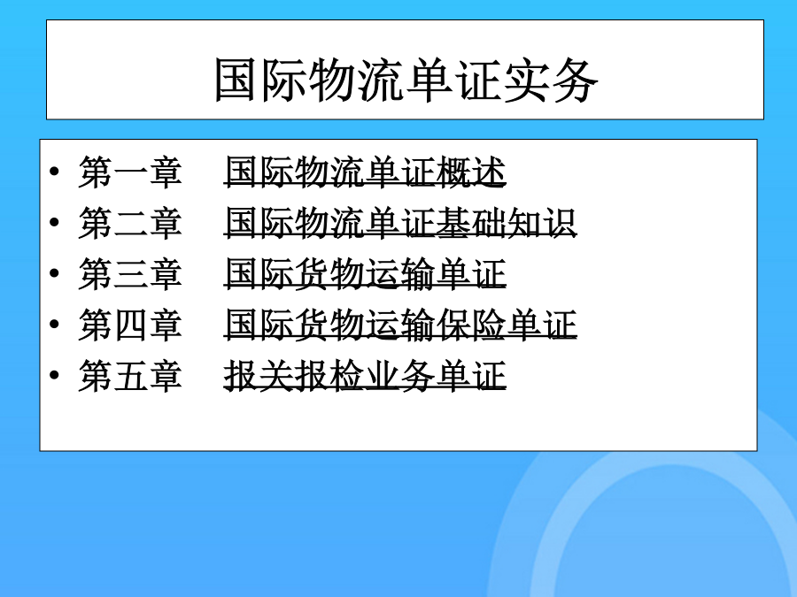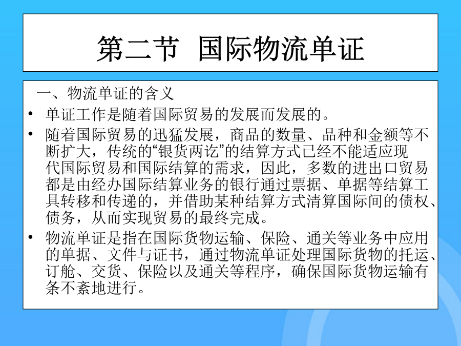 国际物流单证实务(优质)国际物流单证实务PPT课件国际物流单证实务第一章国际物流单证概述第一节国际物流的发展现状及特点第一节国际物流的发展现状及特点第一节国际物流的发展现状及特点第一节国际物流的发展现状及特点第一节国际物流的发展现状及特点第二节国际物流单证第二节国际物流单证第二节国际物流单证第二节国际物流单证第二节国际物流单证第二节国际物流单证第二节国际物流单证第二章国际物流单证基础知识第一节国际贸易术语与国际惯例集装箱整箱货出口货运流程1.“四固定”的特点,即固定航线、固定港口、固定船期和相对固定的费率。第二节报检业务单证保险的责任起讫,是指保险人对被保险货物承担保险责任的有效时间。(1)一般出境货物在报关前或装运前7天报检。14.货物名称(DescriptionofGoods)通知修改的银行应将任何接受或拒绝的通知转告发出修改的银行。第二节信用证基础知识1.集装器按注册与非注册划分通知修改的银行应将任何接受或拒绝的通知转告发出修改的银行。在全程运输中以集装箱为媒介,使用机械装卸、搬运,可以从一种运输工具直接方便地换装到另一种运输工具,而无须接触或移动箱内的货物。第一节报关业务单证(2)需隔离检疫的动物,出境前60天预报,隔离前7天报检。(四)集装箱整箱货运输业务流程19.运费和费用(Freightandcharges)第一节国际海洋货物运输单证2.使用CIF术语应注意的问题第一节国际贸易术语与国际惯例第一节国际贸易术语与国际惯例第一节国际贸易术语与国际惯例第一节国际贸易术语与国际惯例第一节国际贸易术语与国际惯例第一节国际贸易术语与国际惯例第一节国际贸易术语与国际惯例第一节国际贸易术语与国际惯例第一节国际贸易术语与国际惯例第一节国际贸易术语与国际惯例第一节国际贸易术语与国际惯例第一节国际贸易术语与国际惯例第一节国际贸易术语与国际惯例第一节国际贸易术语与国际惯例第一节国际贸易术语与国际惯例第二节信用证基础知识第二节信用证基础知识第二节信用证基础知识第二节信用证基础知识第二节信用证基础知识第二节信用证基础知识第三节信用证的审核第三节信用证的审核第三节信用证的审核第三节信用证的审核第三节信用证的审核第三节信用证的审核第三节信用证的审核4.放行并装运货物(二)买方指定境外船代的问题(五)特殊要求与指示(二)SWIFT电文表示方式第一节国际物流的发展现状及特点(四)有关运输保险方面的条款2.使用CIF术语应注意的问题第三节航空货物运输单证(一)船舶到港时间的规定单证工作是随着国际贸易的发展而发展的。第一节国际海洋货物运输单证单证工作是随着国际贸易的发展而发展的。一、国际贸易术语的含义及其国际贸易惯例付款的条件是出口方(受受益人)向银行提交符合信用证规定的单据;第一节国际货物运输保险基础知识(五)单证工作是企业经营管理的重要环节(二)班轮运输的种类(二)遵循《UCP600》审核信用证第四节信用证的修改第四节信用证的修改第四节信用证的修改第四节信用证的修改第三章国际货物运输单证第一节国际海洋货物运输单证第一节国际海洋货物运输单证第一节国际海洋货物运输单证第一节国际海洋货物运输单证第一节国际海洋货物运输单证第一节国际海洋货物运输单证第一节国际海洋货物运输单证第一节国际海洋货物运输单证第一节国际海洋货物运输单证第一节国际海洋货物运输单证第一节国际海洋货物运输单证第一节国际海洋货物运输单证第一节国际海洋货物运输单证第一节国际海洋货物运输单证第一节国际海洋货物运输单证第一节国际海洋货物运输单证第一节国际海洋货物运输单证第二节集装箱货物运输单证第二节集装箱货物运输单证第二节集装箱货物运输单证第二节集装箱货物运输单证第二节集装箱货物运输单证第二节集装箱货物运输单证第二节集装箱货物运输单证第二节集装箱货物运输单证第二节集装箱货物运输单证第三节航空货物运输单证第三节航空货物运输单证第三节航空货物运输单证第三节航空货物运输单证第三节航空货物运输单证第三节航空货物运输单证第三节航空货物运输单证第三节航空货物运输单证第三节航空货物运输单证第三节航空货物运输单证第三节航空货物运输单证第三节航空货物运输单证第三节航空货物运输单证第三节航空货物运输单证第三节航空货物运输单证第三节航空货物运输单证第三节航空货物运输单证第三节航空货物运输单证第三节航空货物运输单证第三节航空货物运输单证第四章国际货物运输保险单证第一节国际货物运输保险基础知识第一节国际货物运输保险基础知识第一节国际货物运输保险基础知识第一节国际货物运输保险基础知识第一节国际货物运输保险基础知识第一节国际货物运输保险基础知识第一节国际货物运输保险基础知识第一节国际货物运输保险基础知识第一节国际货物运输保险基础知识第一节国际货物运输保险基础知识
