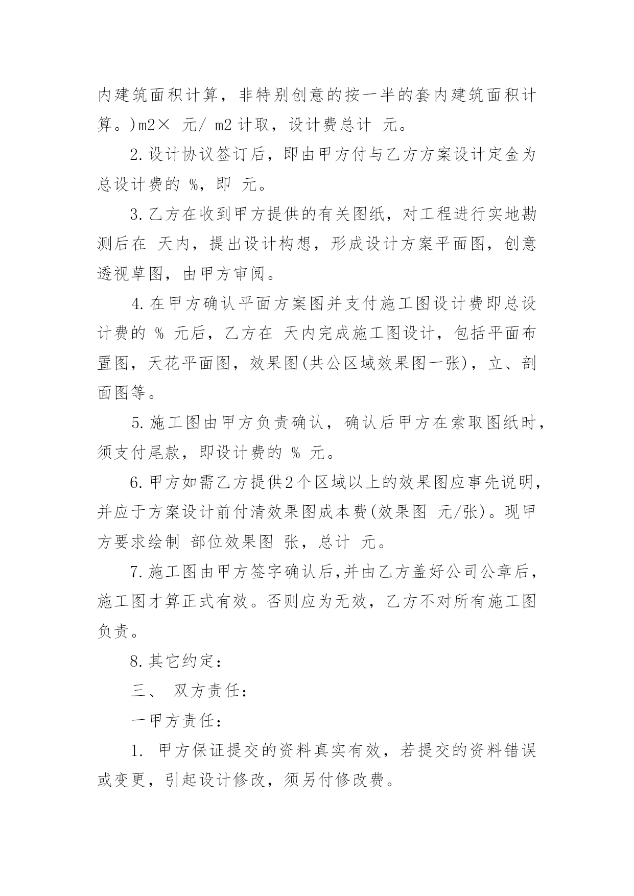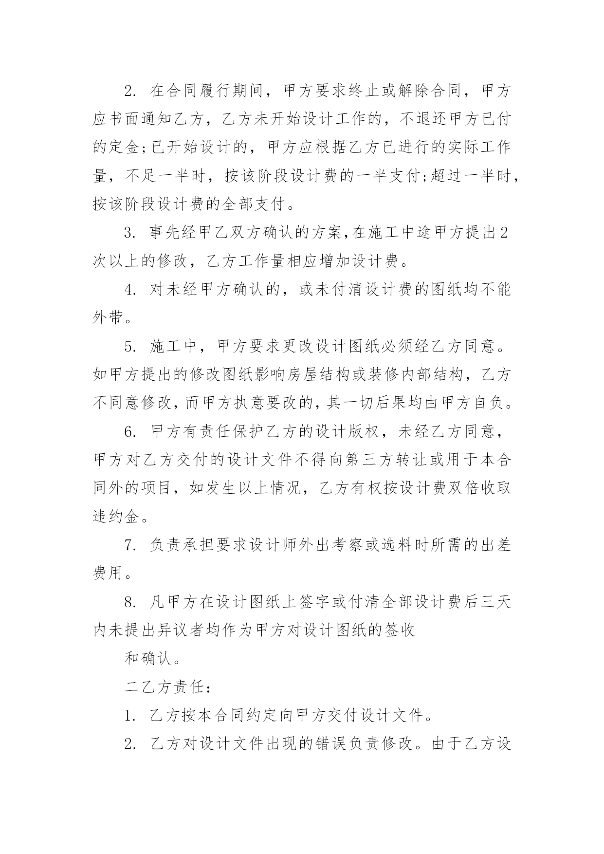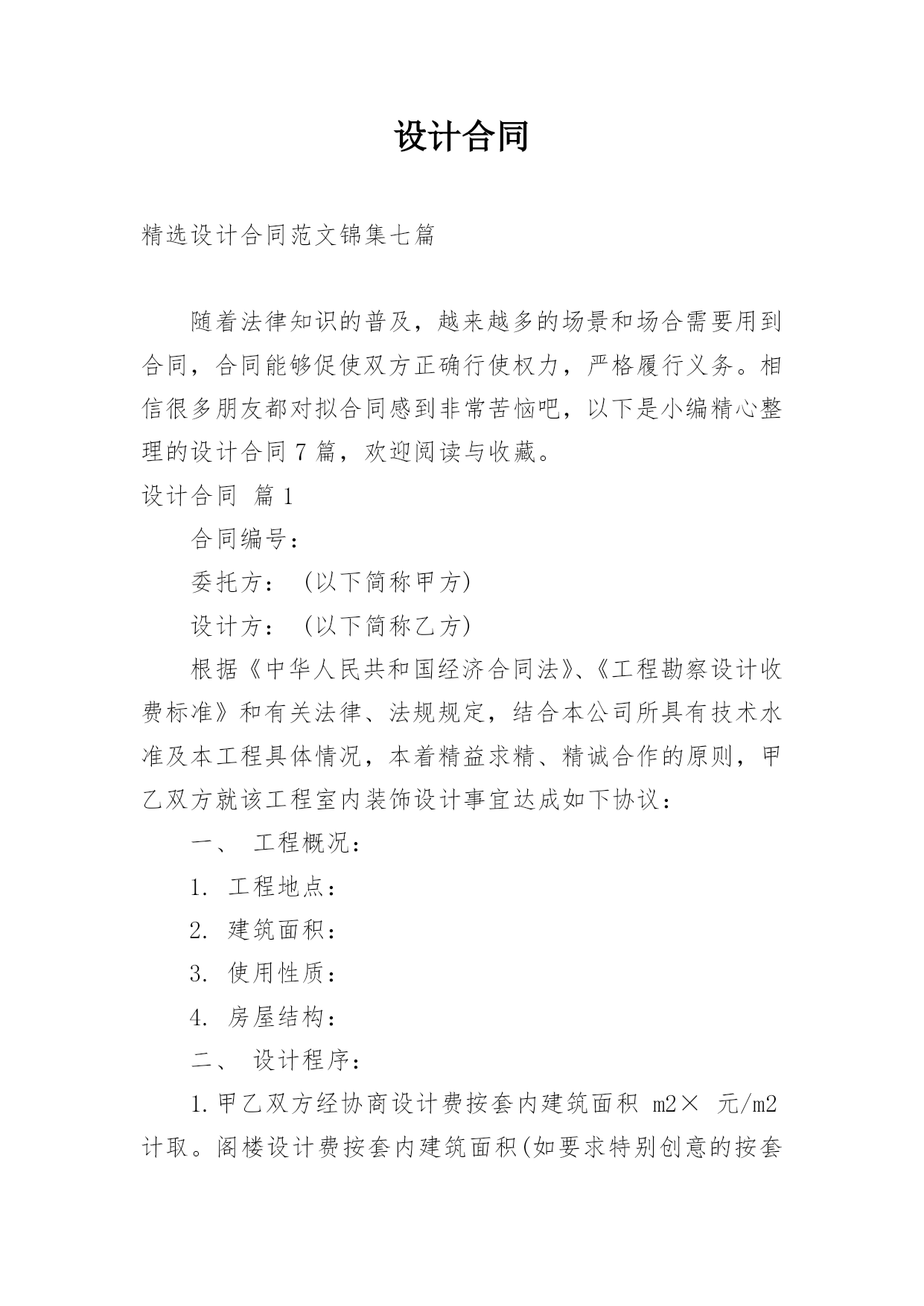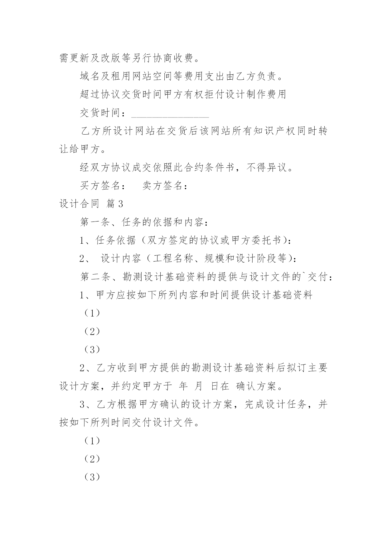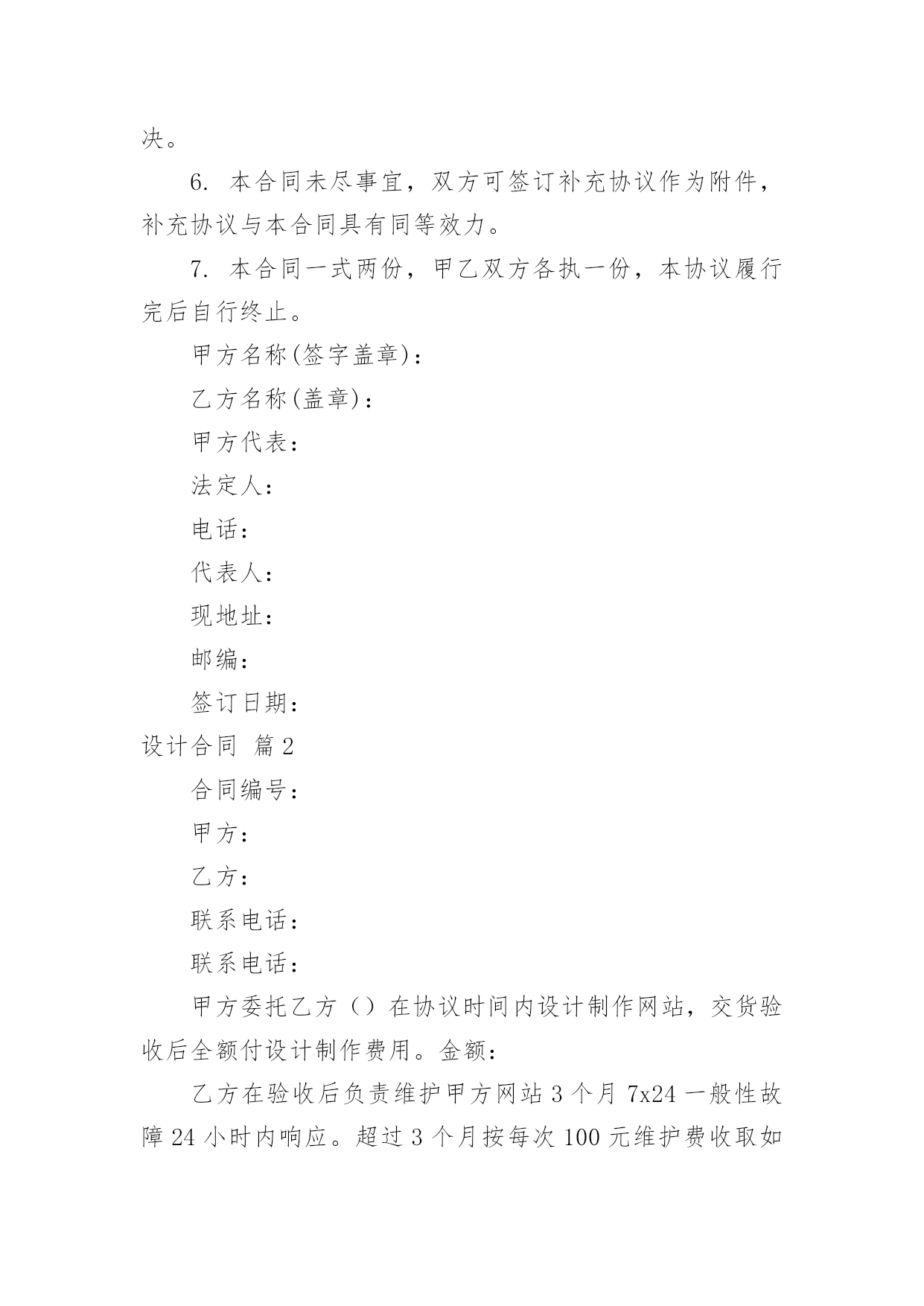 设计合同精选设计合同范文锦集七篇随着法律知识的普及,越来越多的场景和场合需要用到合同,合同能够促使双方正确行使权力,严格履行义务。相信很多朋友都对拟合同感到非常苦恼吧,以下是小编精心整理的设计合同7篇,欢迎阅读与收藏。设计合同篇1合同编号:委托方:(以下简称甲方)设计方:(以下简称乙方)根据《中华人民共和国经济合同法》、《工程勘察设计收费标准》和有关法律、法规规定,结合本公司所具有技术水准及本工程具体情况,本着精益求精、精诚合作的原则,甲乙双方就该工程室内装饰设计事宜达成如下协议:一、工程概况:1.工程地点:2.建筑面积:3.使用性质:4.房屋结构:二、设计程序:1.甲乙双方经协商设计费按套内建筑面积m2×元/m2计取。阁楼设计费按套内建筑面积(如要求特别创意的按套内建筑面积计算,非特别创意的按一半的套内建筑面积计算。)m2×元/m2计取,设计费总计元。2.设计协议签订后,即由甲方付与乙方方案设计定金为总设计费的%,即元。3.乙方在收到甲方提供的有关图纸,对工程进行实地勘测后在天内,提出设计构想,形成设计方案平面图,创意透视草图,由甲方审阅。4.在甲方确认平面方案图并支付施工图设计费即总设计费的%元后,乙方在天内完成施工图设计,包括平面布置图,天花平面图,效果图(共公区域效果图一张),立、剖面图等。5.施工图由甲方负责确认,确认后甲方在索取图纸时,须支付尾款,即设计费的%元。6.甲方如需乙方提供2个区域以上的效果图应事先说明,并应于方案设计前付清效果图成本费(效果图元/张)。现甲方要求绘制部位效果图张,总计元。7.施工图由甲方签字确认后,并由乙方盖好公司公章后,施工图才算正式有效。否则应为无效,乙方不对所有施工图负责。8.其它约定:三、双方责任:一甲方责任:1.甲方保证提交的资料真实有效,若提交的资料错误或变更,引起设计修改,须另付修改费。2.在合同履行期间,甲方要求终止或解除合同,甲方应书面通知乙方,乙方未开始设计工作的,不退还甲方已付的定金;已开始设计的,甲方应根据乙方已进行的实际工作量,不足一半时,按该阶段设计费的一半支付;超过一半时,按该阶段设计费的全部支付。3.事先经甲乙双方确认的方案,在施工中途甲方提出2次以上的修改,乙方工作量相应增加设计费。4.对未经甲方确认的,或未付清设计费的图纸均不能外带。5.施工中,甲方要求更改设计图纸必须经乙方同意。如甲方提出的修改图纸影响房屋结构或装修内部结构,乙方不同意修改,而甲方执意要改的,其一切后果均由甲方自负。6.甲方有责任保护乙方的设计版权,未经乙方同意,甲方对乙方交付的设计文件不得向第三方转让或用于本合同外的项目,如发生以上情况,乙方有权按设计费双倍收取违约金。7.负责承担要求设计师外出考察或选料时所需的出差费用。8.凡甲方在设计图纸上签字或付清全部设计费后三天内未提出异议者均作为甲方对设计图纸的签收和确认。二乙方责任:1.乙方按本合同约定向甲方交付设计文件。2.乙方对设计文件出现的错误负责修改。由于乙方设计错误造成工程质量事故损失,乙方除负责采取补救措施外,应免收受损失部分的设计费。3.合同生效后,乙方要求终止或解除合同,乙方应双倍返还设计定金。4.乙方负责向甲方施工时解释图纸和协助解决技术上的疑难问题。四、其它:1.本合同中所称室内装修设计系解决功能,艺术性的“形”的设计,而不含原有建筑构造的'安全鉴定,及其构造变更后的加固和技术措施。若业主需要应另行委托设计。2.凡本设计在实施前甲方或施工企业均应按规定办理有关审批手续,并应遵循相关规范与要求。若有差异均应以规范或审批结论为准,否则乙方不承担责任。甲方或施工企业在实施前均应与设计师进行图纸交底,凡未会审交底而进入施工所产生的一切问题均与乙方无关。3.如本设计项目非本公司施工的,由于甲方所请施工公司或施工队不理解图纸而需乙方多次到施工现场的,市区内甲方应支付乙方元/次的外出费,市区外甲方应支付乙方元/次的外出费,甲方承担交通费及旅差费。4.对甲方提出的有违反设计规范的建意及要求,乙方有权不予采纳,如甲方要求乙方强制采纳设计的,乙方不承担由此引起的一切后果。5.本合同在履行过程中发生纠纷,委托方与设计方应及时协商解决。协商不成的,可诉请XX市XX区人民法院解决。6.本合同未尽事宜,双方可签订补充协议作为附件,补充协议与本合同具有同等效力。7.本合同一式两份,甲乙双方各执一份,本协议履行完后自行终止。甲方名称(签字盖章):乙方名称(盖章):甲方代表:法定人:电话:代表人:现地址:邮编:签订日期:设计合同篇2合同编号:甲方:乙方:联系电话:联系电话:甲方委托乙方()在协议时间内设计制作网站,交货验收后全额付设计制作费用。金额:乙方在验收后负责维护甲方网站3个月7x24一般性故障24小时内响应。超过3个月按每次100元维护费