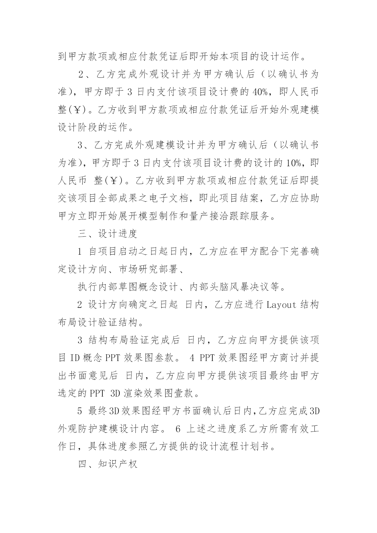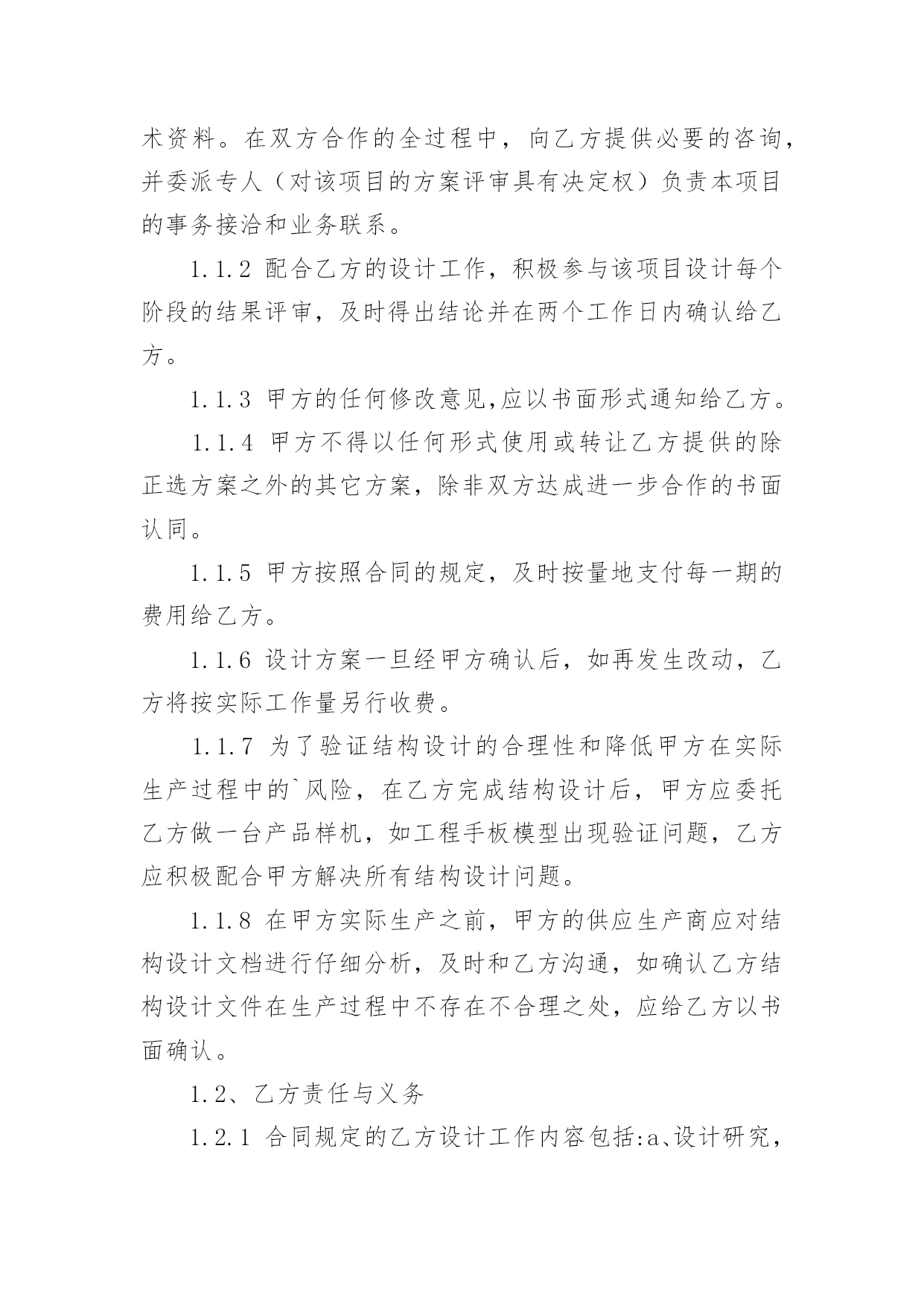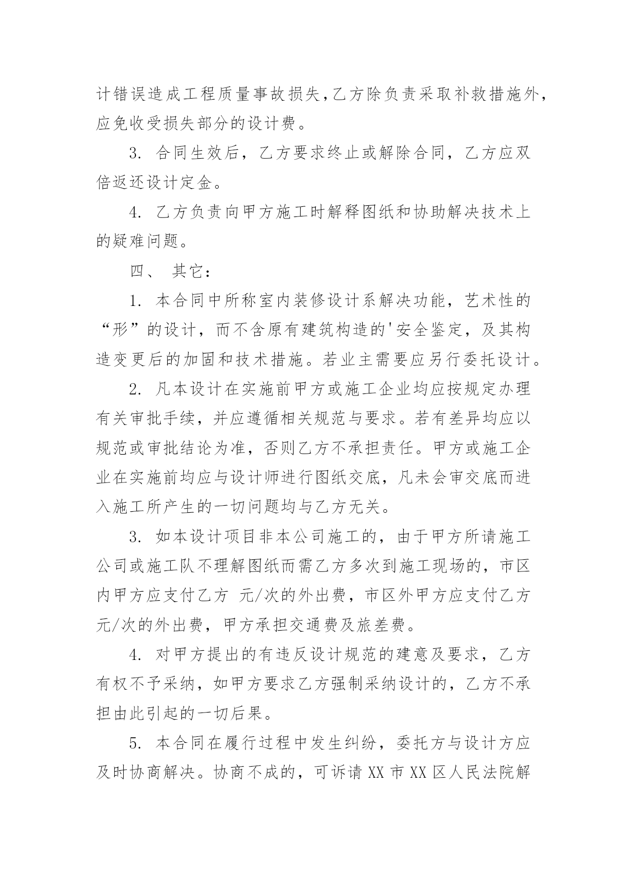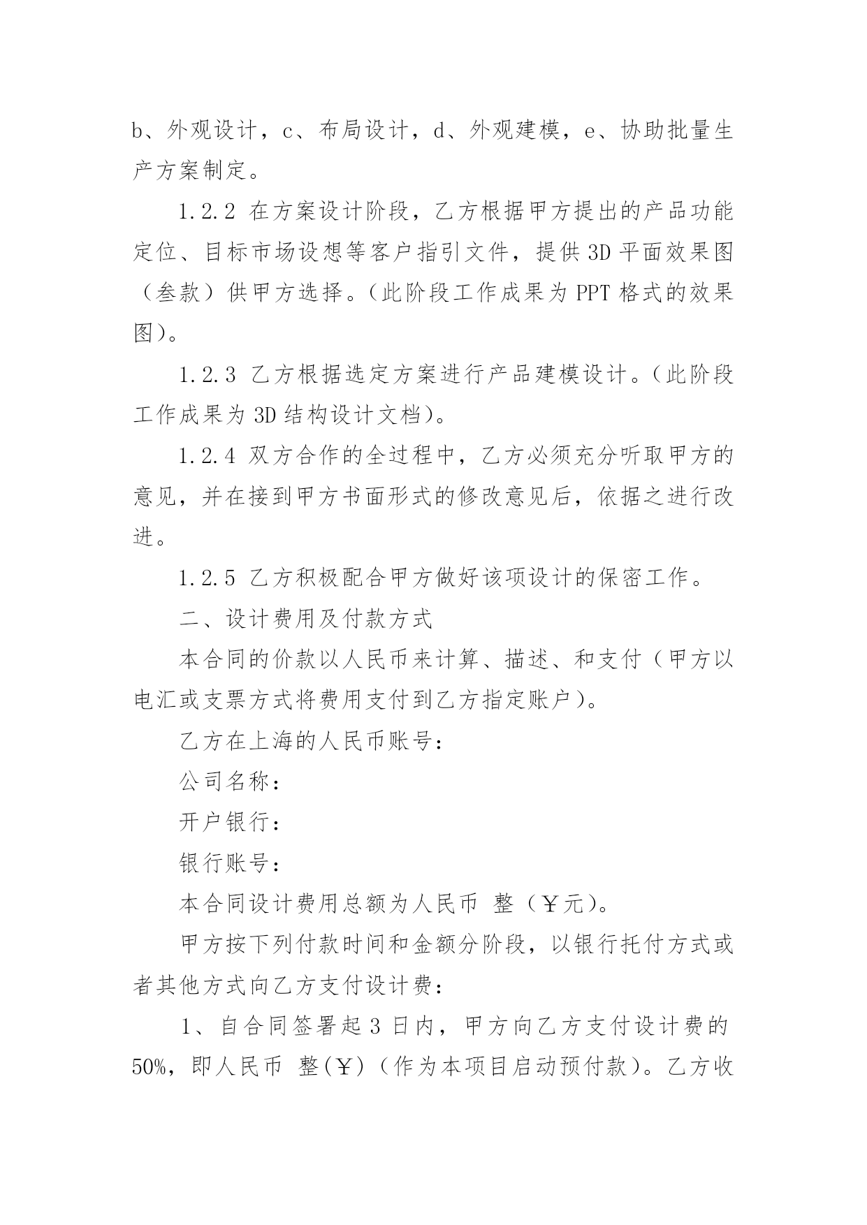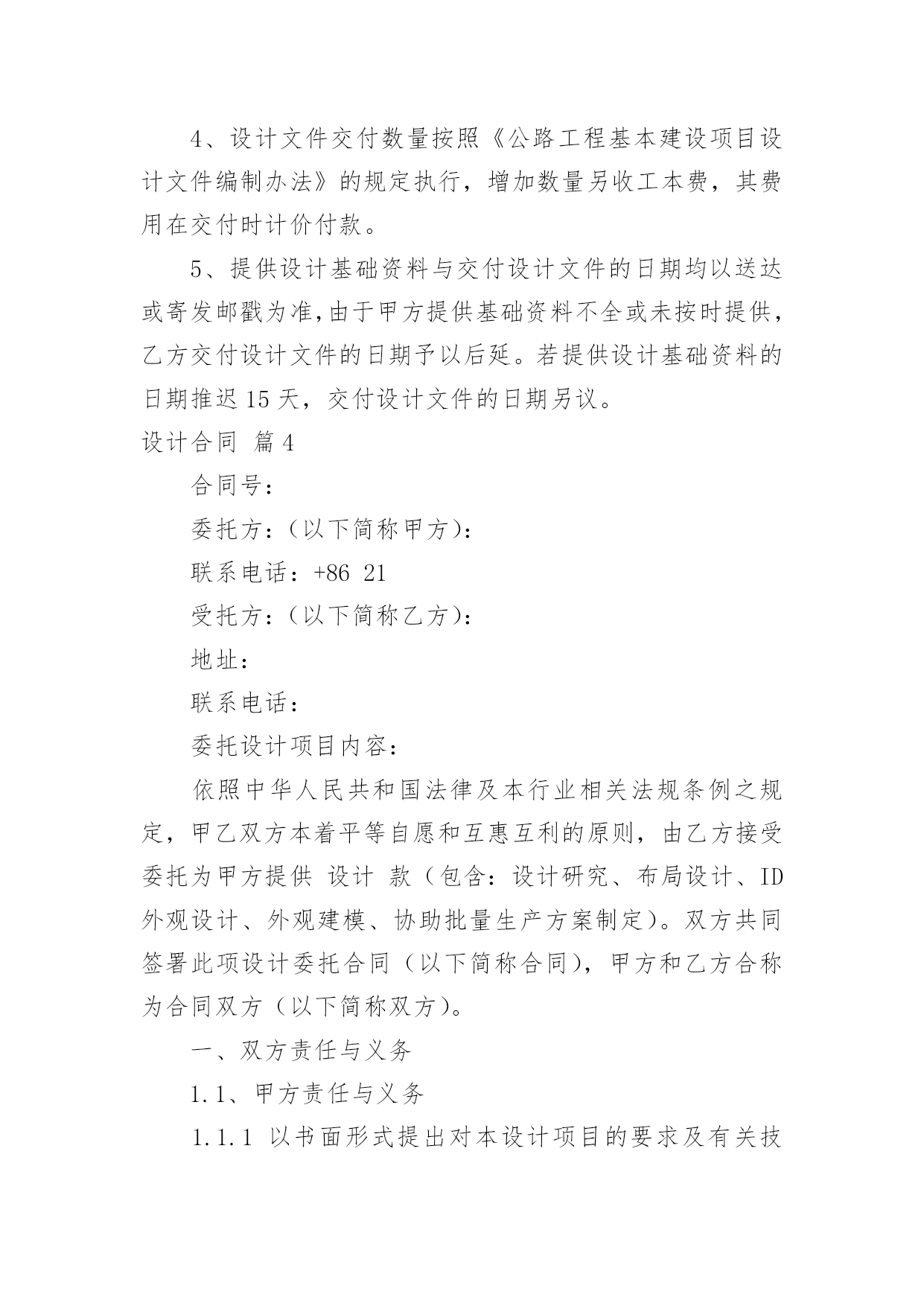 设计合同精选设计合同范文锦集七篇随着法律知识的普及,越来越多的场景和场合需要用到合同,合同能够促使双方正确行使权力,严格履行义务。相信很多朋友都对拟合同感到非常苦恼吧,以下是小编精心整理的设计合同7篇,欢迎阅读与收藏。设计合同篇1合同编号:委托方:(以下简称甲方)设计方:(以下简称乙方)根据《中华人民共和国经济合同法》、《工程勘察设计收费标准》和有关法律、法规规定,结合本公司所具有技术水准及本工程具体情况,本着精益求精、精诚合作的原则,甲乙双方就该工程室内装饰设计事宜达成如下协议:一、工程概况:1.工程地点:2.建筑面积:3.使用性质:4.房屋结构:二、设计程序:1.甲乙双方经协商设计费按套内建筑面积m2×元/m2计取。阁楼设计费按套内建筑面积(如要求特别创意的按套内建筑面积计算,非特别创意的按一半的套内建筑面积计算。)m2×元/m2计取,设计费总计元。2.设计协议签订后,即由甲方付与乙方方案设计定金为总设计费的%,即元。3.乙方在收到甲方提供的有关图纸,对工程进行实地勘测后在天内,提出设计构想,形成设计方案平面图,创意透视草图,由甲方审阅。4.在甲方确认平面方案图并支付施工图设计费即总设计费的%元后,乙方在天内完成施工图设计,包括平面布置图,天花平面图,效果图(共公区域效果图一张),立、剖面图等。5.施工图由甲方负责确认,确认后甲方在索取图纸时,须支付尾款,即设计费的%元。6.甲方如需乙方提供2个区域以上的效果图应事先说明,并应于方案设计前付清效果图成本费(效果图元/张)。现甲方要求绘制部位效果图张,总计元。7.施工图由甲方签字确认后,并由乙方盖好公司公章后,施工图才算正式有效。否则应为无效,乙方不对所有施工图负责。8.其它约定:三、双方责任:一甲方责任:1.甲方保证提交的资料真实有效,若提交的资料错误或变更,引起设计修改,须另付修改费。2.在合同履行期间,甲方要求终止或解除合同,甲方应书面通知乙方,乙方未开始设计工作的,不退还甲方已付的定金;已开始设计的,甲方应根据乙方已进行的实际工作量,不足一半时,按该阶段设计费的一半支付;超过一半时,按该阶段设计费的全部支付。3.事先经甲乙双方确认的方案,在施工中途甲方提出2次以上的修改,乙方工作量相应增加设计费。4.对未经甲方确认的,或未付清设计费的图纸均不能外带。5.施工中,甲方要求更改设计图纸必须经乙方同意。如甲方提出的修改图纸影响房屋结构或装修内部结构,乙方不同意修改,而甲方执意要改的,其一切后果均由甲方自负。6.甲方有责任保护乙方的设计版权,未经乙方同意,甲方对乙方交付的设计文件不得向第三方转让或用于本合同外的项目,如发生以上情况,乙方有权按设计费双倍收取违约金。7.负责承担要求设计师外出考察或选料时所需的出差费用。8.凡甲方在设计图纸上签字或付清全部设计费后三天内未提出异议者均作为甲方对设计图纸的签收和确认。二乙方责任:1.乙方按本合同约定向甲方交付设计文件。2.乙方对设计文件出现的错误负责修改。由于乙方设计错误造成工程质量事故损失,乙方除负责采取补救措施外,应免收受损失部分的设计费。3.合同生效后,乙方要求终止或解除合同,乙方应双倍返还设计定金。4.乙方负责向甲方施工时解释图纸和协助解决技术上的疑难问题。四、其它:1.本合同中所称室内装修设计系解决功能,艺术性的“形”的设计,而不含原有建筑构造的'安全鉴定,及其构造变更后的加固和技术措施。若业主需要应另行委托设计。2.凡本设计在实施前甲方或施工企业均应按规定办理有关审批手续,并应遵循相关规范与要求。若有差异均应以规范或审批结论为准,否则乙方不承担责任。甲方或施工企业在实施前均应与设计师进行图纸交底,凡未会审交底而进入施工所产生的一切问题均与乙方无关。3.如本设计项目非本公司施工的,由于甲方所请施工公司或施工队不理解图纸而需乙方多次到施工现场的,市区内甲方应支付乙方元/次的外出费,市区外甲方应支付乙方元/次的外出费,甲方承担交通费及旅差费。4.对甲方提出的有违反设计规范的建意及要求,乙方有权不予采纳,如甲方要求乙方强制采纳设计的,乙方不承担由此引起的一切后果。5.本合同在履行过程中发生纠纷,委托方与设计方应及时协商解决。协商不成的,可诉请XX市XX区人民法院解决。6.本合同未尽事宜,双方可签订补充协议作为附件,补充协议与本合同具有同等效力。7.本合同一式两份,甲乙双方各执一份,本协议履行完后自行终止。甲方名称(签字盖章):乙方名称(盖章):甲方代表:法定人:电话:代表人:现地址:邮编:签订日期:设计合同篇2合同编号:甲方:乙方:联系电话:联系电话:甲方委托乙方()在协议时间内设计制作网站,交货验收后全额付设计制作费用。金额:乙方在验收后负责维护甲方网站3个月7x24一般性故障24小时内响应。超过3个月按每次100元维护费