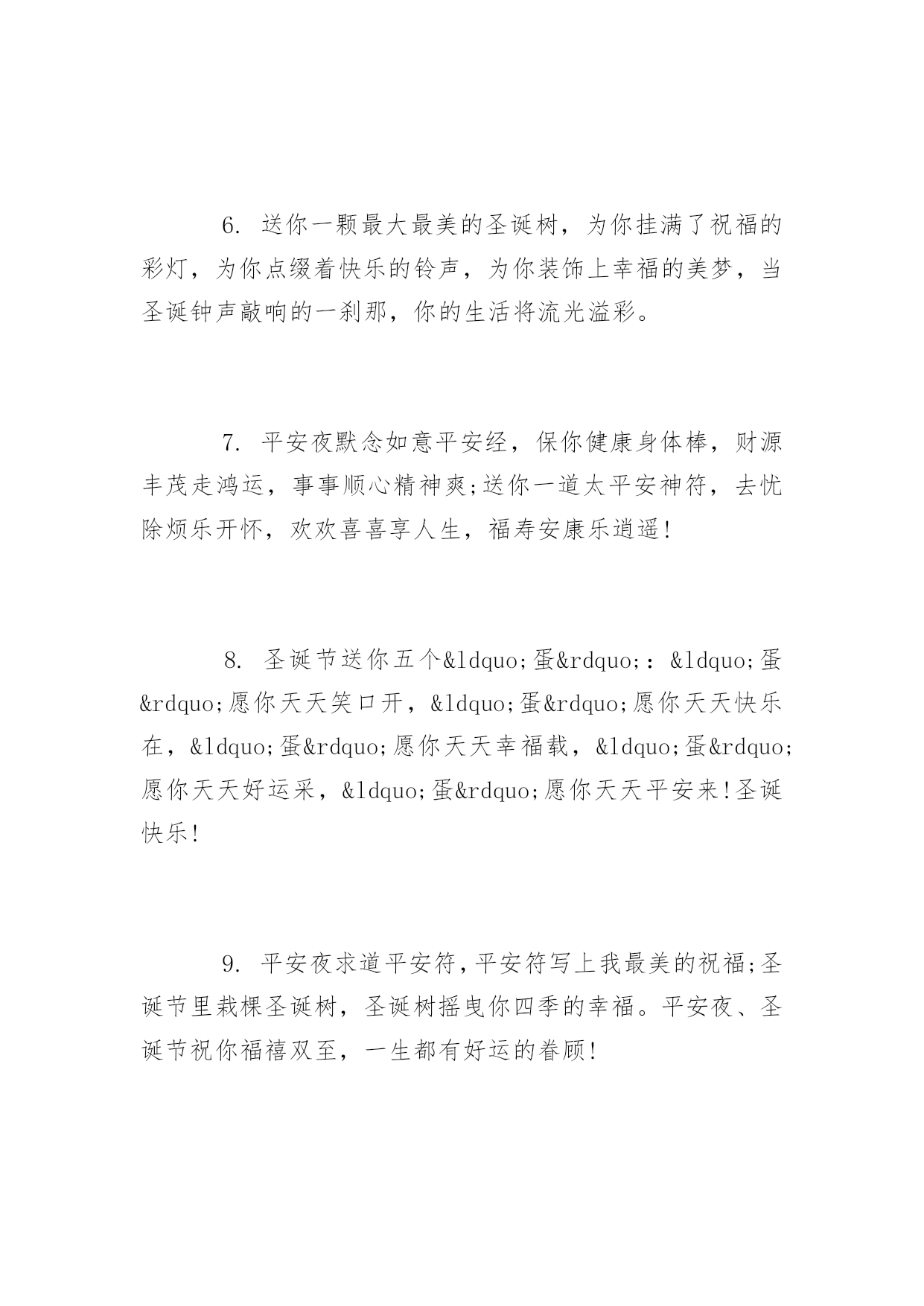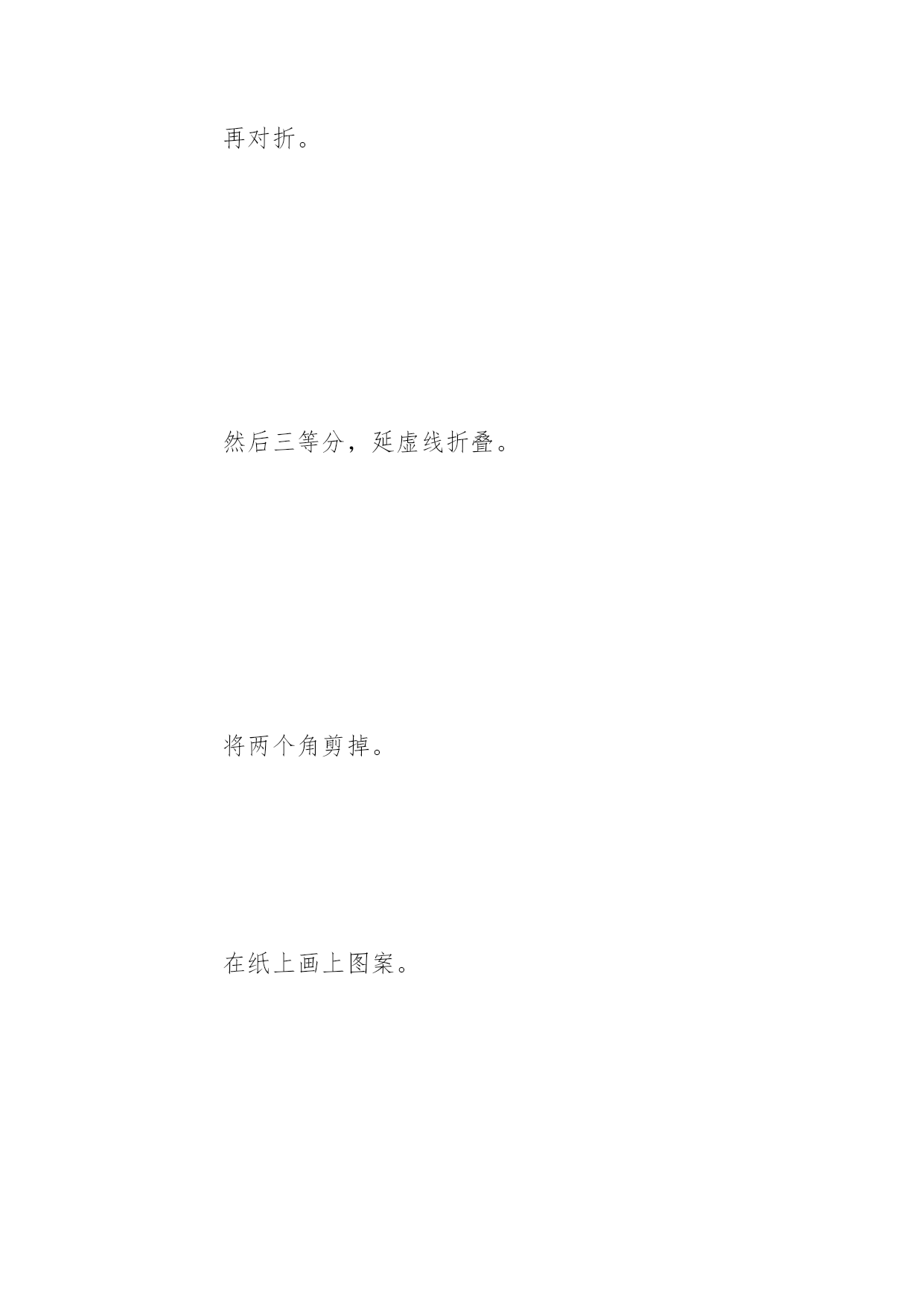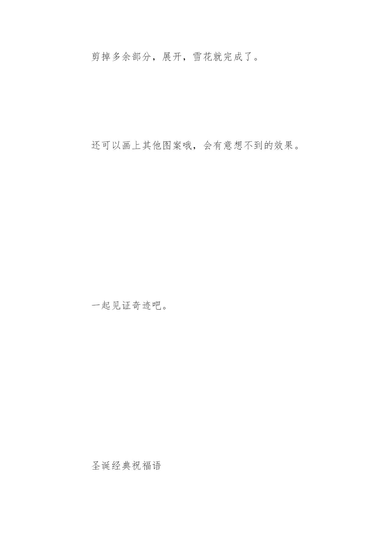 圣诞雪花的手工剪纸教程图解圣诞雪花的手工剪纸教程图解圣诞节就要到了,赶快动手和孩子一起制作圣诞雪花,装饰圣诞节。小编为大家力荐了圣诞雪花的手工剪纸方法,给大家作为参考,希望能帮到大家!圣诞雪花的手工剪纸材料纸剪刀圣诞雪花的手工剪纸方法选择一张比较薄的正方形纸片,延虚线对折。再对折。然后三等分,延虚线折叠。将两个角剪掉。在纸上画上图案。剪掉多余部分,展开,雪花就完成了。还可以画上其他图案哦,会有意想不到的效果。一起见证奇迹吧。圣诞经典祝福语1.这条短信由圣诞老人负责创作,由快乐负责编写,由幸福负责发送,由幸运负责传递,由我负责投资,提前送到你的手机,愿你平安夜平安,圣诞节愉快!2.真快;圣诞的钟声又在耳边响起;真想和你在一起享受这醉人的气氛;今晚我会同前几个不曾与你共度的圣诞夜一样;静静地;用一整晚的时间来思念你!3.平安夜满天星,是我求圣诞老公公给你的祝福。当每一丝星光接触到你的眼光,都将化作轻柔的情呵护你甜梦到天明!愿你度过一个快乐的`圣诞节!4.平淡是真,平静是情,平坦是路,平缓是心,平安是福。平安夜来了,用平平常常的文字送去我真真切切的祝福。愿你收入平稳上升,事业平步青云!5.平安夜了,我买不起什么贵重的礼物送你,只好托付圣诞老人把我的心送去给你,你收到后要好好保存啊,那可是我的一颗真心。宝贝,平安夜快乐!6.送你一颗最大最美的圣诞树,为你挂满了祝福的彩灯,为你点缀着快乐的铃声,为你装饰上幸福的美梦,当圣诞钟声敲响的一刹那,你的生活将流光溢彩。7.平安夜默念如意平安经,保你健康身体棒,财源丰茂走鸿运,事事顺心精神爽;送你一道太平安神符,去忧除烦乐开怀,欢欢喜喜享人生,福寿安康乐逍遥!8.圣诞节送你五个“蛋”:“蛋”愿你天天笑口开,“蛋”愿你天天快乐在,“蛋”愿你天天幸福载,“蛋”愿你天天好运采,“蛋”愿你天天平安来!圣诞快乐!9.平安夜求道平安符,平安符写上我最美的祝福;圣诞节里栽棵圣诞树,圣诞树摇曳你四季的幸福。平安夜、圣诞节祝你福禧双至,一生都有好运的眷顾!10.老师者,所以传道授业解惑也;生者,所以求知学习拼搏也;圣诞节,所以祝福感激呈现也:愿老师每天开心,桃李天下;教书育人,自得其乐;馨德永流传!