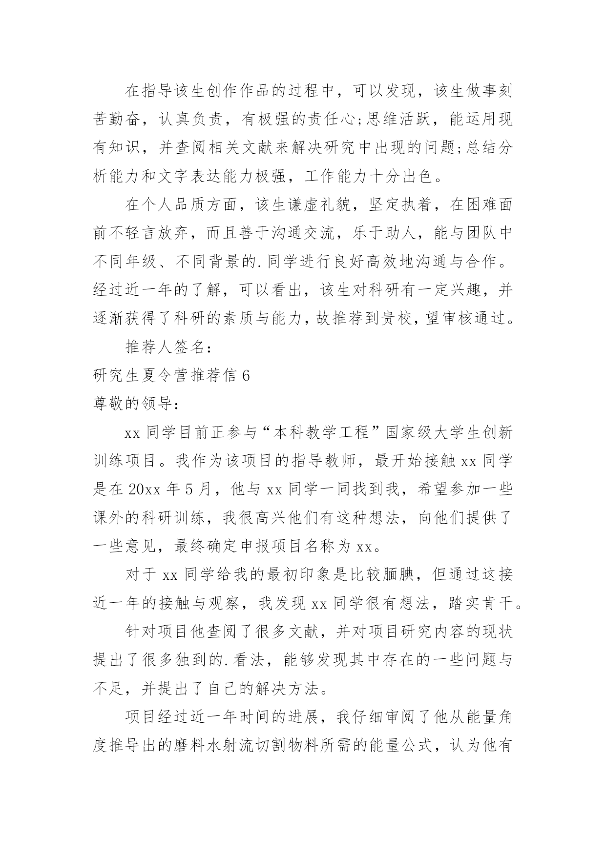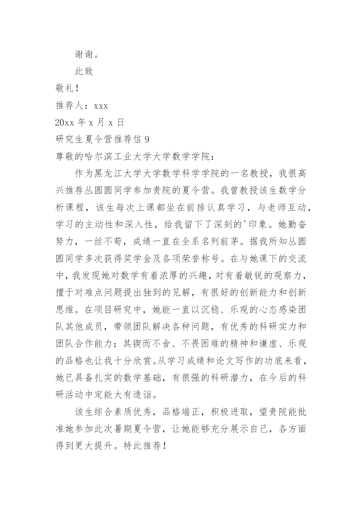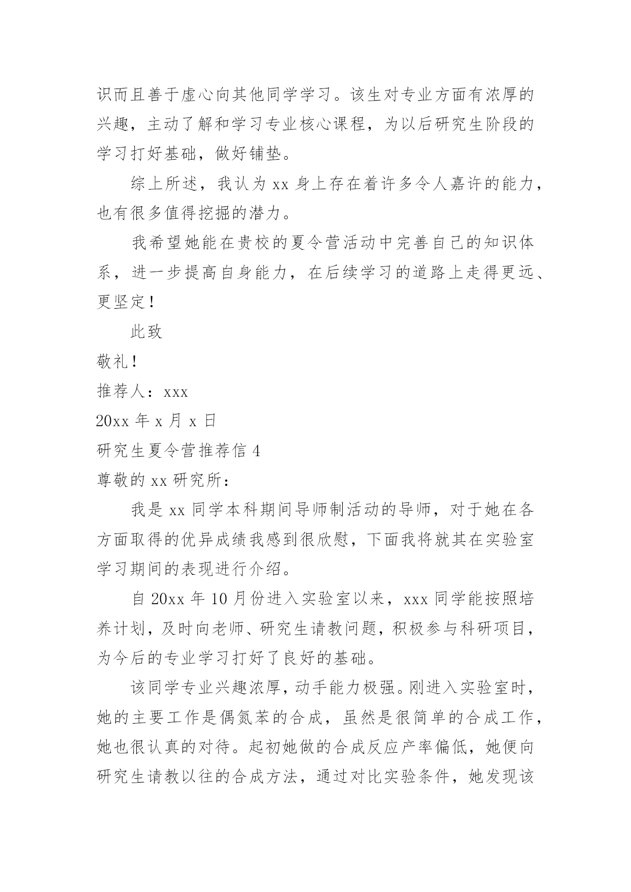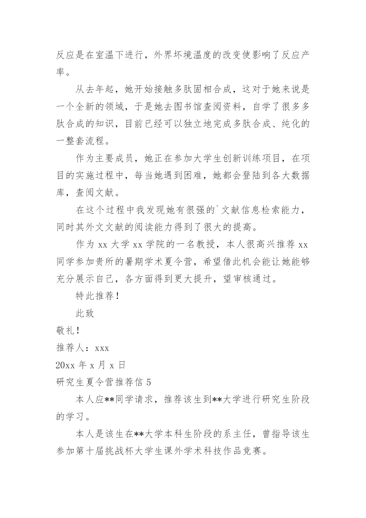研究生夏令营推荐信研究生夏令营推荐信在经济飞速发展的今天,在很多情况下我们需要用到推荐信,一封好的推荐信能为申请人加分。相信写推荐信是一个让许多人都头痛的问题,下面是小编为大家整理的研究生夏令营推荐信,欢迎大家分享。研究生夏令营推荐信1作为xx大学xx学院一名教授,本人很高兴推荐xx同学参加贵所的学术夏令营。xx同学于xx年9月进行大学的学习,学习成绩一直非常优秀,在专业名列前茅。本人曾于该生本科阶段的学习中,担任其xx,xx课程的授课教师。在此过程中,我发现该生有扎实的专业知识,并能灵活运用所学的基本理论知识,自主学习能力强,善于接受新生事物,思维敏捷,勤于思考,善于提问,能够虚心接受各方面的意见但又不失自己独立思考的能力。除了学习专业基础知识外,该生还积极参与并主持了本科生创新训练计划项目,利用课余时间来完成这个创新实验,不仅学到了相关理论知识,熟悉了实验过程中的基本操作,而且逐渐培养出了对待科学与研究应有的严谨、踏实的专业素质。在与该生的课内、课外频繁的接触中,我发现了她在个人品质方面的优秀表现。一方面她很乐观,善于交流,有良好的总结分析能力和文字表达能力,思维活跃,想法独到。另一方面她有良好的`个人素质修养、积极进取的生活态度、谦虚有礼的为人处世态度以及诚实正直的个人品德,深获师生的一致肯定,这样的人格对于学术研究无疑是有很大帮助的。可以看出,xx同学综合表现突出,对物理有浓厚兴趣,有相当好的科研潜质和培养前景,且具有细致严谨的科研态度,故推荐到贵校,望审核通过。此致敬礼!推荐人:xxxxxx年xx月xx日研究生夏令营推荐信2作为黑龙江大学数学科学学院学院一名教授,本人很高兴推荐丛圆圆同学参加贵院的夏令营。丛圆圆同学于20xx年9月进行大学的学习,在学习中,她勤奋努力,一丝不苟,成绩一直在全系名列前茅。我发现该生有扎实的专业知识,并能灵活运用所学的基本理论知识,自主学习能力强,善于接受新生事物,思维敏捷,勤于思考,善于提问,能够虚心接受各方面的意见但又不失自己独立思考的能力。我与该生在课下经常交流一些课堂中的重难点知识和其他生活中的事。通过交流,我发现了她在个人品质方面的表现优秀。一方面她很乐观,善于交流,有良好的总结分析能力和文字表达能力,思维活跃,想法独到。另一方面她有良好的个人素质修养、积极进取的.生活态度、谦虚有礼的为人处世态度以及诚实正直的个人品德,深获师生的一致肯定,这样的人格对于学术研究无疑是有很大帮助的。可以看出,丛圆圆同学综合表现突出,对数学有浓厚兴趣,有相当好的科研潜质和培养前景,且具有细致严谨的科研态度,故予以推荐,望审核通过。此致敬礼!推荐人:xxxxxx年xx月xx日研究生夏令营推荐信3夏令营组委会:您好!我是xx大学xx学院的xx,本人很高兴推荐xx专业的xx同学参加贵校xx年的暑期夏令营,希望该生后期能成功攻读贵校研究生。现在我担任了该同学本科阶段的《》和《》课程的'教学,该生在相应课程考核中获得满意的成绩:分。日常交流接触发现该生思想端,正为人谦虚,大一以优异的成绩转来我们专业,学业上孜孜不倦,踏实学习,连续两年为专业第一。在我指导的实验课程中,该生积极思考,发现问题,解决问题,与其他同学共同学习时,表现出很好的团队合作意识而且善于虚心向其他同学学习。该生对专业方面有浓厚的兴趣,主动了解和学习专业核心课程,为以后研究生阶段的学习打好基础,做好铺垫。综上所述,我认为xx身上存在着许多令人嘉许的能力,也有很多值得挖掘的潜力。我希望她能在贵校的夏令营活动中完善自己的知识体系,进一步提高自身能力,在后续学习的道路上走得更远、更坚定!此致敬礼!推荐人:xxx20xx年x月x日研究生夏令营推荐信4尊敬的xx研究所:我是xx同学本科期间导师制活动的导师,对于她在各方面取得的优异成绩我感到很欣慰,下面我将就其在实验室学习期间的表现进行介绍。自20xx年10月份进入实验室以来,xxx同学能按照培养计划,及时向老师、研究生请教问题,积极参与科研项目,为今后的专业学习打好了良好的基础。该同学专业兴趣浓厚,动手能力极强。刚进入实验室时,她的主要工作是偶氮苯的合成,虽然是很简单的合成工作,她也很认真的对待。起初她做的合成反应产率偏低,她便向研究生请教以往的合成方法,通过对比实验条件,她发现该反应是在室温下进行,外界坏境温度的改变使影响了反应产率。从去年起,她开始接触多肽固相合成,这对于她来说是一个全新的领域,于是她去图书馆查阅资料,自学了很多多肽合成的知识,目前已经可以独立地完成多肽合成、纯化的一整套流程。作为主要成员,她正在参加大学生创新训练项目,在项目的实施过程中,每当她遇到困难,她都会登陆到各大数据库,查阅文献。在这个过程中我发现她有很强的`文献信息检索能力,同时其外文文献的阅读能力得到了很大的提高。作