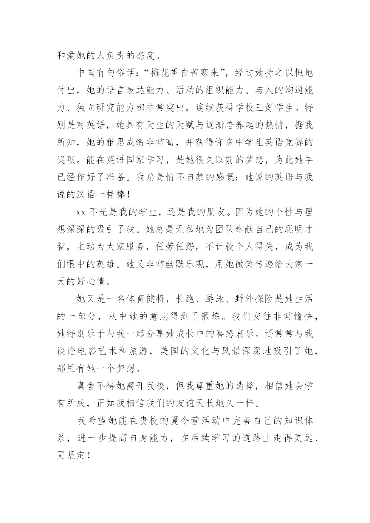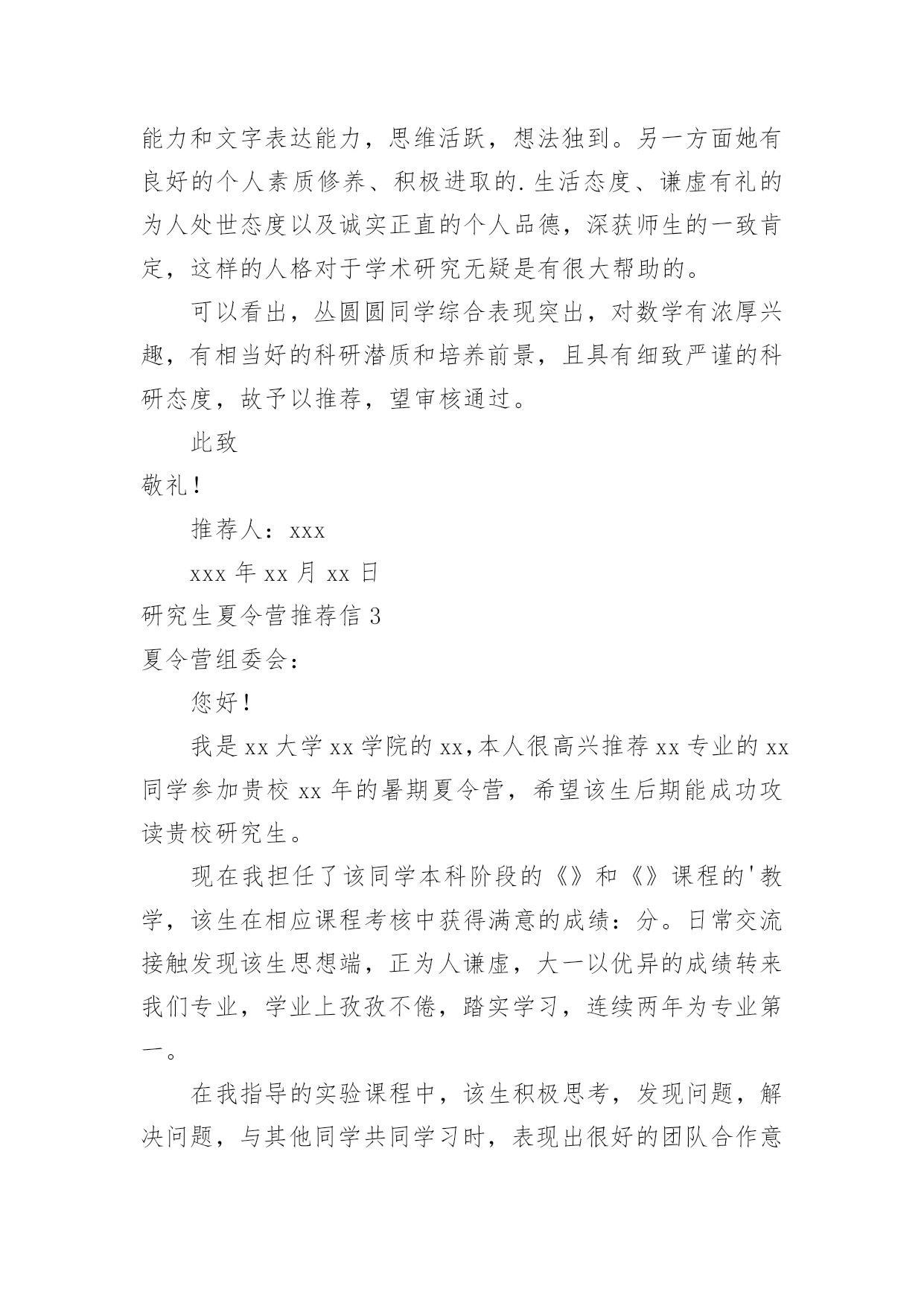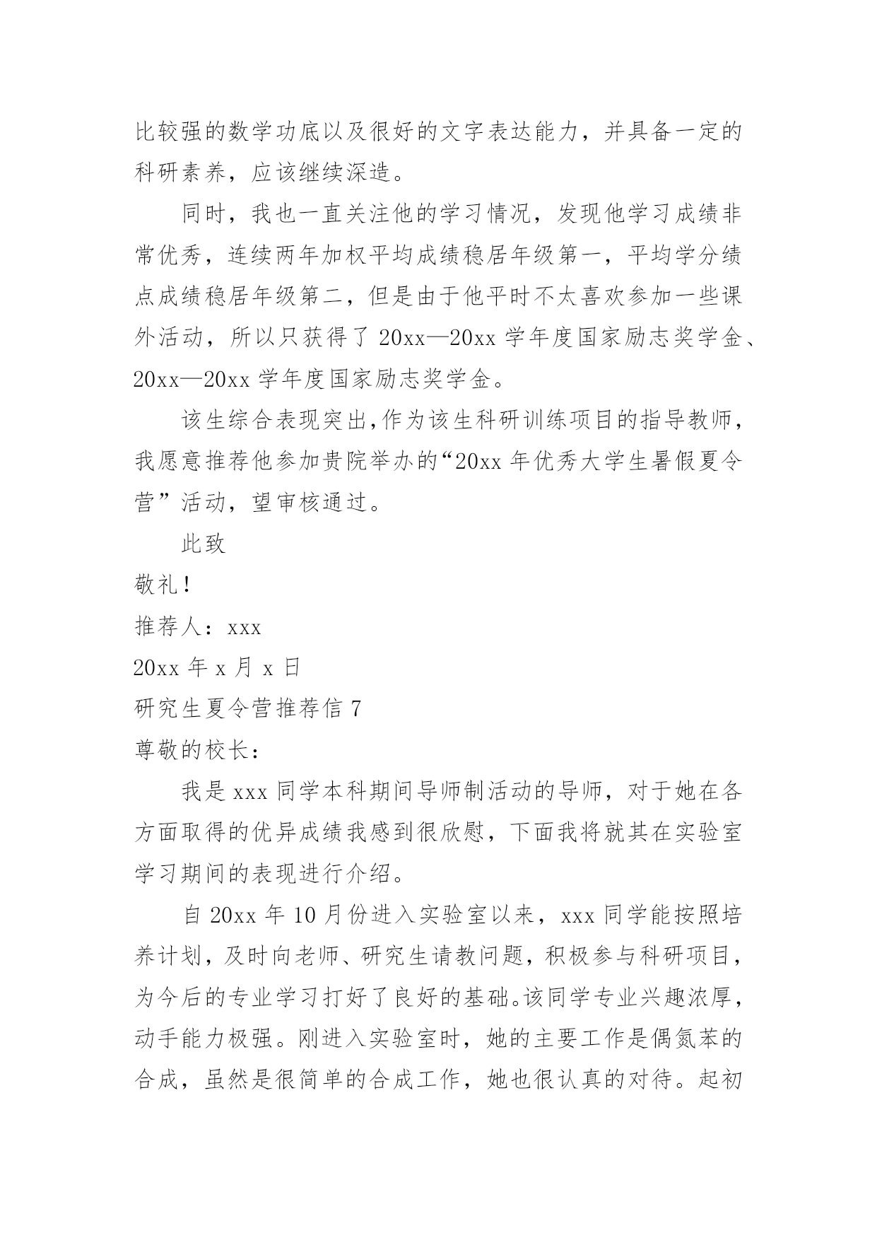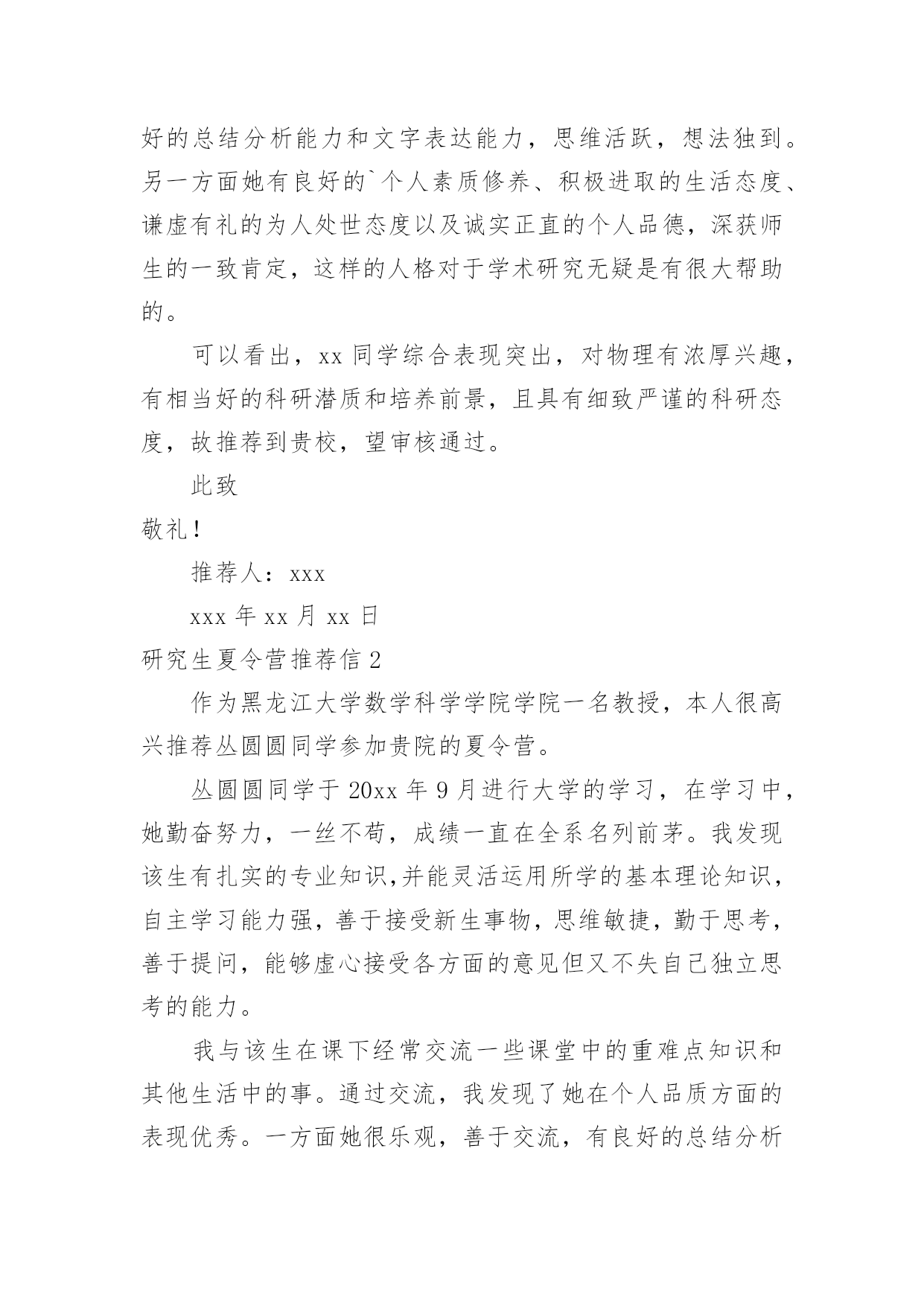 研究生夏令营推荐信研究生夏令营推荐信在经济飞速发展的今天,在很多情况下我们需要用到推荐信,一封好的推荐信能为申请人加分。相信写推荐信是一个让许多人都头痛的问题,下面是小编为大家整理的研究生夏令营推荐信,欢迎大家分享。研究生夏令营推荐信1作为xx大学xx学院一名教授,本人很高兴推荐xx同学参加贵所的学术夏令营。xx同学于xx年9月进行大学的学习,学习成绩一直非常优秀,在专业名列前茅。本人曾于该生本科阶段的学习中,担任其xx,xx课程的授课教师。在此过程中,我发现该生有扎实的专业知识,并能灵活运用所学的基本理论知识,自主学习能力强,善于接受新生事物,思维敏捷,勤于思考,善于提问,能够虚心接受各方面的意见但又不失自己独立思考的能力。除了学习专业基础知识外,该生还积极参与并主持了本科生创新训练计划项目,利用课余时间来完成这个创新实验,不仅学到了相关理论知识,熟悉了实验过程中的基本操作,而且逐渐培养出了对待科学与研究应有的严谨、踏实的专业素质。在与该生的课内、课外频繁的接触中,我发现了她在个人品质方面的优秀表现。一方面她很乐观,善于交流,有良好的总结分析能力和文字表达能力,思维活跃,想法独到。另一方面她有良好的`个人素质修养、积极进取的生活态度、谦虚有礼的为人处世态度以及诚实正直的个人品德,深获师生的一致肯定,这样的人格对于学术研究无疑是有很大帮助的。可以看出,xx同学综合表现突出,对物理有浓厚兴趣,有相当好的科研潜质和培养前景,且具有细致严谨的科研态度,故推荐到贵校,望审核通过。此致敬礼!推荐人:xxxxxx年xx月xx日研究生夏令营推荐信2作为黑龙江大学数学科学学院学院一名教授,本人很高兴推荐丛圆圆同学参加贵院的夏令营。丛圆圆同学于20xx年9月进行大学的学习,在学习中,她勤奋努力,一丝不苟,成绩一直在全系名列前茅。我发现该生有扎实的专业知识,并能灵活运用所学的基本理论知识,自主学习能力强,善于接受新生事物,思维敏捷,勤于思考,善于提问,能够虚心接受各方面的意见但又不失自己独立思考的能力。我与该生在课下经常交流一些课堂中的重难点知识和其他生活中的事。通过交流,我发现了她在个人品质方面的表现优秀。一方面她很乐观,善于交流,有良好的总结分析能力和文字表达能力,思维活跃,想法独到。另一方面她有良好的个人素质修养、积极进取的.生活态度、谦虚有礼的为人处世态度以及诚实正直的个人品德,深获师生的一致肯定,这样的人格对于学术研究无疑是有很大帮助的。可以看出,丛圆圆同学综合表现突出,对数学有浓厚兴趣,有相当好的科研潜质和培养前景,且具有细致严谨的科研态度,故予以推荐,望审核通过。此致敬礼!推荐人:xxxxxx年xx月xx日研究生夏令营推荐信3夏令营组委会:您好!我是xx大学xx学院的xx,本人很高兴推荐xx专业的xx同学参加贵校xx年的暑期夏令营,希望该生后期能成功攻读贵校研究生。现在我担任了该同学本科阶段的《》和《》课程的'教学,该生在相应课程考核中获得满意的成绩:分。日常交流接触发现该生思想端,正为人谦虚,大一以优异的成绩转来我们专业,学业上孜孜不倦,踏实学习,连续两年为专业第一。在我指导的实验课程中,该生积极思考,发现问题,解决问题,与其他同学共同学习时,表现出很好的团队合作意识而且善于虚心向其他同学学习。该生对专业方面有浓厚的兴趣,主动了解和学习专业核心课程,为以后研究生阶段的学习打好基础,做好铺垫。综上所述,我认为xx身上存在着许多令人嘉许的能力,也有很多值得挖掘的潜力。我希望她能在贵校的夏令营活动中完善自己的知识体系,进一步提高自身能力,在后续学习的道路上走得更远、更坚定!此致敬礼!推荐人:xxx20xx年x月x日研究生夏令营推荐信4尊敬的xx研究所:我是xx同学本科期间导师制活动的导师,对于她在各方面取得的优异成绩我感到很欣慰,下面我将就其在实验室学习期间的表现进行介绍。自20xx年10月份进入实验室以来,xxx同学能按照培养计划,及时向老师、研究生请教问题,积极参与科研项目,为今后的专业学习打好了良好的基础。该同学专业兴趣浓厚,动手能力极强。刚进入实验室时,她的主要工作是偶氮苯的合成,虽然是很简单的合成工作,她也很认真的对待。起初她做的合成反应产率偏低,她便向研究生请教以往的合成方法,通过对比实验条件,她发现该反应是在室温下进行,外界坏境温度的改变使影响了反应产率。从去年起,她开始接触多肽固相合成,这对于她来说是一个全新的领域,于是她去图书馆查阅资料,自学了很多多肽合成的知识,目前已经可以独立地完成多肽合成、纯化的一整套流程。作为主要成员,她正在参加大学生创新训练项目,在项目的实施过程中,每当她遇到困难,她都会登陆到各大数据库,查阅文献。在这个过程中我发现她有很强的`文献信息检索能力,同时其外文文献的阅读能力得到了很大的提高。作