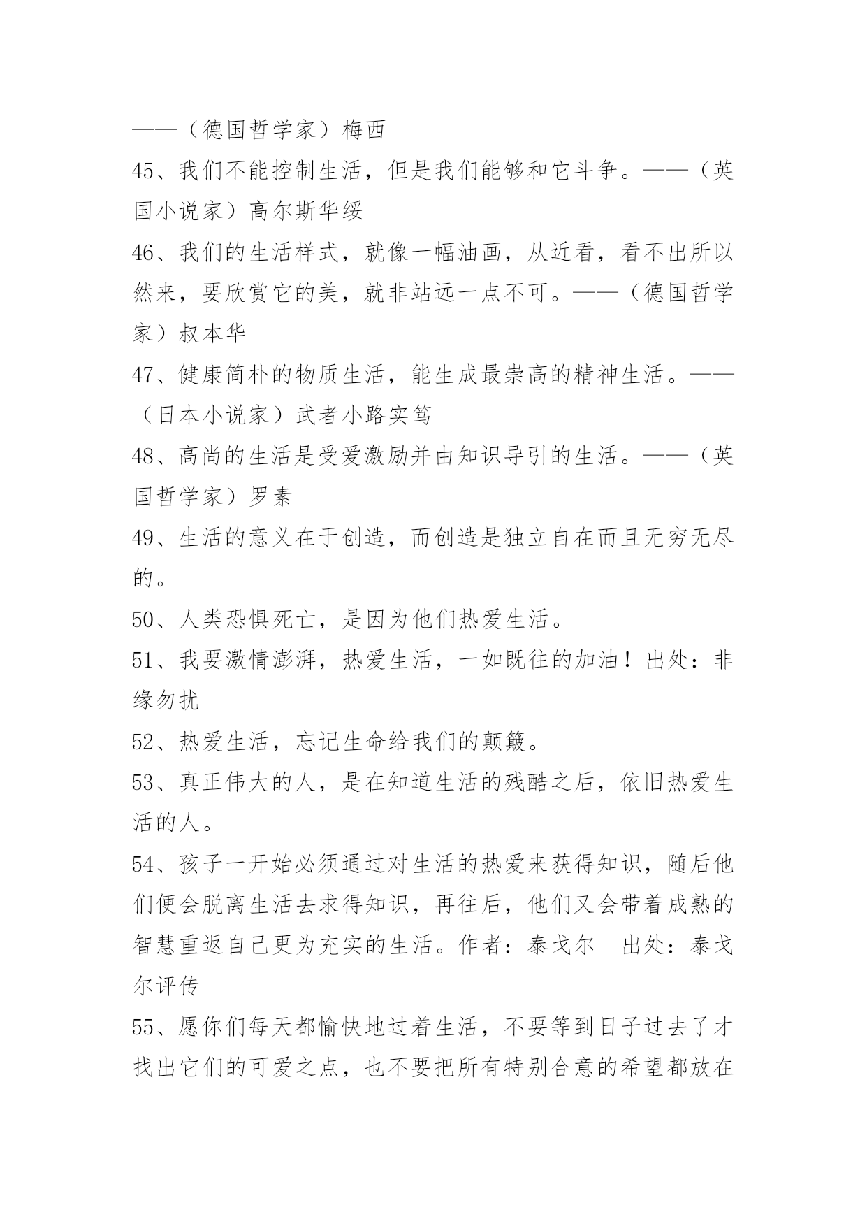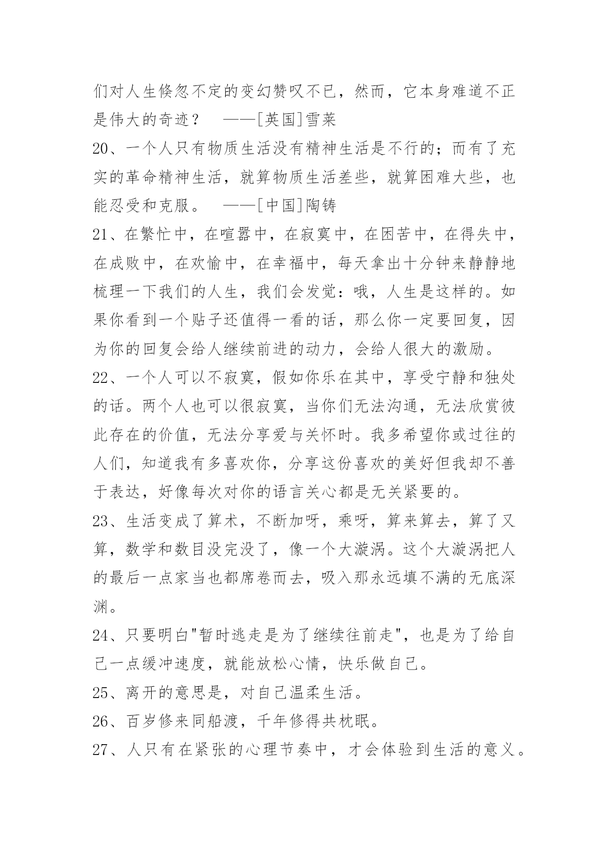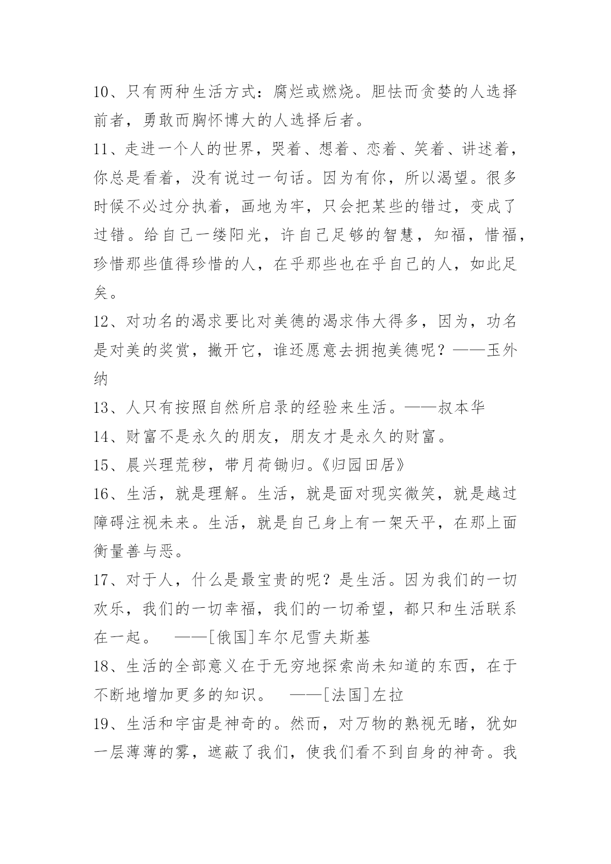 生活名言名句2024年生活名言名句汇总73句每一天睁开眼,我们都是蜉蝣,平平凡凡生活,轰轰烈烈的,追逐一个梦。下面是小编精心整理的生活名言名句73句,仅供参考,大家一起来看看吧。1、正确的人生目标,对每个人何等重要。2、日莲只开在阳光里,夜荷只开在月光下。能抑制情欲的人不搂抱别人的老婆——印度3、即使是智者,也难摈弃追求功名这个弱点。——塔西佗4、俭朴的生活,不但可使精神愉快,而且可以培养革命品质。5、你不得不随遇而安,但是,你应该努力按照你向往的方式去生活。——坎贝尔6、与其说小说好像是生活,不如说生活就像是小说。7、快看,树木在生长,那是它在享受阳光带给他的滋养,雄鹰在展翅,那是它在享受蓝天带给它的辽阔,水滴在流动,那是它在享受风儿带给他的自由——我们要学会享受生活。感触生活,这样我们的内心才会充满阳光。8、假如生活欺骗了你,不要忧郁,也不要愤慨!不顺心的时候暂且容忍:相信吧,欢乐的日子就会到来。——普希金《普希金抒情诗》9、快于意者云于行。——《燕丹子》10、只有两种生活方式:腐烂或燃烧。胆怯而贪婪的人选择前者,勇敢而胸怀博大的人选择后者。11、走进一个人的世界,哭着、想着、恋着、笑着、讲述着,你总是看着,没有说过一句话。因为有你,所以渴望。很多时候不必过分执着,画地为牢,只会把某些的错过,变成了过错。给自己一缕阳光,许自己足够的智慧,知福,惜福,珍惜那些值得珍惜的人,在乎那些也在乎自己的人,如此足矣。12、对功名的渴求要比对美德的渴求伟大得多,因为,功名是对美的奖赏,撇开它,谁还愿意去拥抱美德呢?——玉外纳13、人只有按照自然所启录的经验来生活。——叔本华14、财富不是永久的朋友,朋友才是永久的财富。15、晨兴理荒秽,带月荷锄归。《归园田居》16、生活,就是理解。生活,就是面对现实微笑,就是越过障碍注视未来。生活,就是自己身上有一架天平,在那上面衡量善与恶。17、对于人,什么是最宝贵的呢?是生活。因为我们的一切欢乐,我们的一切幸福,我们的一切希望,都只和生活联系在一起。——[俄国]车尔尼雪夫斯基18、生活的全部意义在于无穷地探索尚未知道的东西,在于不断地增加更多的知识。——[法国]左拉19、生活和宇宙是神奇的。然而,对万物的熟视无睹,犹如一层薄薄的雾,遮蔽了我们,使我们看不到自身的神奇。我们对人生倏忽不定的变幻赞叹不已,然而,它本身难道不正是伟大的奇迹?——[英国]雪莱20、一个人只有物质生活没有精神生活是不行的;而有了充实的革命精神生活,就算物质生活差些,就算困难大些,也能忍受和克服。——[中国]陶铸21、在繁忙中,在喧嚣中,在寂寞中,在困苦中,在得失中,在成败中,在欢愉中,在幸福中,每天拿出十分钟来静静地梳理一下我们的人生,我们会发觉:哦,人生是这样的。如果你看到一个贴子还值得一看的话,那么你一定要回复,因为你的回复会给人继续前进的动力,会给人很大的激励。22、一个人可以不寂寞,假如你乐在其中,享受宁静和独处的话。两个人也可以很寂寞,当你们无法沟通,无法欣赏彼此存在的价值,无法分享爱与关怀时。我多希望你或过往的人们,知道我有多喜欢你,分享这份喜欢的美好但我却不善于表达,好像每次对你的语言关心都是无关紧要的。23、生活变成了算术,不断加呀,乘呀,算来算去,算了又算,数学和数目没完没了,像一个大漩涡。这个大漩涡把人的最后一点家当也都席卷而去,吸入那永远填不满的无底深渊。24、只要明白"暂时逃走是为了继续往前走",也是为了给自己一点缓冲速度,就能放松心情,快乐做自己。25、离开的意思是,对自己温柔生活。26、百岁修来同船渡,千年修得共枕眠。27、人只有在紧张的心理节奏中,才会体验到生活的意义。作者:佚名28、演员其实是一个快乐而又悲哀的角色,他体验着不同人的生活,不同人的快乐,不同人的幸福。但悲哀在可能会丧失自己。作者:吴秀波29、青春这场盛世流年,我们一边假装淡然洒脱,一边学着坚强面对生活。30、渐渐的发现自己不太会哭了,可能是成长让我变的开始压抑自己的情感,也或者是自己已经习惯了坚强的去面对生活。31、有时我们无理取闹,任性地生活,只是为了掩盖心里淡淡的忧伤。32、生活如同做豆腐,做硬了就卖豆腐干;做稀了就卖豆花;太稀了就卖豆浆;豆腐卖不动就放几天卖臭豆腐;还卖不动就卖腐乳。生活总是有办法的。33、世界上最痛苦的事就是笑脸相迎你最讨厌的人,与其在别人的生活里跑龙套,不如精彩做自己。34、爱情里根本就没有对错,现实超载了种种负荷,还不如放开手自己生活,一个人我可以干净利索,转过身无所谓舍不舍得。35、生活总是会有它过分无趣和苛刻的地方,于是我们或许需要走一次夜路,看一次偶像的演唱会,回忆一段最好的时光,或者继续做一些永远不会实现的梦。36、只有真正的经历过,割舍过之后,才能发自内心的感谢生活或是残缺。我们被上帝堵塞