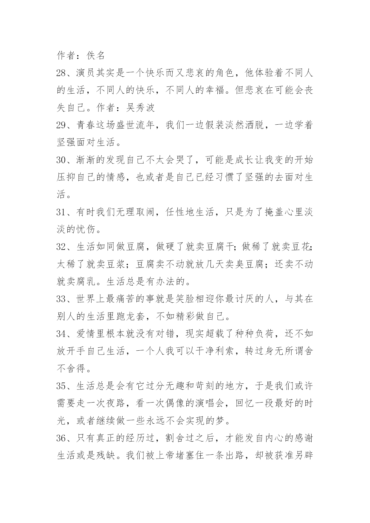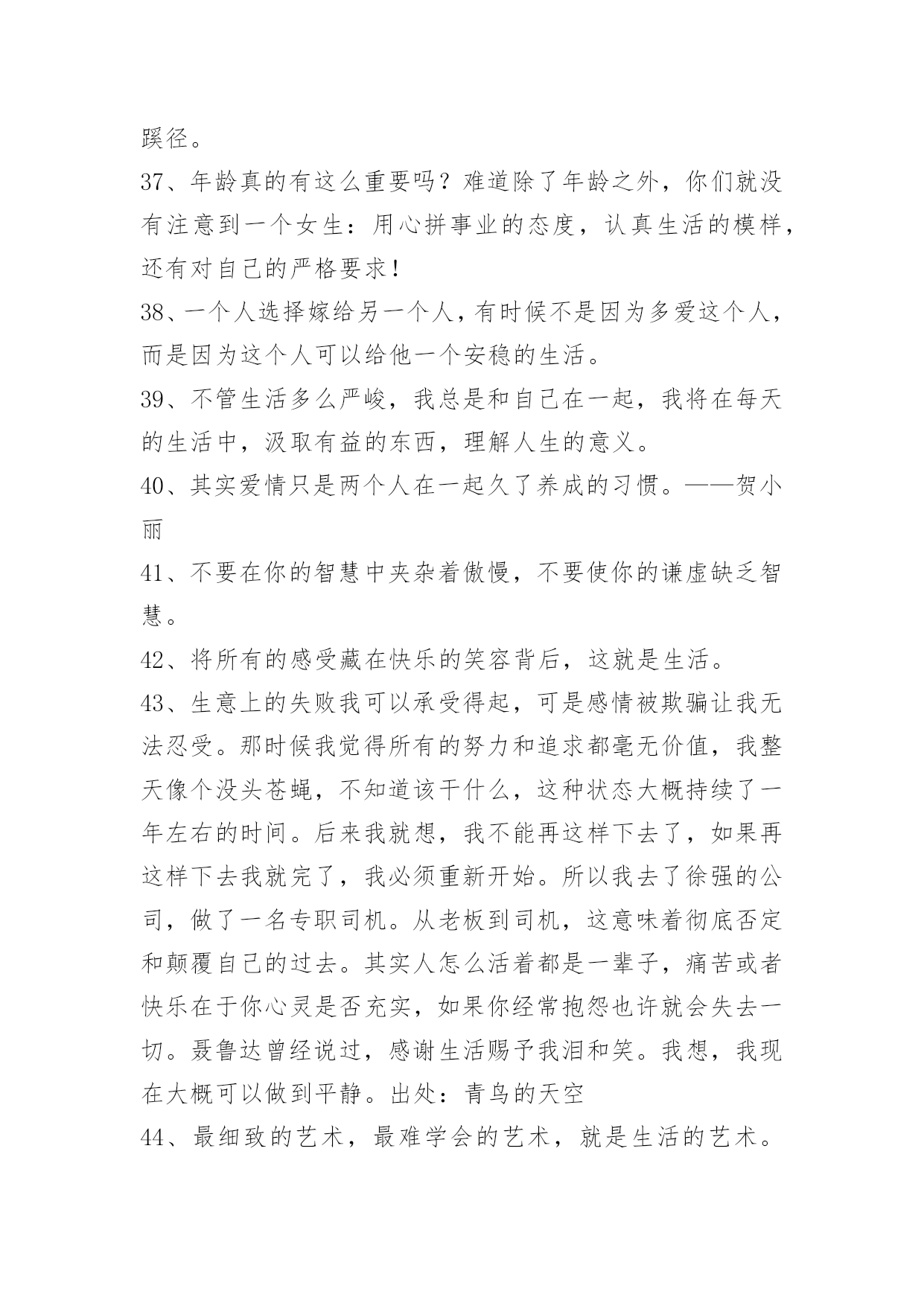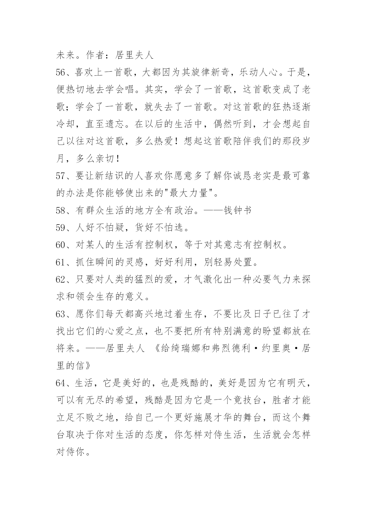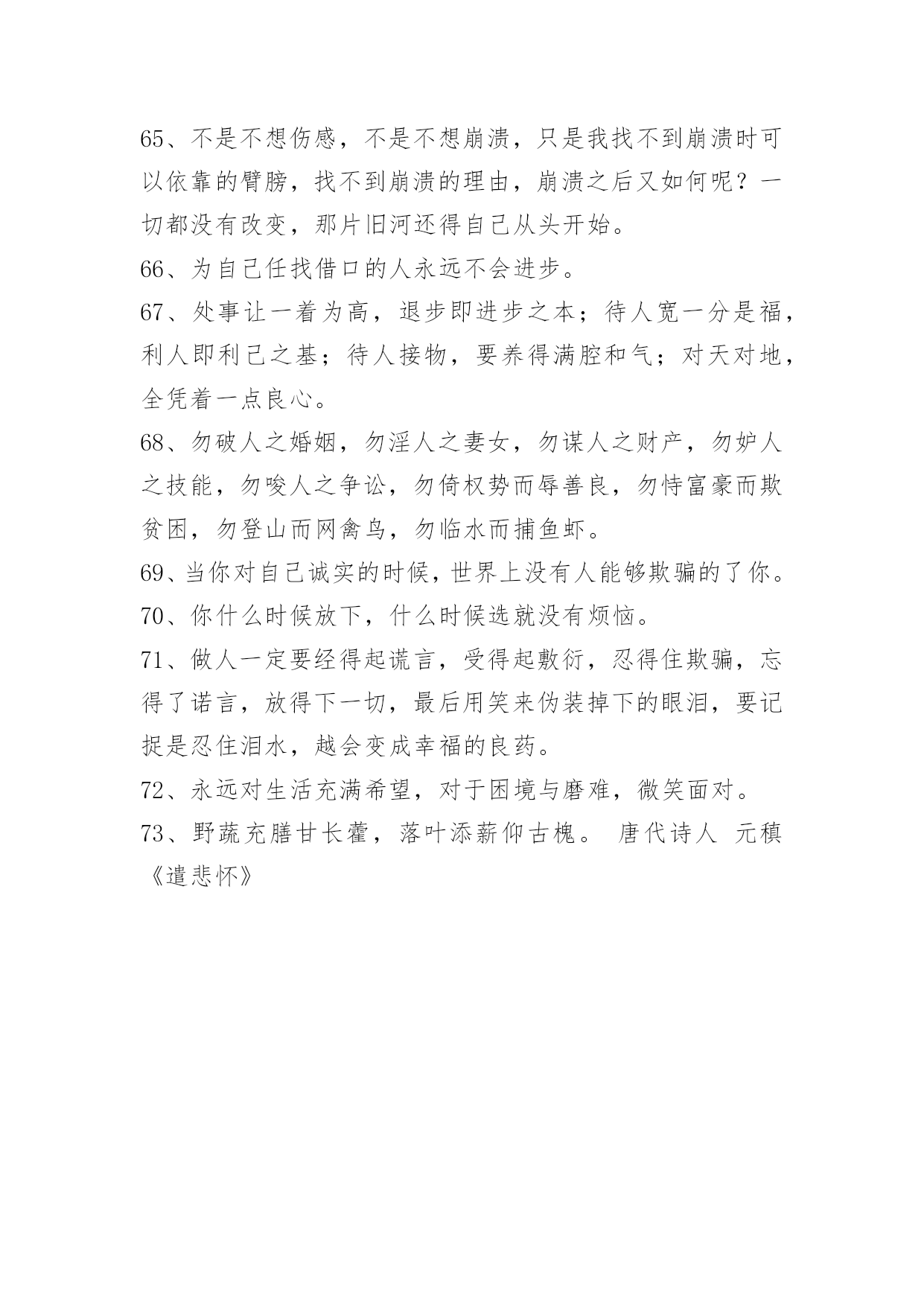 生活名言名句2024年生活名言名句汇总73句每一天睁开眼,我们都是蜉蝣,平平凡凡生活,轰轰烈烈的,追逐一个梦。下面是小编精心整理的生活名言名句73句,仅供参考,大家一起来看看吧。1、正确的人生目标,对每个人何等重要。2、日莲只开在阳光里,夜荷只开在月光下。能抑制情欲的人不搂抱别人的老婆——印度3、即使是智者,也难摈弃追求功名这个弱点。——塔西佗4、俭朴的生活,不但可使精神愉快,而且可以培养革命品质。5、你不得不随遇而安,但是,你应该努力按照你向往的方式去生活。——坎贝尔6、与其说小说好像是生活,不如说生活就像是小说。7、快看,树木在生长,那是它在享受阳光带给他的滋养,雄鹰在展翅,那是它在享受蓝天带给它的辽阔,水滴在流动,那是它在享受风儿带给他的自由——我们要学会享受生活。感触生活,这样我们的内心才会充满阳光。8、假如生活欺骗了你,不要忧郁,也不要愤慨!不顺心的时候暂且容忍:相信吧,欢乐的日子就会到来。——普希金《普希金抒情诗》9、快于意者云于行。——《燕丹子》10、只有两种生活方式:腐烂或燃烧。胆怯而贪婪的人选择前者,勇敢而胸怀博大的人选择后者。11、走进一个人的世界,哭着、想着、恋着、笑着、讲述着,你总是看着,没有说过一句话。因为有你,所以渴望。很多时候不必过分执着,画地为牢,只会把某些的错过,变成了过错。给自己一缕阳光,许自己足够的智慧,知福,惜福,珍惜那些值得珍惜的人,在乎那些也在乎自己的人,如此足矣。12、对功名的渴求要比对美德的渴求伟大得多,因为,功名是对美的奖赏,撇开它,谁还愿意去拥抱美德呢?——玉外纳13、人只有按照自然所启录的经验来生活。——叔本华14、财富不是永久的朋友,朋友才是永久的财富。15、晨兴理荒秽,带月荷锄归。《归园田居》16、生活,就是理解。生活,就是面对现实微笑,就是越过障碍注视未来。生活,就是自己身上有一架天平,在那上面衡量善与恶。17、对于人,什么是最宝贵的呢?是生活。因为我们的一切欢乐,我们的一切幸福,我们的一切希望,都只和生活联系在一起。——[俄国]车尔尼雪夫斯基18、生活的全部意义在于无穷地探索尚未知道的东西,在于不断地增加更多的知识。——[法国]左拉19、生活和宇宙是神奇的。然而,对万物的熟视无睹,犹如一层薄薄的雾,遮蔽了我们,使我们看不到自身的神奇。我们对人生倏忽不定的变幻赞叹不已,然而,它本身难道不正是伟大的奇迹?——[英国]雪莱20、一个人只有物质生活没有精神生活是不行的;而有了充实的革命精神生活,就算物质生活差些,就算困难大些,也能忍受和克服。——[中国]陶铸21、在繁忙中,在喧嚣中,在寂寞中,在困苦中,在得失中,在成败中,在欢愉中,在幸福中,每天拿出十分钟来静静地梳理一下我们的人生,我们会发觉:哦,人生是这样的。如果你看到一个贴子还值得一看的话,那么你一定要回复,因为你的回复会给人继续前进的动力,会给人很大的激励。22、一个人可以不寂寞,假如你乐在其中,享受宁静和独处的话。两个人也可以很寂寞,当你们无法沟通,无法欣赏彼此存在的价值,无法分享爱与关怀时。我多希望你或过往的人们,知道我有多喜欢你,分享这份喜欢的美好但我却不善于表达,好像每次对你的语言关心都是无关紧要的。23、生活变成了算术,不断加呀,乘呀,算来算去,算了又算,数学和数目没完没了,像一个大漩涡。这个大漩涡把人的最后一点家当也都席卷而去,吸入那永远填不满的无底深渊。24、只要明白"暂时逃走是为了继续往前走",也是为了给自己一点缓冲速度,就能放松心情,快乐做自己。25、离开的意思是,对自己温柔生活。26、百岁修来同船渡,千年修得共枕眠。27、人只有在紧张的心理节奏中,才会体验到生活的意义。作者:佚名28、演员其实是一个快乐而又悲哀的角色,他体验着不同人的生活,不同人的快乐,不同人的幸福。但悲哀在可能会丧失自己。作者:吴秀波29、青春这场盛世流年,我们一边假装淡然洒脱,一边学着坚强面对生活。30、渐渐的发现自己不太会哭了,可能是成长让我变的开始压抑自己的情感,也或者是自己已经习惯了坚强的去面对生活。31、有时我们无理取闹,任性地生活,只是为了掩盖心里淡淡的忧伤。32、生活如同做豆腐,做硬了就卖豆腐干;做稀了就卖豆花;太稀了就卖豆浆;豆腐卖不动就放几天卖臭豆腐;还卖不动就卖腐乳。生活总是有办法的。33、世界上最痛苦的事就是笑脸相迎你最讨厌的人,与其在别人的生活里跑龙套,不如精彩做自己。34、爱情里根本就没有对错,现实超载了种种负荷,还不如放开手自己生活,一个人我可以干净利索,转过身无所谓舍不舍得。35、生活总是会有它过分无趣和苛刻的地方,于是我们或许需要走一次夜路,看一次偶像的演唱会,回忆一段最好的时光,或者继续做一些永远不会实现的梦。36、只有真正的经历过,割舍过之后,才能发自内心的感谢生活或是残缺。我们被上帝堵塞