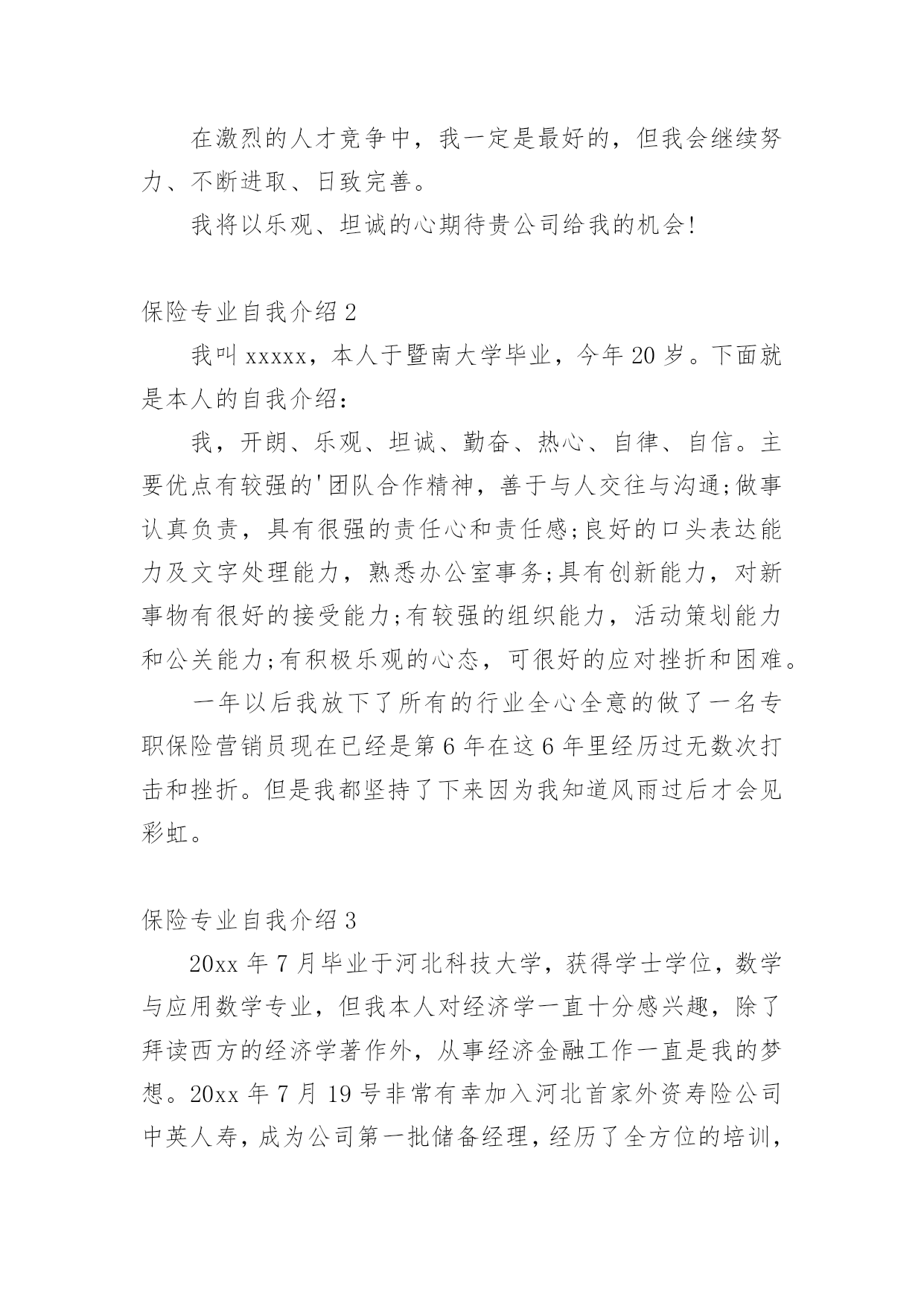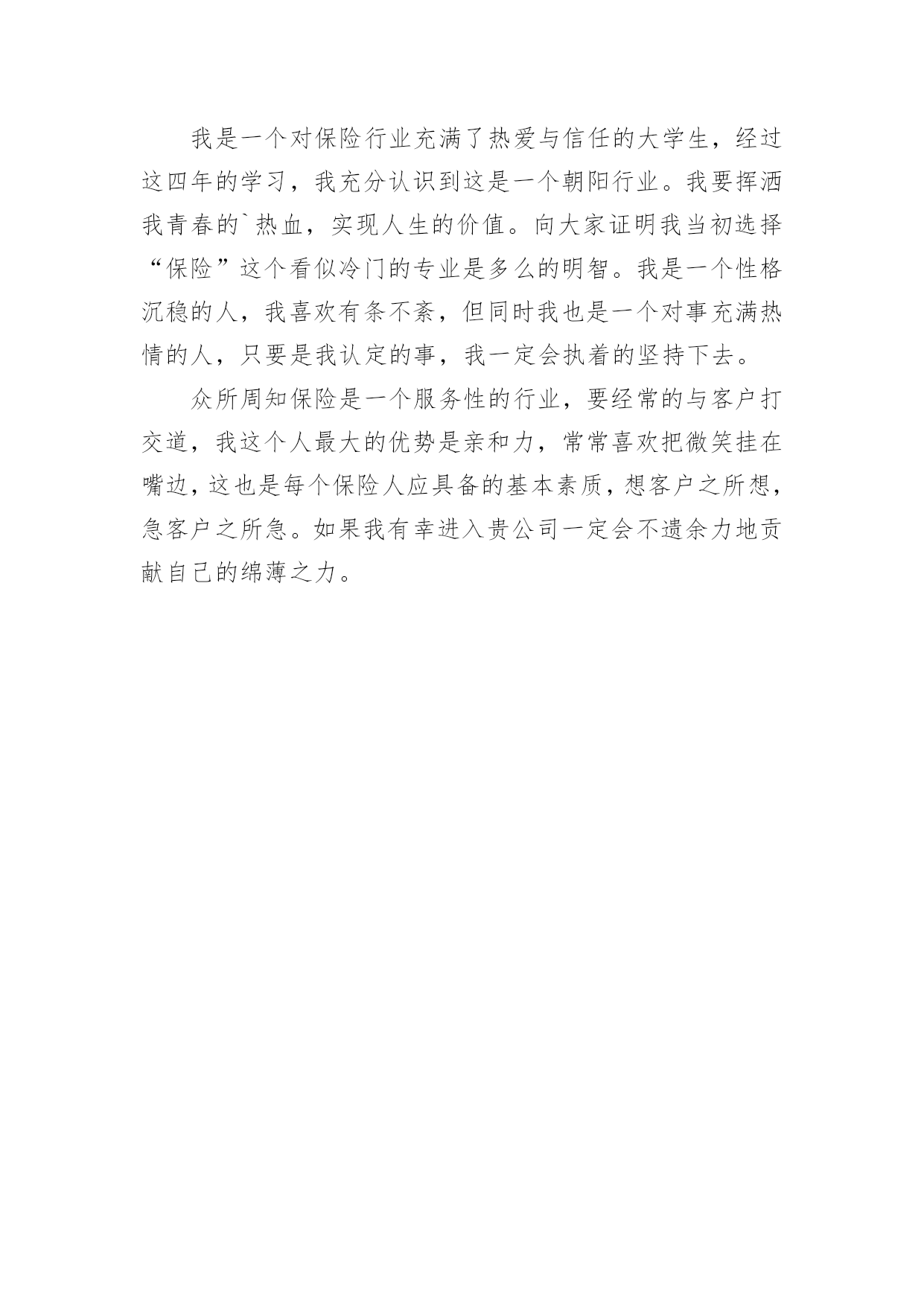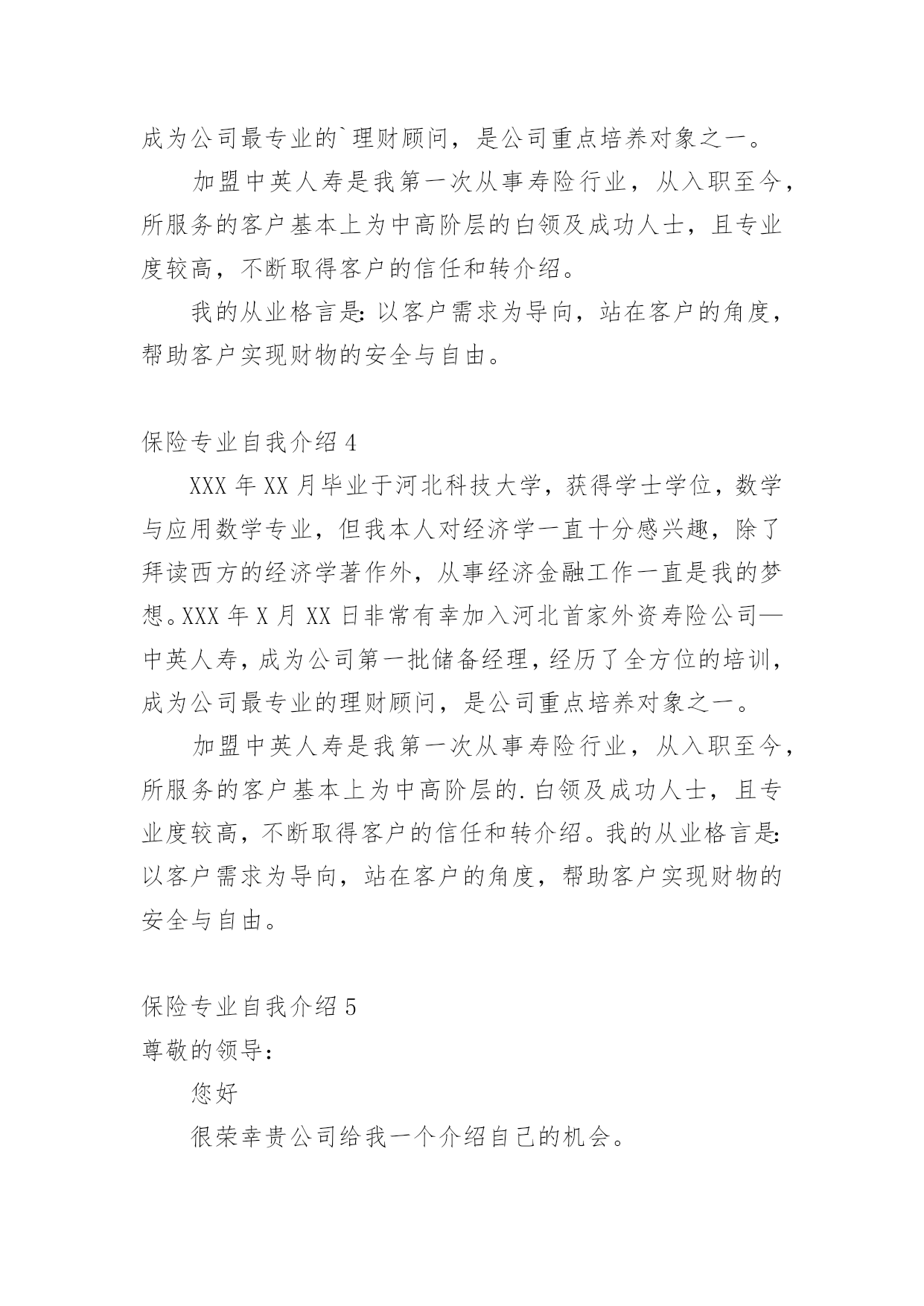 保险专业自我介绍当换了一个新环境后,我们总归要向他人介绍自己,自我介绍可以给陌生人留下一个好的印象。那么你真的会写自我介绍吗?下面是小编收集整理的保险专业自我介绍,希望对大家有所帮助。保险专业自我介绍1我是xx金融高等专科学校20xx级保险专业的一名毕业生,我以我最大的热情和十二分的虚诚向您递交我的个人材料,我自信符合应聘要求,在此很高兴向您介绍我自已。我来自辽宁省铁岭市,闻名的小品之乡铸就了我开朗、大方、乐观、稳重、豁达、的性格,自强不息,永不言弃显我的生活理念。大学生三年的学习中,我刻苦努力、积极进取,认真学习了西方经济学,公共关系学,应用写作,基础会计,财务管理,证券基础,投资基金、国际金融与国际汇兑、电子商务、财产保险、人身保险、风险管理、再保险、保险会计等近四十门课程、并且各科均以优异的成绩结业,连续多次获得二等、三等奖学金。20xx看11月以优秀的'成绩顺利通过了保险代理人的资格考试。担任团支部书记和副班长职务使我的能力得到了充分的锻炼与提高,做事认真、责任心强、善始善终是我最大的优点,工作中积极组织同学开展各项活动,并多次获奖,我个人也边疆两年被评为优秀团干部。在激烈的人才竞争中,我一定是最好的,但我会继续努力、不断进取、日致完善。我将以乐观、坦诚的心期待贵公司给我的机会!保险专业自我介绍2我叫xxxxx,本人于暨南大学毕业,今年20岁。下面就是本人的自我介绍:我,开朗、乐观、坦诚、勤奋、热心、自律、自信。主要优点有较强的'团队合作精神,善于与人交往与沟通;做事认真负责,具有很强的责任心和责任感;良好的口头表达能力及文字处理能力,熟悉办公室事务;具有创新能力,对新事物有很好的接受能力;有较强的组织能力,活动策划能力和公关能力;有积极乐观的心态,可很好的应对挫折和困难。一年以后我放下了所有的行业全心全意的做了一名专职保险营销员现在已经是第6年在这6年里经历过无数次打击和挫折。但是我都坚持了下来因为我知道风雨过后才会见彩虹。保险专业自我介绍320xx年7月毕业于河北科技大学,获得学士学位,数学与应用数学专业,但我本人对经济学一直十分感兴趣,除了拜读西方的经济学著作外,从事经济金融工作一直是我的梦想。20xx年7月19号非常有幸加入河北首家外资寿险公司中英人寿,成为公司第一批储备经理,经历了全方位的培训,成为公司最专业的`理财顾问,是公司重点培养对象之一。加盟中英人寿是我第一次从事寿险行业,从入职至今,所服务的客户基本上为中高阶层的白领及成功人士,且专业度较高,不断取得客户的信任和转介绍。我的从业格言是:以客户需求为导向,站在客户的角度,帮助客户实现财物的安全与自由。保险专业自我介绍4XXX年XX月毕业于河北科技大学,获得学士学位,数学与应用数学专业,但我本人对经济学一直十分感兴趣,除了拜读西方的经济学著作外,从事经济金融工作一直是我的梦想。XXX年X月XX日非常有幸加入河北首家外资寿险公司—中英人寿,成为公司第一批储备经理,经历了全方位的培训,成为公司最专业的理财顾问,是公司重点培养对象之一。加盟中英人寿是我第一次从事寿险行业,从入职至今,所服务的客户基本上为中高阶层的.白领及成功人士,且专业度较高,不断取得客户的信任和转介绍。我的从业格言是:以客户需求为导向,站在客户的角度,帮助客户实现财物的安全与自由。保险专业自我介绍5尊敬的领导:您好很荣幸贵公司给我一个介绍自己的机会。我是一个对保险行业充满了热爱与信任的大学生,经过这四年的学习,我充分认识到这是一个朝阳行业。我要挥洒我青春的`热血,实现人生的价值。向大家证明我当初选择“保险”这个看似冷门的专业是多么的明智。我是一个性格沉稳的人,我喜欢有条不紊,但同时我也是一个对事充满热情的人,只要是我认定的事,我一定会执着的坚持下去。众所周知保险是一个服务性的行业,要经常的与客户打交道,我这个人最大的优势是亲和力,常常喜欢把微笑挂在嘴边,这也是每个保险人应具备的基本素质,想客户之所想,急客户之所急。如果我有幸进入贵公司一定会不遗余力地贡献自己的绵薄之力。