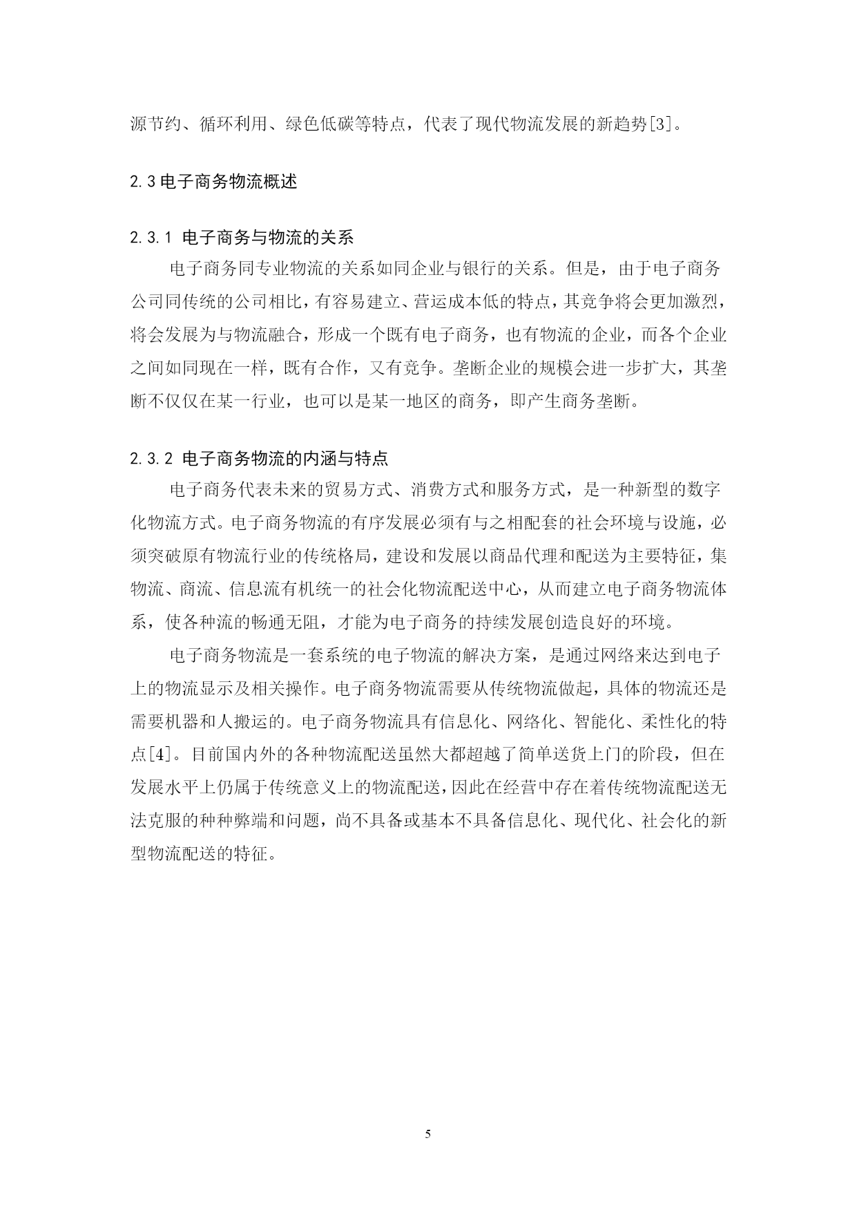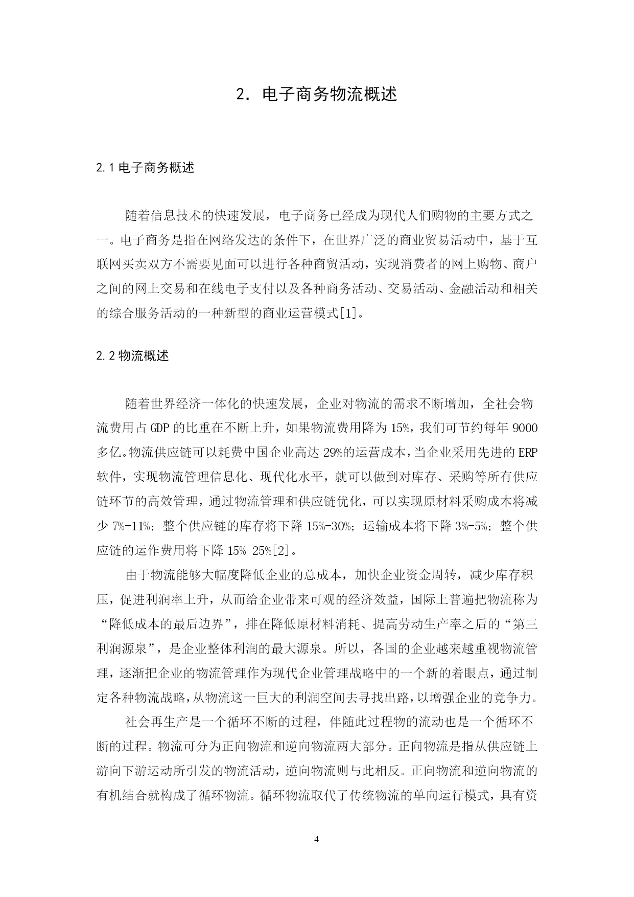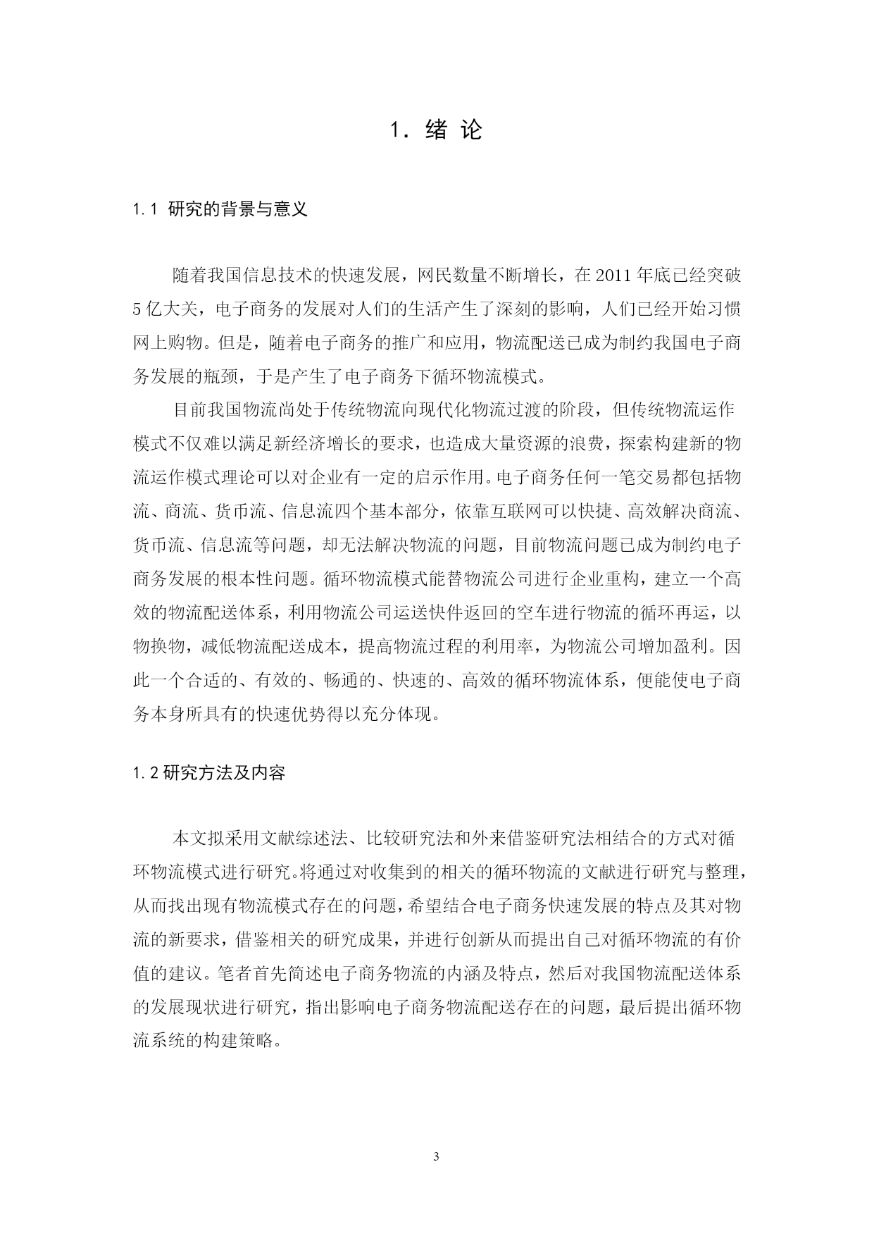 PAGEPAGE2循环物流模式研究与应用电子商务1班梁莉璎指导教师:杨霄彩摘要随着网络与信息技术的快速发展,电子商务得到了蓬勃发展,对物流的发展提出了更高的要求。在此背景下,本文首先对电子商务物流进行了概述,然后对我国物流配送体系的发展现状进行分析,由于物流配送成本高,配送质量差,信息化水平低影响了物流企业的发展,最后笔者提出循环物流系统的构建,完善循环物流系统的管理机制,搭建循环物流系统二手平台;构建农业生态循环物流系统与城市循环物流系统,同时物流企业要拓展各方面业务;物流企业之间要加强合作,完现无缝配送,不断提高物流企业的配送水平,实现现代电子商务物流模式,促进电子商务的持续、健康发展,是具有现实意义的研究课题。关键词:循环物流;电子商务;二手平台ABSTRACTWiththerapiddevelopmentofnetworkandinformationtechnology,e-commercehasbeenbooming,andahigherdemandonthedevelopmentofthelogistics.Inthiscontext,thispaperfirste-commercelogisticsoverview,andthenanalyzethecurrentdevelopmentofChina'slogisticsanddistributionsystem,logisticsanddistributioncostsarehigh,thedistributionofpoorquality,lowlevelofinformationtechnologyaffectsthedevelopmentoflogisticsenterprises,thelastauthorproposedtheconstructionofthelooplogisticssystem,improvethemanagementmechanismofthelooplogisticssystem,andbuildcyclelogisticssystemusedplatform;logisticscompaniestoexpandallaspectsofbusiness;tostrengthenthecooperationbetweenthelogisticsenterprises,finishednowseamlessdistribution,continuouslyimprovethedeliveryoflogisticsenterprisesthelevelofmoderne-commercelogisticsmodel,andpromotesustainedandhealthydevelopmentofe-commerce,isthepracticalsignificanceoftheresearchtopic.KEYWORDSCyclelogistics;E-commerce;UsedplatformPAGE2目录TOC\o"1-3"\h\z\uHYPERLINK\l"_Toc319419585"1.绪论PAGEREF_Toc319419585\h3HYPERLINK\l"_Toc319419586"1.1研究的背景与意义PAGEREF_Toc319419586\h3HYPERLINK\l"_Toc319419587"1.2研究方法及内容PAGEREF_Toc319419587\h3HYPERLINK\l"_Toc319419588"2.电子商务物流概述PAGEREF_Toc319419588\h4HYPERLINK\l"_Toc319419589"2.1电子商务概述PAGEREF_Toc319419589\h4HYPERLINK\l"_Toc319419590"2.2物流概述PAGEREF_Toc319419590\h4HYPERLINK\l"_Toc319419591"2.3电子商务物流概述PAGEREF_Toc319419591\h5HYPERLINK\l"_Toc319419592"2.3.1电子商务与物流的关系PAGEREF_Toc319419592\h5HYPERLINK\l"_Toc319419593"2.3.2电子商务物流的内涵与特点PAGEREF_Toc319419593\h5HYPERLINK\l"_Toc319419594"3.我国物流配送体系的发展现状PAGERE