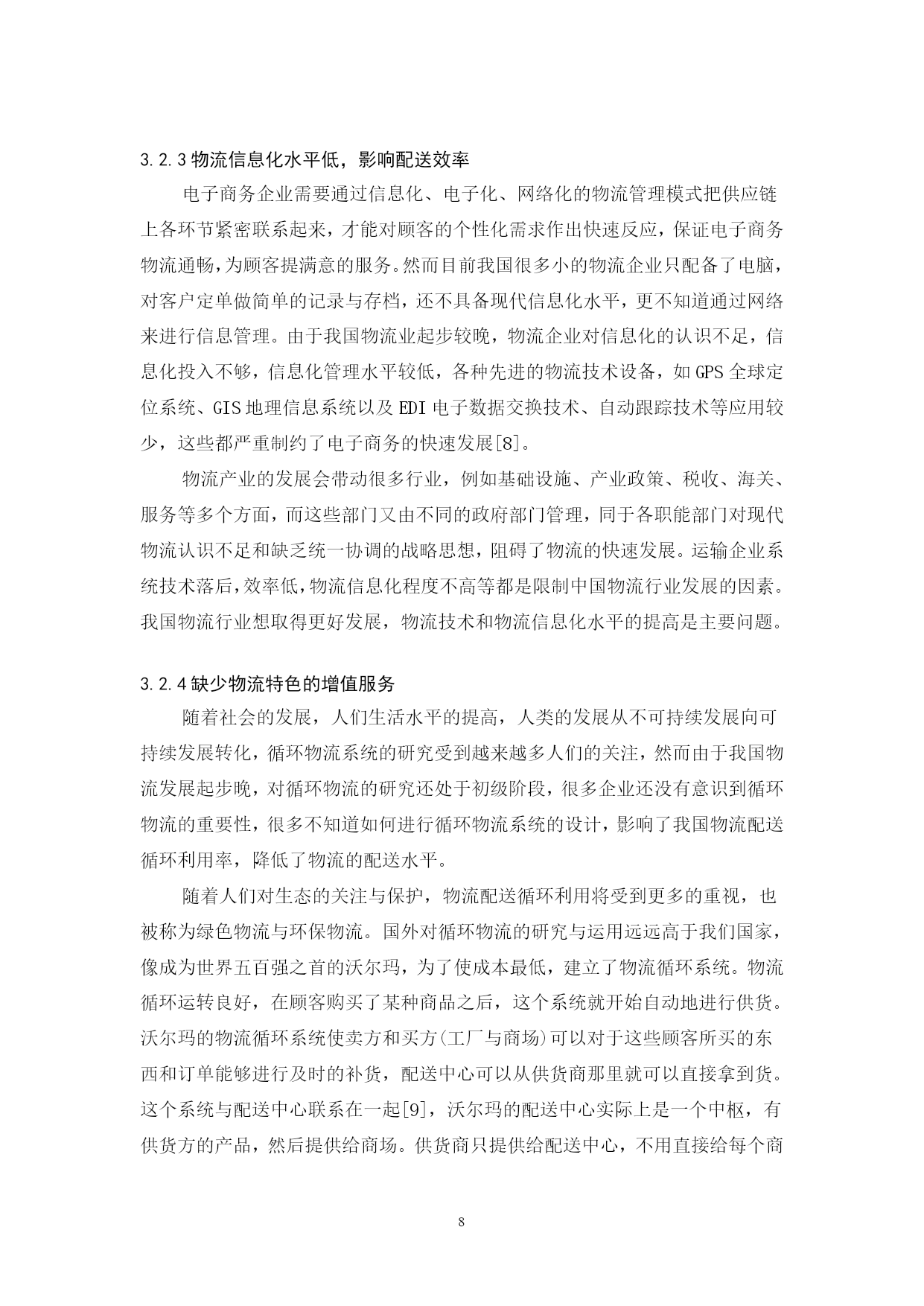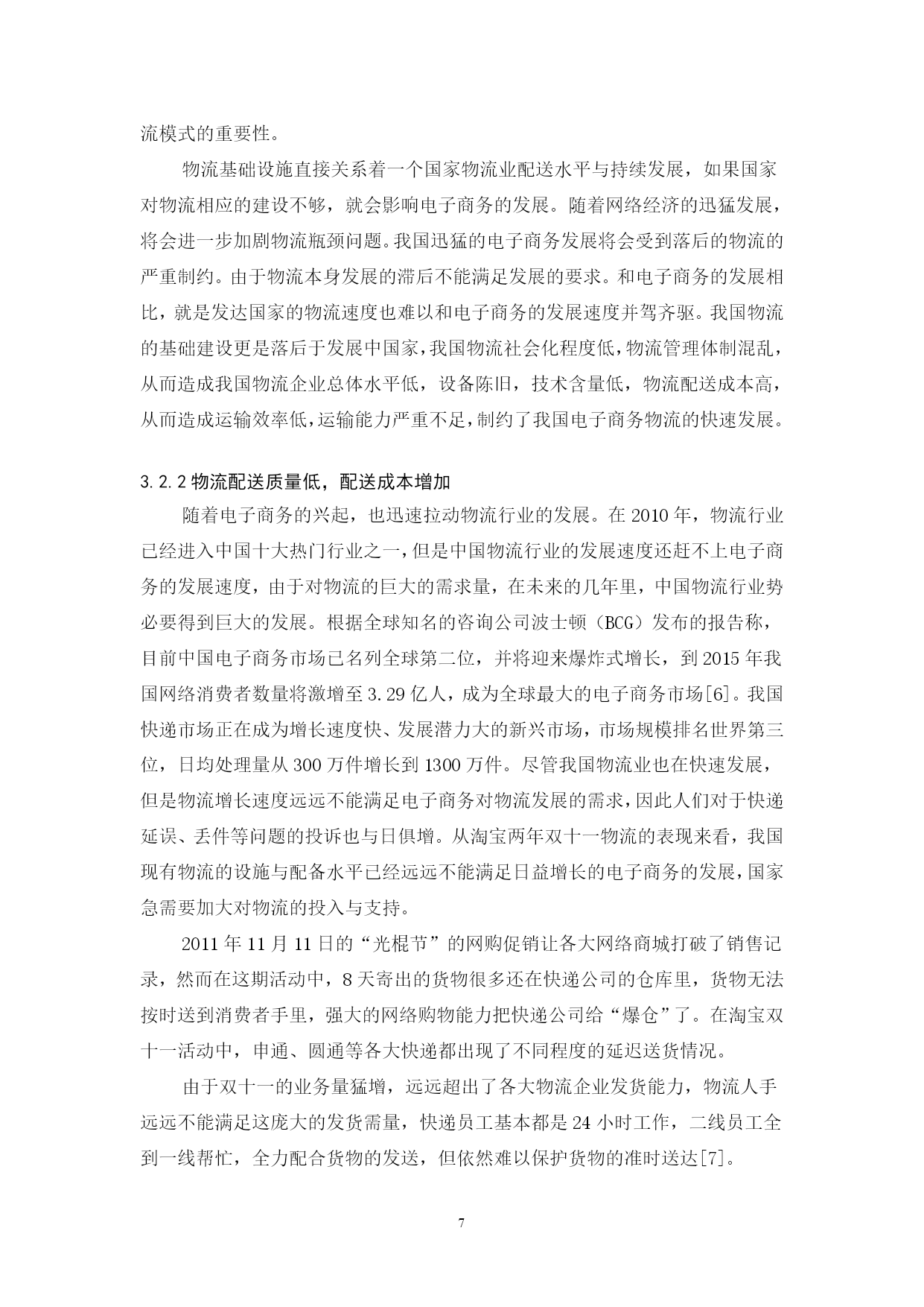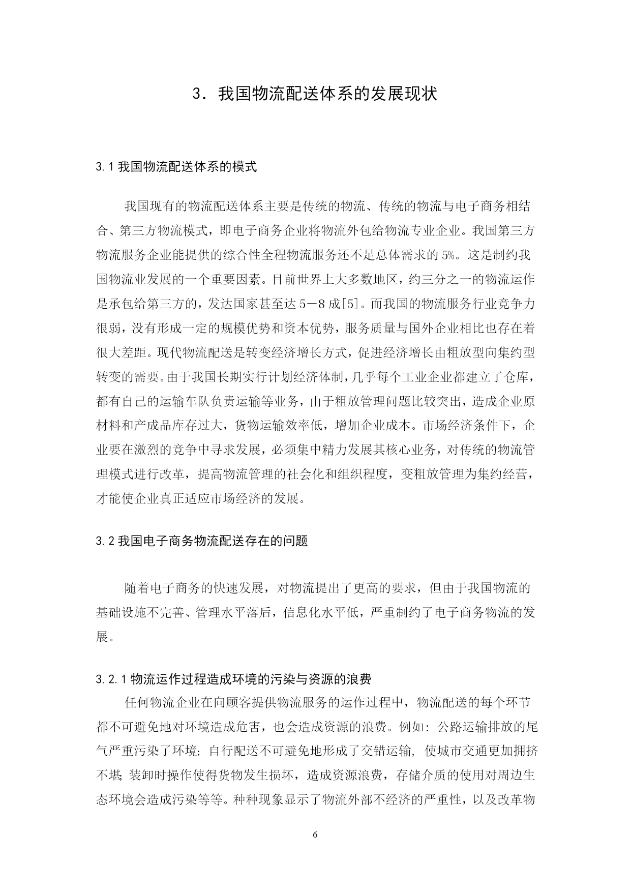 PAGEPAGE2循环物流模式研究与应用电子商务1班梁莉璎指导教师:杨霄彩摘要随着网络与信息技术的快速发展,电子商务得到了蓬勃发展,对物流的发展提出了更高的要求。在此背景下,本文首先对电子商务物流进行了概述,然后对我国物流配送体系的发展现状进行分析,由于物流配送成本高,配送质量差,信息化水平低影响了物流企业的发展,最后笔者提出循环物流系统的构建,完善循环物流系统的管理机制,搭建循环物流系统二手平台;构建农业生态循环物流系统与城市循环物流系统,同时物流企业要拓展各方面业务;物流企业之间要加强合作,完现无缝配送,不断提高物流企业的配送水平,实现现代电子商务物流模式,促进电子商务的持续、健康发展,是具有现实意义的研究课题。关键词:循环物流;电子商务;二手平台ABSTRACTWiththerapiddevelopmentofnetworkandinformationtechnology,e-commercehasbeenbooming,andahigherdemandonthedevelopmentofthelogistics.Inthiscontext,thispaperfirste-commercelogisticsoverview,andthenanalyzethecurrentdevelopmentofChina'slogisticsanddistributionsystem,logisticsanddistributioncostsarehigh,thedistributionofpoorquality,lowlevelofinformationtechnologyaffectsthedevelopmentoflogisticsenterprises,thelastauthorproposedtheconstructionofthelooplogisticssystem,improvethemanagementmechanismofthelooplogisticssystem,andbuildcyclelogisticssystemusedplatform;logisticscompaniestoexpandallaspectsofbusiness;tostrengthenthecooperationbetweenthelogisticsenterprises,finishednowseamlessdistribution,continuouslyimprovethedeliveryoflogisticsenterprisesthelevelofmoderne-commercelogisticsmodel,andpromotesustainedandhealthydevelopmentofe-commerce,isthepracticalsignificanceoftheresearchtopic.KEYWORDSCyclelogistics;E-commerce;UsedplatformPAGE2目录TOC\o"1-3"\h\z\uHYPERLINK\l"_Toc319419585"1.绪论PAGEREF_Toc319419585\h3HYPERLINK\l"_Toc319419586"1.1研究的背景与意义PAGEREF_Toc319419586\h3HYPERLINK\l"_Toc319419587"1.2研究方法及内容PAGEREF_Toc319419587\h3HYPERLINK\l"_Toc319419588"2.电子商务物流概述PAGEREF_Toc319419588\h4HYPERLINK\l"_Toc319419589"2.1电子商务概述PAGEREF_Toc319419589\h4HYPERLINK\l"_Toc319419590"2.2物流概述PAGEREF_Toc319419590\h4HYPERLINK\l"_Toc319419591"2.3电子商务物流概述PAGEREF_Toc319419591\h5HYPERLINK\l"_Toc319419592"2.3.1电子商务与物流的关系PAGEREF_Toc319419592\h5HYPERLINK\l"_Toc319419593"2.3.2电子商务物流的内涵与特点PAGEREF_Toc319419593\h5HYPERLINK\l"_Toc319419594"3.我国物流配送体系的发展现状PAGERE