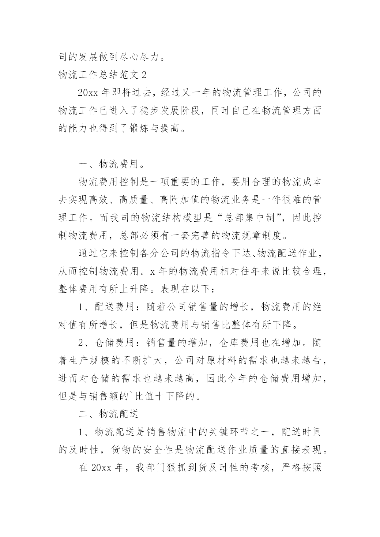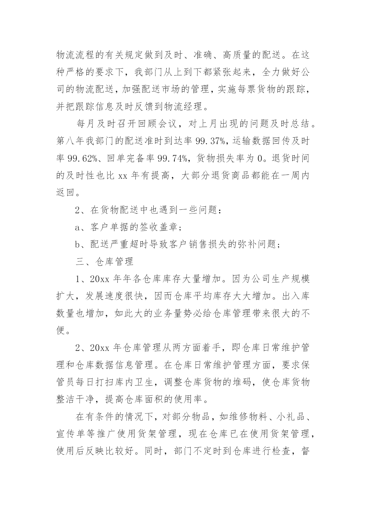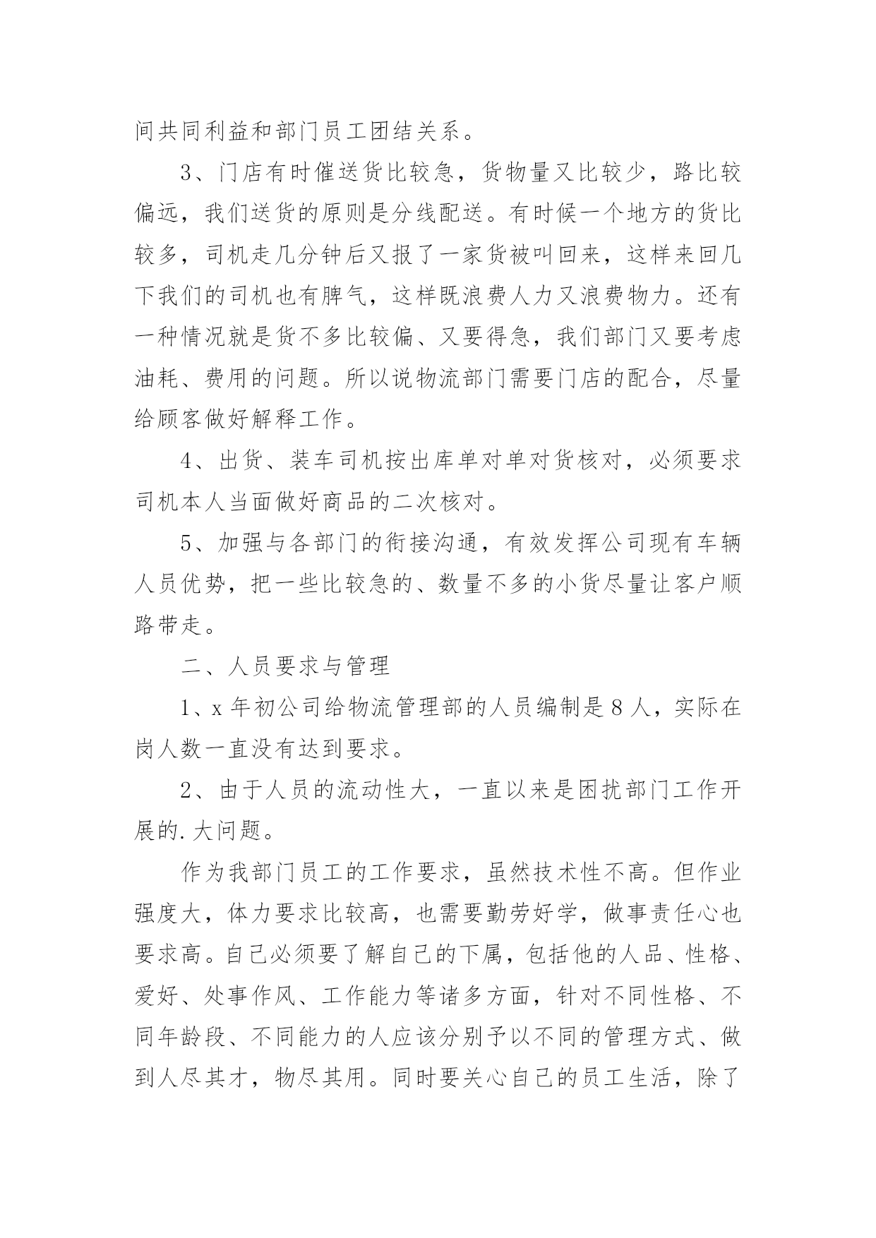 物流工作总结物流工作总结范文总结是在某一时期、某一项目或某些工作告一段落或者全部完成后进行回顾检查、分析评价,从而得出教训和一些规律性认识的一种书面材料,它可以有效锻炼我们的语言组织能力,快快来写一份总结吧。总结一般是怎么写的呢?下面是小编整理的物流工作总结范文,希望能够帮助到大家。物流工作总结范文1经过又一年的物流管理工作,内心不禁感慨万千,回顾物流全年的工作历程,既有辛酸的汗水,也有进步的喜悦。过去的一年在公司各部门的配合支持及部门员工的共同努力下,顺利完成了全年的各项工作任务,现将我部门一年来的工作情况总结汇报如下。一、配送1、相比xx年x年我们公司销售在整个大环境不景气的情况下有所下滑,在配送这一块我们配送司机的薪水多少主要是取决配送的商品来计提成的。其实可以发现我们的司机不愿每天呆在家里,情愿多送货多做事来增加收入。2、x年我在司机计算提成这一块要求收营员做好司机每天的配送单统计,做到货物配送单的合理安排,避免了以往司机大笔金额货物配送时抢单、抢送的局面,维护了司机之间共同利益和部门员工团结关系。3、门店有时催送货比较急,货物量又比较少,路比较偏远,我们送货的原则是分线配送。有时候一个地方的货比较多,司机走几分钟后又报了一家货被叫回来,这样来回几下我们的司机也有脾气,这样既浪费人力又浪费物力。还有一种情况就是货不多比较偏、又要得急,我们部门又要考虑油耗、费用的问题。所以说物流部门需要门店的配合,尽量给顾客做好解释工作。4、出货、装车司机按出库单对单对货核对,必须要求司机本人当面做好商品的二次核对。5、加强与各部门的衔接沟通,有效发挥公司现有车辆人员优势,把一些比较急的、数量不多的小货尽量让客户顺路带走。二、人员要求与管理1、x年初公司给物流管理部的人员编制是8人,实际在岗人数一直没有达到要求。2、由于人员的流动性大,一直以来是困扰部门工作开展的.大问题。作为我部门员工的工作要求,虽然技术性不高。但作业强度大,体力要求比较高,也需要勤劳好学,做事责任心也要求高。自己必须要了解自己的下属,包括他的人品、性格、爱好、处事作风、工作能力等诸多方面,针对不同性格、不同年龄段、不同能力的人应该分别予以不同的管理方式、做到人尽其才,物尽其用。同时要关心自己的员工生活,除了批评外还要多加鼓励,以及对其的信任,让他体会到领导层的关心与器重,让他知道我们不但是上下级关系、同事关系,我们还是互相支持、关心的朋友关系。当然,作为管理者,同样要在员工面前树立自己的威信。这种威信不是靠恶语批评,也不是靠一味的做老好人树立起来的。你需要的是一个团队的力量,你需要说你好的人的支持,你同样需要说你坏的人的支持。三、车辆的管理1、定期对配送司机进行车辆人生安全防范意识培训讲解,定期做好车辆内外清洁卫生。2、严格控制部门内车辆费用,合理有效安排配送路线。3、严格要求配送员填写出车记录:如出车时间、行程、地点、事由、驾驶人签名,做到有出车就必有出车记录,做到保存全年的出车记录表。4、对全年车辆的费用使用情况做表格化存档:如车辆维修零件费用、保养、加油的时间、行驶公里数都有记录,做到部门内有数据可查,明确保养周期、时间。5、坚持秉承小问题自己动手解决、大问题送修自己买维修配件的原则,节约控制部门车辆费用。四、工作回顾与展望1、20xx年不知不觉在指尖慢慢逝去,20xx年迎面而来。回想过去,展望未来!有进步的喜悦,亦有工作中失误的愧疚。用心总结工作当中的利弊、得失。2、认真履行工作职责,在新的一年里,物流部将为公司的发展做到尽心尽力。物流工作总结范文220xx年即将过去,经过又一年的物流管理工作,公司的物流工作已进入了稳步发展阶段,同时自己在物流管理方面的能力也得到了锻炼与提高。一、物流费用。物流费用控制是一项重要的工作,要用合理的物流成本去实现高效、高质量、高附加值的物流业务是一件很难的管理工作。而我司的物流结构模型是“总部集中制”,因此控制物流费用,总部必须有一套完善的物流规章制度。通过它来控制各分公司的物流指令下达、物流配送作业,从而控制物流费用。x年的物流费用相对往年来说比较合理,整体费用有所上升降。表现在以下:1、配送费用:随着公司销售量的增长,物流费用的绝对值有所增长,但是物流费用与销售比整体有所下降。2、仓储费用:销售量的增加,仓库费用也在增加。随着生产规模的不断扩大,公司对原材料的需求也越来越告,进而对仓储的需求也越来越高,因此今年的仓储费用增加,但是与销售额的`比值十下降的。二、物流配送1、物流配送是销售物流中的关键环节之一,配送时间的及时性,货物的安全性是物流配送作业质量的直接表现。在20xx年,我部门狠抓到货及时性的考核,严格按照物流流程的有关规定做到及时、准确、高质量的配送。在这种严格的要求下,我部门从上到下都紧张起来,全力做好公司