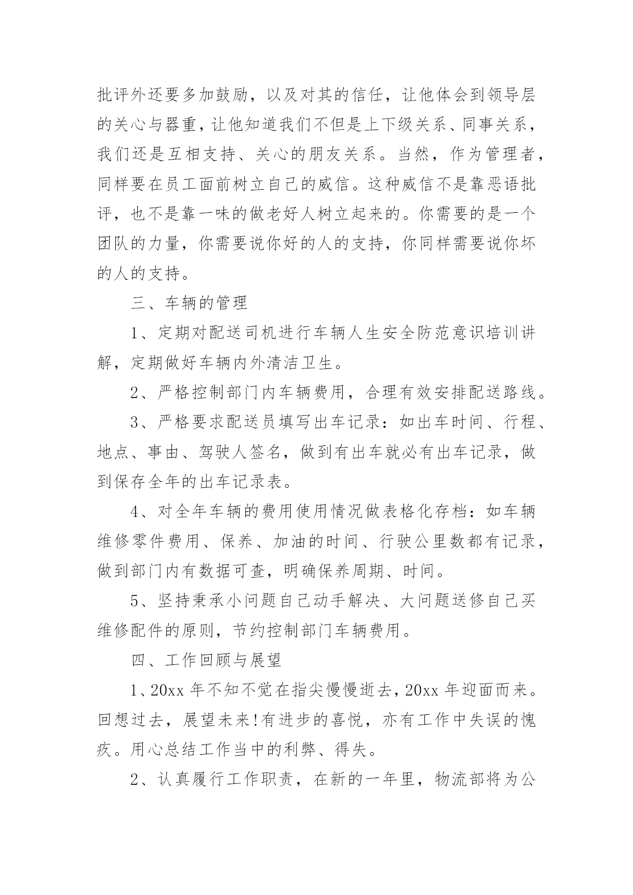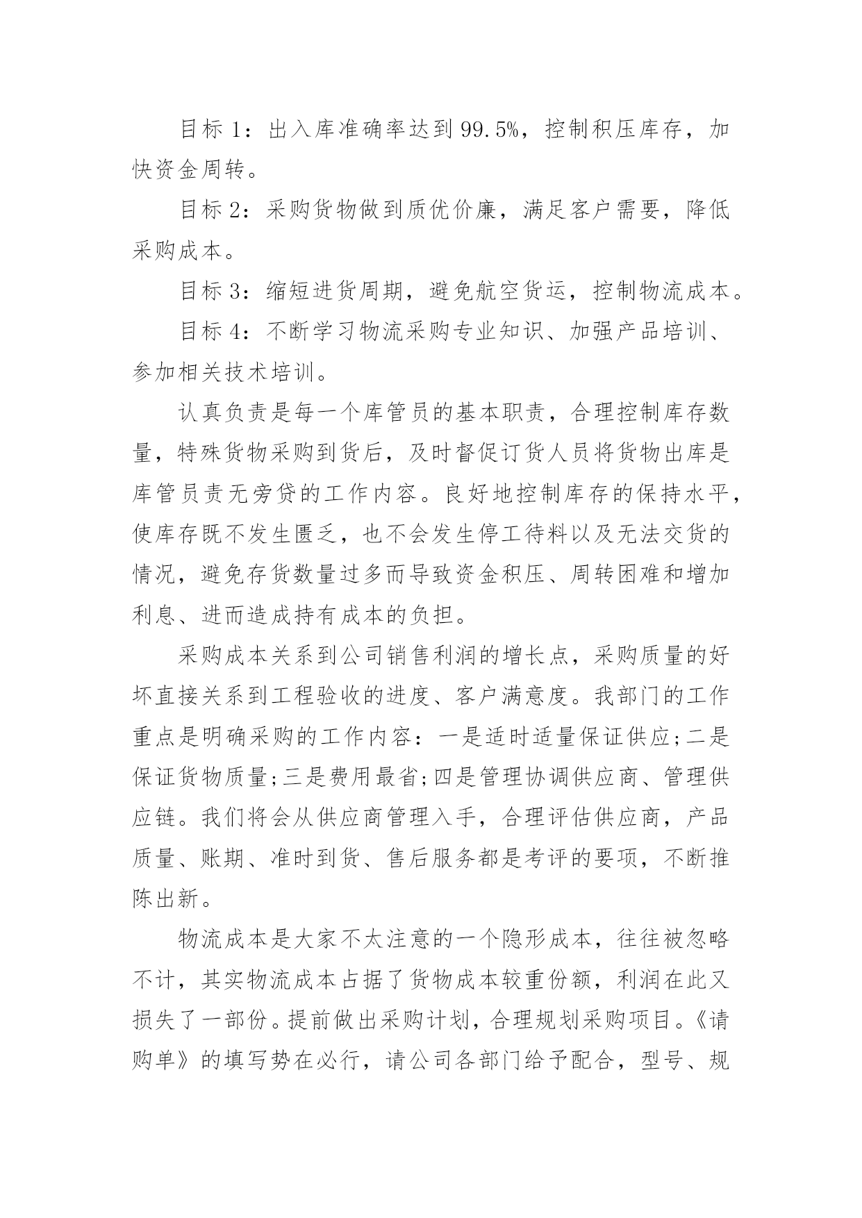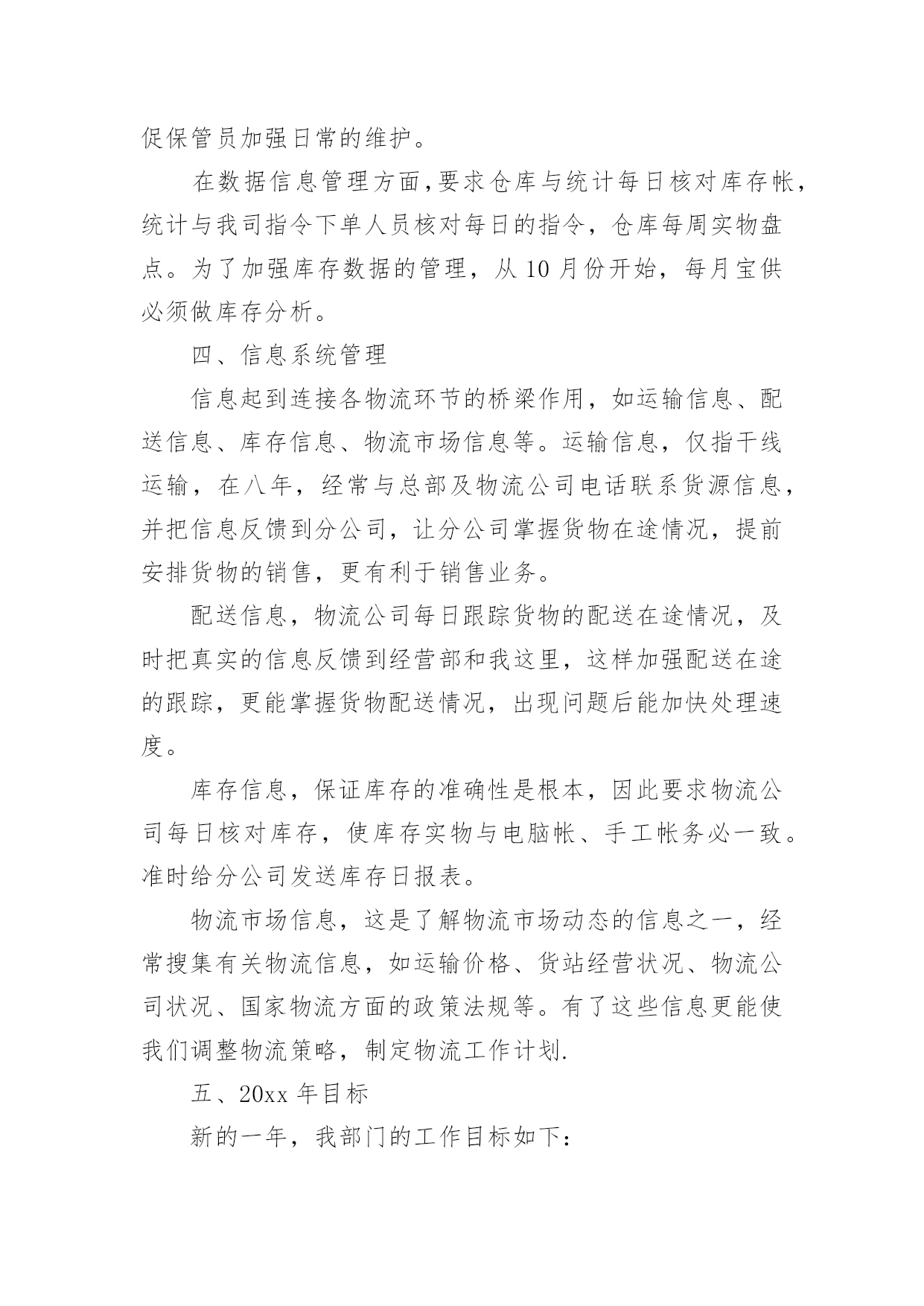 物流工作总结物流工作总结范文总结是在某一时期、某一项目或某些工作告一段落或者全部完成后进行回顾检查、分析评价,从而得出教训和一些规律性认识的一种书面材料,它可以有效锻炼我们的语言组织能力,快快来写一份总结吧。总结一般是怎么写的呢?下面是小编整理的物流工作总结范文,希望能够帮助到大家。物流工作总结范文1经过又一年的物流管理工作,内心不禁感慨万千,回顾物流全年的工作历程,既有辛酸的汗水,也有进步的喜悦。过去的一年在公司各部门的配合支持及部门员工的共同努力下,顺利完成了全年的各项工作任务,现将我部门一年来的工作情况总结汇报如下。一、配送1、相比xx年x年我们公司销售在整个大环境不景气的情况下有所下滑,在配送这一块我们配送司机的薪水多少主要是取决配送的商品来计提成的。其实可以发现我们的司机不愿每天呆在家里,情愿多送货多做事来增加收入。2、x年我在司机计算提成这一块要求收营员做好司机每天的配送单统计,做到货物配送单的合理安排,避免了以往司机大笔金额货物配送时抢单、抢送的局面,维护了司机之间共同利益和部门员工团结关系。3、门店有时催送货比较急,货物量又比较少,路比较偏远,我们送货的原则是分线配送。有时候一个地方的货比较多,司机走几分钟后又报了一家货被叫回来,这样来回几下我们的司机也有脾气,这样既浪费人力又浪费物力。还有一种情况就是货不多比较偏、又要得急,我们部门又要考虑油耗、费用的问题。所以说物流部门需要门店的配合,尽量给顾客做好解释工作。4、出货、装车司机按出库单对单对货核对,必须要求司机本人当面做好商品的二次核对。5、加强与各部门的衔接沟通,有效发挥公司现有车辆人员优势,把一些比较急的、数量不多的小货尽量让客户顺路带走。二、人员要求与管理1、x年初公司给物流管理部的人员编制是8人,实际在岗人数一直没有达到要求。2、由于人员的流动性大,一直以来是困扰部门工作开展的.大问题。作为我部门员工的工作要求,虽然技术性不高。但作业强度大,体力要求比较高,也需要勤劳好学,做事责任心也要求高。自己必须要了解自己的下属,包括他的人品、性格、爱好、处事作风、工作能力等诸多方面,针对不同性格、不同年龄段、不同能力的人应该分别予以不同的管理方式、做到人尽其才,物尽其用。同时要关心自己的员工生活,除了批评外还要多加鼓励,以及对其的信任,让他体会到领导层的关心与器重,让他知道我们不但是上下级关系、同事关系,我们还是互相支持、关心的朋友关系。当然,作为管理者,同样要在员工面前树立自己的威信。这种威信不是靠恶语批评,也不是靠一味的做老好人树立起来的。你需要的是一个团队的力量,你需要说你好的人的支持,你同样需要说你坏的人的支持。三、车辆的管理1、定期对配送司机进行车辆人生安全防范意识培训讲解,定期做好车辆内外清洁卫生。2、严格控制部门内车辆费用,合理有效安排配送路线。3、严格要求配送员填写出车记录:如出车时间、行程、地点、事由、驾驶人签名,做到有出车就必有出车记录,做到保存全年的出车记录表。4、对全年车辆的费用使用情况做表格化存档:如车辆维修零件费用、保养、加油的时间、行驶公里数都有记录,做到部门内有数据可查,明确保养周期、时间。5、坚持秉承小问题自己动手解决、大问题送修自己买维修配件的原则,节约控制部门车辆费用。四、工作回顾与展望1、20xx年不知不觉在指尖慢慢逝去,20xx年迎面而来。回想过去,展望未来!有进步的喜悦,亦有工作中失误的愧疚。用心总结工作当中的利弊、得失。2、认真履行工作职责,在新的一年里,物流部将为公司的发展做到尽心尽力。物流工作总结范文220xx年即将过去,经过又一年的物流管理工作,公司的物流工作已进入了稳步发展阶段,同时自己在物流管理方面的能力也得到了锻炼与提高。一、物流费用。物流费用控制是一项重要的工作,要用合理的物流成本去实现高效、高质量、高附加值的物流业务是一件很难的管理工作。而我司的物流结构模型是“总部集中制”,因此控制物流费用,总部必须有一套完善的物流规章制度。通过它来控制各分公司的物流指令下达、物流配送作业,从而控制物流费用。x年的物流费用相对往年来说比较合理,整体费用有所上升降。表现在以下:1、配送费用:随着公司销售量的增长,物流费用的绝对值有所增长,但是物流费用与销售比整体有所下降。2、仓储费用:销售量的增加,仓库费用也在增加。随着生产规模的不断扩大,公司对原材料的需求也越来越告,进而对仓储的需求也越来越高,因此今年的仓储费用增加,但是与销售额的`比值十下降的。二、物流配送1、物流配送是销售物流中的关键环节之一,配送时间的及时性,货物的安全性是物流配送作业质量的直接表现。在20xx年,我部门狠抓到货及时性的考核,严格按照物流流程的有关规定做到及时、准确、高质量的配送。在这种严格的要求下,我部门从上到下都紧张起来,全力做好公司