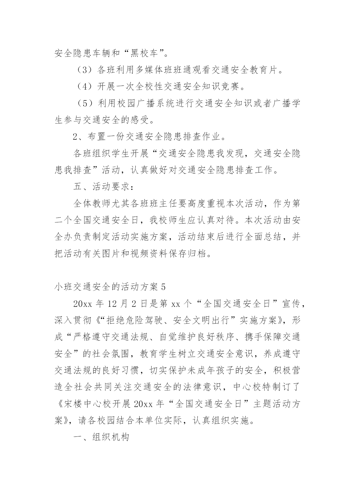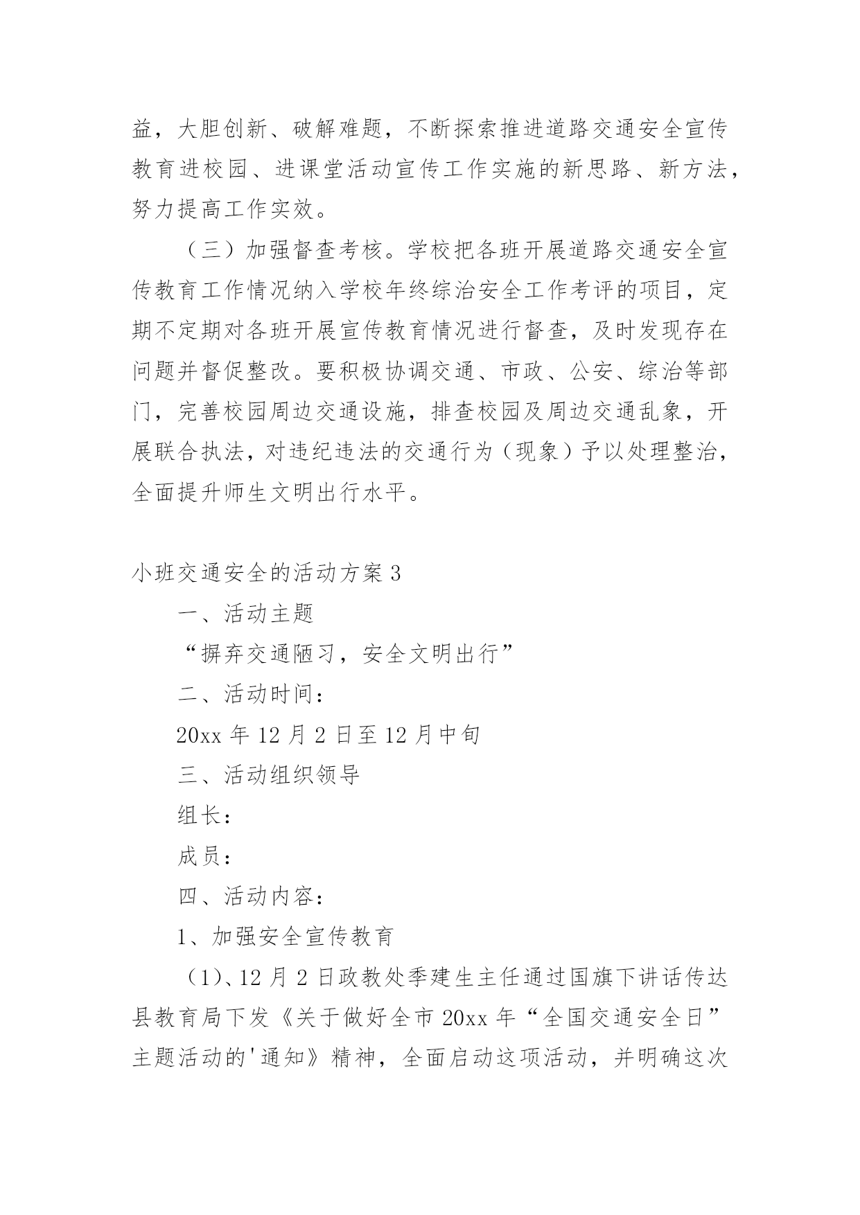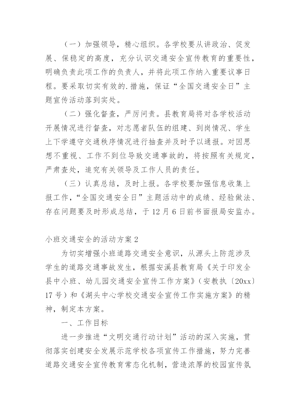 小班交通安全的活动方案为确保事情或工作顺利开展,就不得不需要事先制定方案,方案指的是为某一次行动所制定的计划类文书。那么优秀的方案是什么样的呢?以下是小编收集整理的小班交通安全的活动方案,欢迎阅读,希望大家能够喜欢。小班交通安全的活动方案1一、活动主题今年12月2日是国务院批准设立的第xx个“全国交通安全日”,主题为“xxx”。二、活动目标通过开展“全国交通安全日”主题活动,进一步提高广大师生及家长的交通安全意识和交通文明素质,引导广大师生及家长自觉遵守交通法律法规,使学校周边交通秩序和交通安全状况得到明显改善。三、活动时间:持续做好“全国交通安全日”主题活动的宣传发动,11月上旬到中旬为预热期,宣传造势;11月下旬至12月2日为集中宣传期,形成宣传热点;12月2日至4日为后续宣传期,提升“全国交通安全日”影响力。四、工作措施:(一)多形式开展交通法治宣传。各学校要充分利用各类载体,推进交通安全法律法规、安全知识进校园、进课堂。要组织召开“全国交通安全日”主题活动动员会,发放一封《致学生和家长交通安全教育公开信》,出一期交通安全宣传专栏,同时以“我身边的不文明交通行为”为主题,上一节交通安全主题团(队)会,组织师生参加一次“警营开放日”活动。(二)深入排查校园周边道路状况。各学校要主动与辖区交警、交通运输部门联系,对学校周边交通信号灯、交通标识、人行道等设施,集中进行一次全面检查,进一步完善相关交通安全设施。对农村“村村通”公路的通行状况进行摸底,对道路过窄、缺少减速带、桥梁隐患等,要协调地方政府及相关部门,迅速采取改进措施,彻底消除校园周边道路交通事故隐患。(三)强化校车安全管理。戴楼、闵桥、涂沟、金北、前锋等学校要建立健全校车安全管理制度,完善校车安全管理档案,做到一车一档。要组织召开一次乘坐校车学生家长会;配合相关职能部门,扎实开展一次校车安全检查,重点排查校车行驶道路两边的标识、警示标牌、隔离护栏、车辆减速设施等建设情况,校车“六定”管理模式落实情况以及校车交通违法行为等,发现问题,要及时进行整改。(四)组建交通安全志愿者队伍。城区所有学校,要迅速组建由教师和学生组成的志愿者队伍。上下学期间,在校园周边主要路口,引导学生有序通过马路,及时制止学生不文明行为,减少交通安全隐患。五、活动要求:(一)加强领导,精心组织。各学校要从讲政治、促发展、保稳定的高度,充分认识交通安全宣传教育的重要性,明确负责此项工作的负责人,并将此项工作纳入重要议事日程。要采取切实有效的.措施,保证“全国交通安全日”主题宣传活动落到实处。(二)强化督查,严厉问责。县教育局将对各学校活动开展情况进行督查,对志愿者队伍的组建、到岗情况、学生上下学遵守交通秩序情况进行抽查并及时予以通报。对因思想不重视、工作不到位导致交通事故的,将按照有关规定,严肃查处,追究有关领导及工作人员的责任。(三)认真总结,及时上报。各学校要加强信息收集上报工作,“全国交通安全日”主题活动中的成绩、经验做法、存在问题要及时形成总结,于12月6日前书面报局安监办。小班交通安全的活动方案2为切实增强小班道路交通安全意识,从源头上防范涉及学生的道路交通事故发生,根据安溪县教育局《关于印发全县中小班、幼儿园交通安全宣传工作方案》(安教执〔20xx〕17号)和《湖头中心学校交通安全宣传工作实施方案》的精神,制定本方案。一、工作目标进一步推进“文明交通行动计划”活动的深入实施,贯彻落实创建安全发展示范学校各项宣传工作措施,努力完善道路交通安全宣传教育常态化机制,营造浓厚的校园宣传氛围,实现学校道路交通安全宣传教育效果明显提升。二、主要措施(一)构建宣传教育常态化机制学校要制定落实道路交通安全宣传教育的工作方案,落实人员和经费,强化责任制,健全工作机制,积极开展交通安全宣传教育进校园、进课堂活动,大力宣传交通安全法律法规,做到每月有交通安全宣传专题,持续开展公益宣传教育活动,使交通安全宣传更加深入人心。(二)营造宣传教育氛围学校悬挂的有关道路交通安全的宣传标语、警句、横幅、宣传图的内容要进行定期更新和完善。要充分利用学校的校园广播、专栏专版等开展交通安全常态化宣传,播放交通安全宣传标语和安全提示语,努力营造浓厚的校园氛围。(三)拓宽宣传教育途径学校要通过组织文明交通知识竞赛、征文比赛、绘画比赛、培训讲座等活动,大力开展“安全教育周(日)”、“十一”、少先队日、“122”交通安全宣传日、全国安全生产月等主题宣传活动,提升广大师生的交通安全意识和文明意识。通过短信、校讯通、校园网络等媒介,进行交通安全宣传提示。要制定培训计划,选派骨干教师参加区级及区级以上的交通安全知识培训,再由受训教师组织本单位其他人员进行培训,着力提高广大教师开展交通安全宣传教育的能力,引导全体师生自觉践行文明交通。(四)