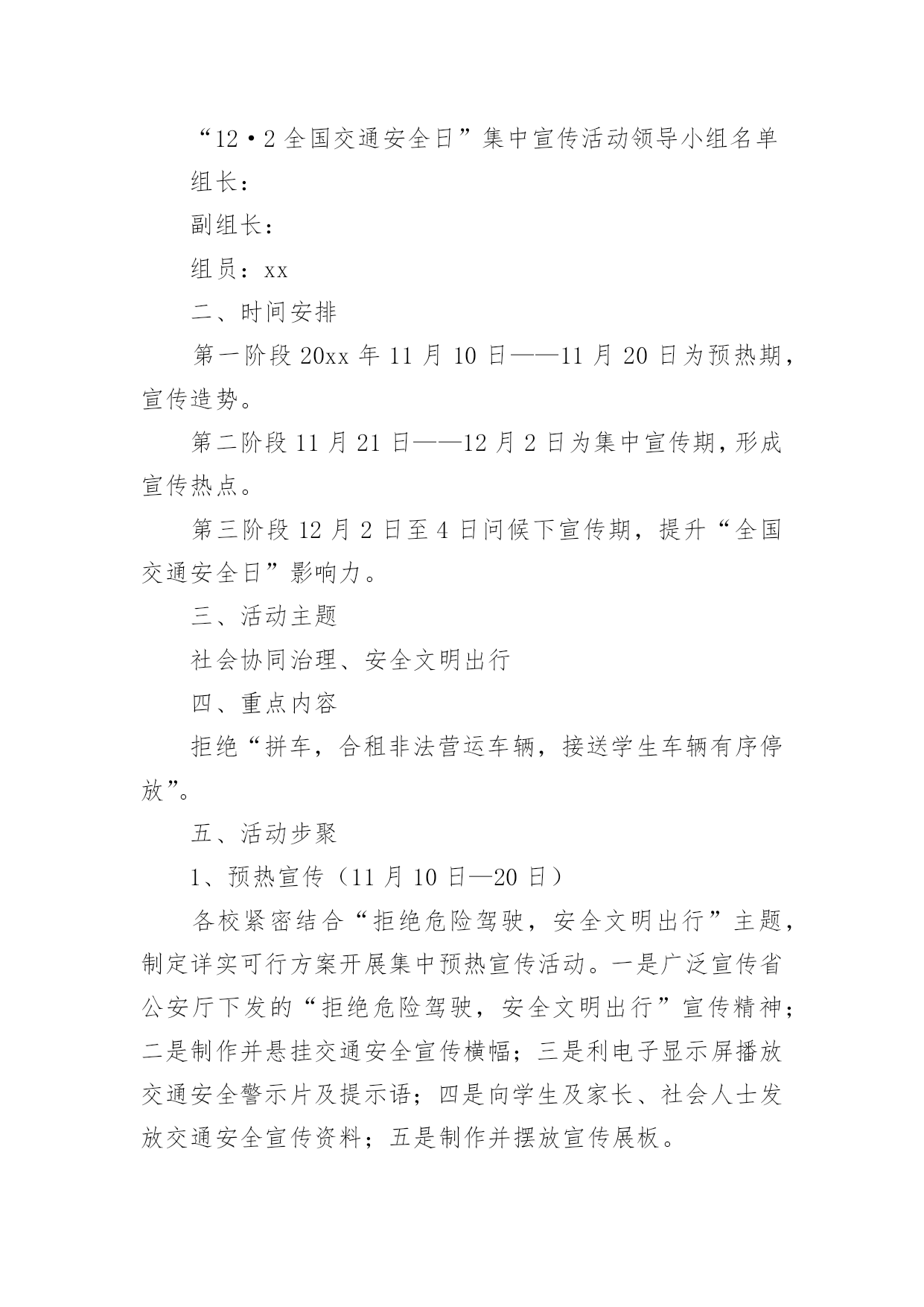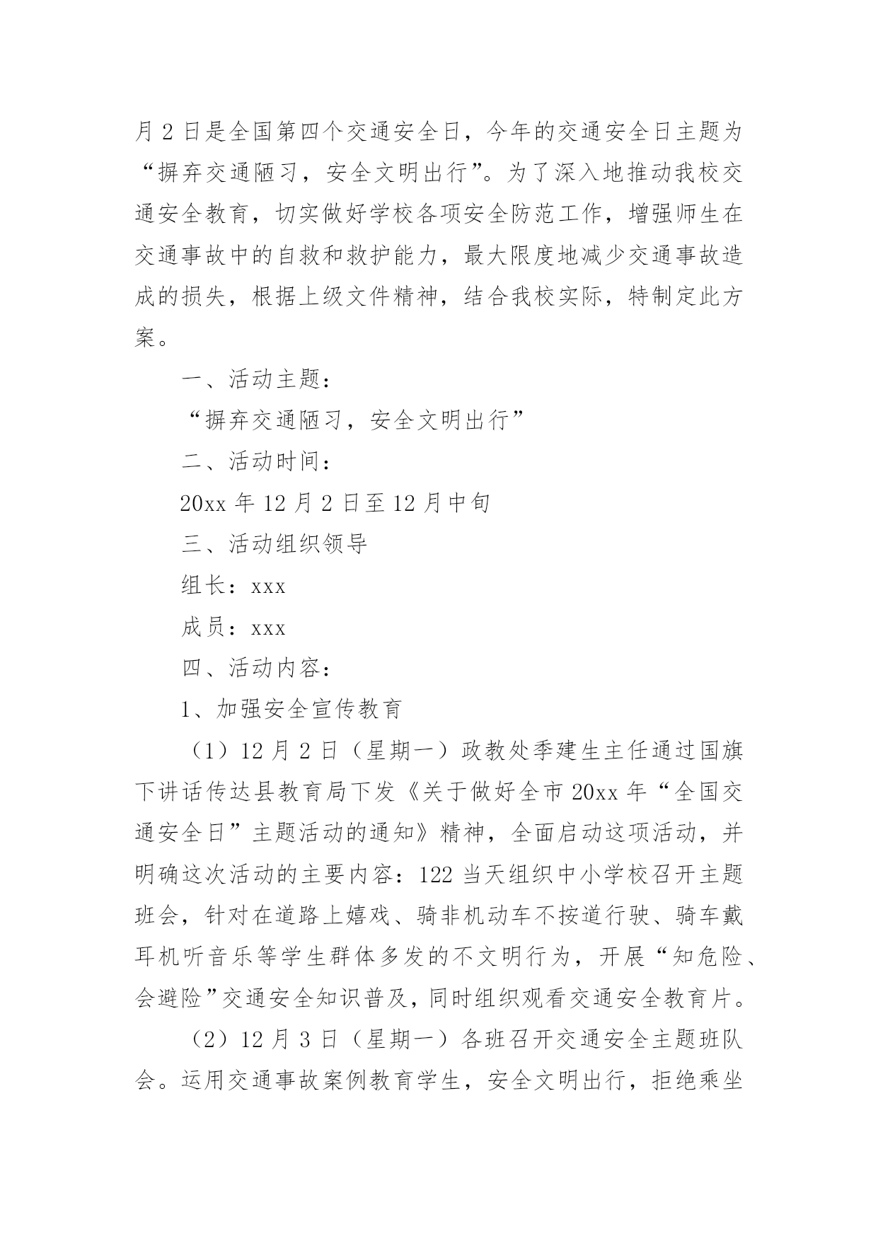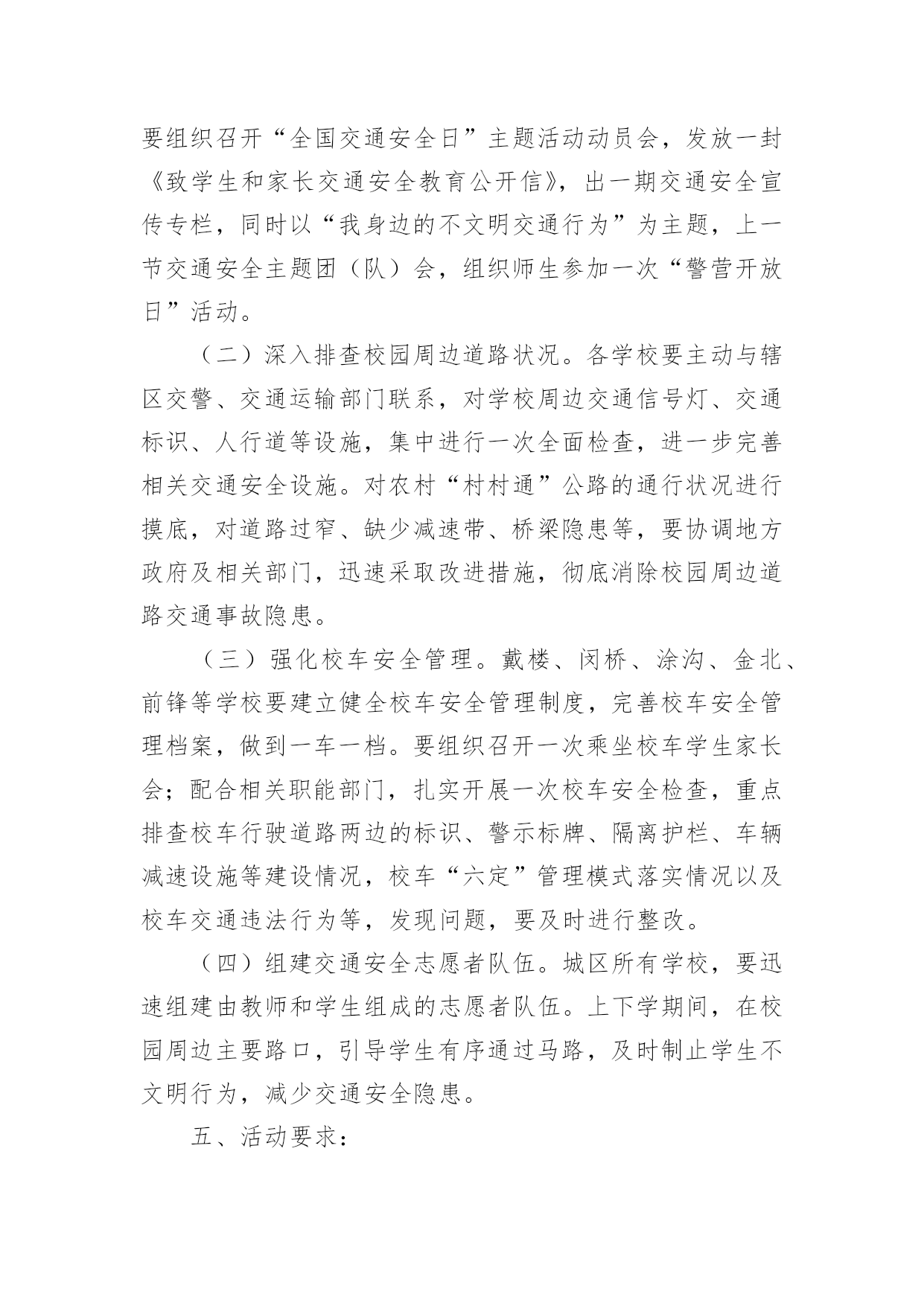 小班交通安全的活动方案为确保事情或工作顺利开展,就不得不需要事先制定方案,方案指的是为某一次行动所制定的计划类文书。那么优秀的方案是什么样的呢?以下是小编收集整理的小班交通安全的活动方案,欢迎阅读,希望大家能够喜欢。小班交通安全的活动方案1一、活动主题今年12月2日是国务院批准设立的第xx个“全国交通安全日”,主题为“xxx”。二、活动目标通过开展“全国交通安全日”主题活动,进一步提高广大师生及家长的交通安全意识和交通文明素质,引导广大师生及家长自觉遵守交通法律法规,使学校周边交通秩序和交通安全状况得到明显改善。三、活动时间:持续做好“全国交通安全日”主题活动的宣传发动,11月上旬到中旬为预热期,宣传造势;11月下旬至12月2日为集中宣传期,形成宣传热点;12月2日至4日为后续宣传期,提升“全国交通安全日”影响力。四、工作措施:(一)多形式开展交通法治宣传。各学校要充分利用各类载体,推进交通安全法律法规、安全知识进校园、进课堂。要组织召开“全国交通安全日”主题活动动员会,发放一封《致学生和家长交通安全教育公开信》,出一期交通安全宣传专栏,同时以“我身边的不文明交通行为”为主题,上一节交通安全主题团(队)会,组织师生参加一次“警营开放日”活动。(二)深入排查校园周边道路状况。各学校要主动与辖区交警、交通运输部门联系,对学校周边交通信号灯、交通标识、人行道等设施,集中进行一次全面检查,进一步完善相关交通安全设施。对农村“村村通”公路的通行状况进行摸底,对道路过窄、缺少减速带、桥梁隐患等,要协调地方政府及相关部门,迅速采取改进措施,彻底消除校园周边道路交通事故隐患。(三)强化校车安全管理。戴楼、闵桥、涂沟、金北、前锋等学校要建立健全校车安全管理制度,完善校车安全管理档案,做到一车一档。要组织召开一次乘坐校车学生家长会;配合相关职能部门,扎实开展一次校车安全检查,重点排查校车行驶道路两边的标识、警示标牌、隔离护栏、车辆减速设施等建设情况,校车“六定”管理模式落实情况以及校车交通违法行为等,发现问题,要及时进行整改。(四)组建交通安全志愿者队伍。城区所有学校,要迅速组建由教师和学生组成的志愿者队伍。上下学期间,在校园周边主要路口,引导学生有序通过马路,及时制止学生不文明行为,减少交通安全隐患。五、活动要求:(一)加强领导,精心组织。各学校要从讲政治、促发展、保稳定的高度,充分认识交通安全宣传教育的重要性,明确负责此项工作的负责人,并将此项工作纳入重要议事日程。要采取切实有效的.措施,保证“全国交通安全日”主题宣传活动落到实处。(二)强化督查,严厉问责。县教育局将对各学校活动开展情况进行督查,对志愿者队伍的组建、到岗情况、学生上下学遵守交通秩序情况进行抽查并及时予以通报。对因思想不重视、工作不到位导致交通事故的,将按照有关规定,严肃查处,追究有关领导及工作人员的责任。(三)认真总结,及时上报。各学校要加强信息收集上报工作,“全国交通安全日”主题活动中的成绩、经验做法、存在问题要及时形成总结,于12月6日前书面报局安监办。小班交通安全的活动方案2为切实增强小班道路交通安全意识,从源头上防范涉及学生的道路交通事故发生,根据安溪县教育局《关于印发全县中小班、幼儿园交通安全宣传工作方案》(安教执〔20xx〕17号)和《湖头中心学校交通安全宣传工作实施方案》的精神,制定本方案。一、工作目标进一步推进“文明交通行动计划”活动的深入实施,贯彻落实创建安全发展示范学校各项宣传工作措施,努力完善道路交通安全宣传教育常态化机制,营造浓厚的校园宣传氛围,实现学校道路交通安全宣传教育效果明显提升。二、主要措施(一)构建宣传教育常态化机制学校要制定落实道路交通安全宣传教育的工作方案,落实人员和经费,强化责任制,健全工作机制,积极开展交通安全宣传教育进校园、进课堂活动,大力宣传交通安全法律法规,做到每月有交通安全宣传专题,持续开展公益宣传教育活动,使交通安全宣传更加深入人心。(二)营造宣传教育氛围学校悬挂的有关道路交通安全的宣传标语、警句、横幅、宣传图的内容要进行定期更新和完善。要充分利用学校的校园广播、专栏专版等开展交通安全常态化宣传,播放交通安全宣传标语和安全提示语,努力营造浓厚的校园氛围。(三)拓宽宣传教育途径学校要通过组织文明交通知识竞赛、征文比赛、绘画比赛、培训讲座等活动,大力开展“安全教育周(日)”、“十一”、少先队日、“122”交通安全宣传日、全国安全生产月等主题宣传活动,提升广大师生的交通安全意识和文明意识。通过短信、校讯通、校园网络等媒介,进行交通安全宣传提示。要制定培训计划,选派骨干教师参加区级及区级以上的交通安全知识培训,再由受训教师组织本单位其他人员进行培训,着力提高广大教师开展交通安全宣传教育的能力,引导全体师生自觉践行文明交通。(四)