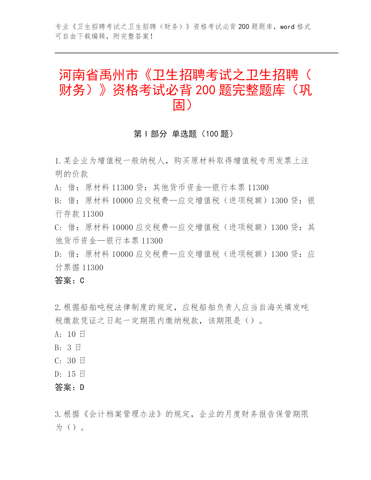 河南省禹州市《卫生招聘考试之卫生招聘(财务)》资格考试必背200题完整题库(巩固)