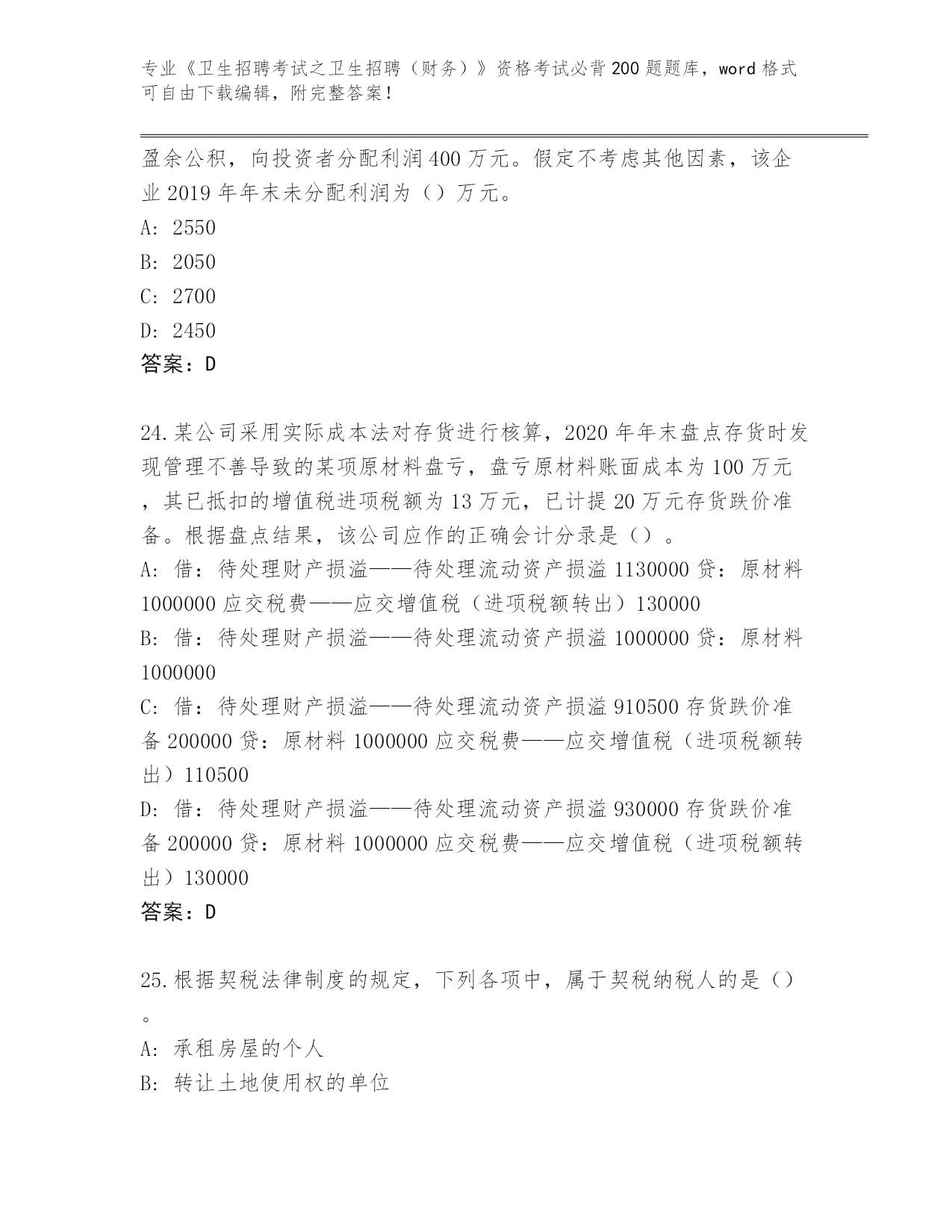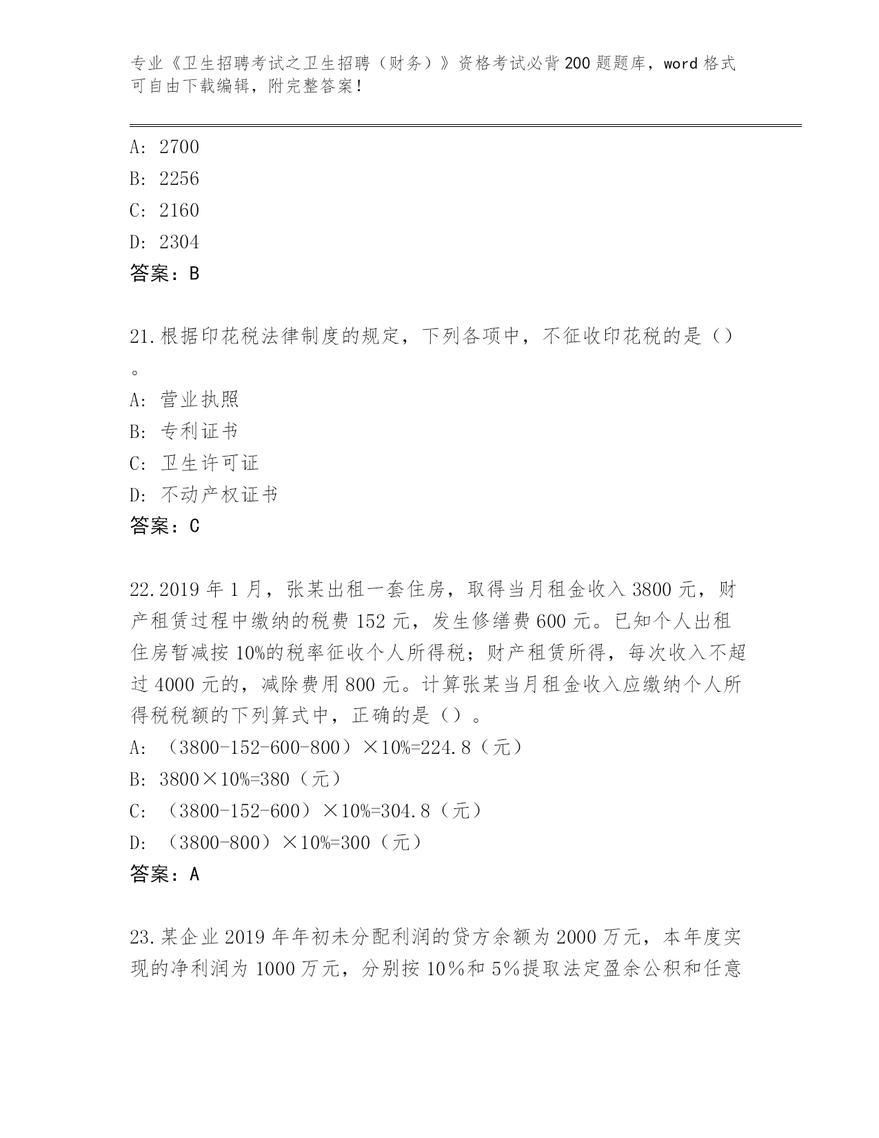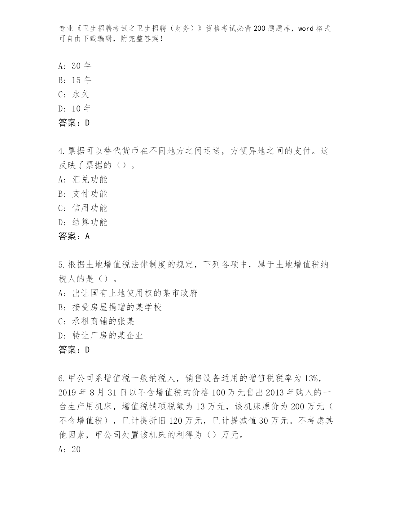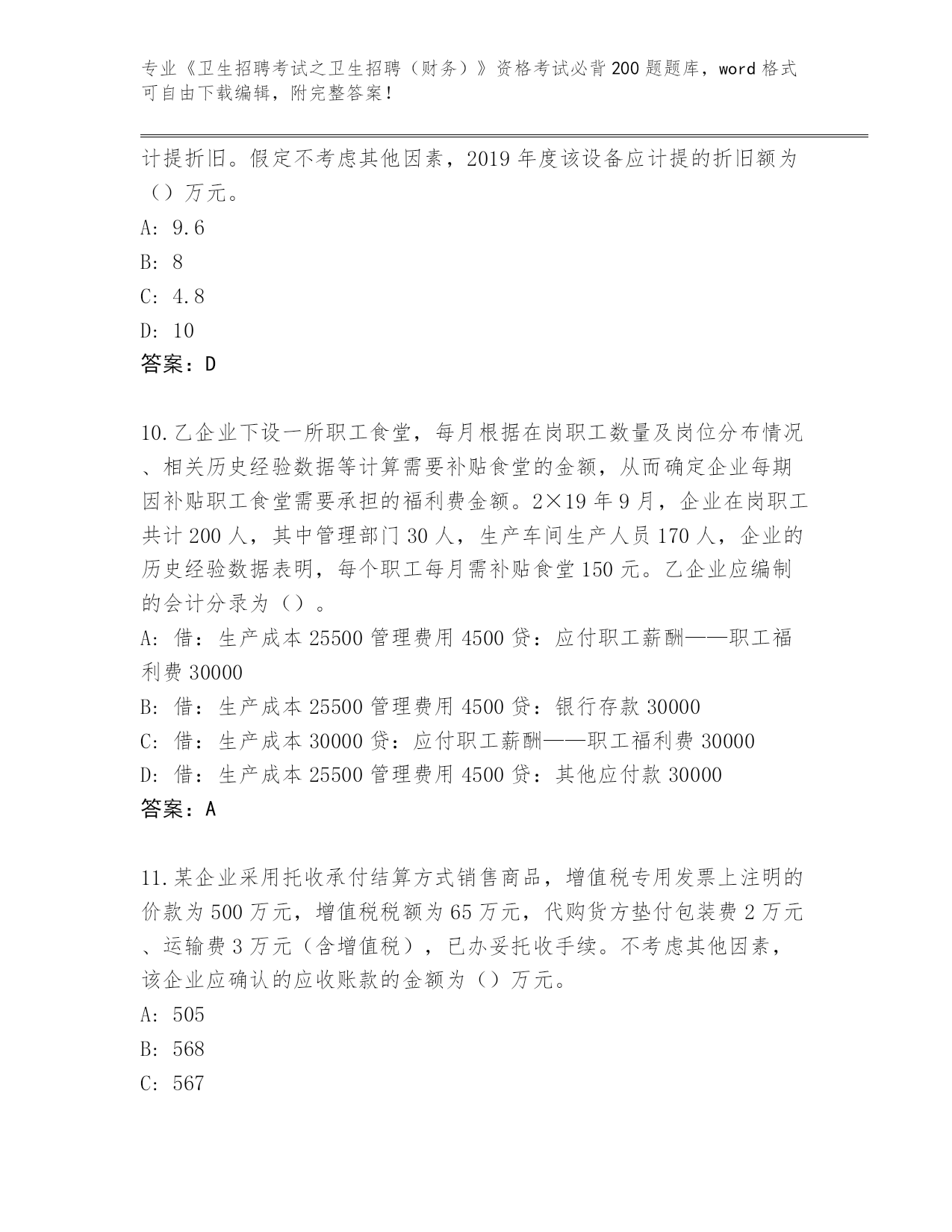 河南省禹州市2024年《卫生招聘考试之卫生招聘(财务)》考试必背200题王牌题库答案下载