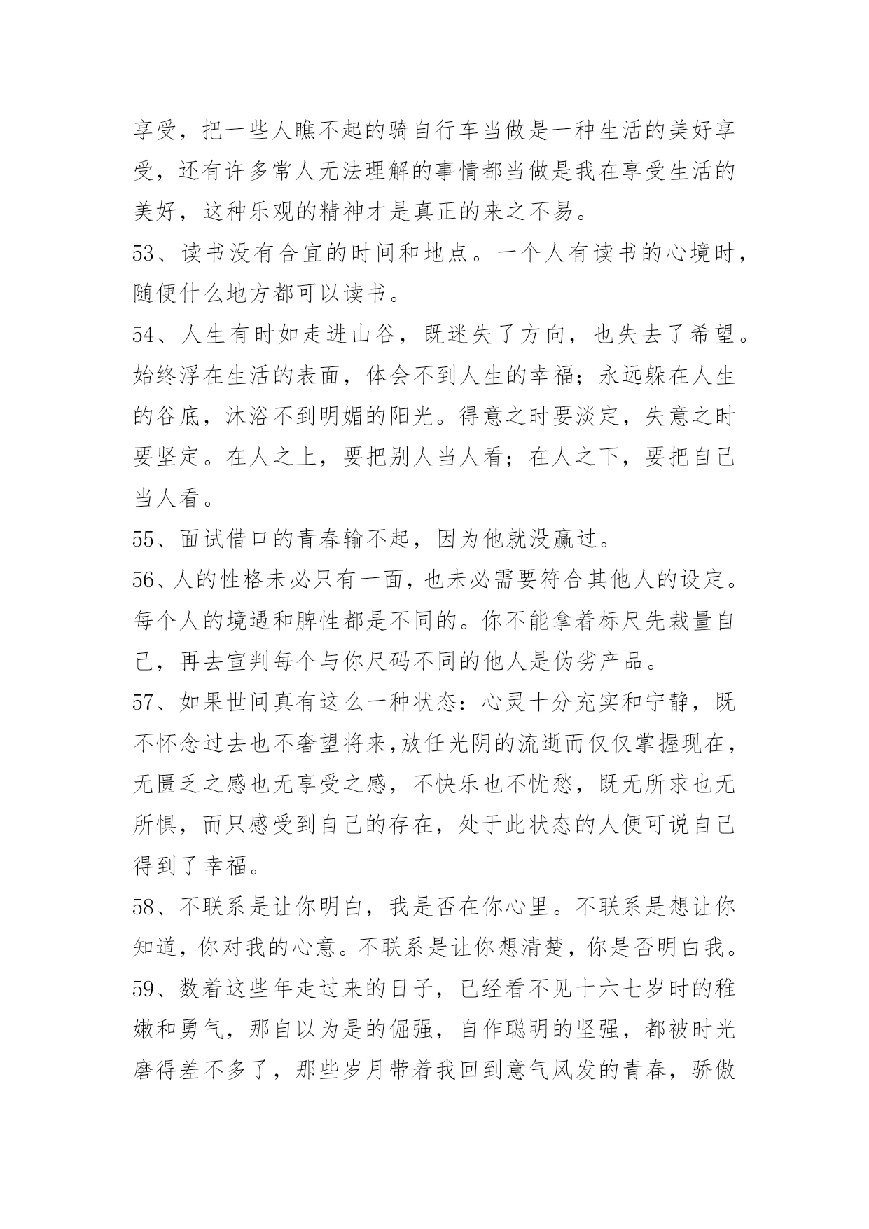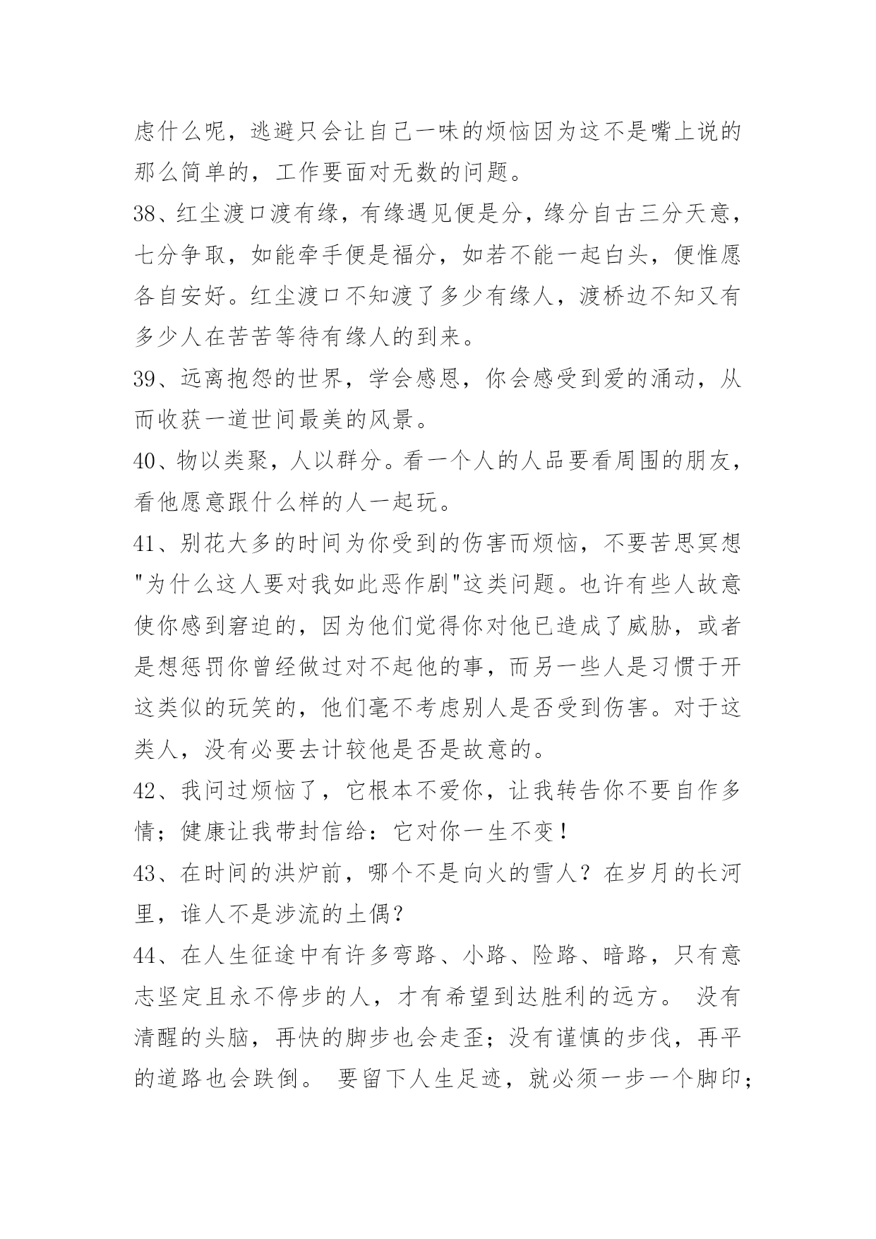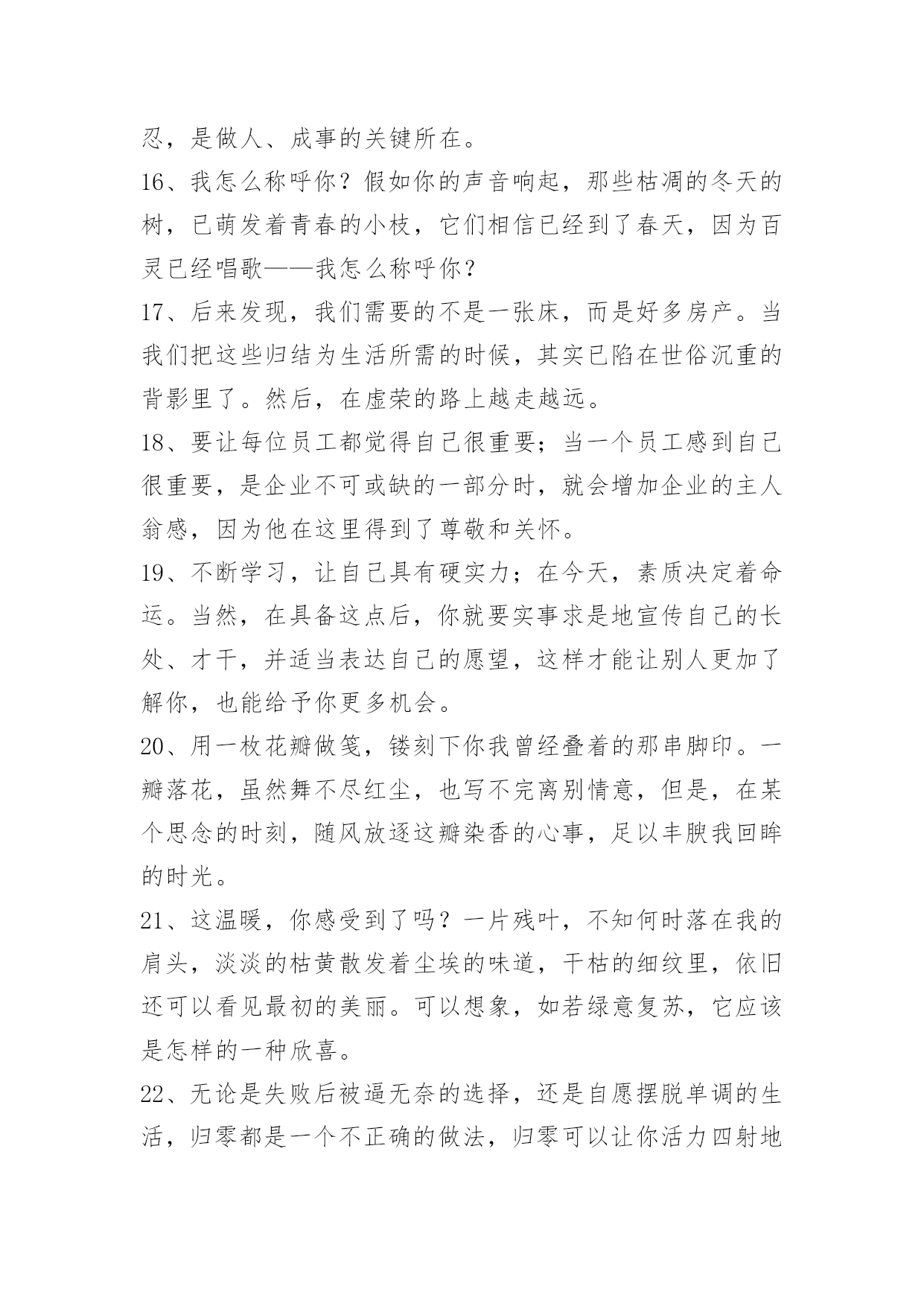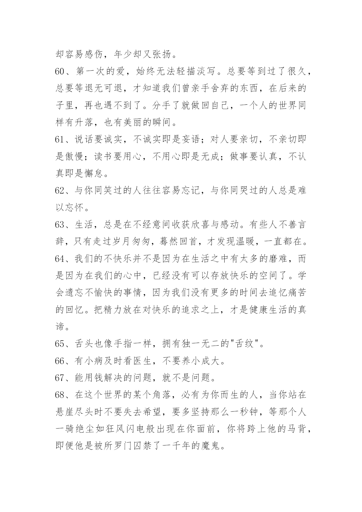 生活唯美说说句子关于生活唯美说说句子(精选200句)生活就这样平淡的过去,我们也会偶尔激起梦想火花,失败也击败不了它。下面是小编特意为各位读者准备的生活唯美说说句子,仅供参考,欢迎大家阅读。1、痴情宛如一杯不加糖的咖啡,苦涩滋味,叫人喝不下去,又不舍得丢弃,慢慢品味,寂寞无奈。痴情,是甜蜜,是忧伤,是希望,也是遥遥无期的等待。只有在他痴情的泪眼中,捕获到一丝悲哀,一丝无望,痴痴等待,只会带来无限的伤害。2、女人坚强点,不要让爱情毁了自己。3、当你终于放下过去,拥抱明天的时候,那么你将是会发现全世界都是在帮你。生命匆匆而过,做生活的智者,生活就是奋斗,只有勇于攀登才能创造辉煌。4、上帝关上了一扇门,必然会为你打开另一扇窗。你失去了一种东西,必然会在其他地方收获另一个馈赠。关键是,我们要有乐观的心态,相信有失必有得。要舍得放弃,正确对待你的失去,因为失去可能是一种生活福音,它预示着你的另一种获得。大舍大得,小舍小得,不舍不得。5、为爱坚持的人,记得坚持能够,但是不好为爱受伤。6、我只想要这种小小小小资的简单生活!7、生活的禅法,并不是否定什么对立,而是去掉我执,活出内心的一份光明,平静中的欢喜,疲惫中的复苏,不盲从于那些烦恼的干扰,活出生命真正恬淡的气息,岁月安然,心也安然,两两相守,两两相忘。8、树立自己心中终身的偶像一至三人,并效法他。9、不后悔过往,不浪费现在,满怀梦想,面对未来。10、很多事都要靠等待,才会有好结果。但是,等待,并不意味着什么都不需做。所有事情有好结果,都需要人们既做,也同时等待。作家要持续不断的写,然后等待写出好作品那天。科学家要持续不断研究,然后等待运气降临。等待不是一个静止状态,而是需要你持续不断的做某些事情,最后等到上帝的眷顾。11、当你面对蓝天的时候,你要学会翱翔长空;当你面对高山的时候,你要学会坚韧不拔;当你面对长河的时候,你要学会奔流不息。人,决不可驻足停留。12、做与不做的最大的区别是:后者拥有对前者的评论权。13、俗话说,人心不足蛇吞象。欲望过多就会让自己难以满足,甚至会憎恨别人的拥有,或忌妒别人拥有的更多。欲望太多,其实就是"心里贫穷"。14、或许,不仅仅是自己爱不爱对方的问题,大概是错过了能够在一起的机缘,难再续。是的,可能自己是喜欢对方的,可是,却无论如何也爱不起来。15、忍,是一种大智慧,一种大勇气,吏是一种大福气。忍,是人生的一门必修课,是人生的一门艺术课,甚至有时也是人生的一种修行。忍天下难忍之事,难忍能忍,忍人所不能忍,是做人、成事的关键所在。16、我怎么称呼你?假如你的声音响起,那些枯凋的冬天的树,已萌发着青春的小枝,它们相信已经到了春天,因为百灵已经唱歌——我怎么称呼你?17、后来发现,我们需要的不是一张床,而是好多房产。当我们把这些归结为生活所需的时候,其实已陷在世俗沉重的背影里了。然后,在虚荣的路上越走越远。18、要让每位员工都觉得自己很重要;当一个员工感到自己很重要,是企业不可或缺的一部分时,就会增加企业的主人翁感,因为他在这里得到了尊敬和关怀。19、不断学习,让自己具有硬实力;在今天,素质决定着命运。当然,在具备这点后,你就要实事求是地宣传自己的长处、才干,并适当表达自己的愿望,这样才能让别人更加了解你,也能给予你更多机会。20、用一枚花瓣做笺,镂刻下你我曾经叠着的那串脚印。一瓣落花,虽然舞不尽红尘,也写不完离别情意,但是,在某个思念的时刻,随风放逐这瓣染香的心事,足以丰腴我回眸的时光。21、这温暖,你感受到了吗?一片残叶,不知何时落在我的肩头,淡淡的枯黄散发着尘埃的味道,干枯的细纹里,依旧还可以看见最初的美丽。可以想象,如若绿意复苏,它应该是怎样的一种欣喜。22、无论是失败后被逼无奈的选择,还是自愿摆脱单调的生活,归零都是一个不正确的做法,归零可以让你活力四射地迎接新生活,让你热爱生命中的每一天。23、我是应该唏嘘还是应该感谢?别人教会你这些,陪着你长大,然后你们分开,再转到我的身边。我是应该庆幸吧,看到的你已是稳重大方,彬彬有礼,知道对女生该说什么话,如何讨人喜欢。可是我多么想有一个人和我一起成长,和我一起年少轻狂,少不更事,从青涩到成熟都只是同一个人,成长的痕迹在对方眼中就能看到。二十多年的岁月中有十几年是和他相伴,然后一起让小时候的梦想一步步都成为现实。遗憾的是,所有的旅伴都是暂时的,我终于还是自己长大了,跟着不同的队伍,最后还是一个人、孤独地长大了。24、漫长的人生道路,并不会如想象中那般一帆风顺。也许,你只有经过了大浪的洗礼,才能到达海的彼岸;也许,你只有经受住夏日般炙热的照射,才能迎来丰收的秋季;也许,你只有经受冬季刺骨寒风的冲刷,才能迎来春暖花开;也许,你只有经受大漠荒凉、干涸的折磨,才可以获得绵绵细雨的润泽。只要我们不再抱怨,坦然以对,就一定