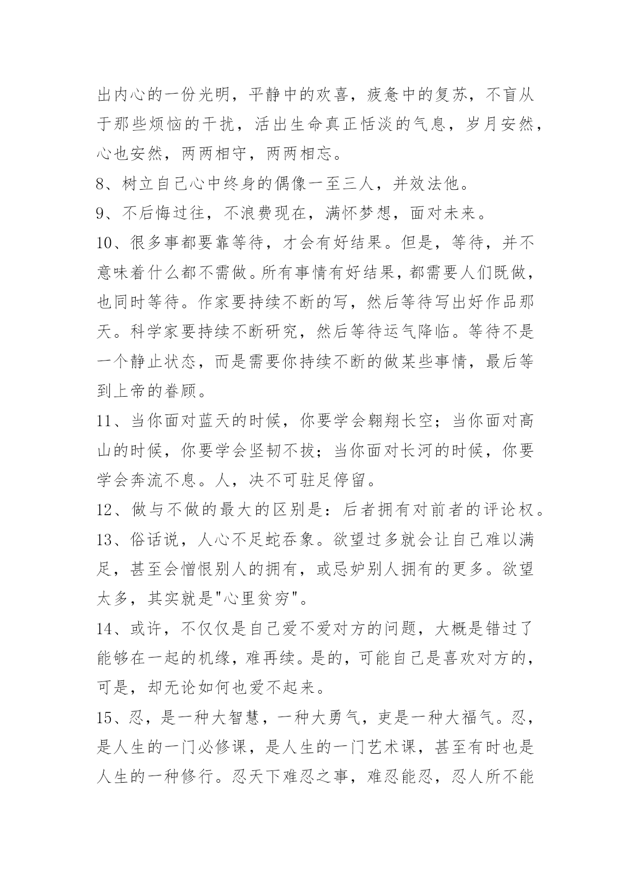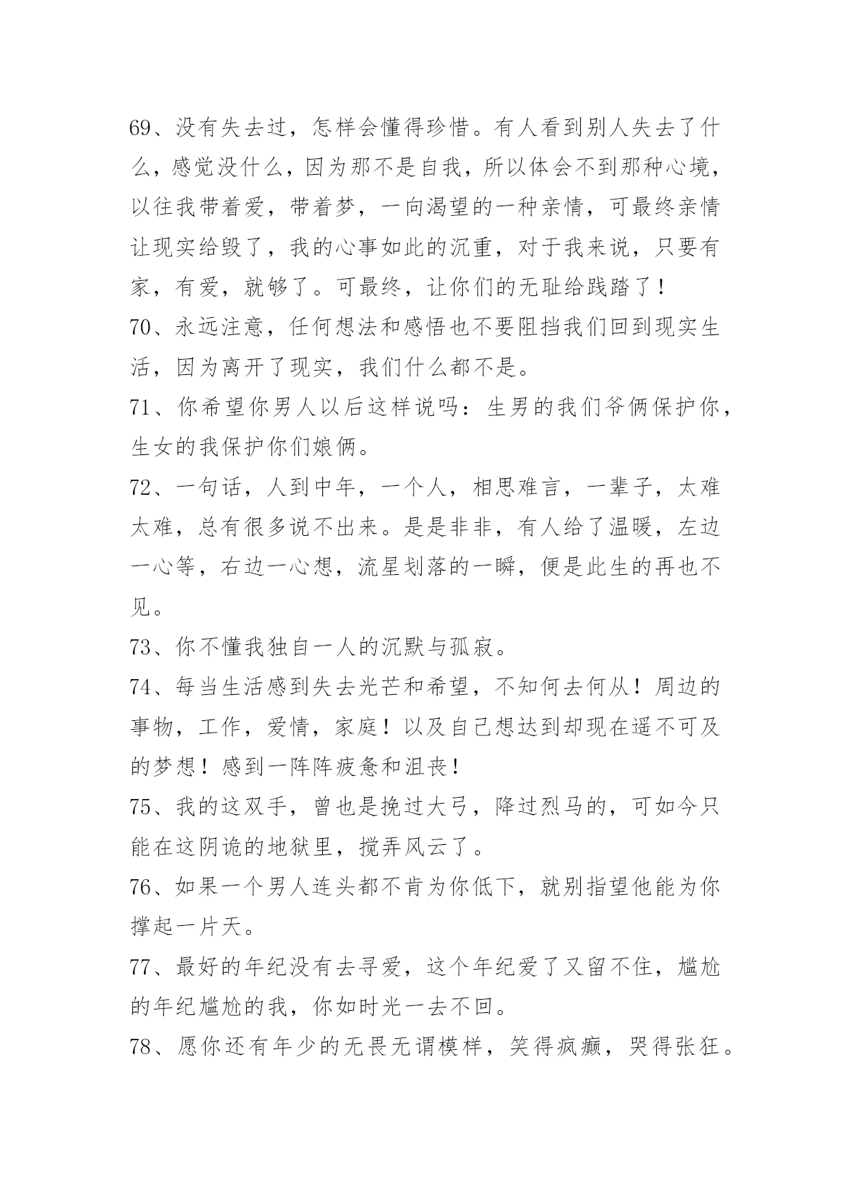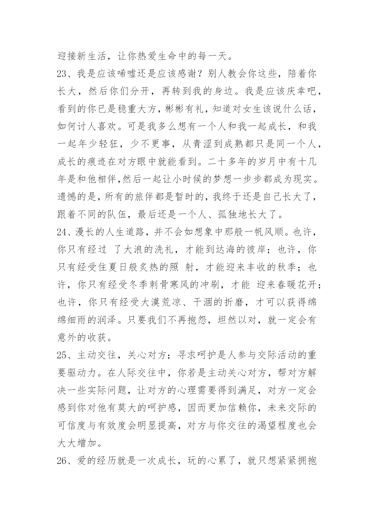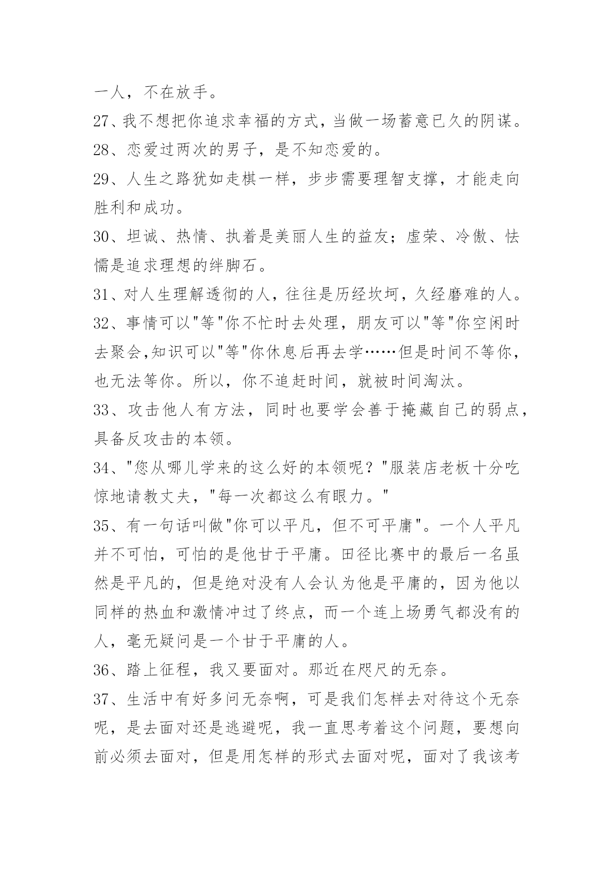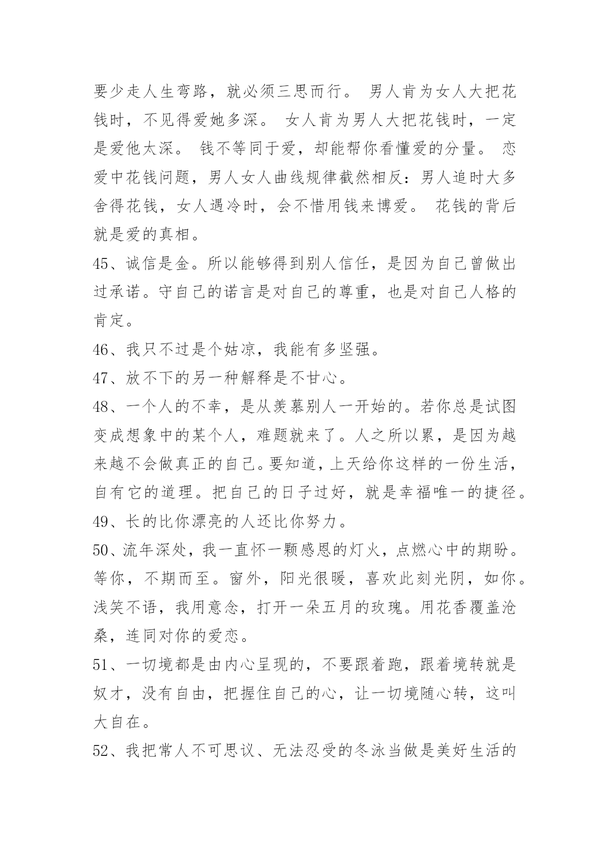 生活唯美说说句子关于生活唯美说说句子(精选200句)生活就这样平淡的过去,我们也会偶尔激起梦想火花,失败也击败不了它。下面是小编特意为各位读者准备的生活唯美说说句子,仅供参考,欢迎大家阅读。1、痴情宛如一杯不加糖的咖啡,苦涩滋味,叫人喝不下去,又不舍得丢弃,慢慢品味,寂寞无奈。痴情,是甜蜜,是忧伤,是希望,也是遥遥无期的等待。只有在他痴情的泪眼中,捕获到一丝悲哀,一丝无望,痴痴等待,只会带来无限的伤害。2、女人坚强点,不要让爱情毁了自己。3、当你终于放下过去,拥抱明天的时候,那么你将是会发现全世界都是在帮你。生命匆匆而过,做生活的智者,生活就是奋斗,只有勇于攀登才能创造辉煌。4、上帝关上了一扇门,必然会为你打开另一扇窗。你失去了一种东西,必然会在其他地方收获另一个馈赠。关键是,我们要有乐观的心态,相信有失必有得。要舍得放弃,正确对待你的失去,因为失去可能是一种生活福音,它预示着你的另一种获得。大舍大得,小舍小得,不舍不得。5、为爱坚持的人,记得坚持能够,但是不好为爱受伤。6、我只想要这种小小小小资的简单生活!7、生活的禅法,并不是否定什么对立,而是去掉我执,活出内心的一份光明,平静中的欢喜,疲惫中的复苏,不盲从于那些烦恼的干扰,活出生命真正恬淡的气息,岁月安然,心也安然,两两相守,两两相忘。8、树立自己心中终身的偶像一至三人,并效法他。9、不后悔过往,不浪费现在,满怀梦想,面对未来。10、很多事都要靠等待,才会有好结果。但是,等待,并不意味着什么都不需做。所有事情有好结果,都需要人们既做,也同时等待。作家要持续不断的写,然后等待写出好作品那天。科学家要持续不断研究,然后等待运气降临。等待不是一个静止状态,而是需要你持续不断的做某些事情,最后等到上帝的眷顾。11、当你面对蓝天的时候,你要学会翱翔长空;当你面对高山的时候,你要学会坚韧不拔;当你面对长河的时候,你要学会奔流不息。人,决不可驻足停留。12、做与不做的最大的区别是:后者拥有对前者的评论权。13、俗话说,人心不足蛇吞象。欲望过多就会让自己难以满足,甚至会憎恨别人的拥有,或忌妒别人拥有的更多。欲望太多,其实就是"心里贫穷"。14、或许,不仅仅是自己爱不爱对方的问题,大概是错过了能够在一起的机缘,难再续。是的,可能自己是喜欢对方的,可是,却无论如何也爱不起来。15、忍,是一种大智慧,一种大勇气,吏是一种大福气。忍,是人生的一门必修课,是人生的一门艺术课,甚至有时也是人生的一种修行。忍天下难忍之事,难忍能忍,忍人所不能忍,是做人、成事的关键所在。16、我怎么称呼你?假如你的声音响起,那些枯凋的冬天的树,已萌发着青春的小枝,它们相信已经到了春天,因为百灵已经唱歌——我怎么称呼你?17、后来发现,我们需要的不是一张床,而是好多房产。当我们把这些归结为生活所需的时候,其实已陷在世俗沉重的背影里了。然后,在虚荣的路上越走越远。18、要让每位员工都觉得自己很重要;当一个员工感到自己很重要,是企业不可或缺的一部分时,就会增加企业的主人翁感,因为他在这里得到了尊敬和关怀。19、不断学习,让自己具有硬实力;在今天,素质决定着命运。当然,在具备这点后,你就要实事求是地宣传自己的长处、才干,并适当表达自己的愿望,这样才能让别人更加了解你,也能给予你更多机会。20、用一枚花瓣做笺,镂刻下你我曾经叠着的那串脚印。一瓣落花,虽然舞不尽红尘,也写不完离别情意,但是,在某个思念的时刻,随风放逐这瓣染香的心事,足以丰腴我回眸的时光。21、这温暖,你感受到了吗?一片残叶,不知何时落在我的肩头,淡淡的枯黄散发着尘埃的味道,干枯的细纹里,依旧还可以看见最初的美丽。可以想象,如若绿意复苏,它应该是怎样的一种欣喜。22、无论是失败后被逼无奈的选择,还是自愿摆脱单调的生活,归零都是一个不正确的做法,归零可以让你活力四射地迎接新生活,让你热爱生命中的每一天。23、我是应该唏嘘还是应该感谢?别人教会你这些,陪着你长大,然后你们分开,再转到我的身边。我是应该庆幸吧,看到的你已是稳重大方,彬彬有礼,知道对女生该说什么话,如何讨人喜欢。可是我多么想有一个人和我一起成长,和我一起年少轻狂,少不更事,从青涩到成熟都只是同一个人,成长的痕迹在对方眼中就能看到。二十多年的岁月中有十几年是和他相伴,然后一起让小时候的梦想一步步都成为现实。遗憾的是,所有的旅伴都是暂时的,我终于还是自己长大了,跟着不同的队伍,最后还是一个人、孤独地长大了。24、漫长的人生道路,并不会如想象中那般一帆风顺。也许,你只有经过了大浪的洗礼,才能到达海的彼岸;也许,你只有经受住夏日般炙热的照射,才能迎来丰收的秋季;也许,你只有经受冬季刺骨寒风的冲刷,才能迎来春暖花开;也许,你只有经受大漠荒凉、干涸的折磨,才可以获得绵绵细雨的润泽。只要我们不再抱怨,坦然以对,就一定