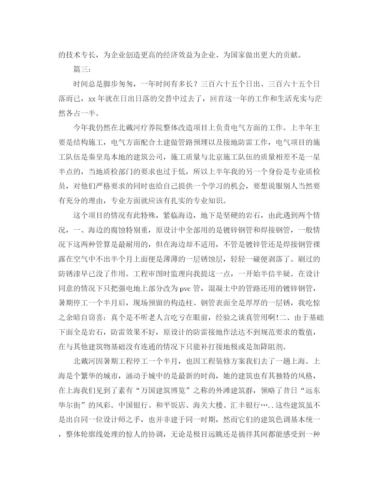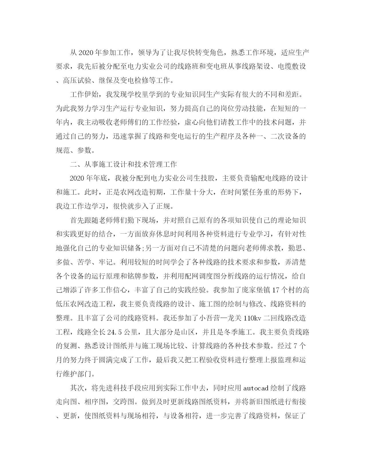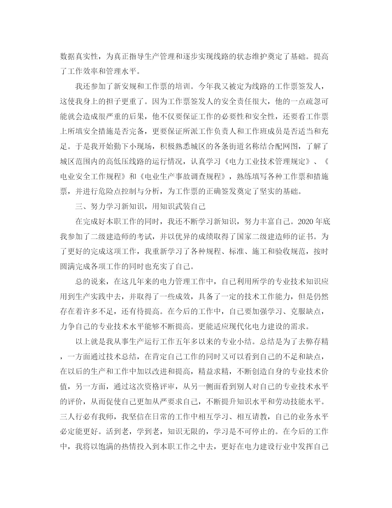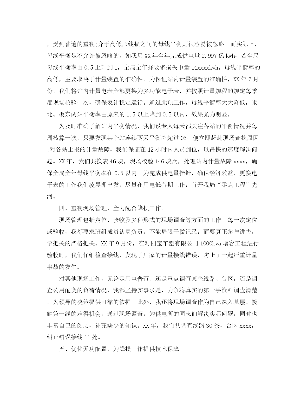 此资料由网络收集而来,如有侵权请告知上传者立即删除。资料共分享,我们负责传递知识。电力技术员个人工作总结三篇篇一:我于1996年参加工作,曾从事表计校验、用电检查等工作,现任经营部副部长,负责线损管理、计量管理、用电检查等工作。在几年的实践工作中,我虚心学习、刻苦锻炼,将书本知识与实践工作相结合,专业技术水平有了明显提高,现将我个人工作情况汇报如下:一、加强标准设备管理,确保量值传递的准确性。我们常说计量表计是电力企业经营活动中的“秤杆子”,那末标准计量设备则是校准“秤杆子”的工具,对电力企业具有非同一般的重要性。我局共有标准设备19套,为保证这些设备稳定健康运行,我主持建立了标准计量设备台帐,明确专人管理,定期送检,避免超期服役。对性能不太稳定的便携式单相表校验台,我们每年由生产厂家维护一次,不定期与其它标准做比对,出现问题及时解决,以免造成严重后果。XX年我们共送检标准设备12套,由于工作到位、措施得力,送检合格率达100,深受电研所领导的好评。二、搞好表计管理,维护供用电双方的合法权益。通过营业性普查,我们建立了表计台帐,将计量表计纳入规范化管理。我们确定了电表校验工作流程,由专人对台帐实行动态管理,以保证台帐与实际相一致。表计在校验前先核对台帐,登记工作记录,校验中由微机自动记录误差资料,校验后由专人更改表计台帐;若需换表则出据《计量装置更换记录》,并根据实际情况出据《计量装置退补电量报告书》。这样做的后果,有效的遏制了个别人通过电表做文章、为个人谋私利的不良行为。为保证电表校验质量,我们实行电表校验终身负责制,电表只要被确定为人为调整不合格误差,不论时间多久,都要追究校验人的责任,决不姑息。XX年,我们共校验电表4741块,电流互感器4814块,超出计划任务56.7,为全局降损节能提供了技术支持。三、狠抓母线平衡管理,消除线损管理的盲区。一般说,线损由高压线损和低压线损构成,这两级线损均有严格的考核制度,受到普遍的重视;介于高低压线损之间的母线平衡则很容易被忽略。而实际上,母线平衡是不允许被忽略的,如我局XX年全年完成供电量2.997亿kwh,若全局母线平衡率由0.5上升到1,全局全年择要多损失电量14xxxxkwh。母线平衡率的高低,主要取决于计量装置的准确性。为保证站内计量装置的准确性,XX年7月份,我们将站内计量电表全部更换为多功能电子表,并按照计量规程的规定每季度现场校验一次,确保表计稳定运行。通过此项工作,母线平衡率大大降低,米北、板东两站平衡率由原来的1.5以上降到0.5以内,效果尤为明显。为及时准确了解站内平衡情况,我们设专人每天都关注各站的平衡情况并每周核算一次,只要发现某个站连续两天平衡率超过05,便立即赶赴现场查找原因;对各站上报的计量故障,我们保证在12小时内人员到位,以最快的速度解决问题。XX年,我们共换表46块,现场校验146块次,处理站内计量故障xxxx,确保全局全年母线平衡率在0.5以内。为完成供电量指针,确保经济效益,更换电子表的工作我们凌晨即出发,尽量在用电低谷期工作,首开我局“零点工程”先河。四、重视现场管理,全力配合降损工作。现场管理包括定位、验收及多种形式的现场调查等方面的工作。每一次定位或验收,我都要求班组成员认真负责,不能局限于做记录,而要真正参与进去,该把关的严格把关。XX年9月份,在对四宝革塑有限公司1000kva增容工程进行验收时,我们仔细检查接线,发现了厂家的计量接线错误,防止了一起严重计量事故的发生。对其他现场工作,无论是用电普查、还是重点调查某些线路、台区,还是调查公用配变的负荷情况,我都坚持实事求是、力争将真实的第一手资料调查清楚,为领导的决策提供可靠的依据。此外,我还将现场调查作为自己深入基层、接触第一线的难得机会,通过现场调查,为供电所的同志们解决实际问题,同时也丰富自己的阅历,补充缺少的知识。XX年,我们共调查线路30条,台区xxxx,纠正错误接线11处。五、优化无功配置,为降损工作提供技术保障。无功管理是线损管理中的一个重要环节,对于无功管理,我不满足于供电所报几张表、填几个数,而是全身心的投入到这项工作中去。我一方面深入实际、多次到北沙、东阳、大步村等地,从改正无功表接线入手,帮助供电所人员测量用户的无功状况、为用户确定无功补偿方案、检察无功补偿效果;另一方面查阅相关数据、了解无功补偿最新动态,不断补充自己的头脑,为我局无功补偿工作寻求切实可行的工作方法。通过不懈努力,供电所的同志们及不少用电户对该项工作的认识不断提高,去年共增无功补偿量近10000kvar。六、完成的其它工作。一年来,我除完成以上几项工作外,还配和其它科室完成了农电工考核、汛期扬水机站设备检查等其它工作,不再详述。以上便是我一年来的工作情况,虽然