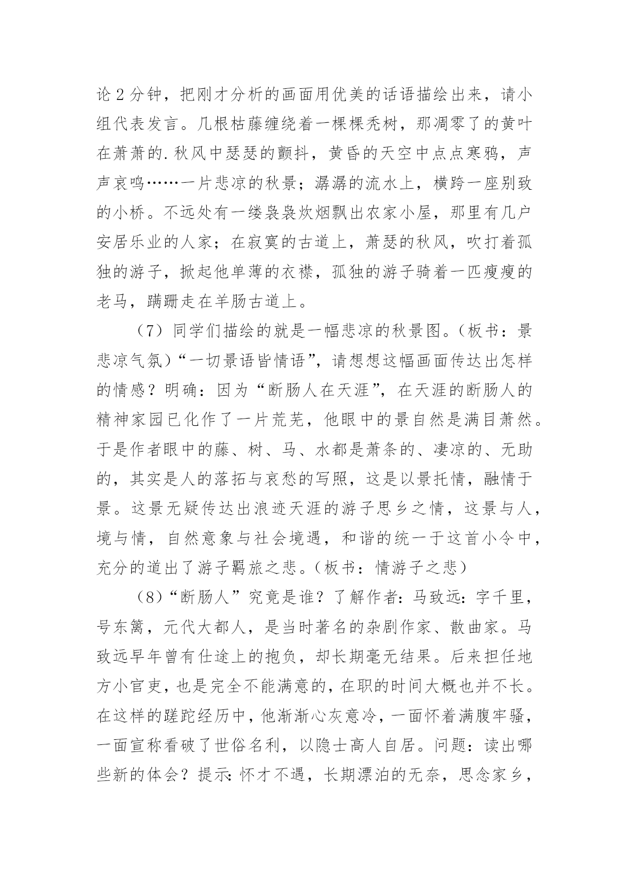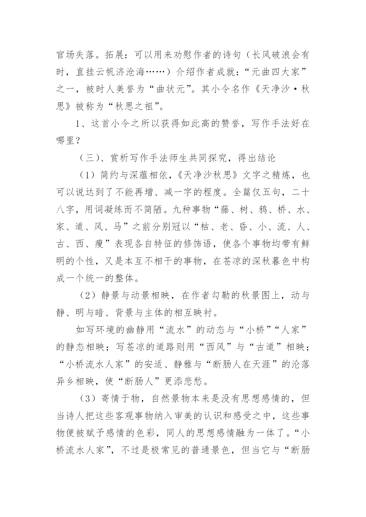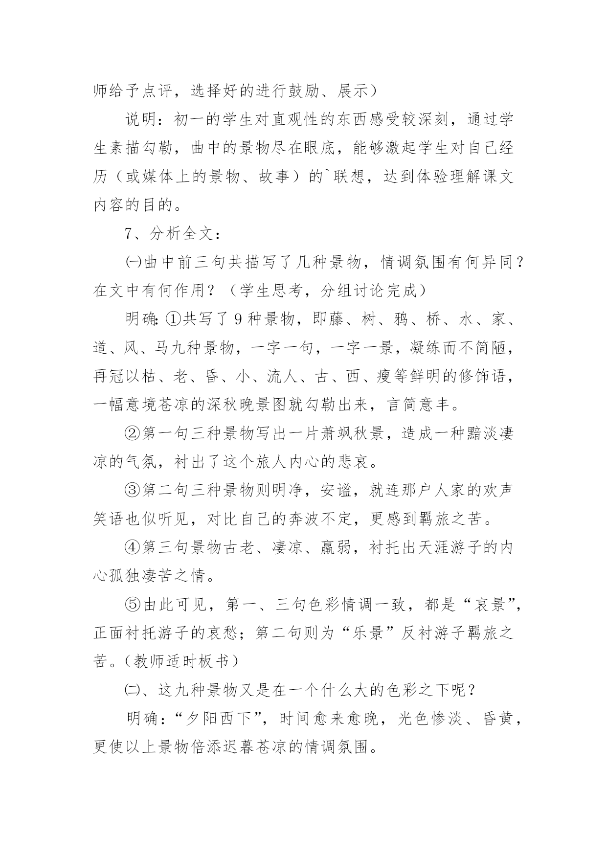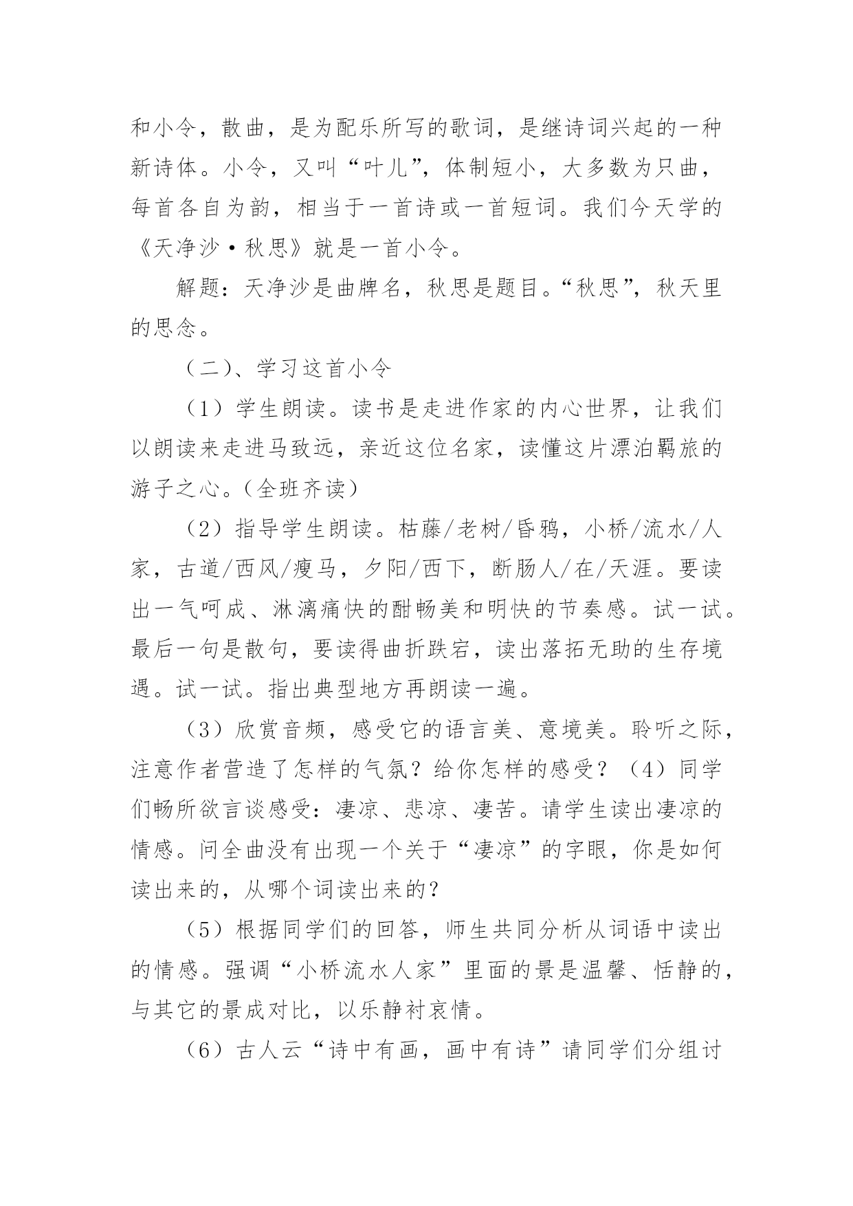 《天净沙秋思》教学设计《天净沙秋思》教学设计(精选10篇)作为一名教学工作者,通常需要用到教学设计来辅助教学,教学设计是把教学原理转化为教学材料和教学活动的计划。那么应当如何写教学设计呢?以下是小编为大家整理的《天净沙秋思》教学设计,欢迎阅读与收藏。《天净沙秋思》教学设计1一、学习目标1、朗诵、背诵2、感受意境、赏析3、学习这首小令的写作手法,学会寄情于物的写作手法二、教学重难点重点:学会分析景物渲染的氛围,帮助学生理解诗人的情感,体会诗人的心境难点:学会运用寄情于物的写作手法三、学习过程(一)、导入新课:大家还记得哪些表达思乡之情的句子呢?齐背(独在异乡为异客,每逢佳节倍思亲;春风又绿江南,明月何时照我还?仍怜故乡水,万里送行舟)今天要们要学习一首元曲《天净沙秋思》。大家都知道唐诗、宋词、元曲,作为第一次接触元代作品,我们首先来了解元曲。包括杂剧和散曲,散曲包括散套和小令,散曲,是为配乐所写的歌词,是继诗词兴起的一种新诗体。小令,又叫“叶儿”,体制短小,大多数为只曲,每首各自为韵,相当于一首诗或一首短词。我们今天学的《天净沙·秋思》就是一首小令。解题:天净沙是曲牌名,秋思是题目。“秋思”,秋天里的思念。(二)、学习这首小令(1)学生朗读。读书是走进作家的内心世界,让我们以朗读来走进马致远,亲近这位名家,读懂这片漂泊羁旅的游子之心。(全班齐读)(2)指导学生朗读。枯藤/老树/昏鸦,小桥/流水/人家,古道/西风/瘦马,夕阳/西下,断肠人/在/天涯。要读出一气呵成、淋漓痛快的酣畅美和明快的节奏感。试一试。最后一句是散句,要读得曲折跌宕,读出落拓无助的生存境遇。试一试。指出典型地方再朗读一遍。(3)欣赏音频,感受它的语言美、意境美。聆听之际,注意作者营造了怎样的气氛?给你怎样的感受?(4)同学们畅所欲言谈感受:凄凉、悲凉、凄苦。请学生读出凄凉的情感。问全曲没有出现一个关于“凄凉”的字眼,你是如何读出来的,从哪个词读出来的?(5)根据同学们的回答,师生共同分析从词语中读出的情感。强调“小桥流水人家”里面的景是温馨、恬静的,与其它的景成对比,以乐静衬哀情。(6)古人云“诗中有画,画中有诗”请同学们分组讨论2分钟,把刚才分析的画面用优美的话语描绘出来,请小组代表发言。几根枯藤缠绕着一棵棵秃树,那凋零了的黄叶在萧萧的.秋风中瑟瑟的颤抖,黄昏的天空中点点寒鸦,声声哀鸣……一片悲凉的秋景;潺潺的流水上,横跨一座别致的小桥。不远处有一缕袅袅炊烟飘出农家小屋,那里有几户安居乐业的人家;在寂寞的古道上,萧瑟的秋风,吹打着孤独的游子,掀起他单薄的衣襟,孤独的游子骑着一匹瘦瘦的老马,蹒跚走在羊肠古道上。(7)同学们描绘的就是一幅悲凉的秋景图。(板书:景悲凉气氛)“一切景语皆情语”,请想想这幅画面传达出怎样的情感?明确:因为“断肠人在天涯”,在天涯的断肠人的精神家园已化作了一片荒芜,他眼中的景自然是满目萧然。于是作者眼中的藤、树、马、水都是萧条的、凄凉的、无助的,其实是人的落拓与哀愁的写照,这是以景托情,融情于景。这景无疑传达出浪迹天涯的游子思乡之情,这景与人,境与情,自然意象与社会境遇,和谐的统一于这首小令中,充分的道出了游子羁旅之悲。(板书:情游子之悲)(8)“断肠人”究竟是谁?了解作者:马致远:字千里,号东篱,元代大都人,是当时著名的杂剧作家、散曲家。马致远早年曾有仕途上的抱负,却长期毫无结果。后来担任地方小官吏,也是完全不能满意的,在职的时间大概也并不长。在这样的蹉跎经历中,他渐渐心灰意冷,一面怀着满腹牢骚,一面宣称看破了世俗名利,以隐士高人自居。问题:读出哪些新的体会?提示:怀才不遇,长期漂泊的无奈,思念家乡,官场失落。拓展:可以用来劝慰作者的诗句(长风破浪会有时,直挂云帆济沧海……)介绍作者成就:“元曲四大家”之一,被时人美誉为“曲状元”。其小令名作《天净沙·秋思》被称为“秋思之祖”。1、这首小令之所以获得如此高的赞誉,写作手法好在哪里?(三)、赏析写作手法师生共同探究,得出结论(1)简约与深蕴相依,《天净沙秋思》文字之精炼,也可以说达到了不能再增、减一字的程度。全篇仅五句,二十八字,用词凝练而不简陋。九种事物“藤、树、鸦、桥、水、家、道、风、马”之前分别冠以“枯、老、昏、小、流、人、古、西、瘦”表现各自特征的修饰语,使各个事物均带有鲜明的个性,又是本互不相干的事物,在苍凉的深秋暮色中构成一个统一的整体。(2)静景与动景相映,在作者勾勒的秋景图上,动与静、明与暗、背景与主体的相互映衬。如写环境的幽静用“流水”的动态与“小桥”“人家”的静态相映;写苍凉的道路则用“西风”与“古道”相映;“小桥流水人家”的安适、静雅与“断肠人在天涯”的沦落异乡相映,使“断肠人”更添悲愁。(3)寄情于物,自然景物本来是没有思想感情的,但当诗人把这些客观事物纳入审美
