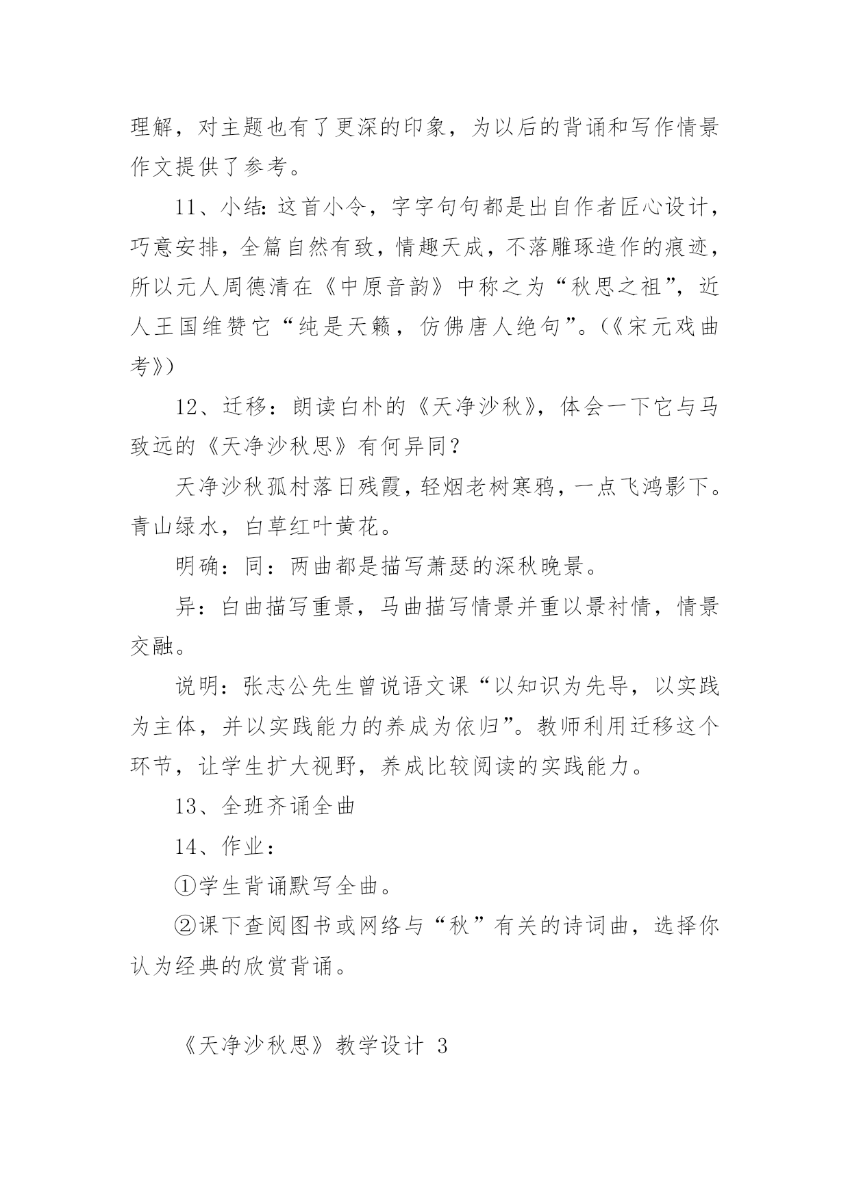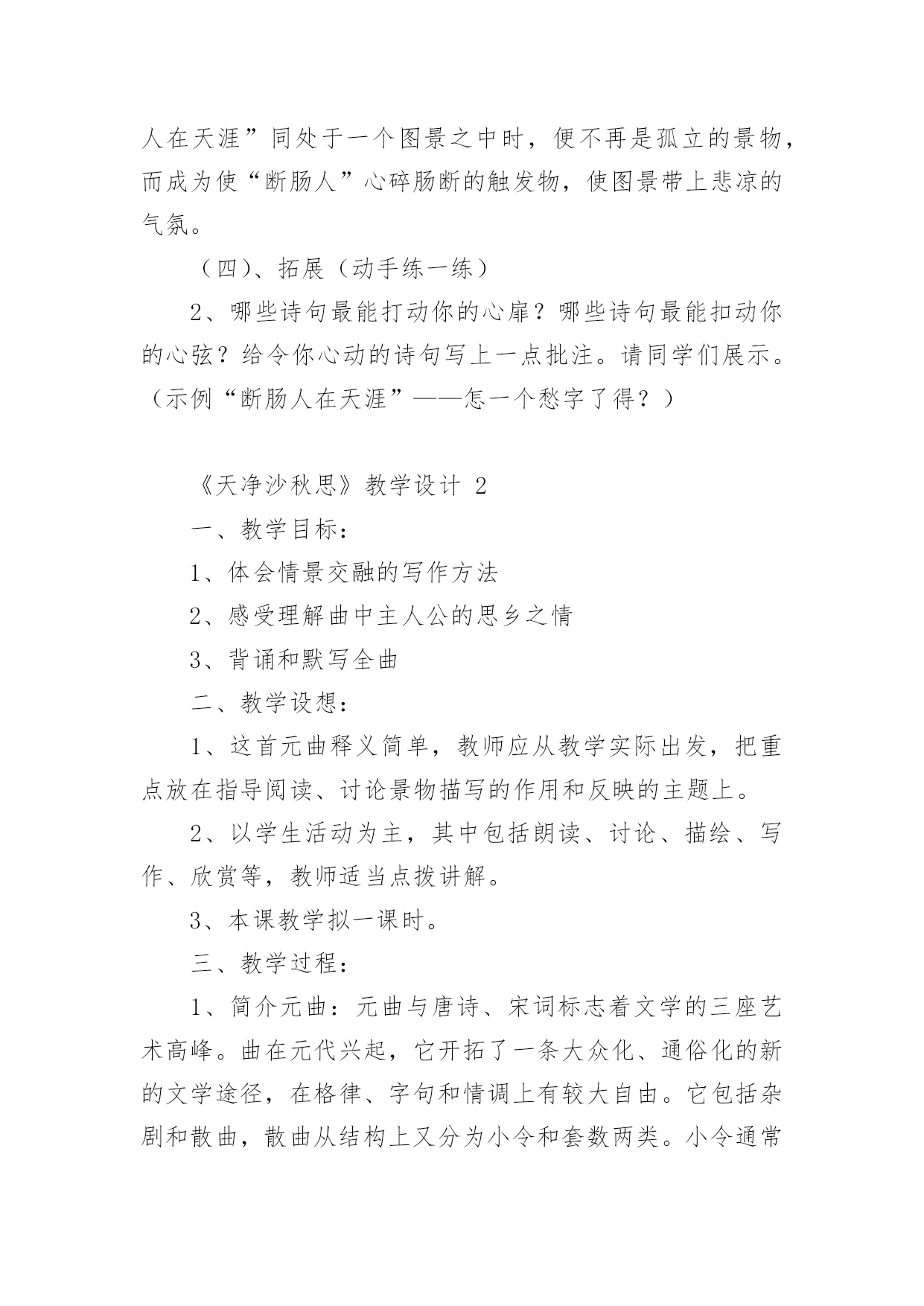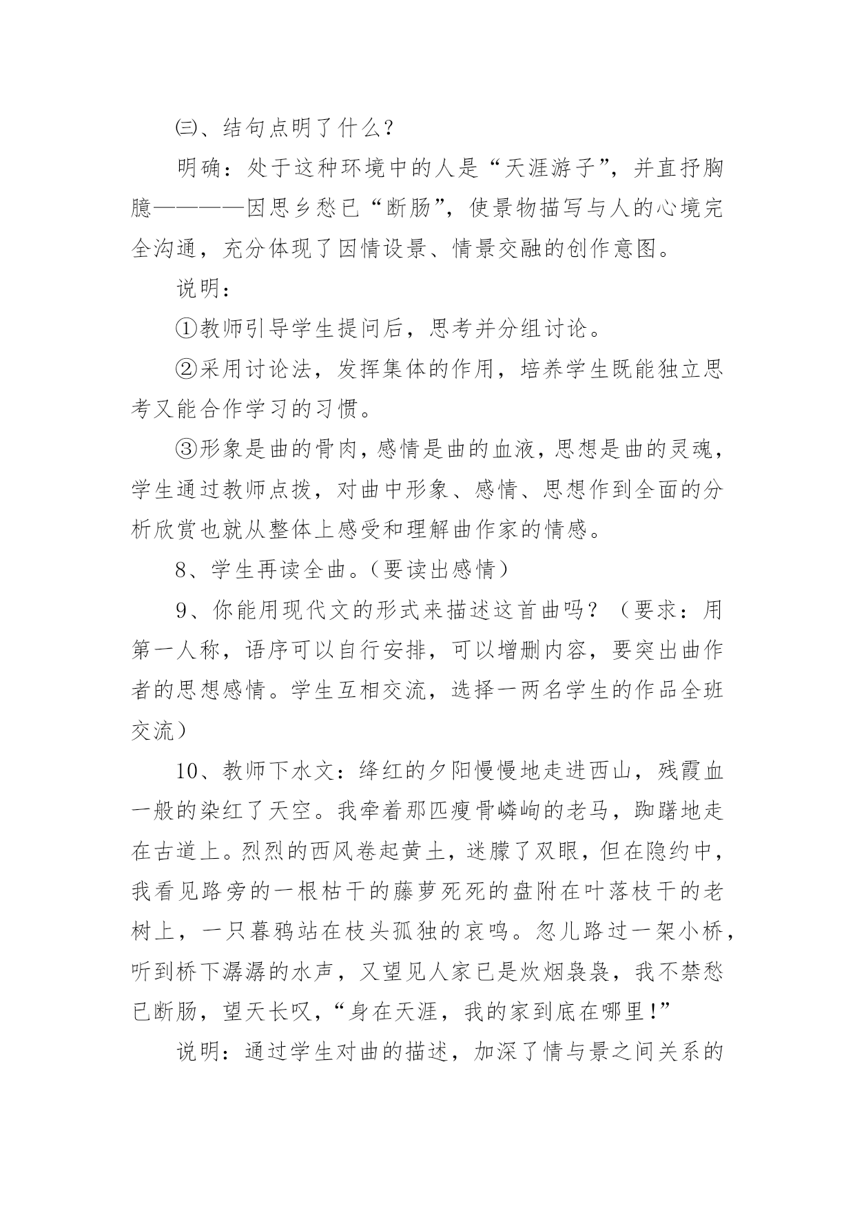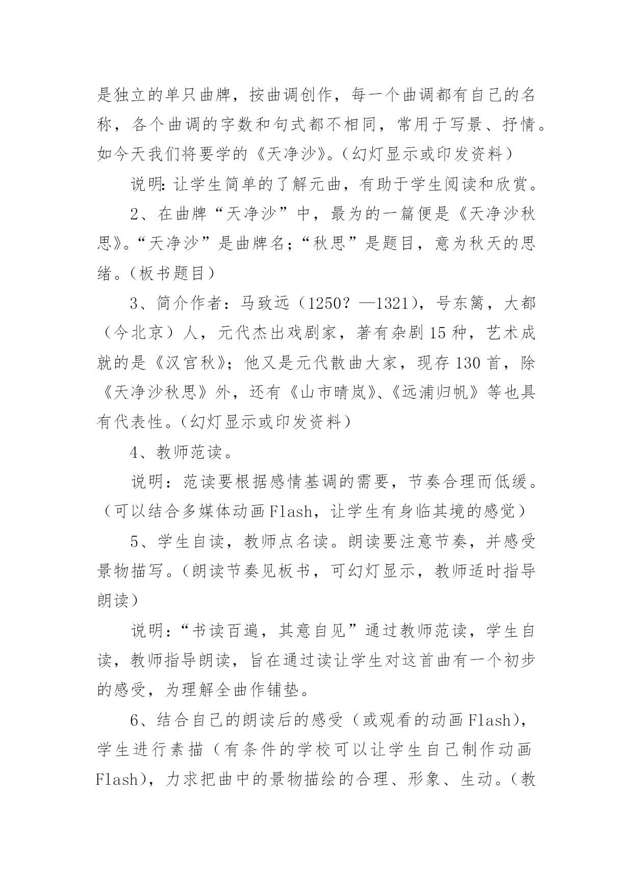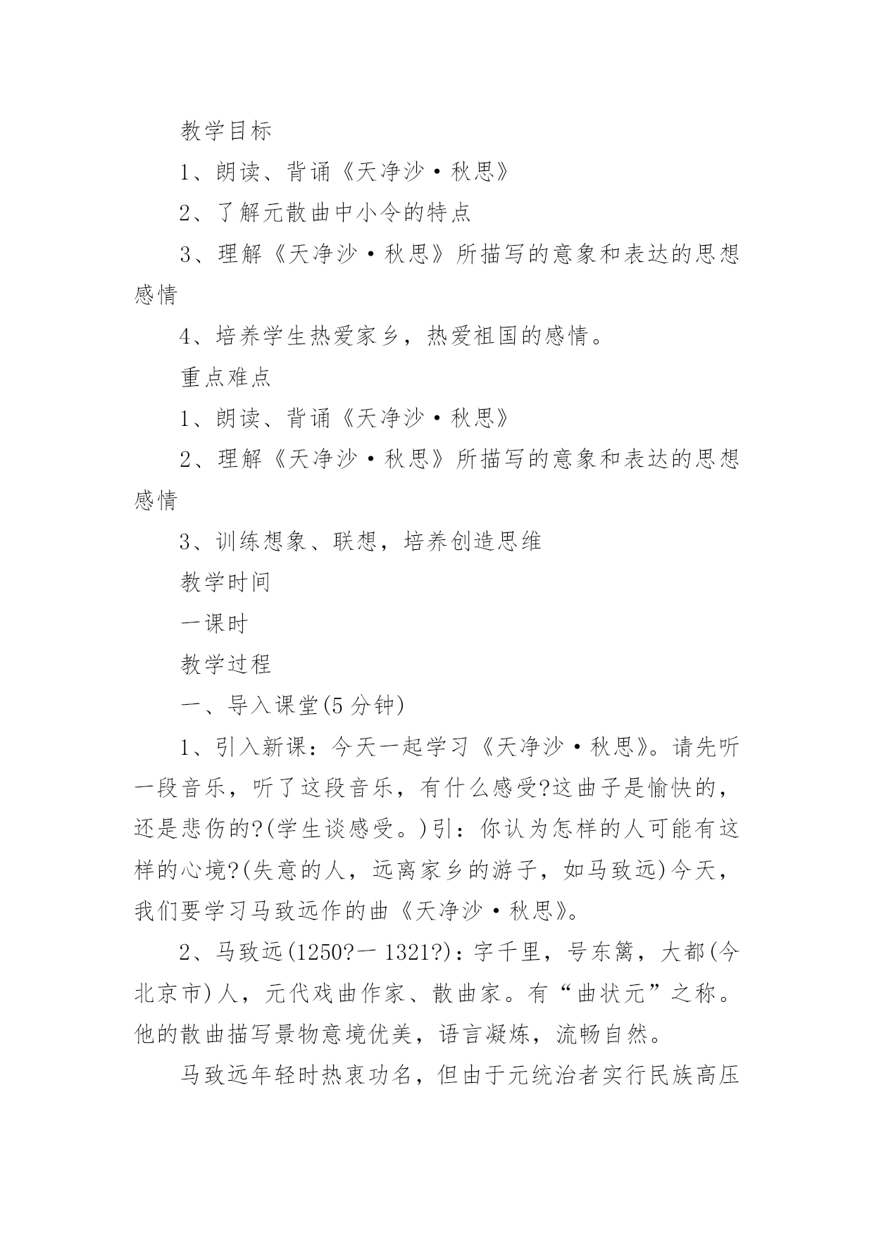 《天净沙秋思》教学设计《天净沙秋思》教学设计(精选10篇)作为一名教学工作者,通常需要用到教学设计来辅助教学,教学设计是把教学原理转化为教学材料和教学活动的计划。那么应当如何写教学设计呢?以下是小编为大家整理的《天净沙秋思》教学设计,欢迎阅读与收藏。《天净沙秋思》教学设计1一、学习目标1、朗诵、背诵2、感受意境、赏析3、学习这首小令的写作手法,学会寄情于物的写作手法二、教学重难点重点:学会分析景物渲染的氛围,帮助学生理解诗人的情感,体会诗人的心境难点:学会运用寄情于物的写作手法三、学习过程(一)、导入新课:大家还记得哪些表达思乡之情的句子呢?齐背(独在异乡为异客,每逢佳节倍思亲;春风又绿江南,明月何时照我还?仍怜故乡水,万里送行舟)今天要们要学习一首元曲《天净沙秋思》。大家都知道唐诗、宋词、元曲,作为第一次接触元代作品,我们首先来了解元曲。包括杂剧和散曲,散曲包括散套和小令,散曲,是为配乐所写的歌词,是继诗词兴起的一种新诗体。小令,又叫“叶儿”,体制短小,大多数为只曲,每首各自为韵,相当于一首诗或一首短词。我们今天学的《天净沙·秋思》就是一首小令。解题:天净沙是曲牌名,秋思是题目。“秋思”,秋天里的思念。(二)、学习这首小令(1)学生朗读。读书是走进作家的内心世界,让我们以朗读来走进马致远,亲近这位名家,读懂这片漂泊羁旅的游子之心。(全班齐读)(2)指导学生朗读。枯藤/老树/昏鸦,小桥/流水/人家,古道/西风/瘦马,夕阳/西下,断肠人/在/天涯。要读出一气呵成、淋漓痛快的酣畅美和明快的节奏感。试一试。最后一句是散句,要读得曲折跌宕,读出落拓无助的生存境遇。试一试。指出典型地方再朗读一遍。(3)欣赏音频,感受它的语言美、意境美。聆听之际,注意作者营造了怎样的气氛?给你怎样的感受?(4)同学们畅所欲言谈感受:凄凉、悲凉、凄苦。请学生读出凄凉的情感。问全曲没有出现一个关于“凄凉”的字眼,你是如何读出来的,从哪个词读出来的?(5)根据同学们的回答,师生共同分析从词语中读出的情感。强调“小桥流水人家”里面的景是温馨、恬静的,与其它的景成对比,以乐静衬哀情。(6)古人云“诗中有画,画中有诗”请同学们分组讨论2分钟,把刚才分析的画面用优美的话语描绘出来,请小组代表发言。几根枯藤缠绕着一棵棵秃树,那凋零了的黄叶在萧萧的.秋风中瑟瑟的颤抖,黄昏的天空中点点寒鸦,声声哀鸣……一片悲凉的秋景;潺潺的流水上,横跨一座别致的小桥。不远处有一缕袅袅炊烟飘出农家小屋,那里有几户安居乐业的人家;在寂寞的古道上,萧瑟的秋风,吹打着孤独的游子,掀起他单薄的衣襟,孤独的游子骑着一匹瘦瘦的老马,蹒跚走在羊肠古道上。(7)同学们描绘的就是一幅悲凉的秋景图。(板书:景悲凉气氛)“一切景语皆情语”,请想想这幅画面传达出怎样的情感?明确:因为“断肠人在天涯”,在天涯的断肠人的精神家园已化作了一片荒芜,他眼中的景自然是满目萧然。于是作者眼中的藤、树、马、水都是萧条的、凄凉的、无助的,其实是人的落拓与哀愁的写照,这是以景托情,融情于景。这景无疑传达出浪迹天涯的游子思乡之情,这景与人,境与情,自然意象与社会境遇,和谐的统一于这首小令中,充分的道出了游子羁旅之悲。(板书:情游子之悲)(8)“断肠人”究竟是谁?了解作者:马致远:字千里,号东篱,元代大都人,是当时著名的杂剧作家、散曲家。马致远早年曾有仕途上的抱负,却长期毫无结果。后来担任地方小官吏,也是完全不能满意的,在职的时间大概也并不长。在这样的蹉跎经历中,他渐渐心灰意冷,一面怀着满腹牢骚,一面宣称看破了世俗名利,以隐士高人自居。问题:读出哪些新的体会?提示:怀才不遇,长期漂泊的无奈,思念家乡,官场失落。拓展:可以用来劝慰作者的诗句(长风破浪会有时,直挂云帆济沧海……)介绍作者成就:“元曲四大家”之一,被时人美誉为“曲状元”。其小令名作《天净沙·秋思》被称为“秋思之祖”。1、这首小令之所以获得如此高的赞誉,写作手法好在哪里?(三)、赏析写作手法师生共同探究,得出结论(1)简约与深蕴相依,《天净沙秋思》文字之精炼,也可以说达到了不能再增、减一字的程度。全篇仅五句,二十八字,用词凝练而不简陋。九种事物“藤、树、鸦、桥、水、家、道、风、马”之前分别冠以“枯、老、昏、小、流、人、古、西、瘦”表现各自特征的修饰语,使各个事物均带有鲜明的个性,又是本互不相干的事物,在苍凉的深秋暮色中构成一个统一的整体。(2)静景与动景相映,在作者勾勒的秋景图上,动与静、明与暗、背景与主体的相互映衬。如写环境的幽静用“流水”的动态与“小桥”“人家”的静态相映;写苍凉的道路则用“西风”与“古道”相映;“小桥流水人家”的安适、静雅与“断肠人在天涯”的沦落异乡相映,使“断肠人”更添悲愁。(3)寄情于物,自然景物本来是没有思想感情的,但当诗人把这些客观事物纳入审美