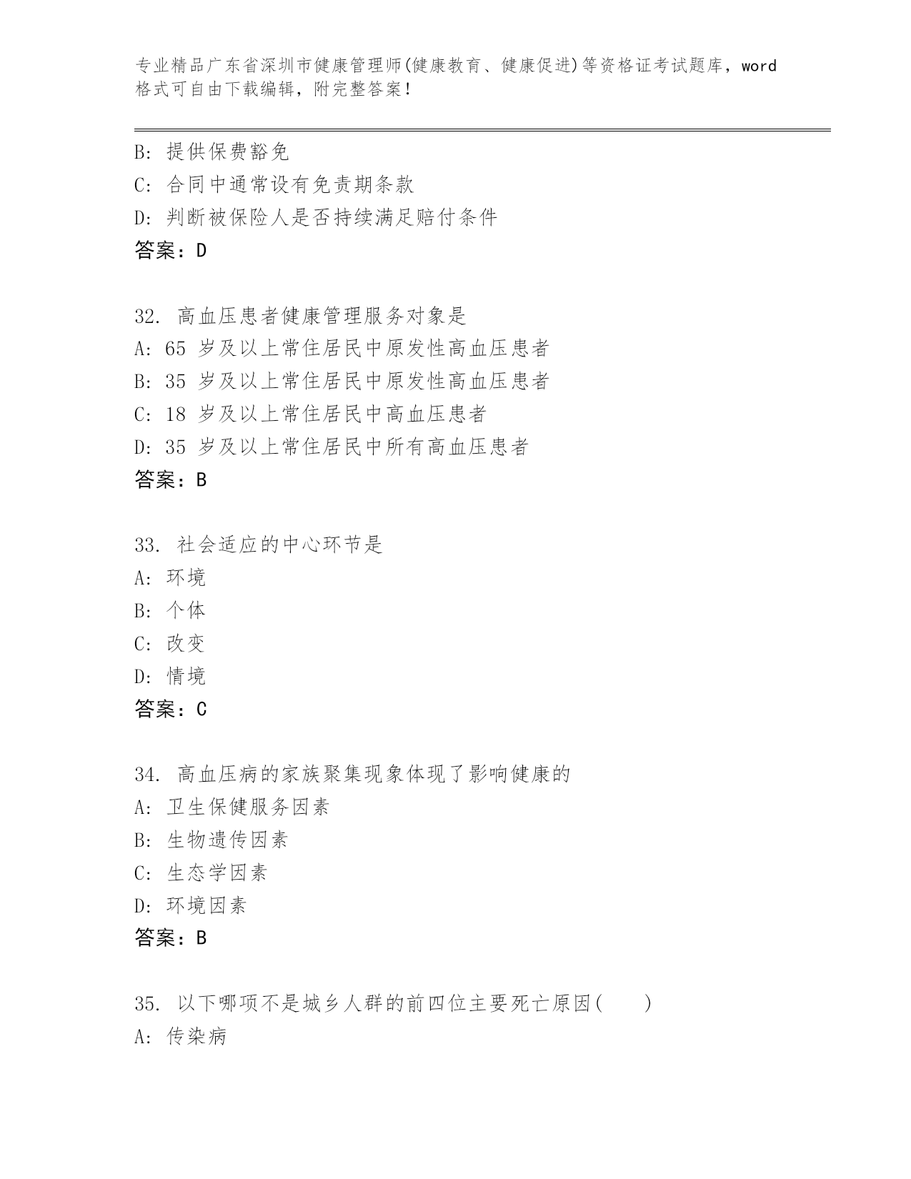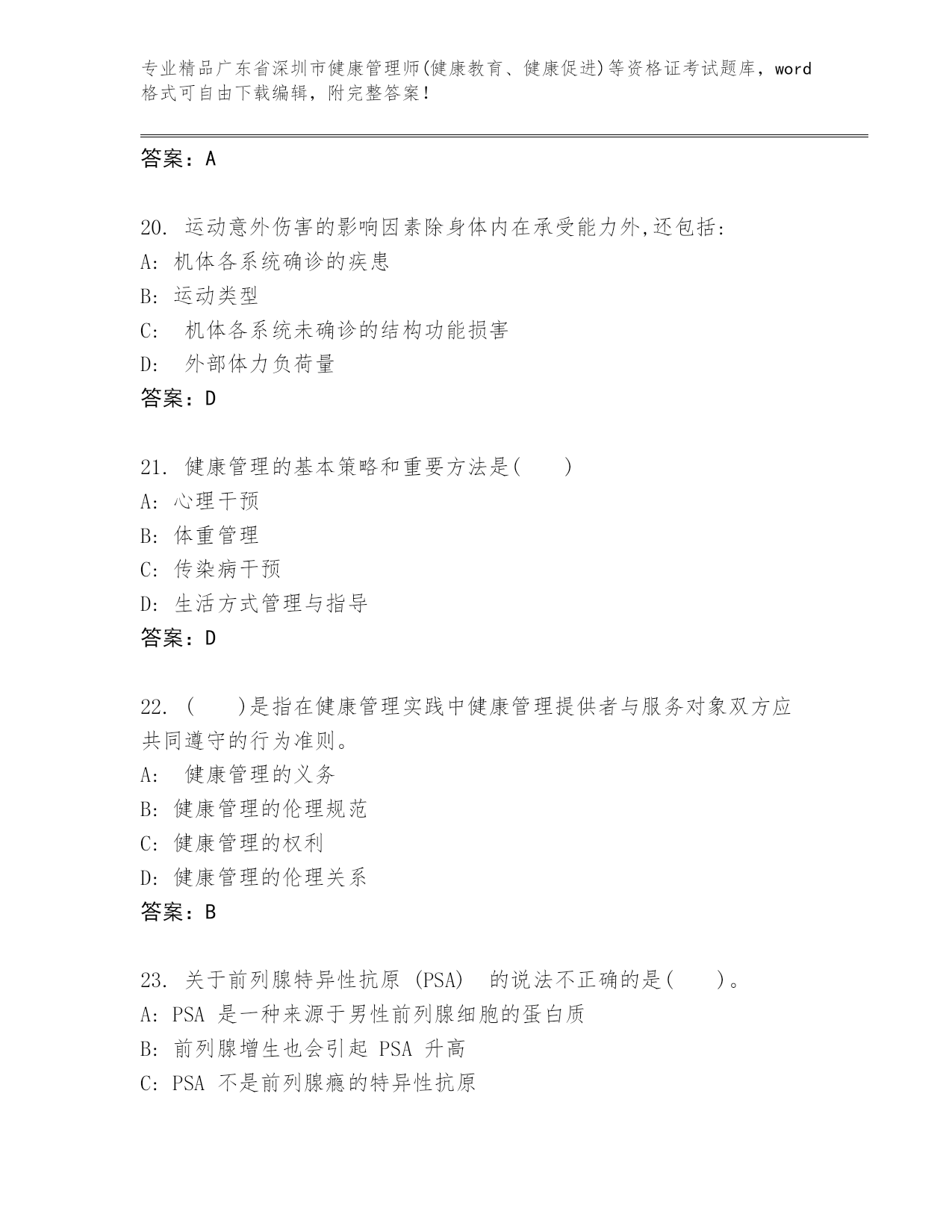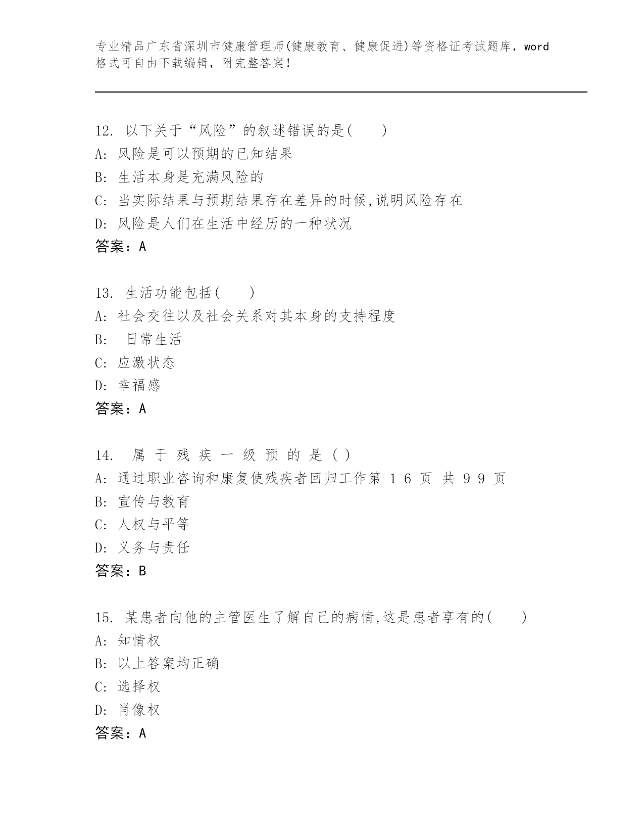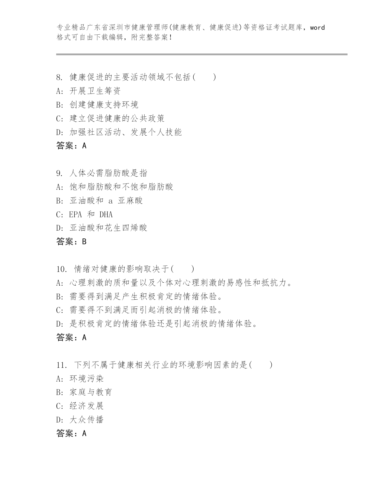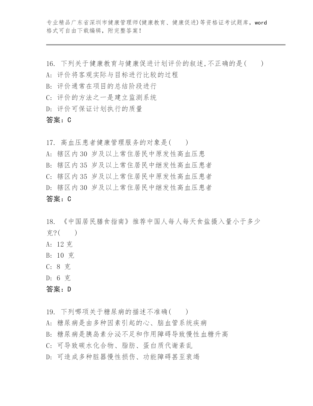 精品广东省深圳市健康管理师(健康教育、健康促进)等资格证考试内部题库(实用)