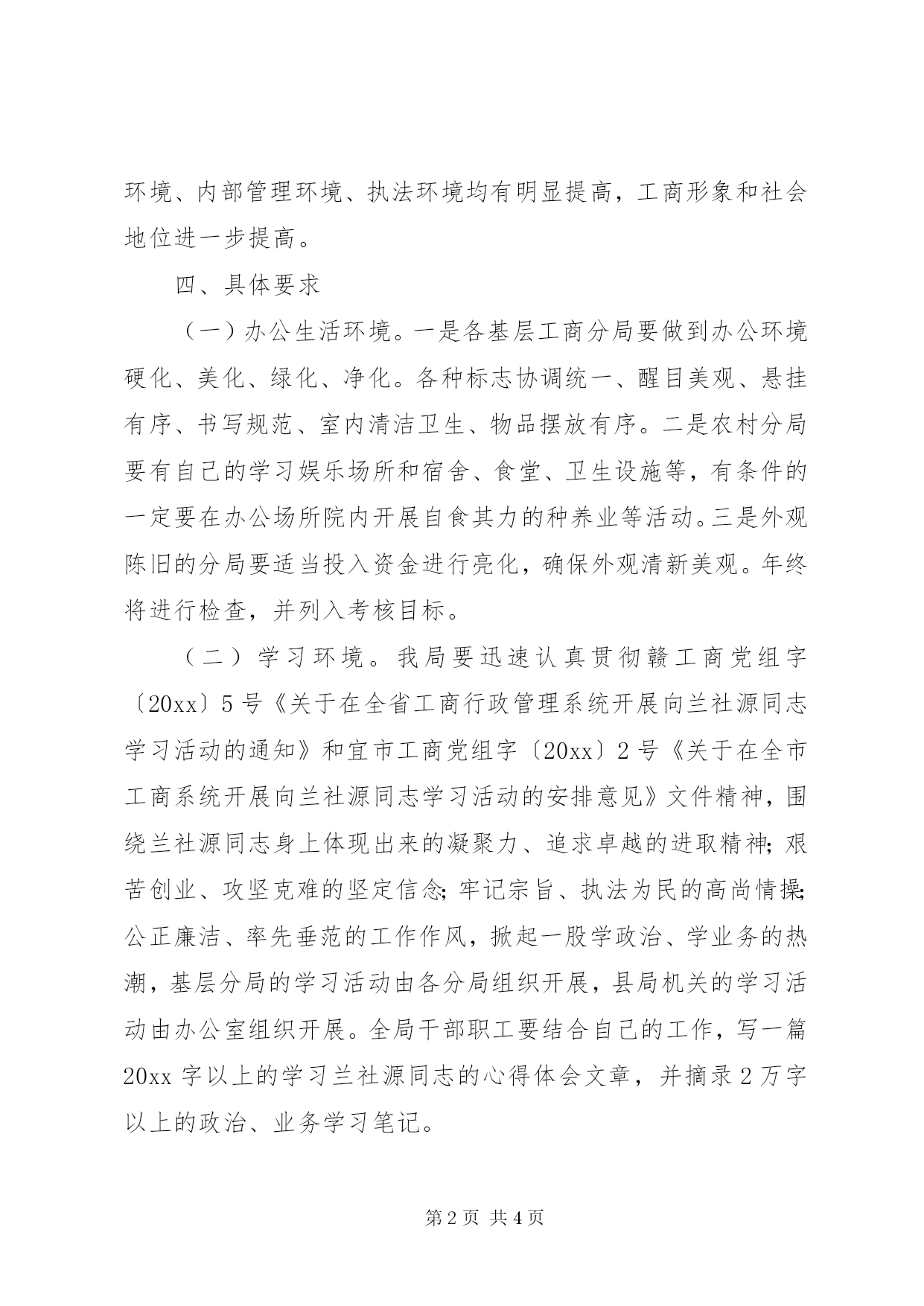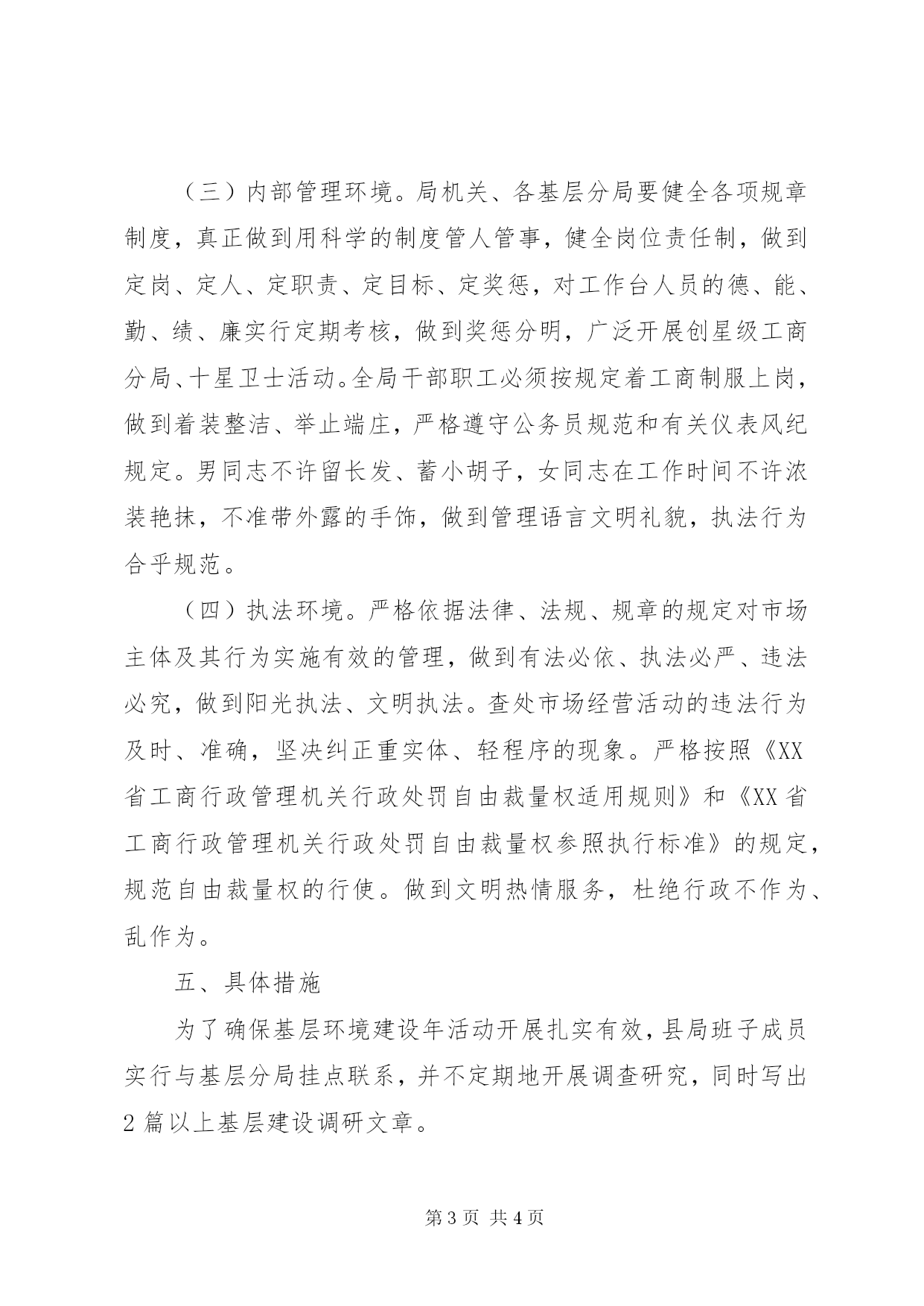 第PAGE\*Arabic\*MERGEFORMAT4页共NUMPAGES\*MERGEFORMAT4页工商局基层环境建设工作方案**县工商局基层环境建设年活动实施方案为了全面贯彻落实科学发展观,加快我局建设信用工商、法治工商、信息工商、廉洁工商、和谐工商步伐,根据省工商局《关于印发的通知》和《关于印发的通知》及市局《关于开展基层环境建设年活动的通知》要求,结合我局实际,经局党组研究,特制定本实施方案。一、成立领导机构为切实抓好我局基层环境建设年活动,经局党组研究,成立**县工商局基层环境建设年活动领导小组。由局党组书记、局长毛建荣同志任组长,副组长:游旺泉、甘仲霖、易建勇;成员:机关直属局、股室、分局负责人,下设办公室,罗满根兼办公室主任,负责日常工作。二、指导思想以邓小平理论和"三个代表"重要思想为指导,以科学发展观为统领,以建设信用工商、法治工商、信息工商、廉洁工商、和谐工商为目标,确保我局干部队伍不出问题,确保所监管的市场不出问题,确保我县工商行政管理工作为构建社会主义和谐社会,为加快**县经济社会全面快速健康发展发挥应有的积极作用。三、主要目标通过一年时间,确保我局基层工商分局办公生活环境、学习环境、内部管理环境、执法环境均有明显提高,工商形象和社会地位进一步提高。四、具体要求(一)办公生活环境。一是各基层工商分局要做到办公环境硬化、美化、绿化、净化。各种标志协调统一、醒目美观、悬挂有序、书写规范、室内清洁卫生、物品摆放有序。二是农村分局要有自己的学习娱乐场所和宿舍、食堂、卫生设施等,有条件的一定要在办公场所院内开展自食其力的种养业等活动。三是外观陈旧的分局要适当投入资金进行亮化,确保外观清新美观。年终将进行检查,并列入考核目标。(二)学习环境。我局要迅速认真贯彻赣工商党组字〔20xx〕5号《关于在全省工商行政管理系统开展向兰社源同志学习活动的通知》和宜市工商党组字〔20xx〕2号《关于在全市工商系统开展向兰社源同志学习活动的安排意见》文件精神,围绕兰社源同志身上体现出来的凝聚力、追求卓越的进取精神;艰苦创业、攻坚克难的坚定信念;牢记宗旨、执法为民的高尚情操;公正廉洁、率先垂范的工作作风,掀起一股学政治、学业务的热潮,基层分局的学习活动由各分局组织开展,县局机关的学习活动由办公室组织开展。全局干部职工要结合自己的工作,写一篇20xx字以上的学习兰社源同志的心得体会文章,并摘录2万字以上的政治、业务学习笔记。(三)内部管理环境。局机关、各基层分局要健全各项规章制度,真正做到用科学的制度管人管事,健全岗位责任制,做到定岗、定人、定职责、定目标、定奖惩,对工作台人员的德、能、勤、绩、廉实行定期考核,做到奖惩分明,广泛开展创星级工商分局、十星卫士活动。全局干部职工必须按规定着工商制服上岗,做到着装整洁、举止端庄,严格遵守公务员规范和有关仪表风纪规定。男同志不许留长发、蓄小胡子,女同志在工作时间不许浓装艳抹,不准带外露的手饰,做到管理语言文明礼貌,执法行为合乎规范。(四)执法环境。严格依据法律、法规、规章的规定对市场主体及其行为实施有效的管理,做到有法必依、执法必严、违法必究,做到阳光执法、文明执法。查处市场经营活动的违法行为及时、准确,坚决纠正重实体、轻程序的现象。严格按照《XX省工商行政管理机关行政处罚自由裁量权适用规则》和《XX省工商行政管理机关行政处罚自由裁量权参照执行标准》的规定,规范自由裁量权的行使。做到文明热情服务,杜绝行政不作为、乱作为。五、具体措施为了确保基层环境建设年活动开展扎实有效,县局班子成员实行与基层分局挂点联系,并不定期地开展调查研究,同时写出2篇以上基层建设调研文章。**县工商行政管理局