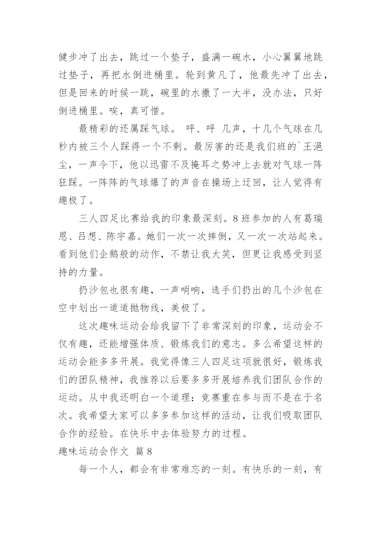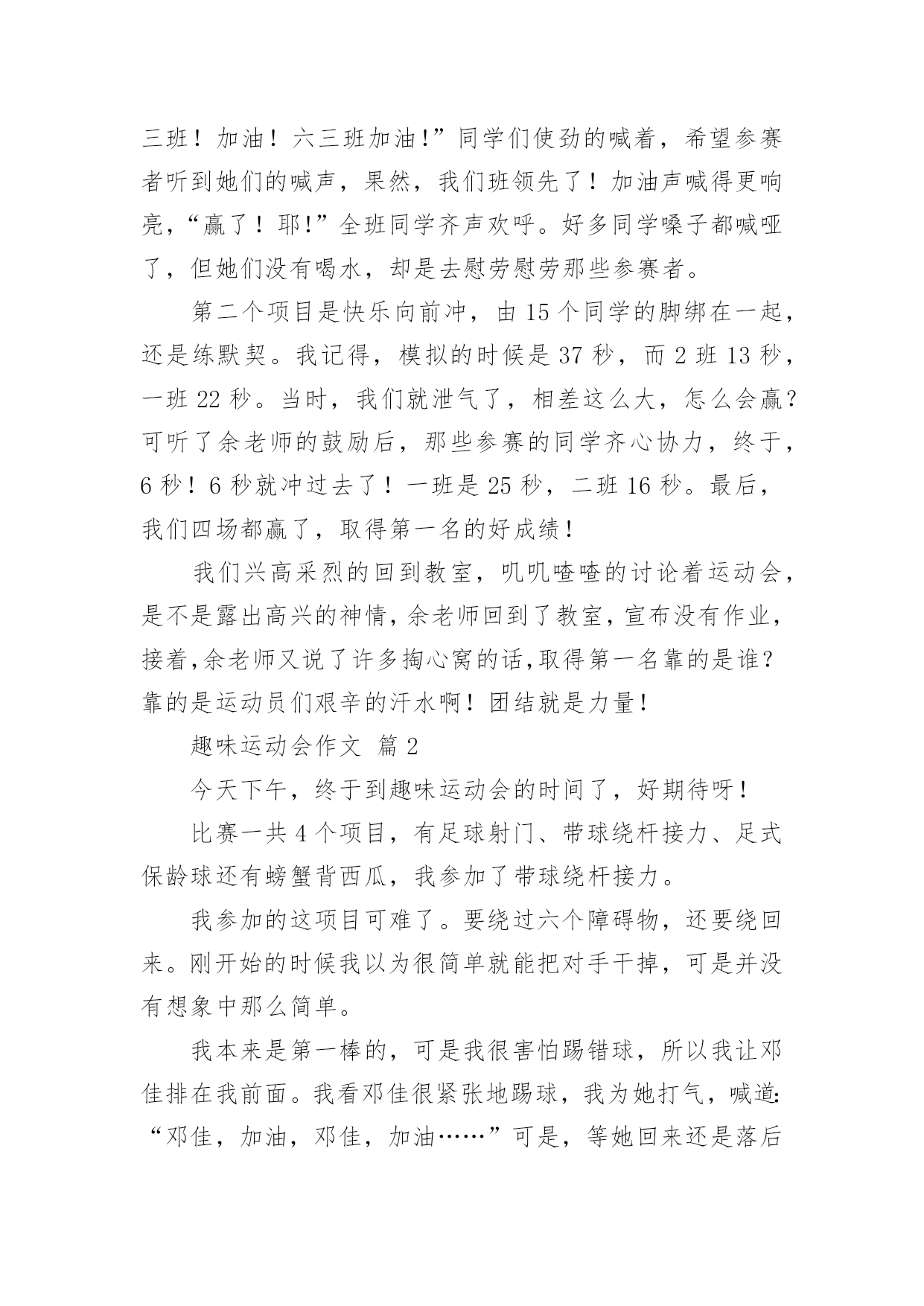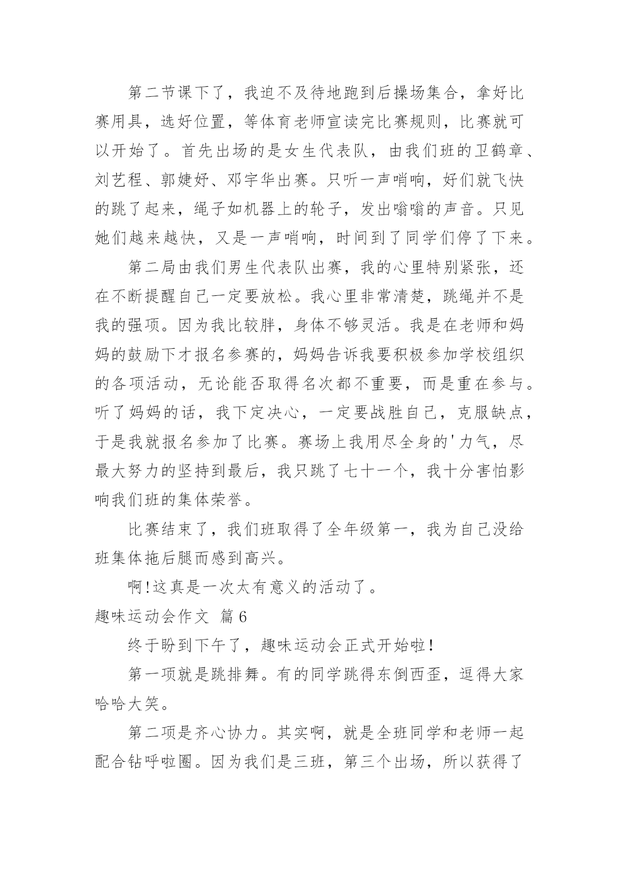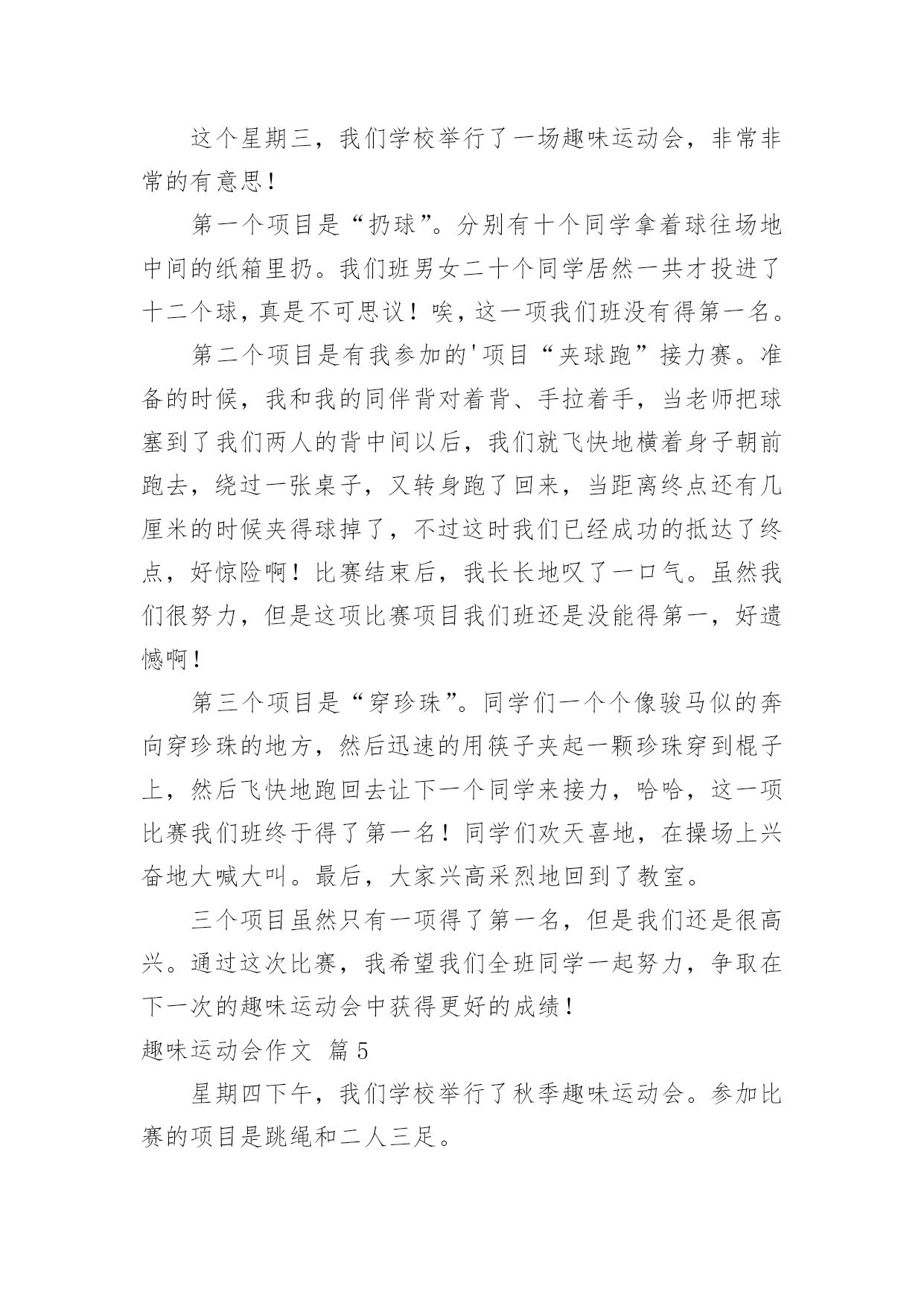 趣味运动会作文【经典】实用的趣味运动会作文在日常的学习、工作、生活中,大家或多或少都会接触过作文吧,作文一定要做到主题集中,围绕同一主题作深入阐述,切忌东拉西扯,主题涣散甚至无主题。你写作文时总是无从下笔?下面是小编收集整理的趣味运动会作文8篇,仅供参考,欢迎大家阅读。趣味运动会作文篇1“六三班加油!”你一定会问这是在举行什么比赛啊?告诉你吧,运动会!本来决定运动会在4月30日举行的,结果学校说由于天气的原因不能举行了,当时我们那个泄气劲儿啊,现在,终于盼到了运动会啦!我们排着整齐的队走向操场。掩饰不住兴奋,在去操场的路上我们说说笑笑的,终于到了操场上,先开始的是一年级的,所以还没到我们班。哎,时间过得真慢啊。全班仿佛和我的'想法一样,愁眉苦脸的。“到我们班啦!到我们班啦!”不知谁喊了一句。我们全班同学一窝蜂跑到比赛场地,我也急切的跑过去看,“真的,到我们班了!”“希望我们班会赢啊!”同学们叽叽喳喳的讨论着,“预备——开始!”现在进行的是集体蹲倒,这是四个同学完成的,主要考的是默契。“六三班!加油!六三班!加油!”同学们扯着嗓子喊起来。我也跟着喊,哎呀,要落后了!“六三班!加油!六三班加油!”同学们使劲的喊着,希望参赛者听到她们的喊声,果然,我们班领先了!加油声喊得更响亮,“赢了!耶!”全班同学齐声欢呼。好多同学嗓子都喊哑了,但她们没有喝水,却是去慰劳慰劳那些参赛者。第二个项目是快乐向前冲,由15个同学的脚绑在一起,还是练默契。我记得,模拟的时候是37秒,而2班13秒,一班22秒。当时,我们就泄气了,相差这么大,怎么会赢?可听了余老师的鼓励后,那些参赛的同学齐心协力,终于,6秒!6秒就冲过去了!一班是25秒,二班16秒。最后,我们四场都赢了,取得第一名的好成绩!我们兴高采烈的回到教室,叽叽喳喳的讨论着运动会,是不是露出高兴的神情,余老师回到了教室,宣布没有作业,接着,余老师又说了许多掏心窝的话,取得第一名靠的是谁?靠的是运动员们艰辛的汗水啊!团结就是力量!趣味运动会作文篇2今天下午,终于到趣味运动会的时间了,好期待呀!比赛一共4个项目,有足球射门、带球绕杆接力、足式保龄球还有螃蟹背西瓜,我参加了带球绕杆接力。我参加的这项目可难了。要绕过六个障碍物,还要绕回来。刚开始的时候我以为很简单就能把对手干掉,可是并没有想象中那么简单。我本来是第一棒的,可是我很害怕踢错球,所以我让邓佳排在我前面。我看邓佳很紧张地踢球,我为她打气,喊道:“邓佳,加油,邓佳,加油……”可是,等她回来还是落后二班一点点。到我了,我非常非常紧张,害怕踢错。我踢的时候什么都没想,就专注地盯着那颗足球。可是我踢完时二班已经第三个了,我很失望……比赛成绩出来的'时候,我竟然看见我参加的项目获得第四名。我由失望转变为非常开心!因为我们练习时间很少,还能拿到第四名,已经非常好了,这是大家一起努力的结果。趣味运动会作文篇3今天下午,学校举行了一场二年级的趣味运动会,要求二年级所有的同学都要参加。运动会一共有两个游戏:一个是一分钟仰卧起坐比赛,另一个是袋鼠跳接力比赛。一分钟仰卧比赛开始了,所有的小运动员们来到操场上,我也躺在了塑胶场地上,四年级的哥哥姐姐们帮助我们按脚和数数。锣声一响,我迅速的做起了仰卧起坐,当做到十几个的时候,有些累了,我听到王老师说“苏俊晴,加油!”我咬紧牙,坚持努力的做着。当裁判说“时间到”的时候,我累得躺在了地上。“20个”,我觉着自己的成绩还不错,毕竟是第一次做仰卧起坐嘛。休息了一会,袋鼠跳接力比赛开始了,每班分成4队,进行对面接力,最后一位同学谁先到达终点,哪个班就取得胜利。我正好是最后一棒,轮到我了,我快速把两只脚伸到袋子里,两只手拉紧袋子的把手,一蹦一跳的'向终点奔去。经过全班同学的努力,我们班取得了第四名的好成绩。今天的趣味运动会玩得太高兴了!趣味运动会作文篇4这个星期三,我们学校举行了一场趣味运动会,非常非常的有意思!第一个项目是“扔球”。分别有十个同学拿着球往场地中间的纸箱里扔。我们班男女二十个同学居然一共才投进了十二个球,真是不可思议!唉,这一项我们班没有得第一名。第二个项目是有我参加的'项目“夹球跑”接力赛。准备的时候,我和我的同伴背对着背、手拉着手,当老师把球塞到了我们两人的背中间以后,我们就飞快地横着身子朝前跑去,绕过一张桌子,又转身跑了回来,当距离终点还有几厘米的时候夹得球掉了,不过这时我们已经成功的抵达了终点,好惊险啊!比赛结束后,我长长地叹了一口气。虽然我们很努力,但是这项比赛项目我们班还是没能得第一,好遗憾啊!第三个项目是“穿珍珠”。同学们一个个像骏马似的奔向穿珍珠的地方,然后迅速的用筷子夹起一颗珍珠穿到棍子上,然后飞快地跑回去让下一个同学来接力,哈哈,这一项比赛我们班终于得了第一名!同学们欢天喜地,在操场上兴奋地大喊