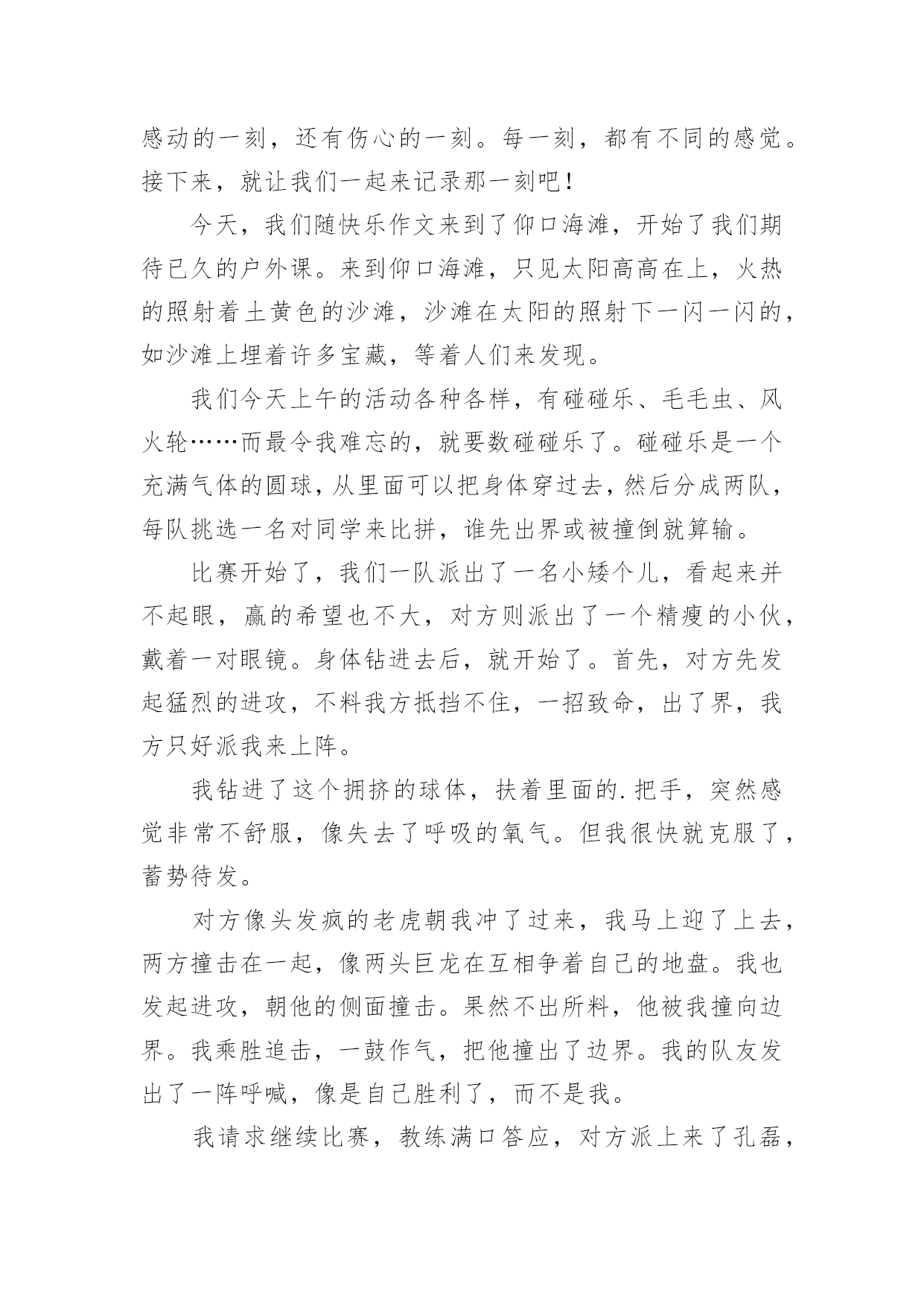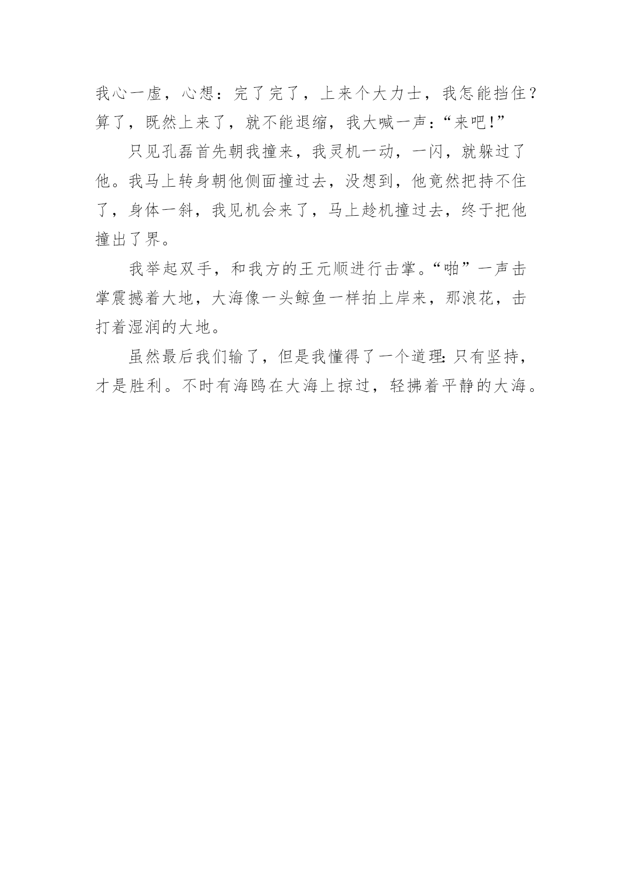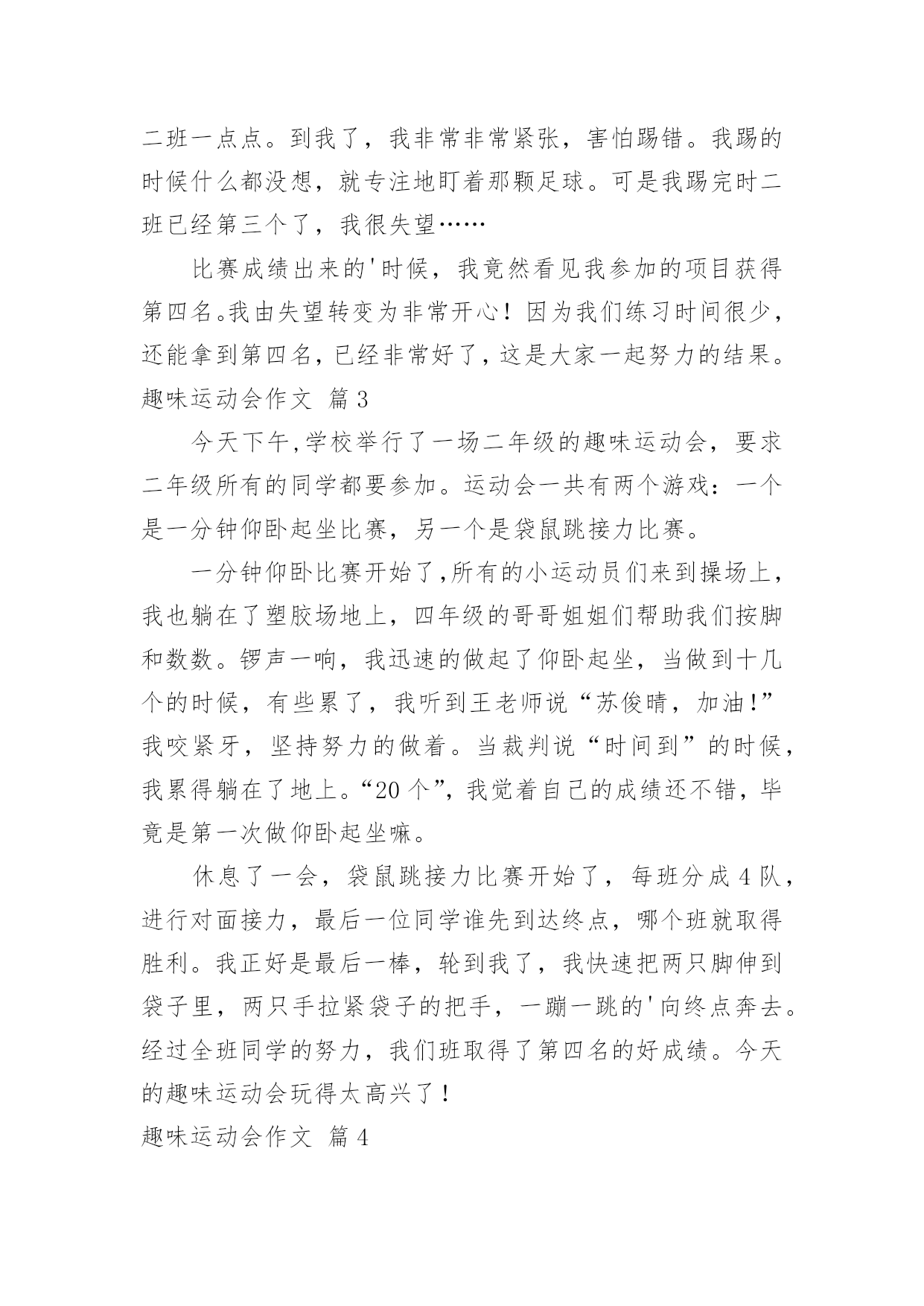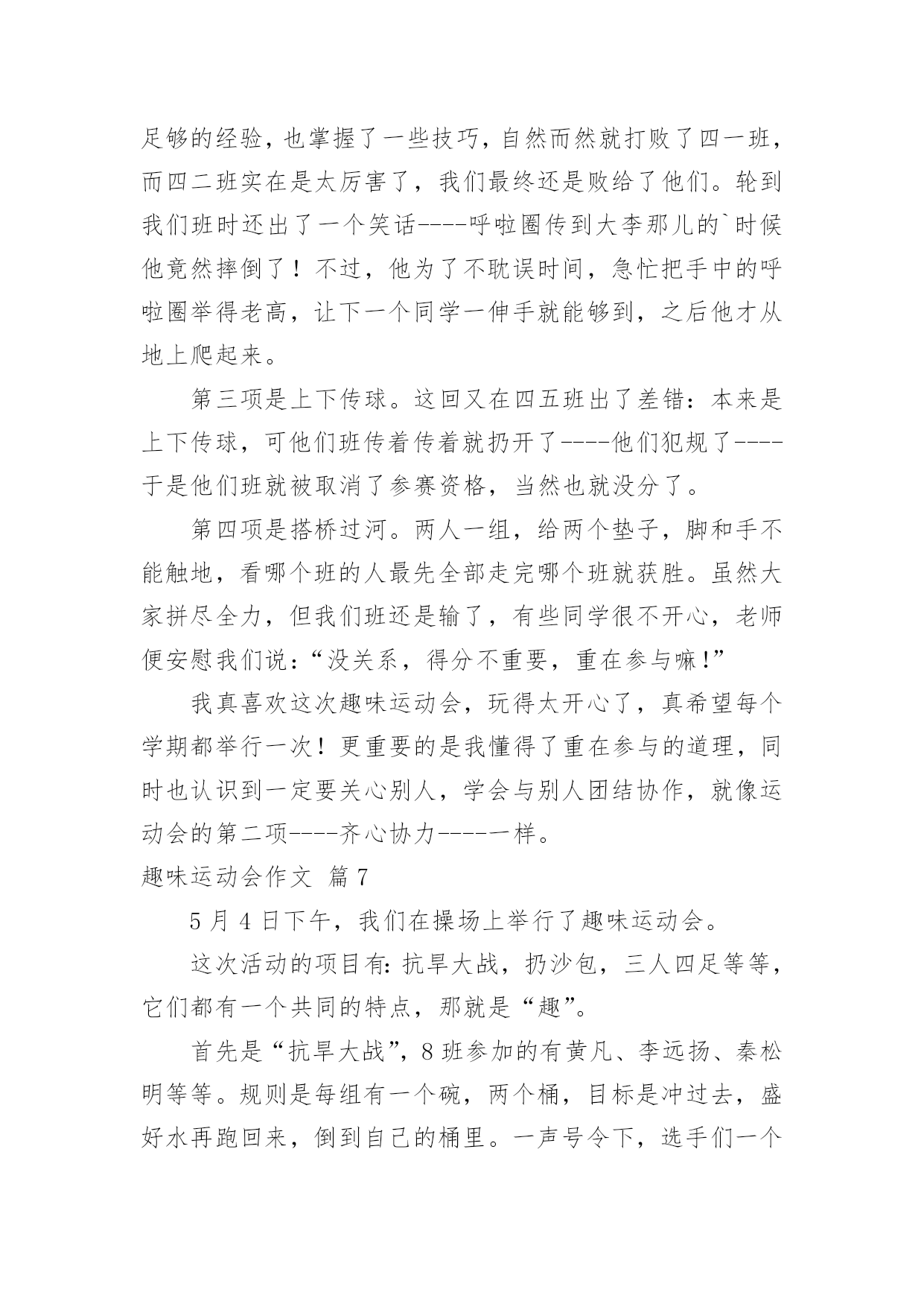 趣味运动会作文【经典】实用的趣味运动会作文在日常的学习、工作、生活中,大家或多或少都会接触过作文吧,作文一定要做到主题集中,围绕同一主题作深入阐述,切忌东拉西扯,主题涣散甚至无主题。你写作文时总是无从下笔?下面是小编收集整理的趣味运动会作文8篇,仅供参考,欢迎大家阅读。趣味运动会作文篇1“六三班加油!”你一定会问这是在举行什么比赛啊?告诉你吧,运动会!本来决定运动会在4月30日举行的,结果学校说由于天气的原因不能举行了,当时我们那个泄气劲儿啊,现在,终于盼到了运动会啦!我们排着整齐的队走向操场。掩饰不住兴奋,在去操场的路上我们说说笑笑的,终于到了操场上,先开始的是一年级的,所以还没到我们班。哎,时间过得真慢啊。全班仿佛和我的'想法一样,愁眉苦脸的。“到我们班啦!到我们班啦!”不知谁喊了一句。我们全班同学一窝蜂跑到比赛场地,我也急切的跑过去看,“真的,到我们班了!”“希望我们班会赢啊!”同学们叽叽喳喳的讨论着,“预备——开始!”现在进行的是集体蹲倒,这是四个同学完成的,主要考的是默契。“六三班!加油!六三班!加油!”同学们扯着嗓子喊起来。我也跟着喊,哎呀,要落后了!“六三班!加油!六三班加油!”同学们使劲的喊着,希望参赛者听到她们的喊声,果然,我们班领先了!加油声喊得更响亮,“赢了!耶!”全班同学齐声欢呼。好多同学嗓子都喊哑了,但她们没有喝水,却是去慰劳慰劳那些参赛者。第二个项目是快乐向前冲,由15个同学的脚绑在一起,还是练默契。我记得,模拟的时候是37秒,而2班13秒,一班22秒。当时,我们就泄气了,相差这么大,怎么会赢?可听了余老师的鼓励后,那些参赛的同学齐心协力,终于,6秒!6秒就冲过去了!一班是25秒,二班16秒。最后,我们四场都赢了,取得第一名的好成绩!我们兴高采烈的回到教室,叽叽喳喳的讨论着运动会,是不是露出高兴的神情,余老师回到了教室,宣布没有作业,接着,余老师又说了许多掏心窝的话,取得第一名靠的是谁?靠的是运动员们艰辛的汗水啊!团结就是力量!趣味运动会作文篇2今天下午,终于到趣味运动会的时间了,好期待呀!比赛一共4个项目,有足球射门、带球绕杆接力、足式保龄球还有螃蟹背西瓜,我参加了带球绕杆接力。我参加的这项目可难了。要绕过六个障碍物,还要绕回来。刚开始的时候我以为很简单就能把对手干掉,可是并没有想象中那么简单。我本来是第一棒的,可是我很害怕踢错球,所以我让邓佳排在我前面。我看邓佳很紧张地踢球,我为她打气,喊道:“邓佳,加油,邓佳,加油……”可是,等她回来还是落后二班一点点。到我了,我非常非常紧张,害怕踢错。我踢的时候什么都没想,就专注地盯着那颗足球。可是我踢完时二班已经第三个了,我很失望……比赛成绩出来的'时候,我竟然看见我参加的项目获得第四名。我由失望转变为非常开心!因为我们练习时间很少,还能拿到第四名,已经非常好了,这是大家一起努力的结果。趣味运动会作文篇3今天下午,学校举行了一场二年级的趣味运动会,要求二年级所有的同学都要参加。运动会一共有两个游戏:一个是一分钟仰卧起坐比赛,另一个是袋鼠跳接力比赛。一分钟仰卧比赛开始了,所有的小运动员们来到操场上,我也躺在了塑胶场地上,四年级的哥哥姐姐们帮助我们按脚和数数。锣声一响,我迅速的做起了仰卧起坐,当做到十几个的时候,有些累了,我听到王老师说“苏俊晴,加油!”我咬紧牙,坚持努力的做着。当裁判说“时间到”的时候,我累得躺在了地上。“20个”,我觉着自己的成绩还不错,毕竟是第一次做仰卧起坐嘛。休息了一会,袋鼠跳接力比赛开始了,每班分成4队,进行对面接力,最后一位同学谁先到达终点,哪个班就取得胜利。我正好是最后一棒,轮到我了,我快速把两只脚伸到袋子里,两只手拉紧袋子的把手,一蹦一跳的'向终点奔去。经过全班同学的努力,我们班取得了第四名的好成绩。今天的趣味运动会玩得太高兴了!趣味运动会作文篇4这个星期三,我们学校举行了一场趣味运动会,非常非常的有意思!第一个项目是“扔球”。分别有十个同学拿着球往场地中间的纸箱里扔。我们班男女二十个同学居然一共才投进了十二个球,真是不可思议!唉,这一项我们班没有得第一名。第二个项目是有我参加的'项目“夹球跑”接力赛。准备的时候,我和我的同伴背对着背、手拉着手,当老师把球塞到了我们两人的背中间以后,我们就飞快地横着身子朝前跑去,绕过一张桌子,又转身跑了回来,当距离终点还有几厘米的时候夹得球掉了,不过这时我们已经成功的抵达了终点,好惊险啊!比赛结束后,我长长地叹了一口气。虽然我们很努力,但是这项比赛项目我们班还是没能得第一,好遗憾啊!第三个项目是“穿珍珠”。同学们一个个像骏马似的奔向穿珍珠的地方,然后迅速的用筷子夹起一颗珍珠穿到棍子上,然后飞快地跑回去让下一个同学来接力,哈哈,这一项比赛我们班终于得了第一名!同学们欢天喜地,在操场上兴奋地大喊